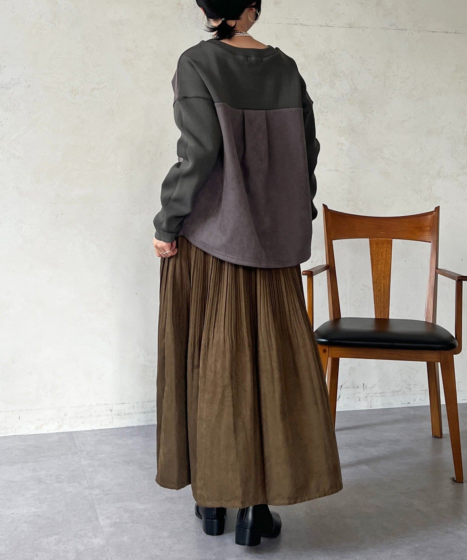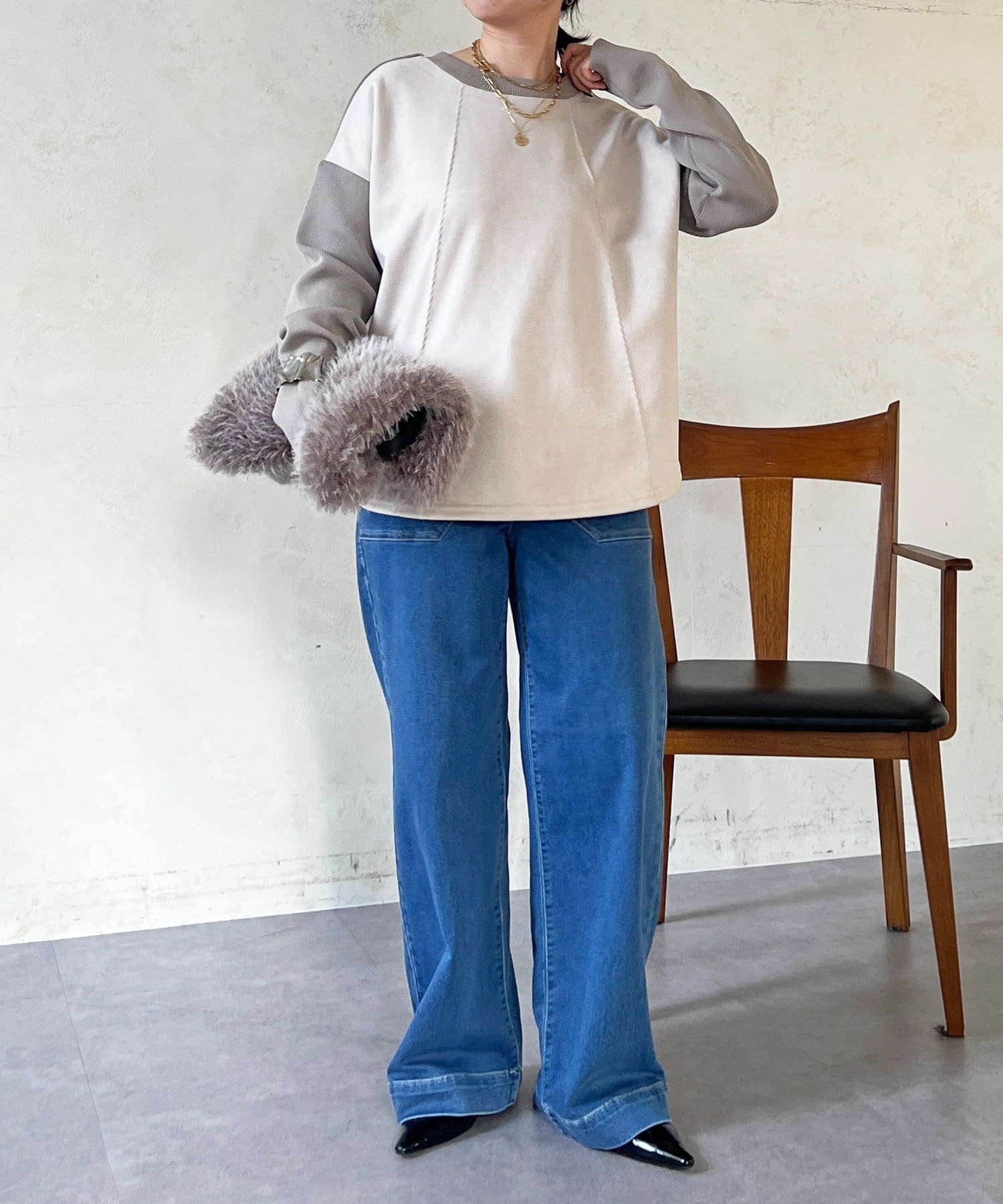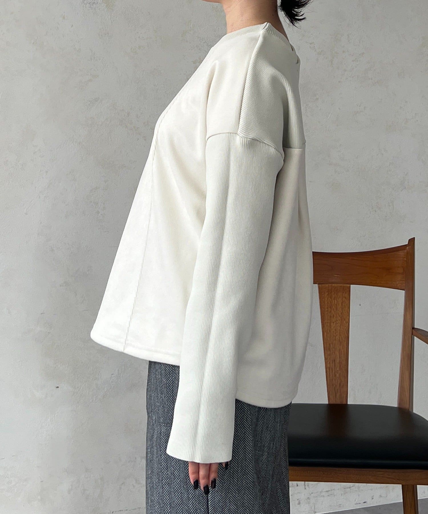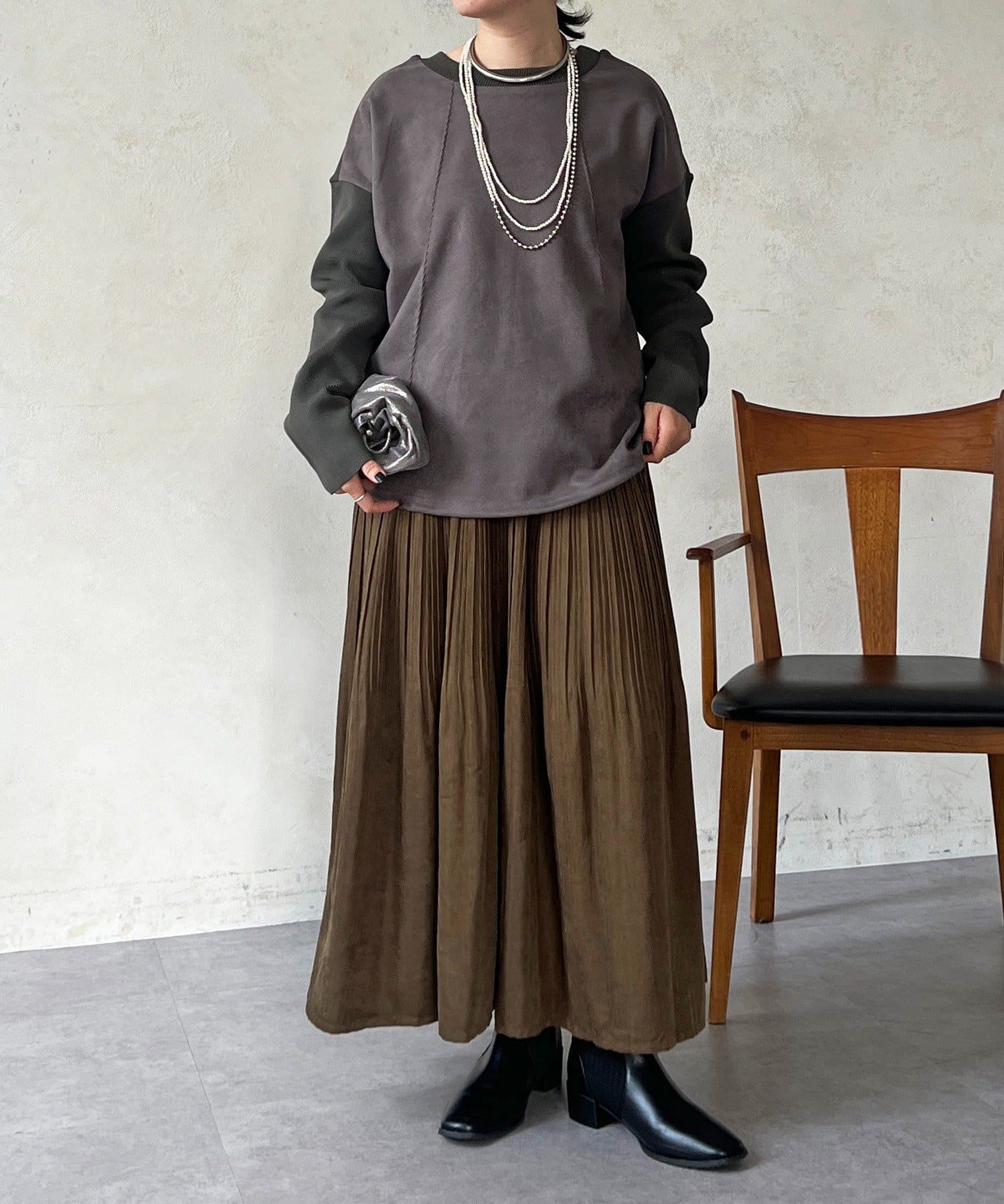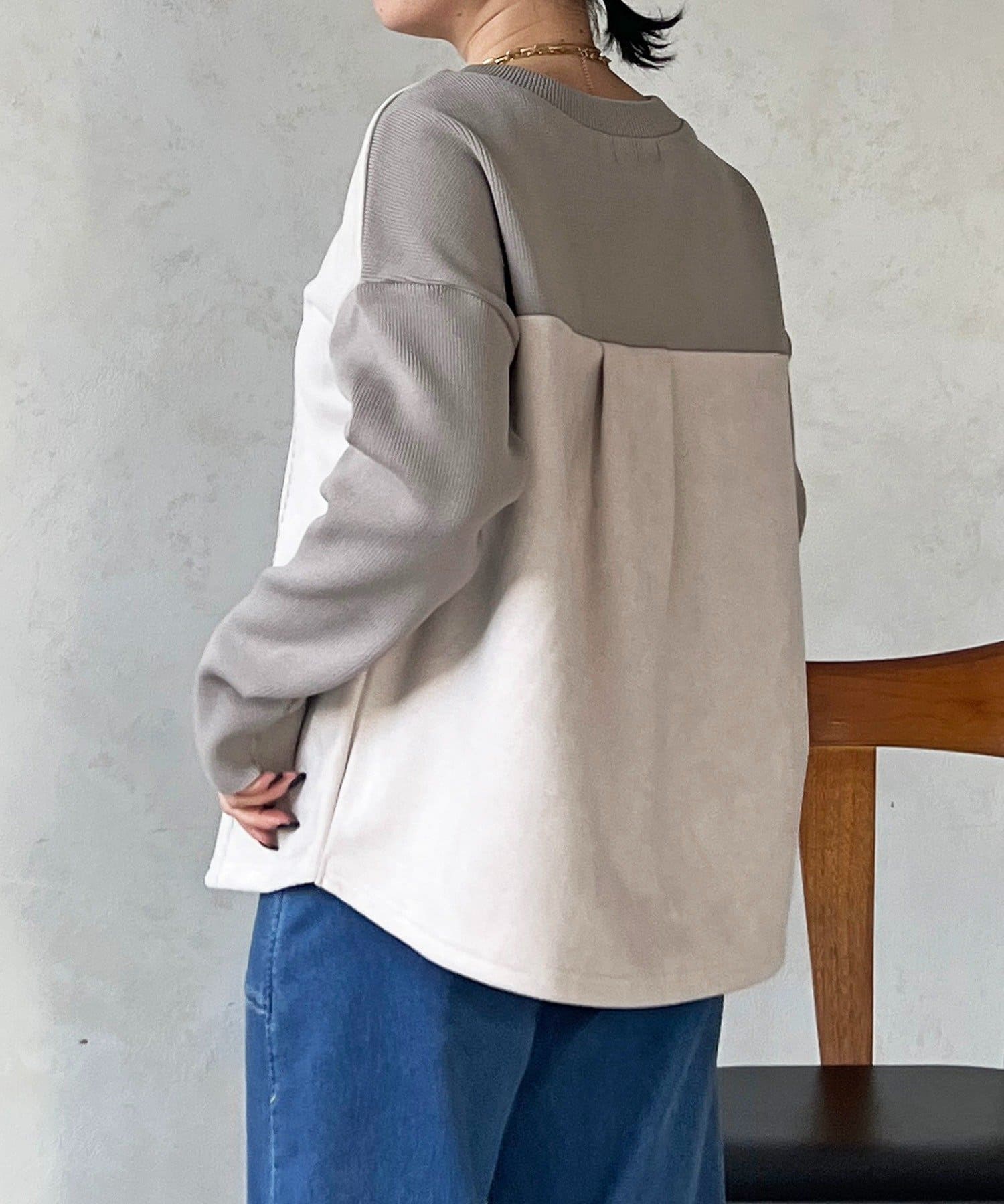 スエードと袖リブニットの切替デザインが一枚でこなれ感を演出