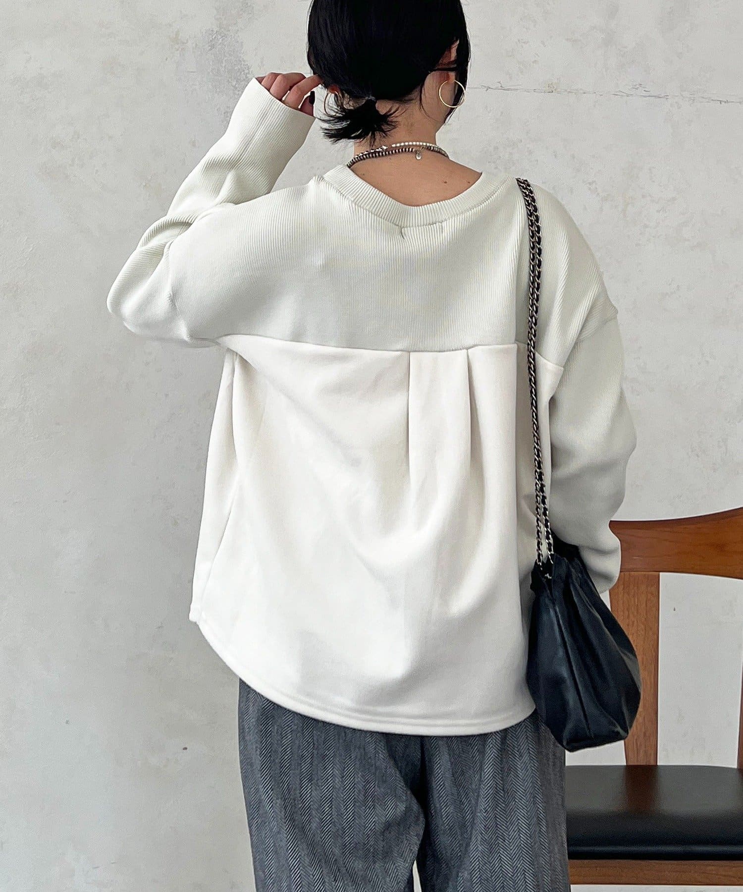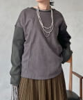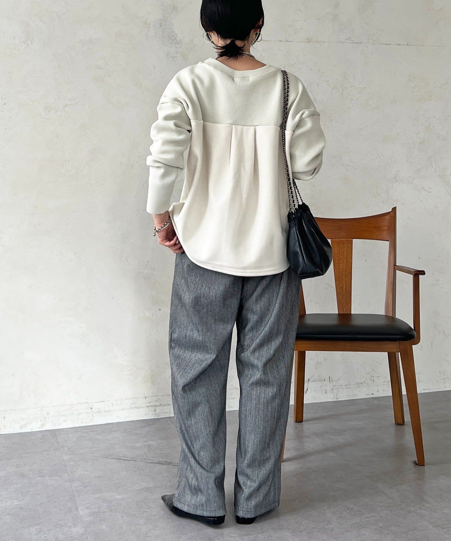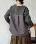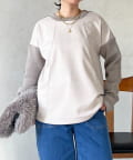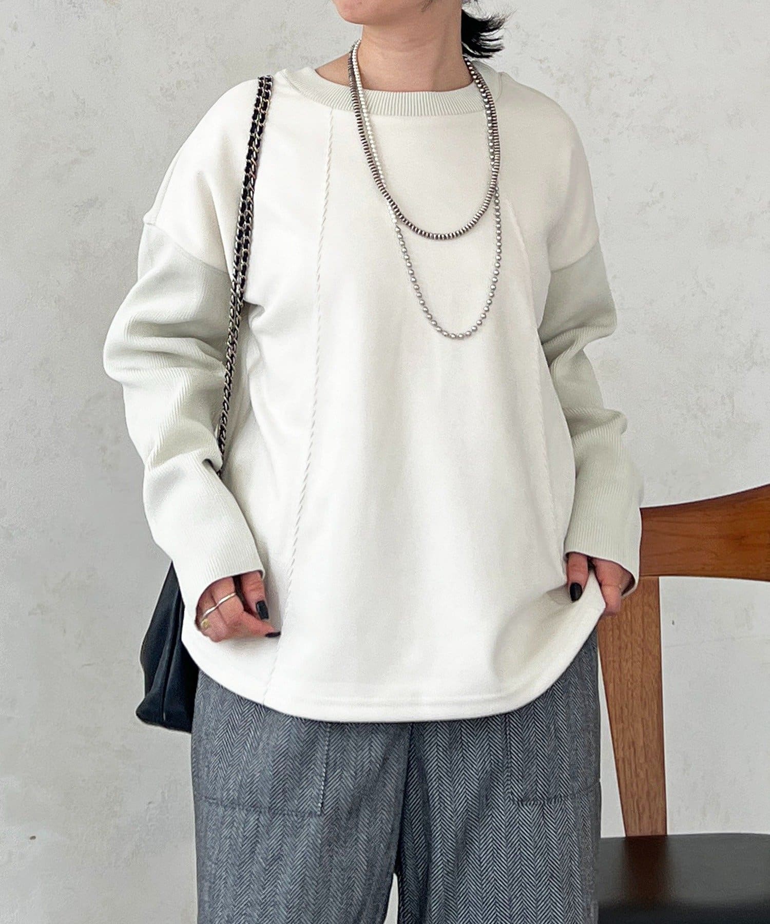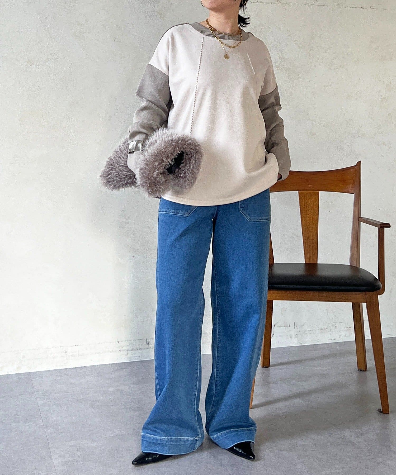 スエードと袖リブニットの切替デザインが一枚でこなれ感を演出