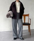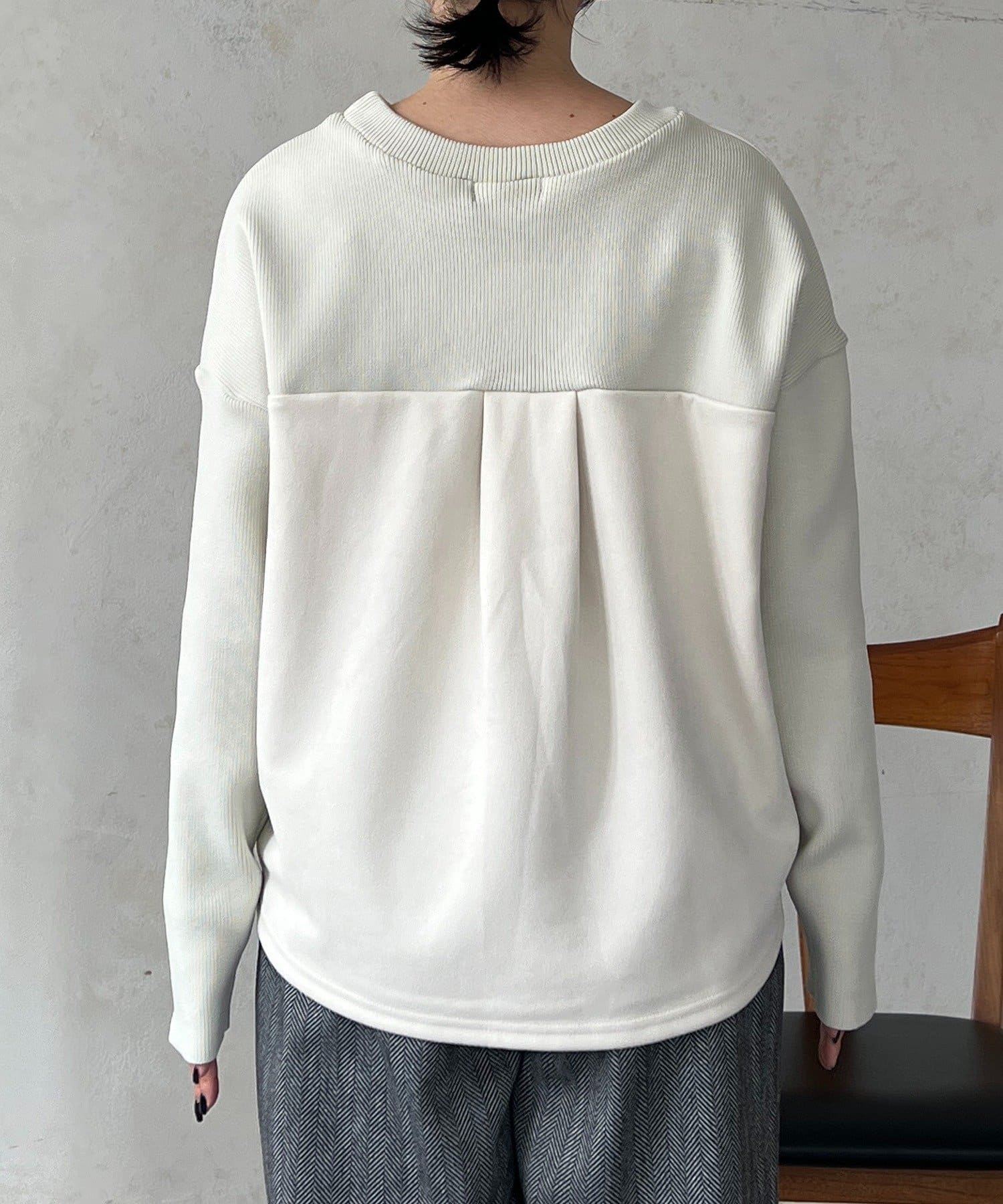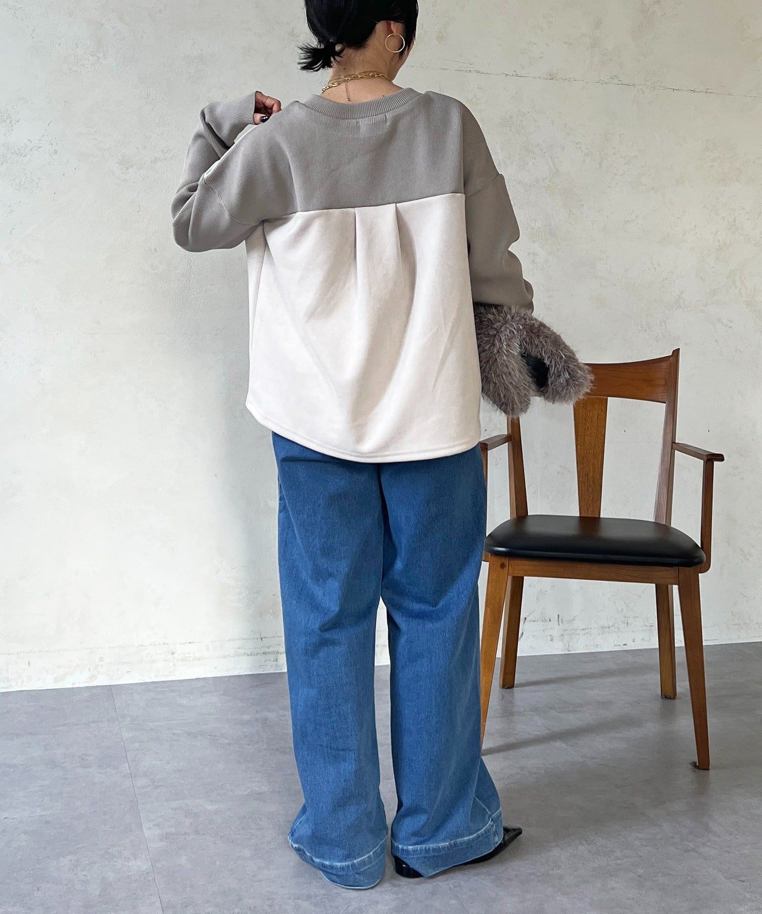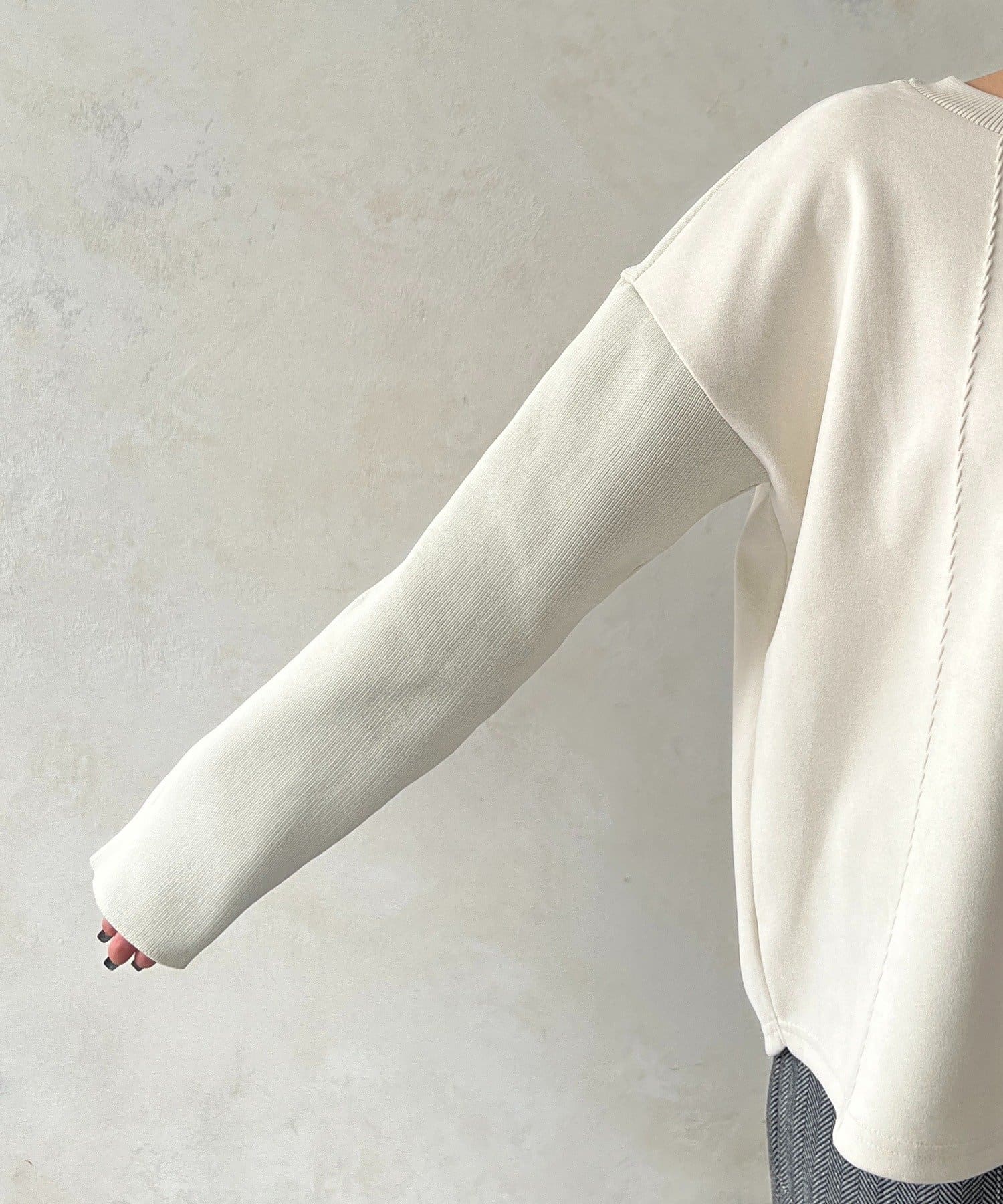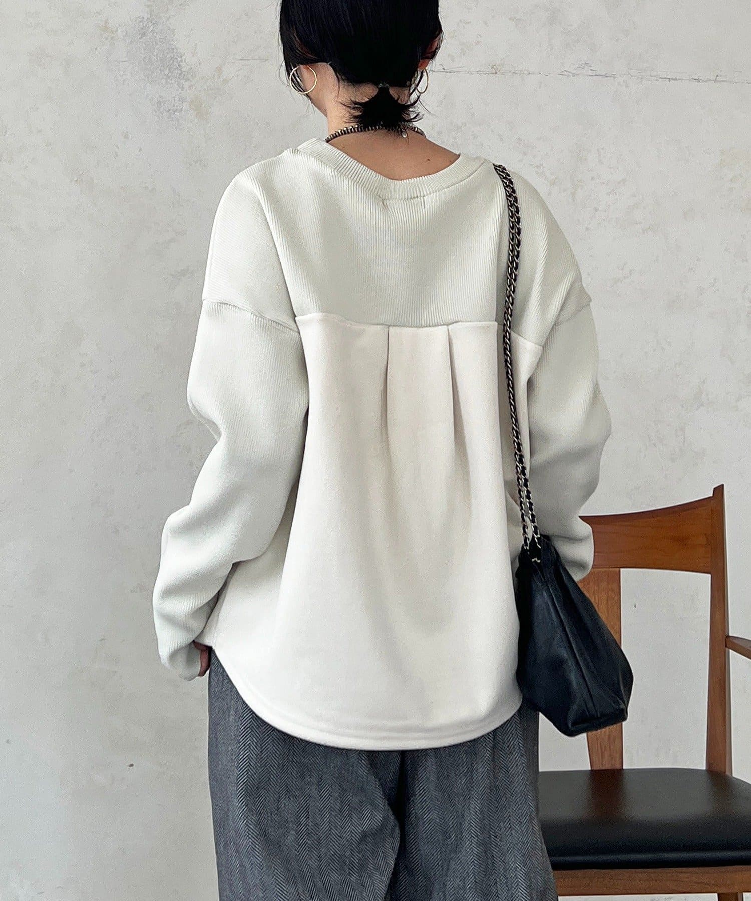 スエードと袖リブニットの切替デザインが一枚でこなれ感を演出