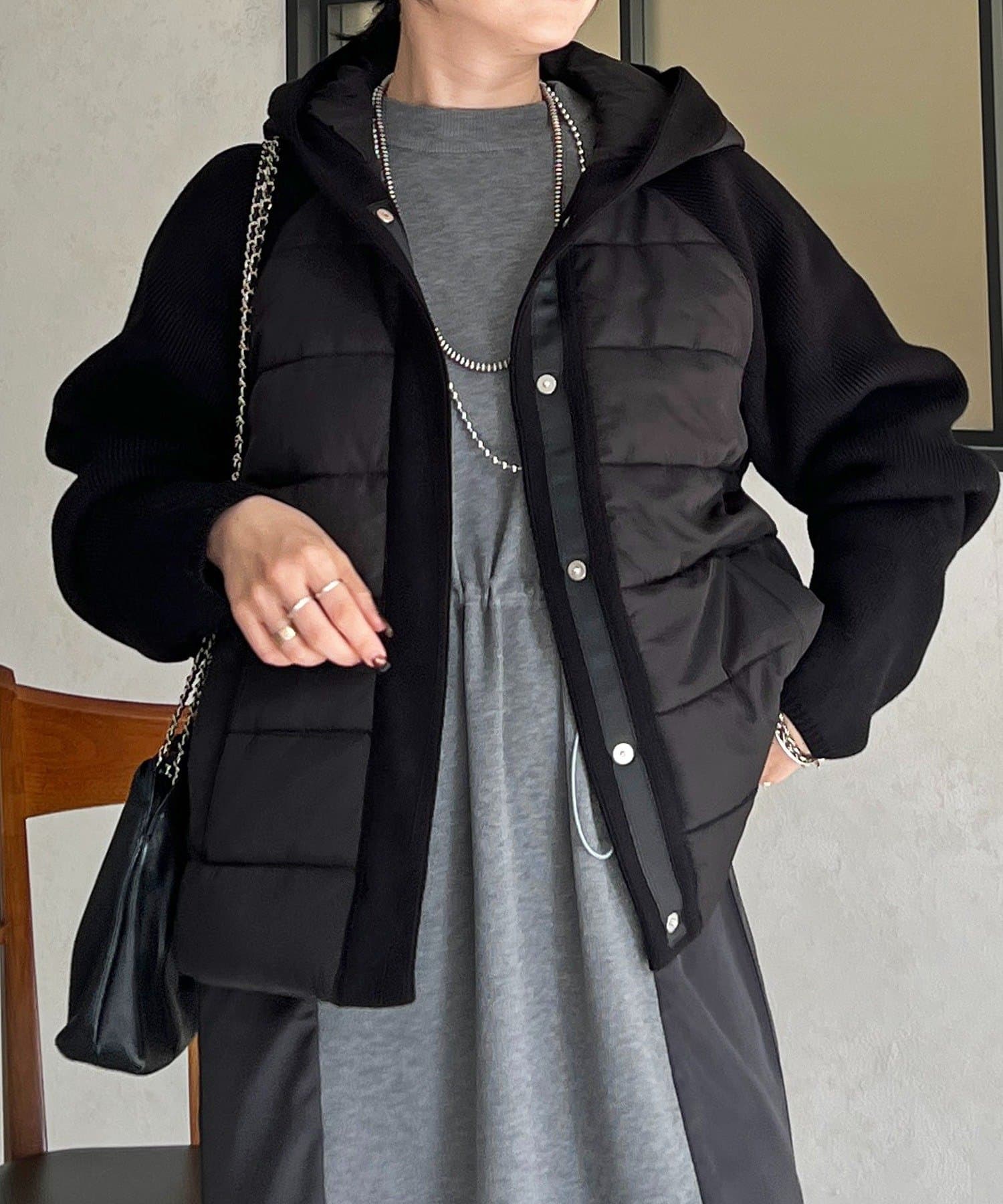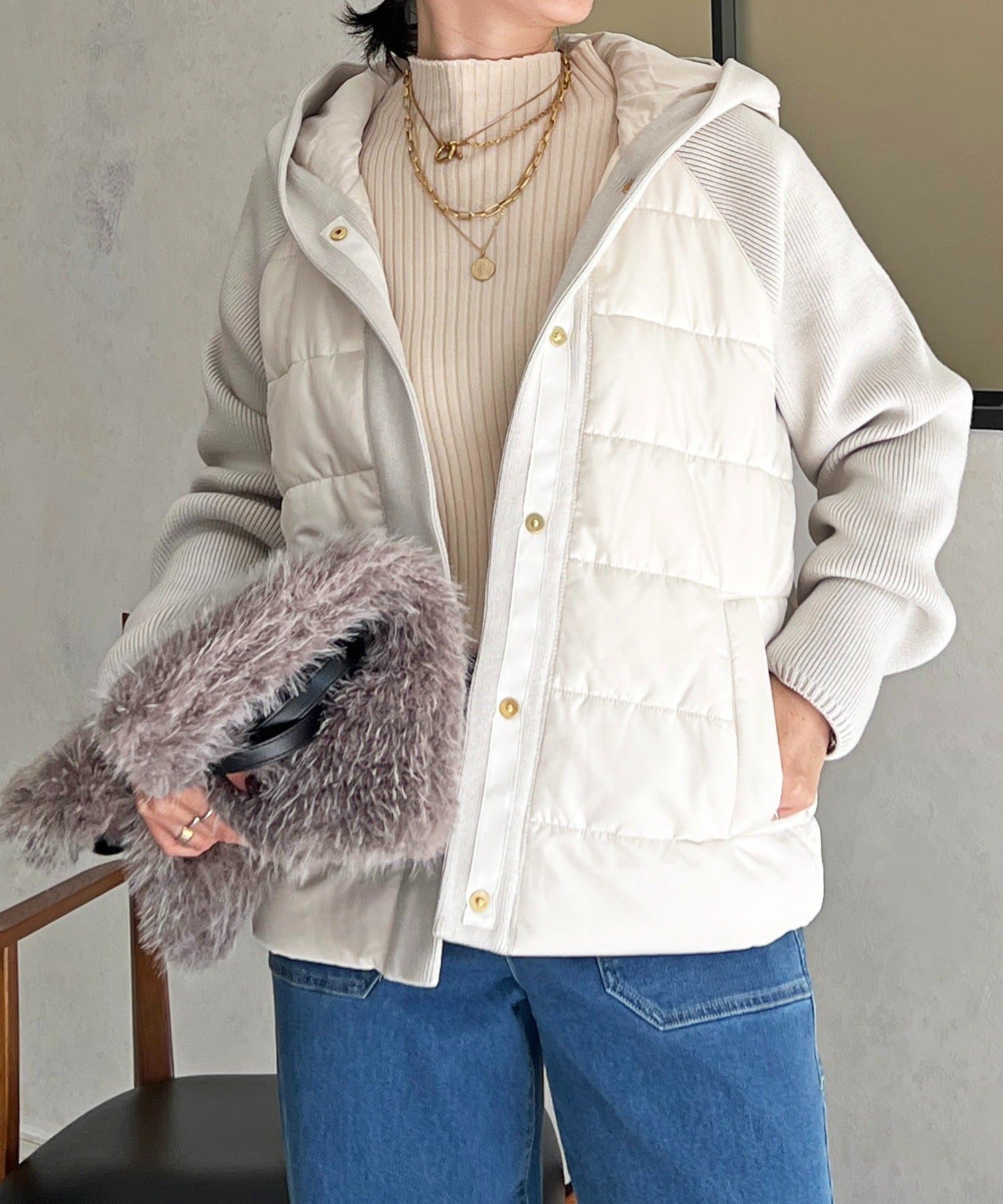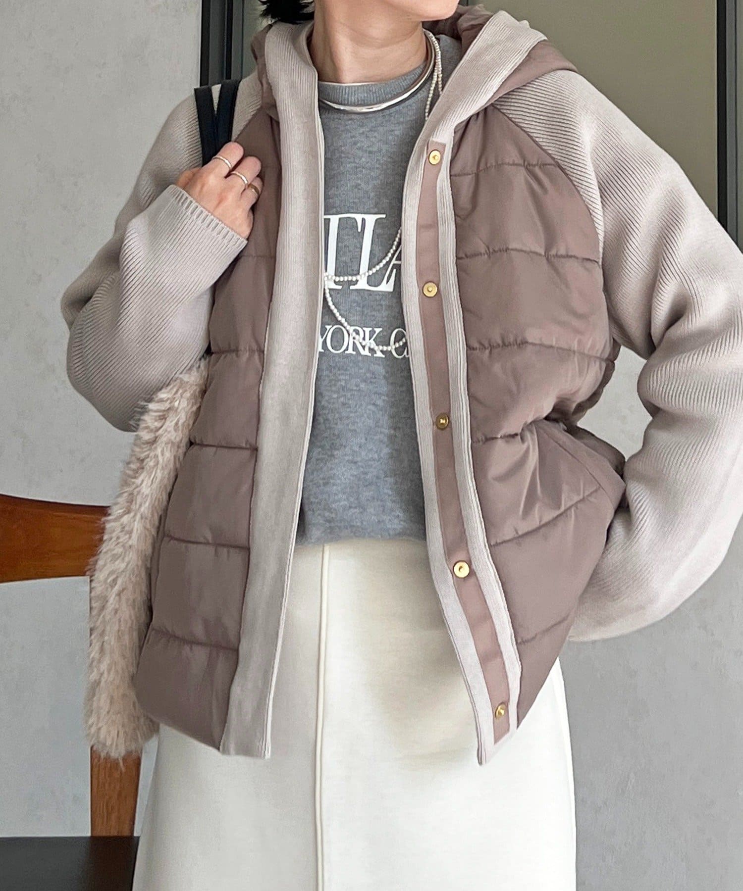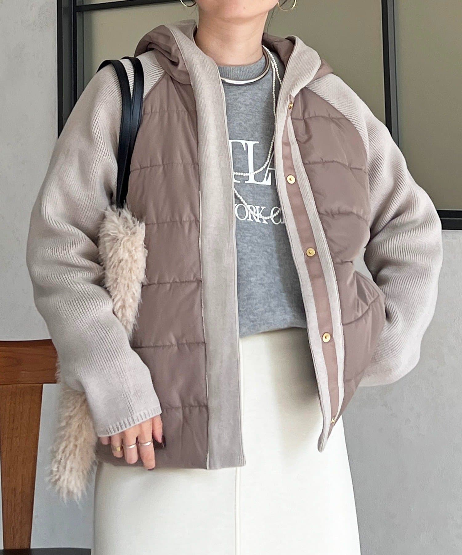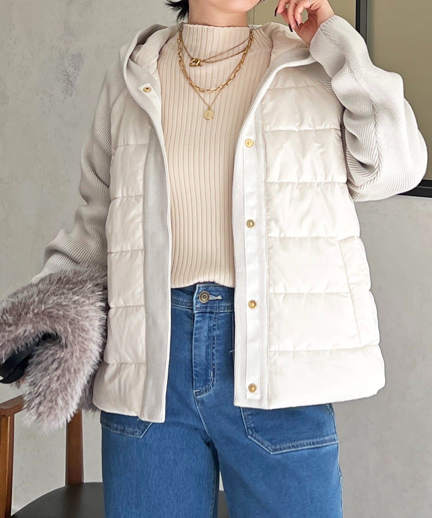 ・中綿の身頃と袖はニットの切替で、カーディガン感覚で羽織れるアウター