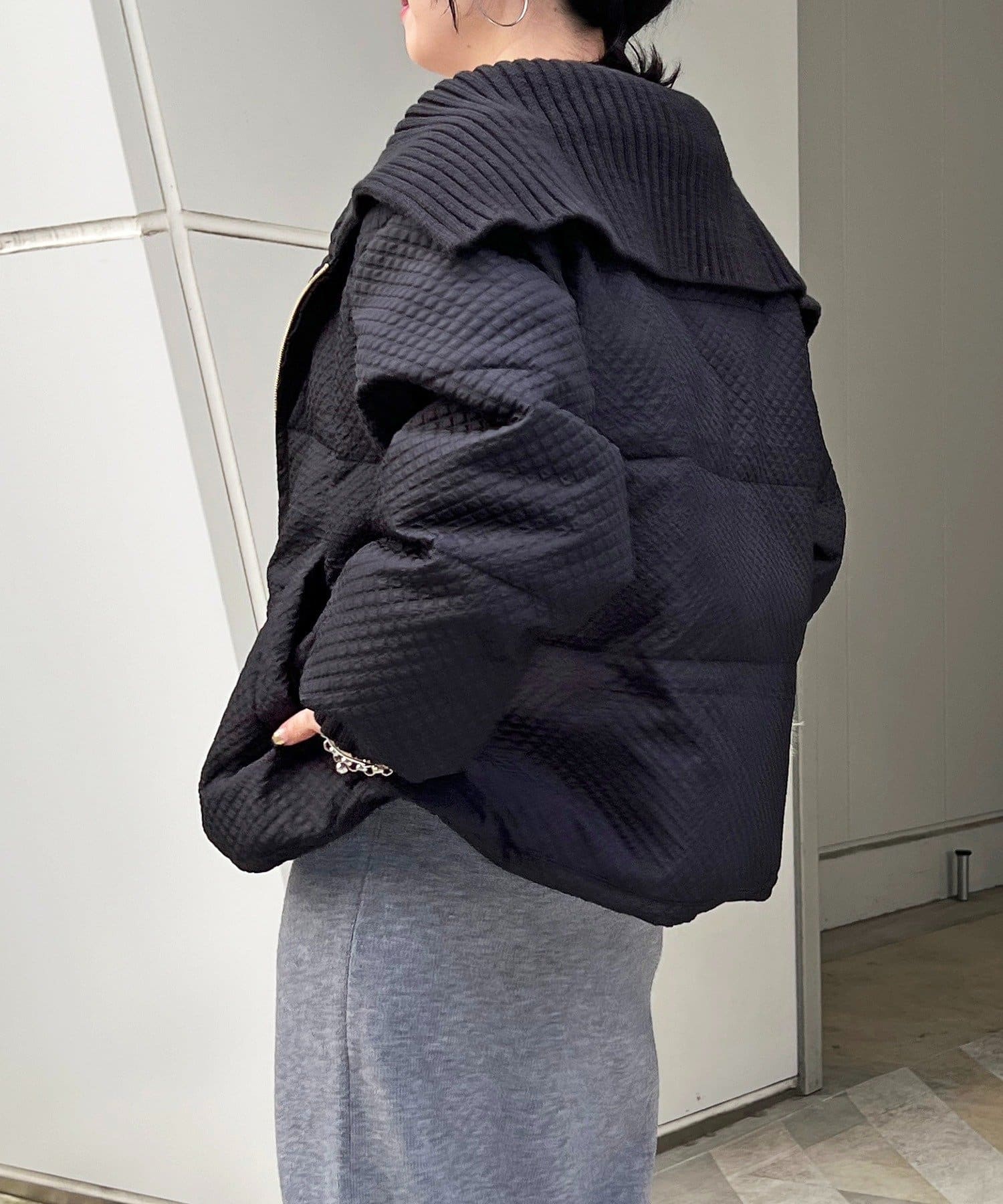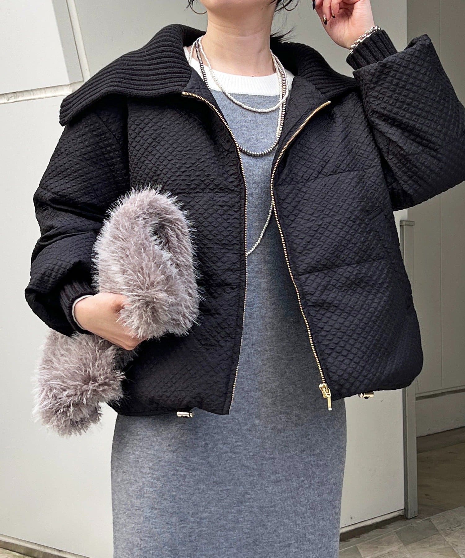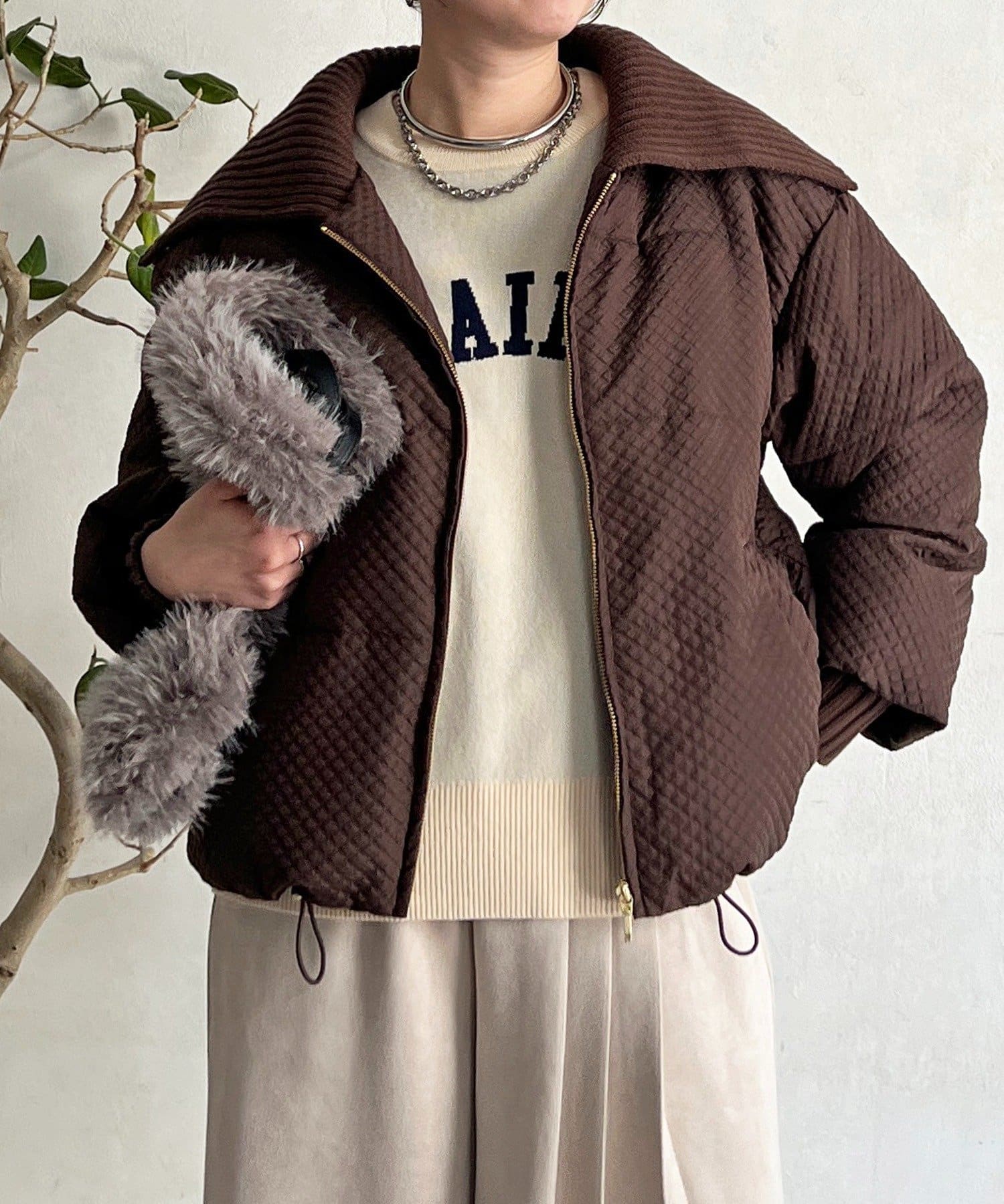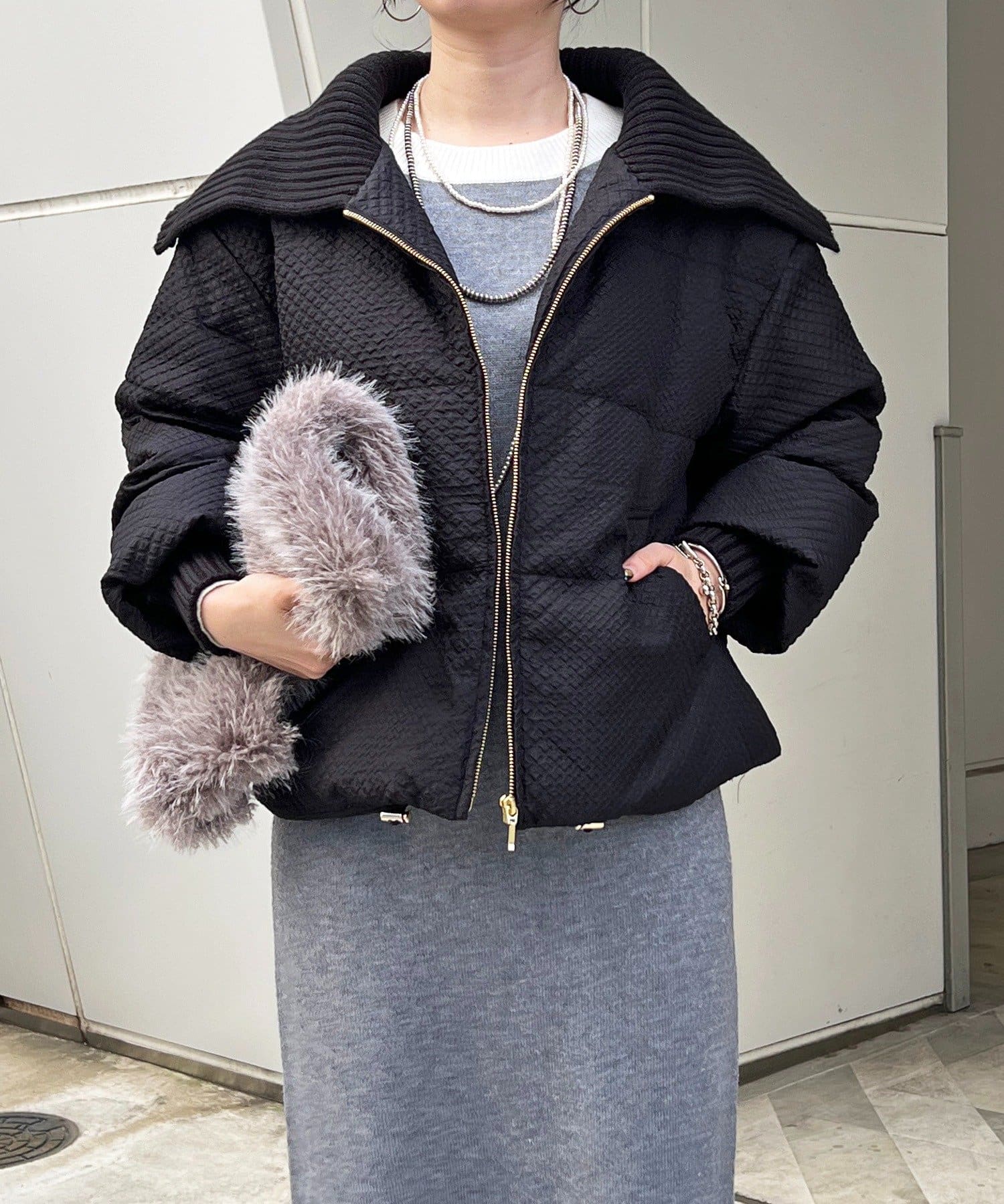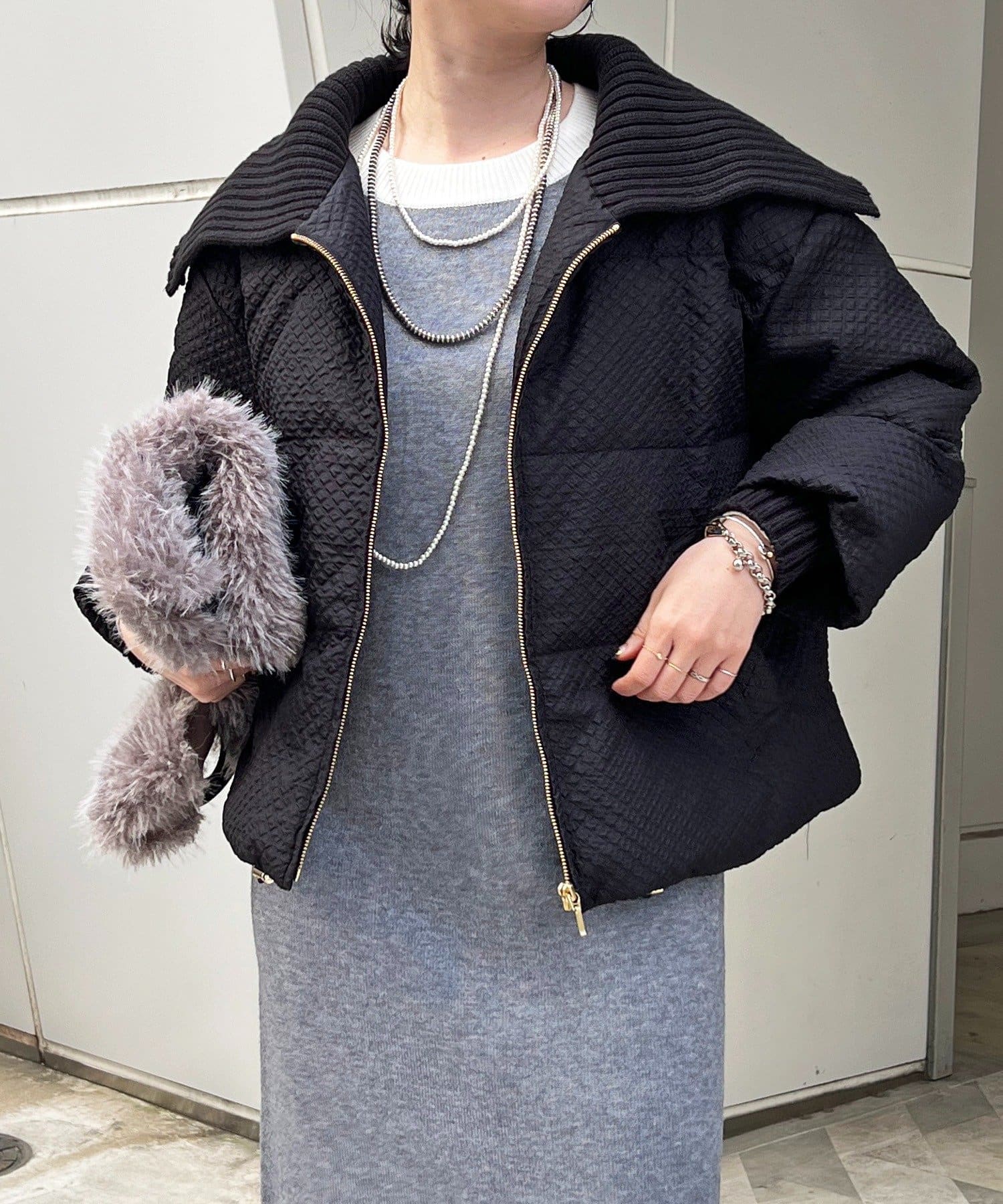 凹凸感のある素材感と2WAY仕様の襟で大人可愛く防寒できるダウン