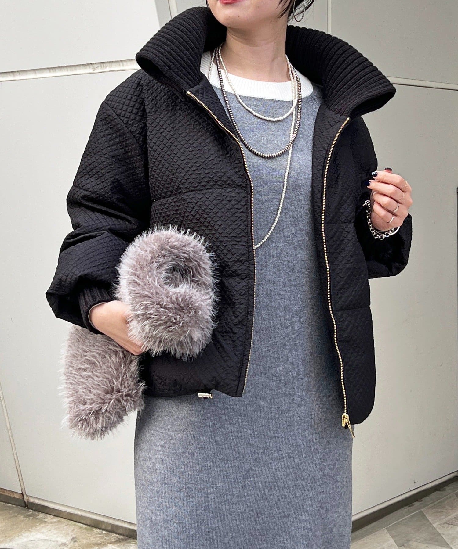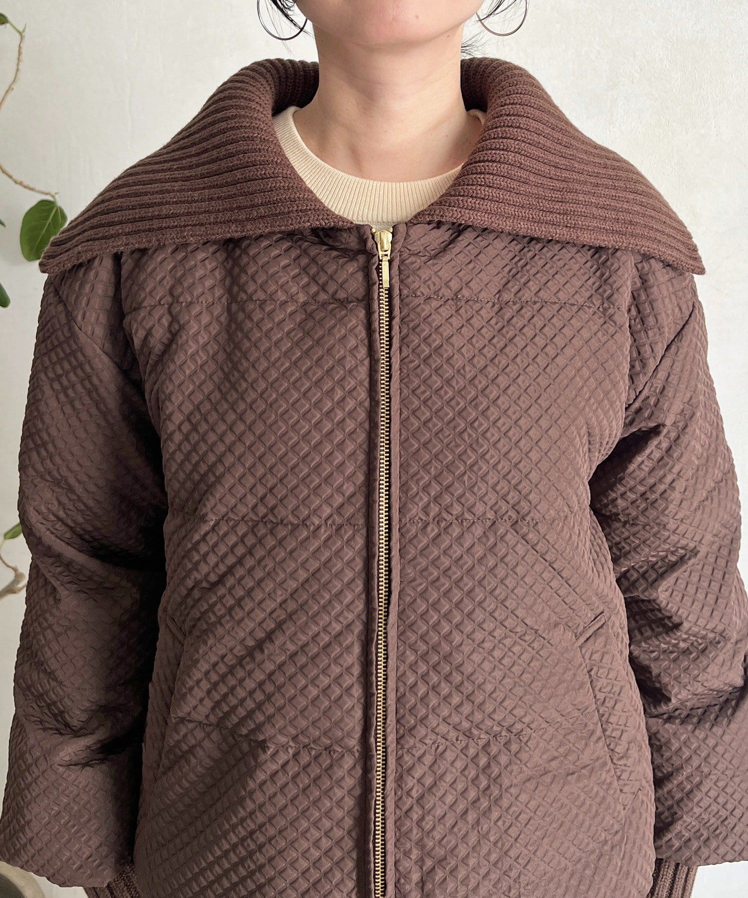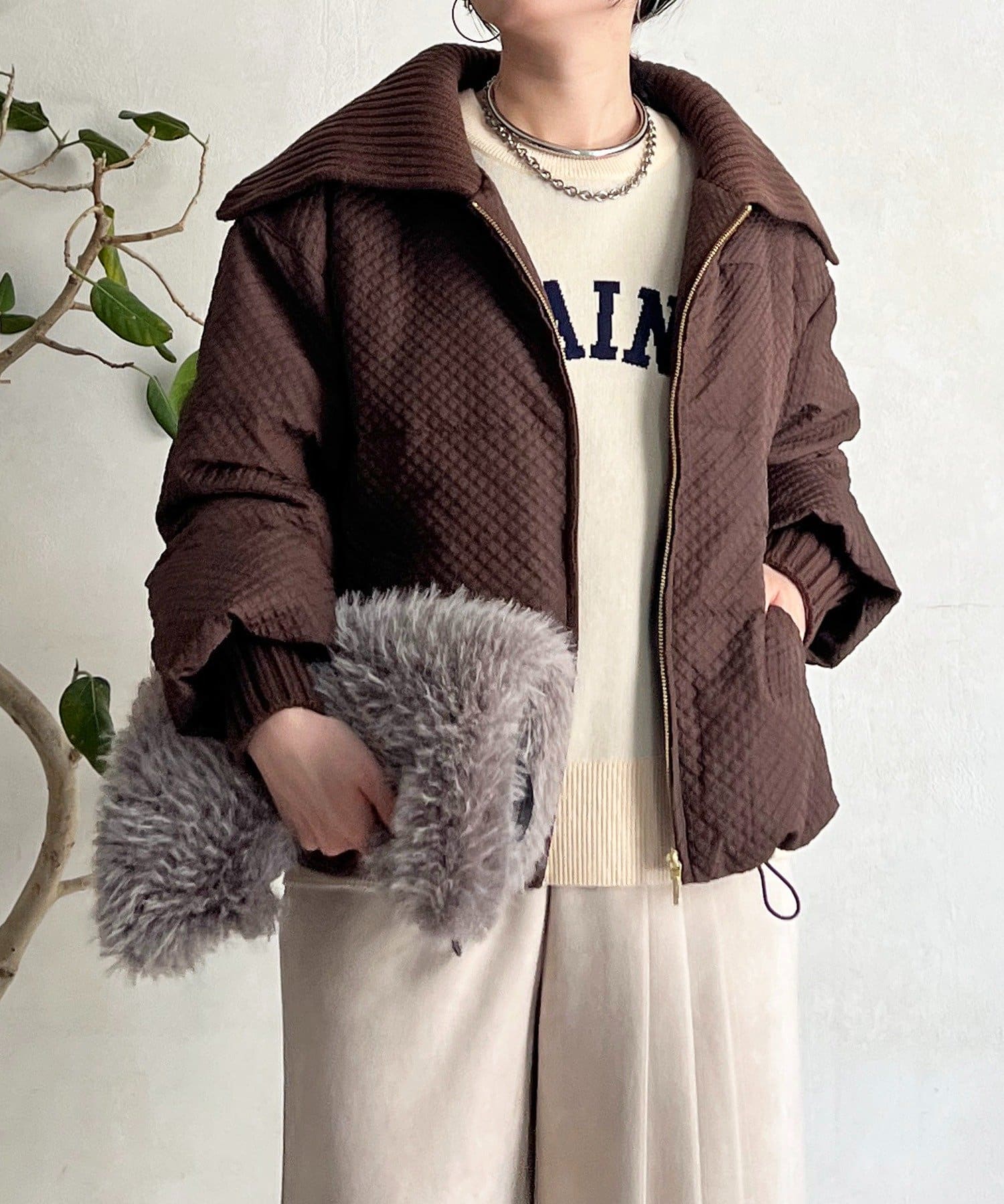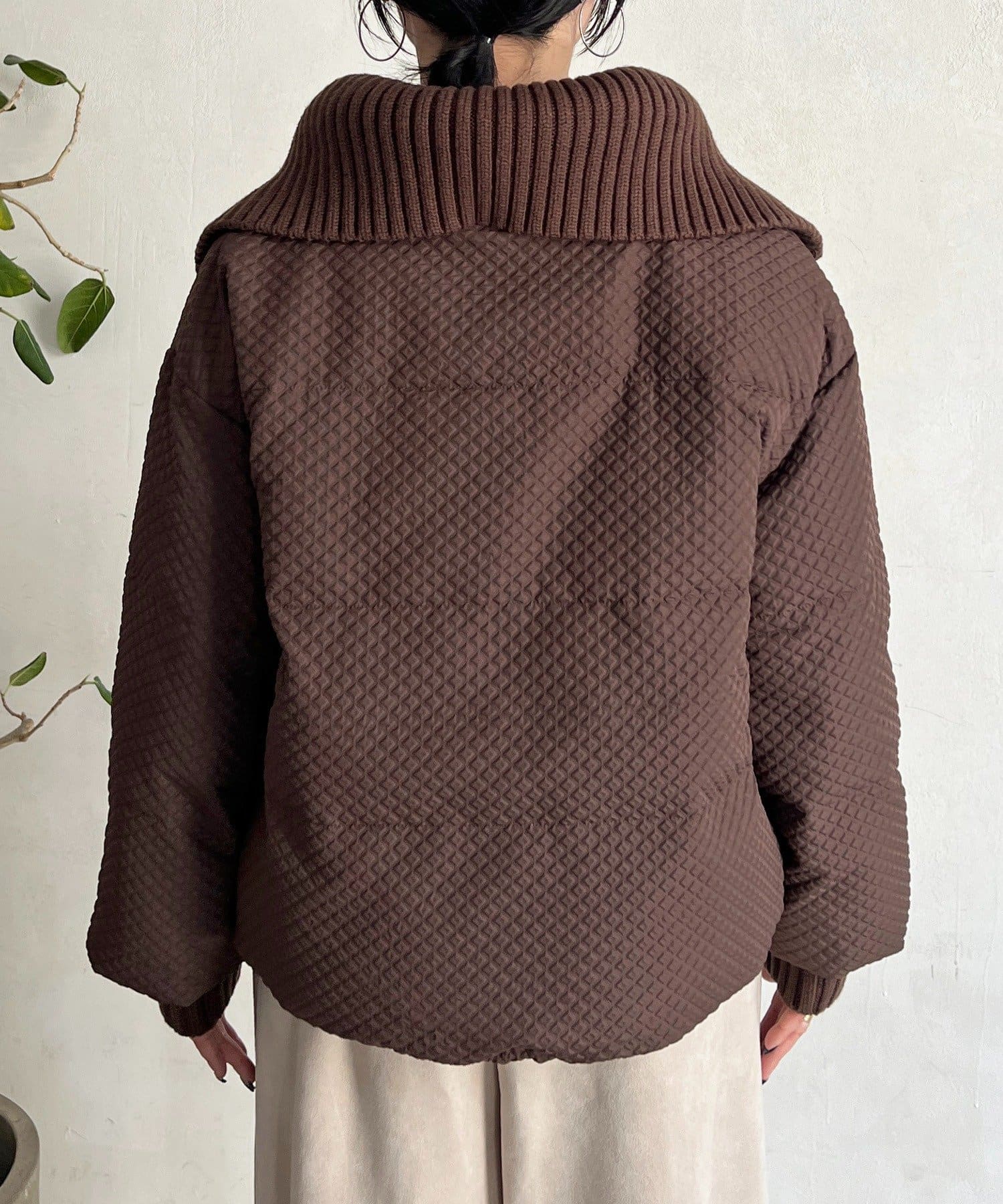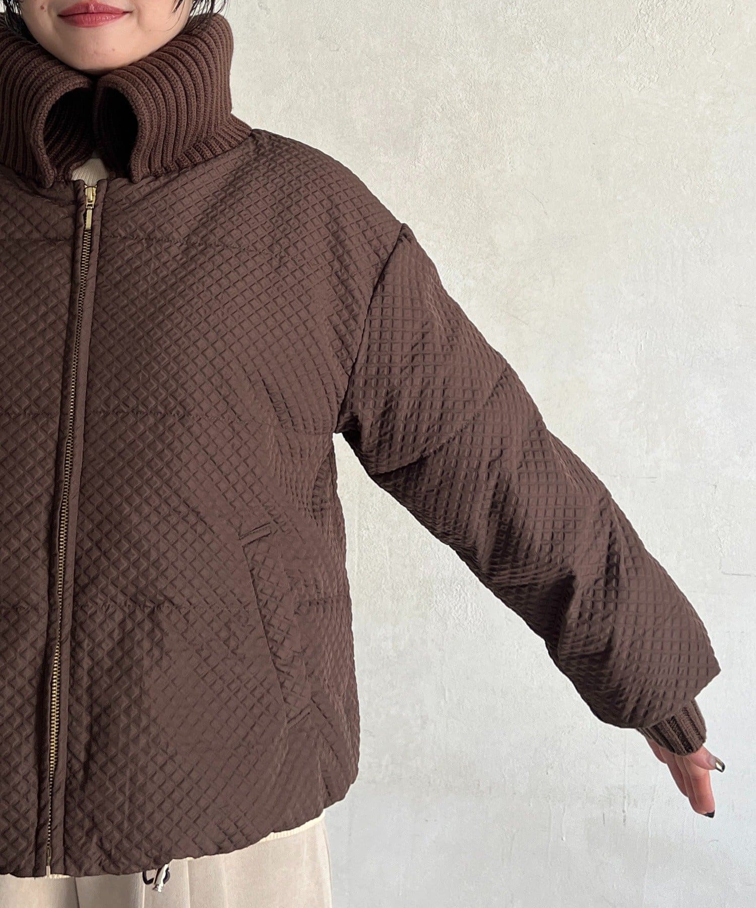 凹凸感のある素材感と2WAY仕様の襟で大人可愛く防寒できるダウン