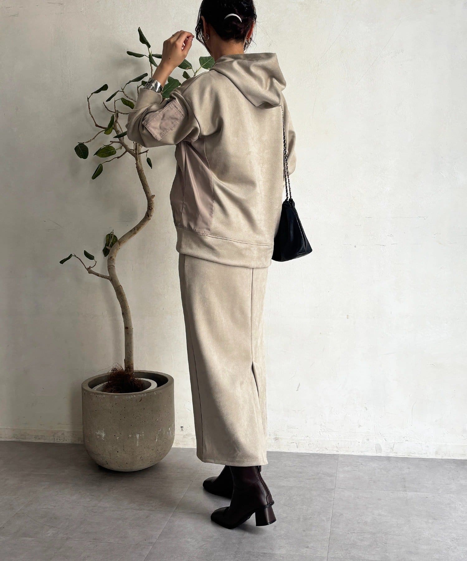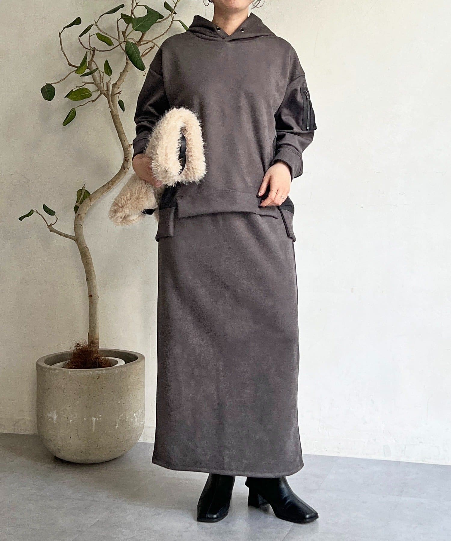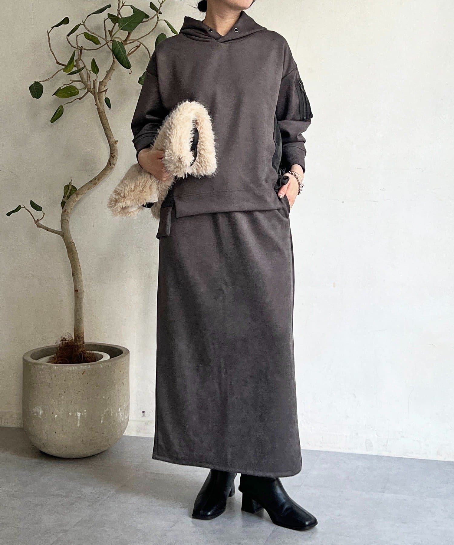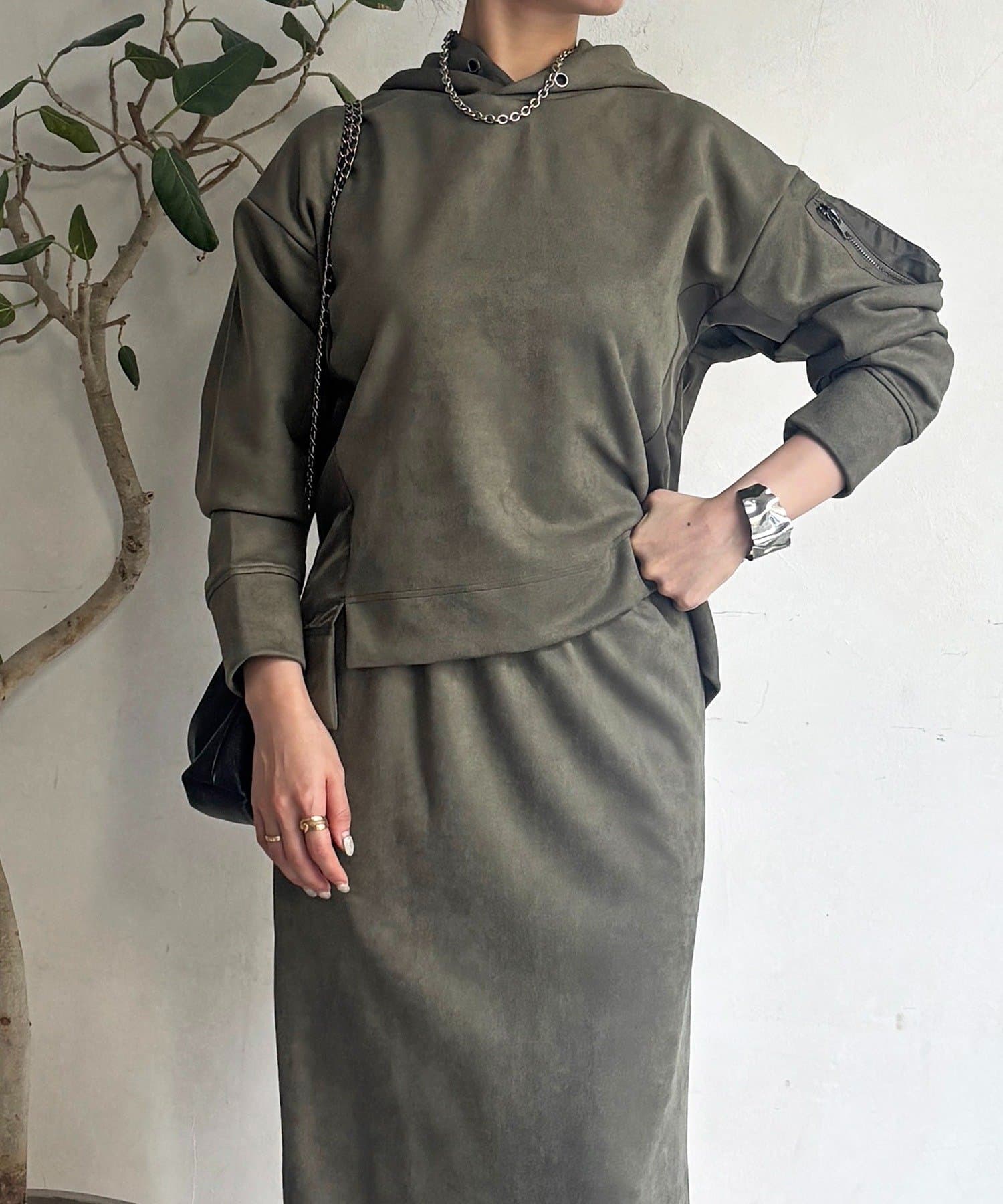・今からの季節にピッタリなフェイクスエード素材のトップスとナロースカートのセットアイテム