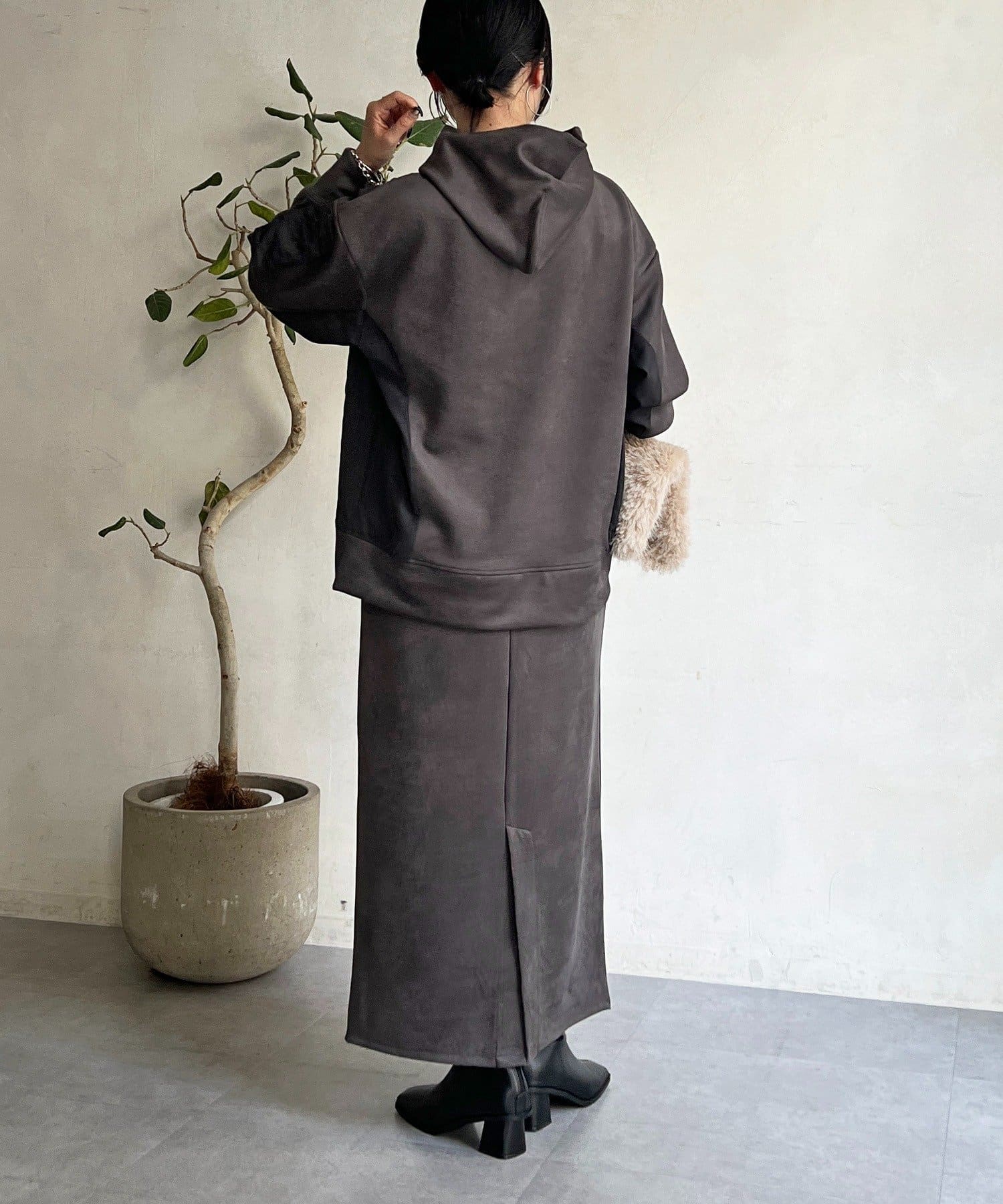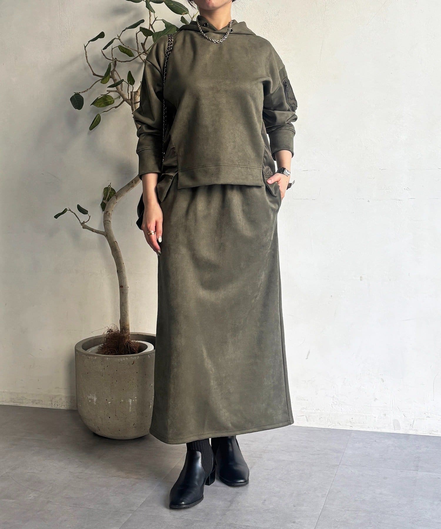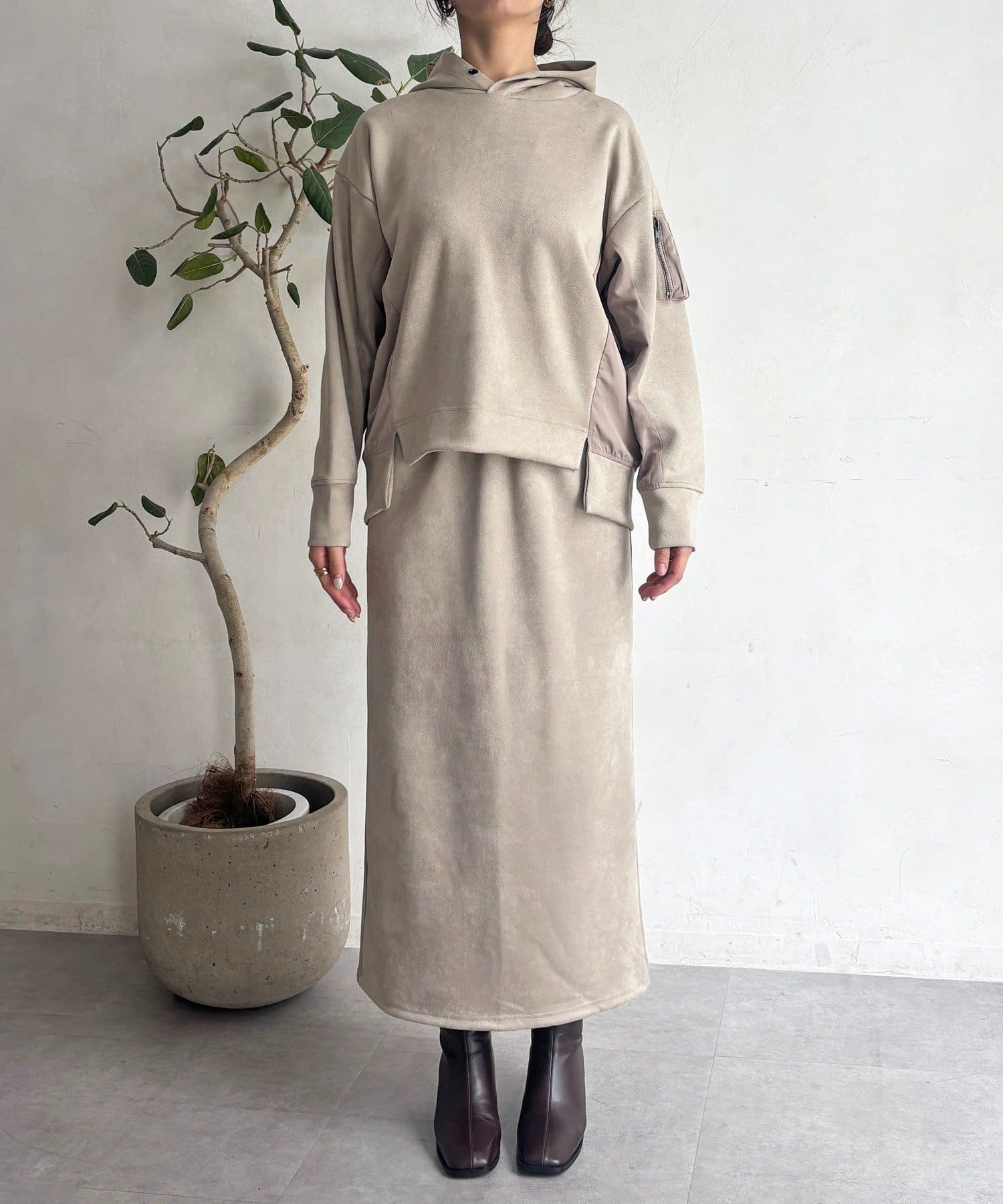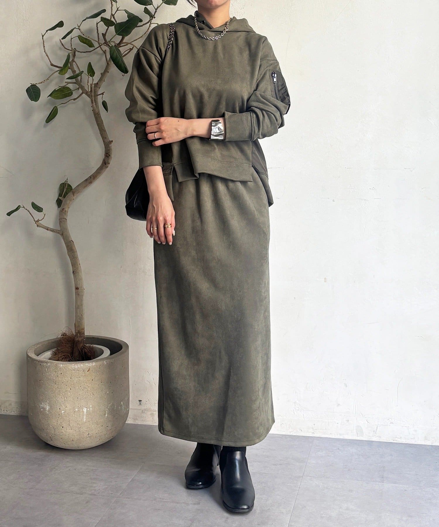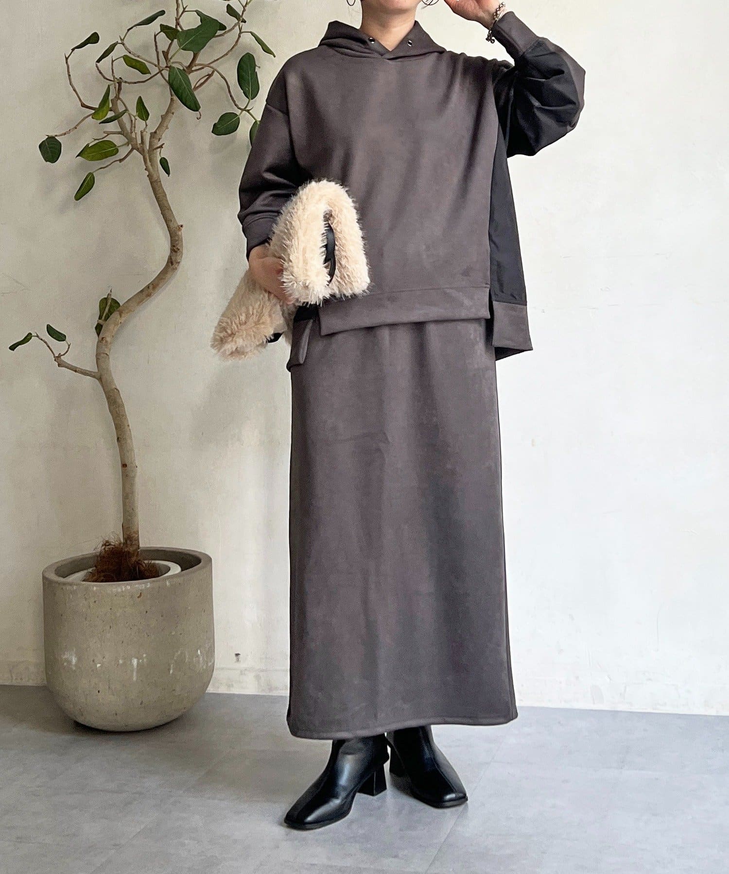 ・今からの季節にピッタリなフェイクスエード素材のトップスとナロースカートのセットアイテム