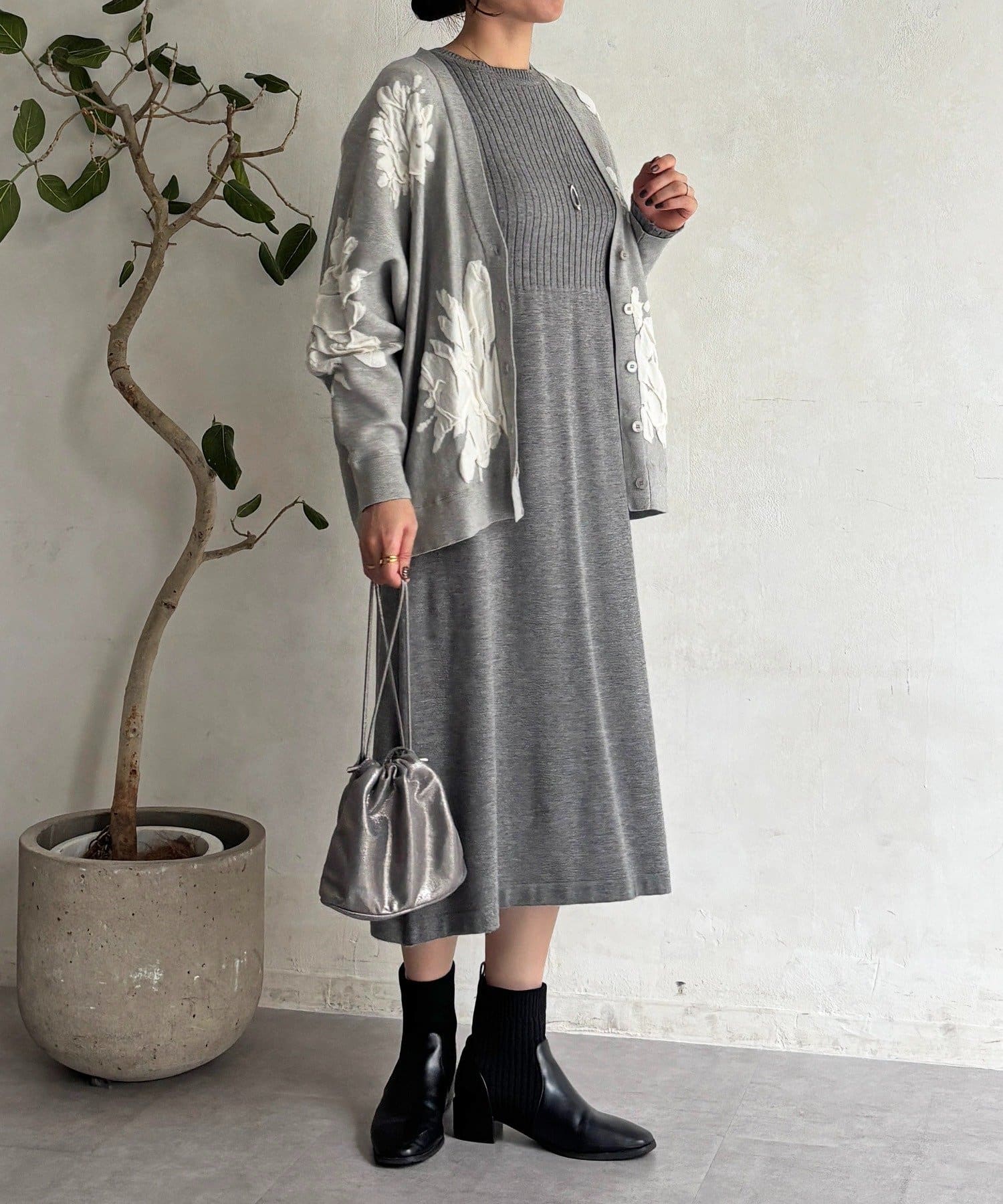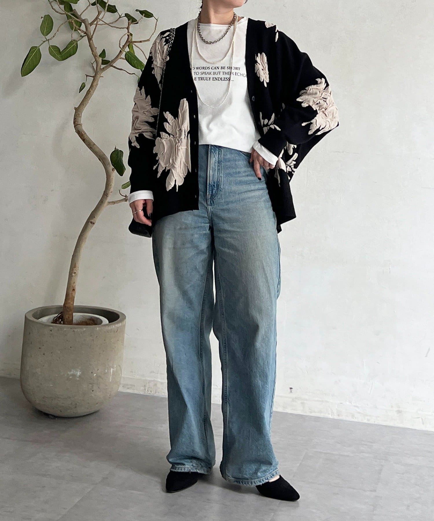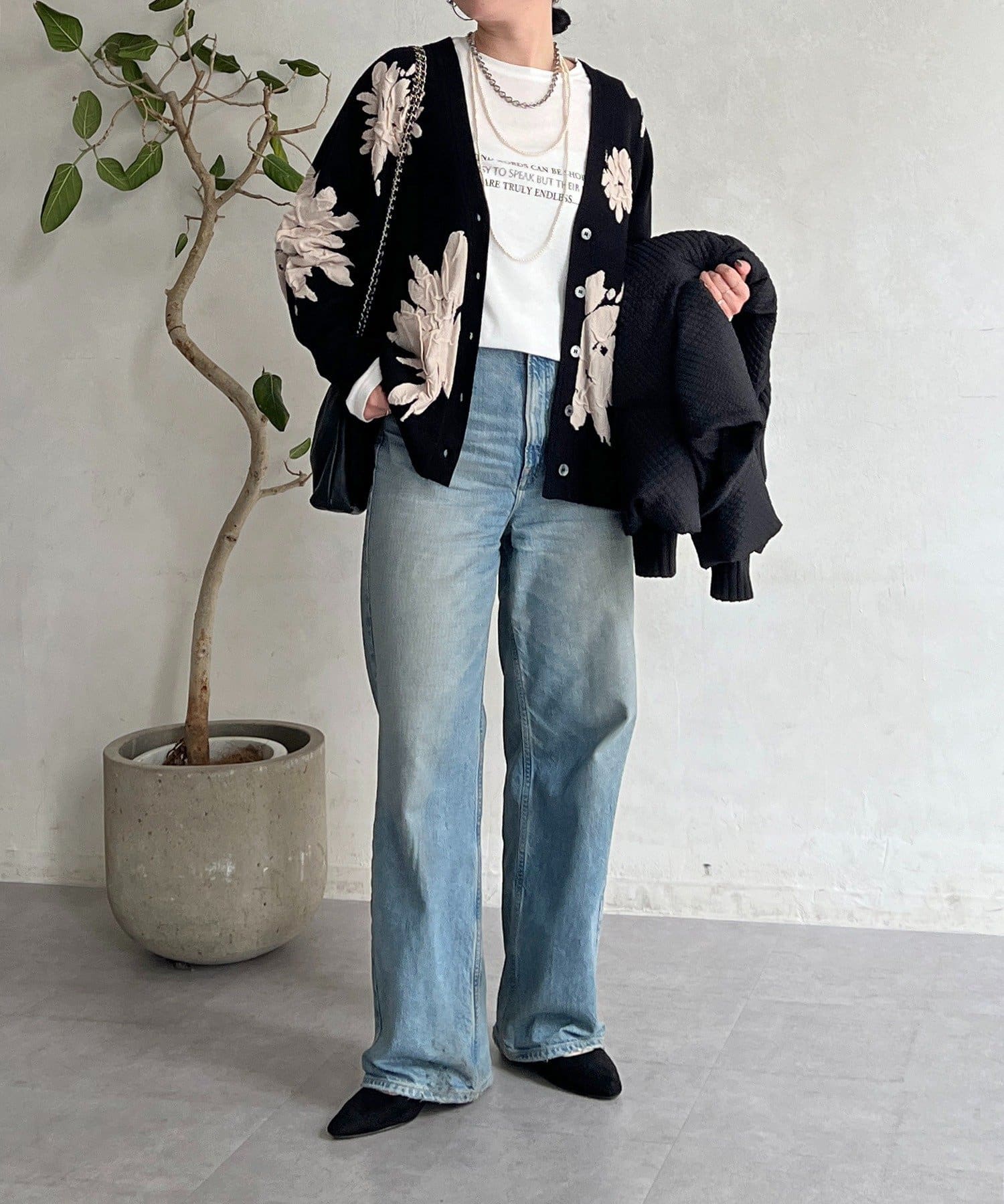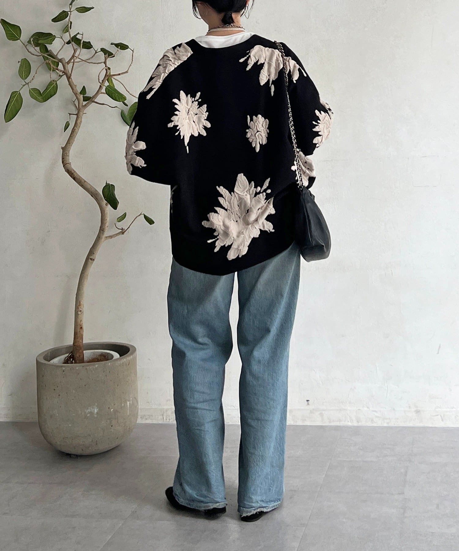 ・大判の花柄が暗くなりがちな冬コーデを華やかに◎