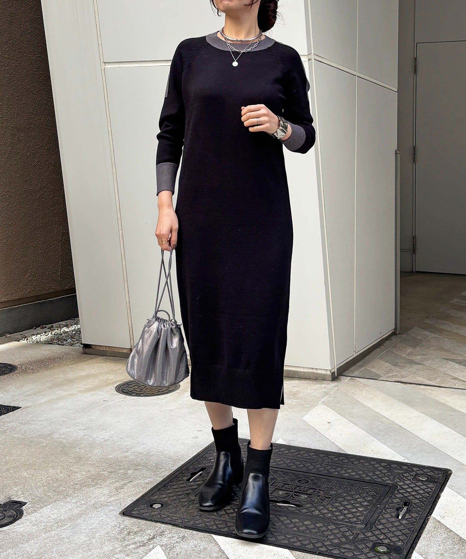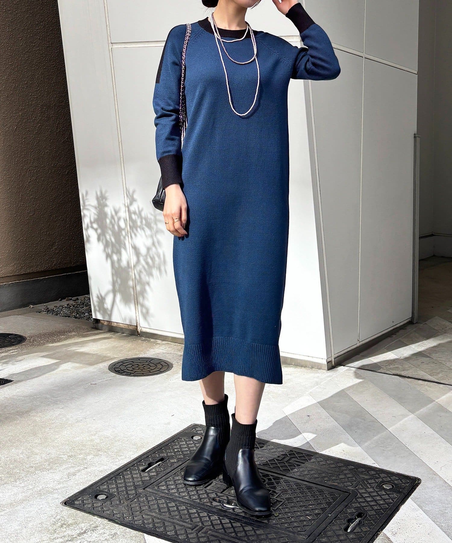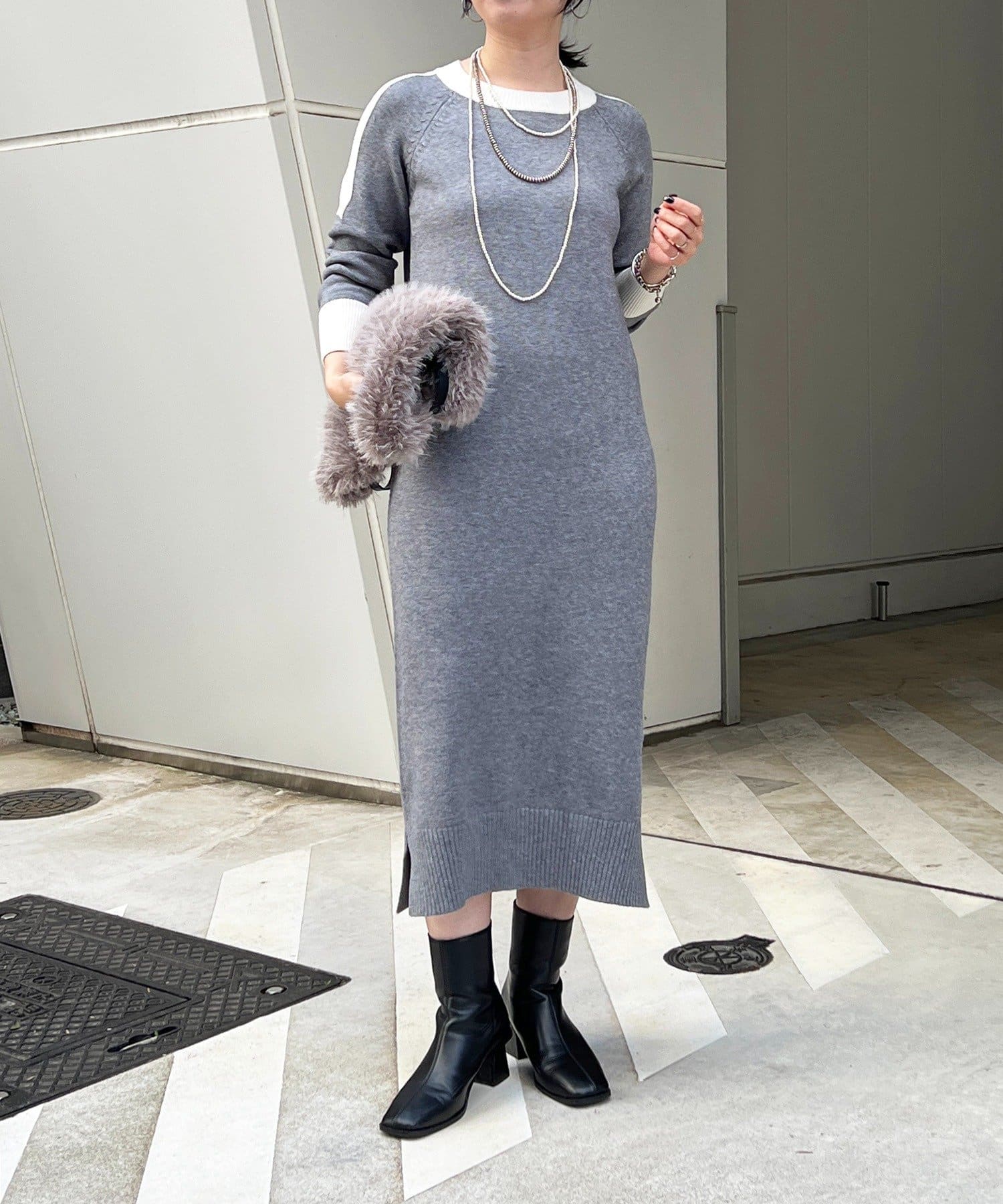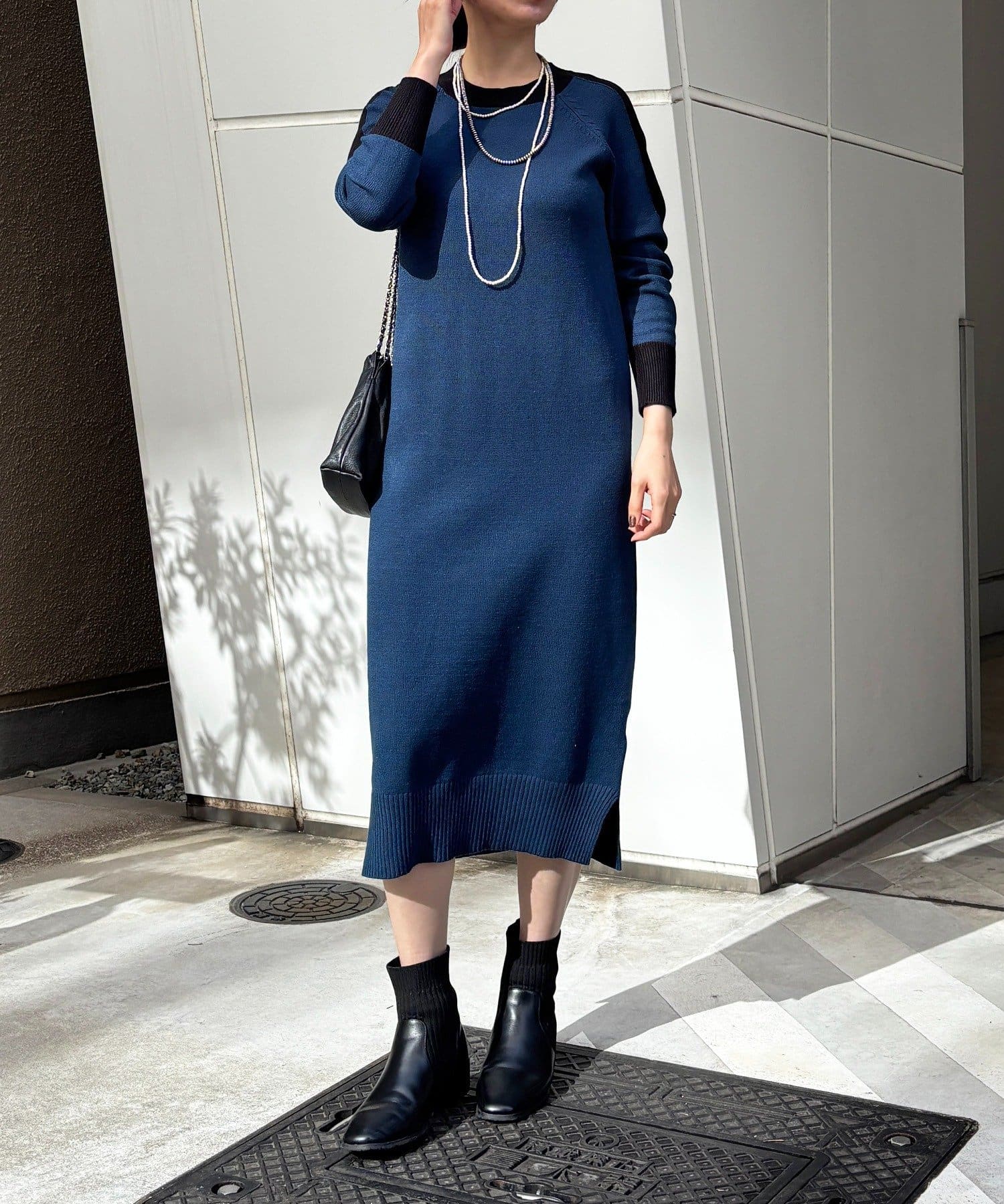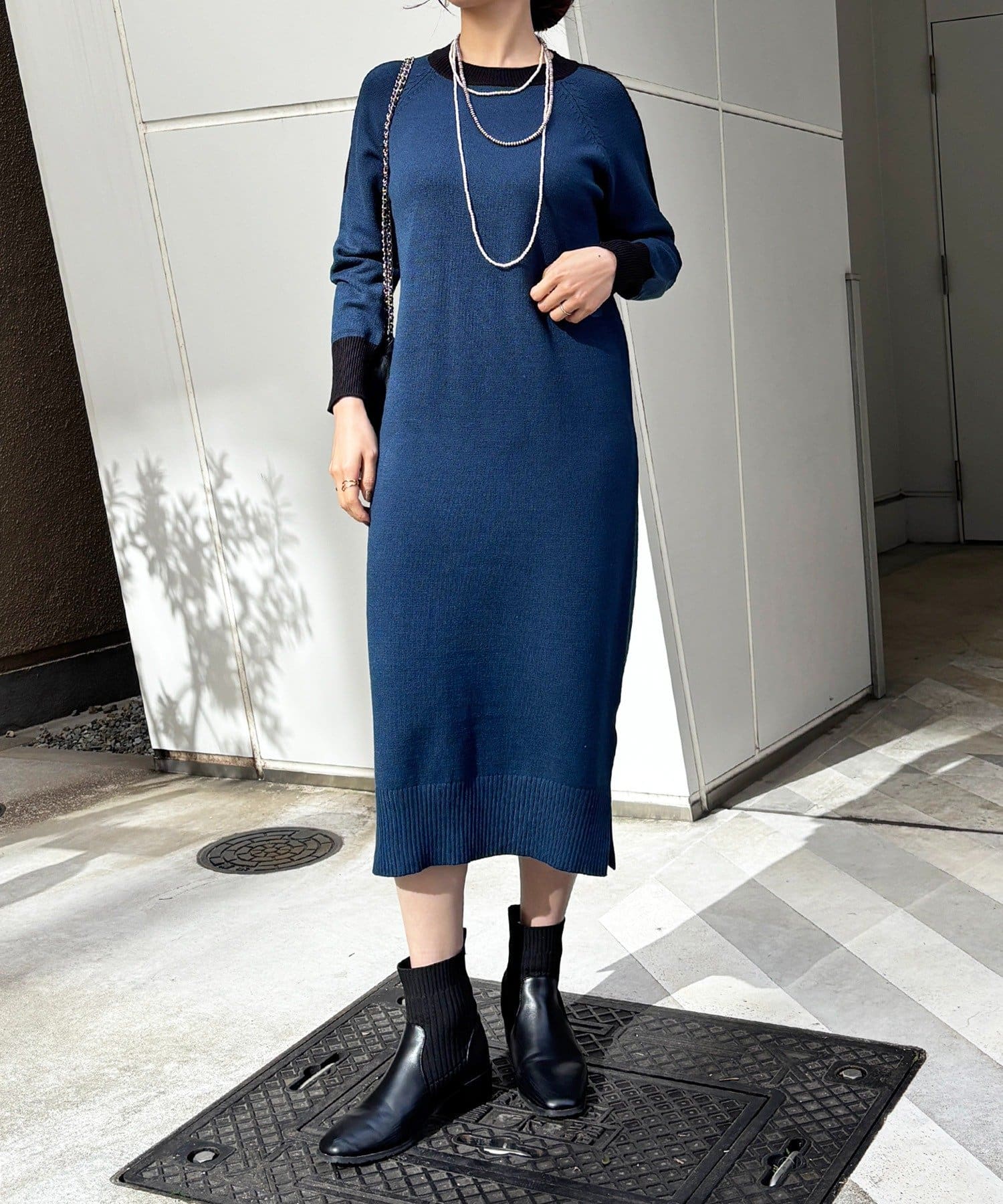 ・肩や袖の配色がこなれ感のあるニットワンピース