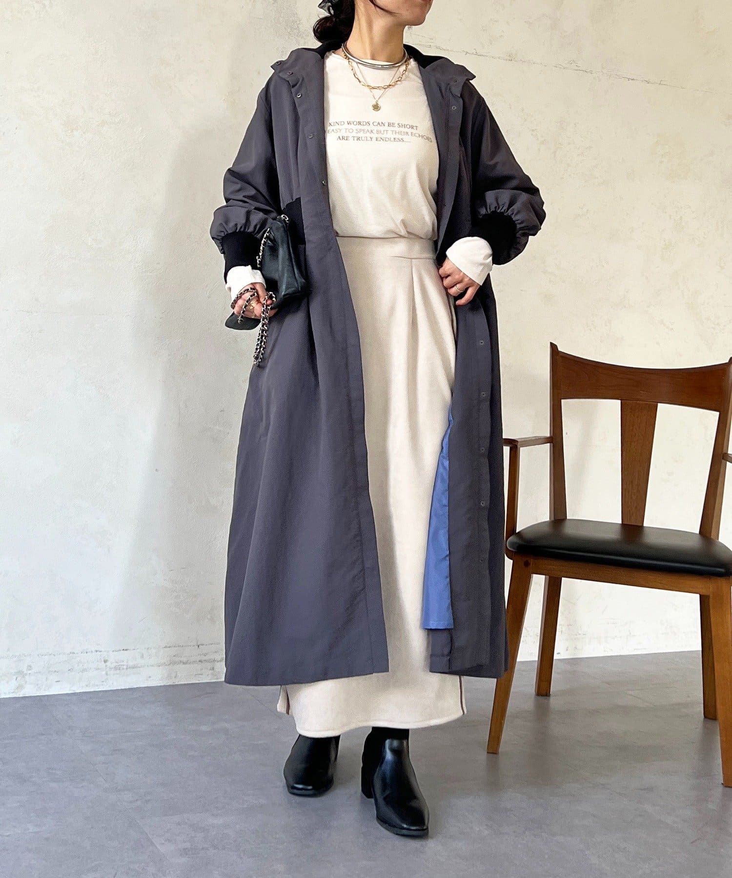・カジュアル素材と女性らしいAラインのシルエットが好バランス◎