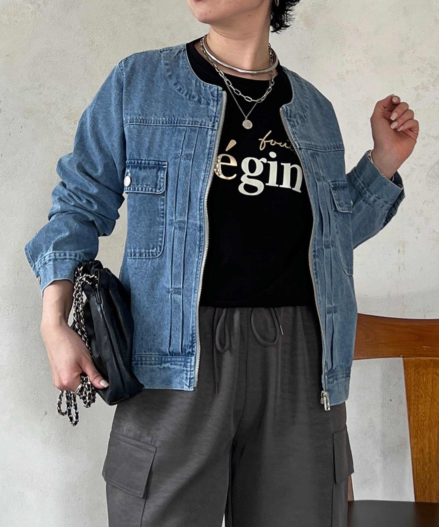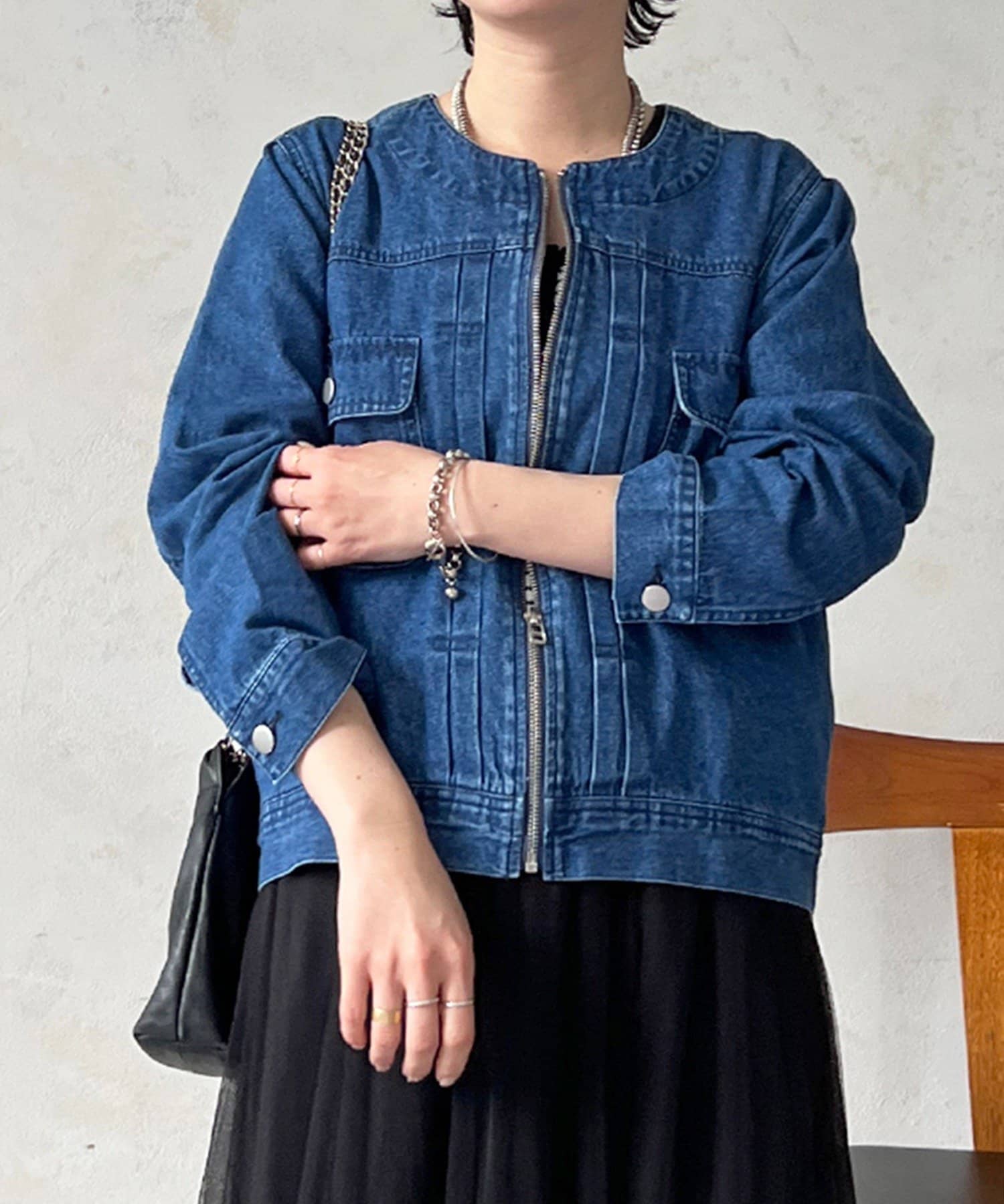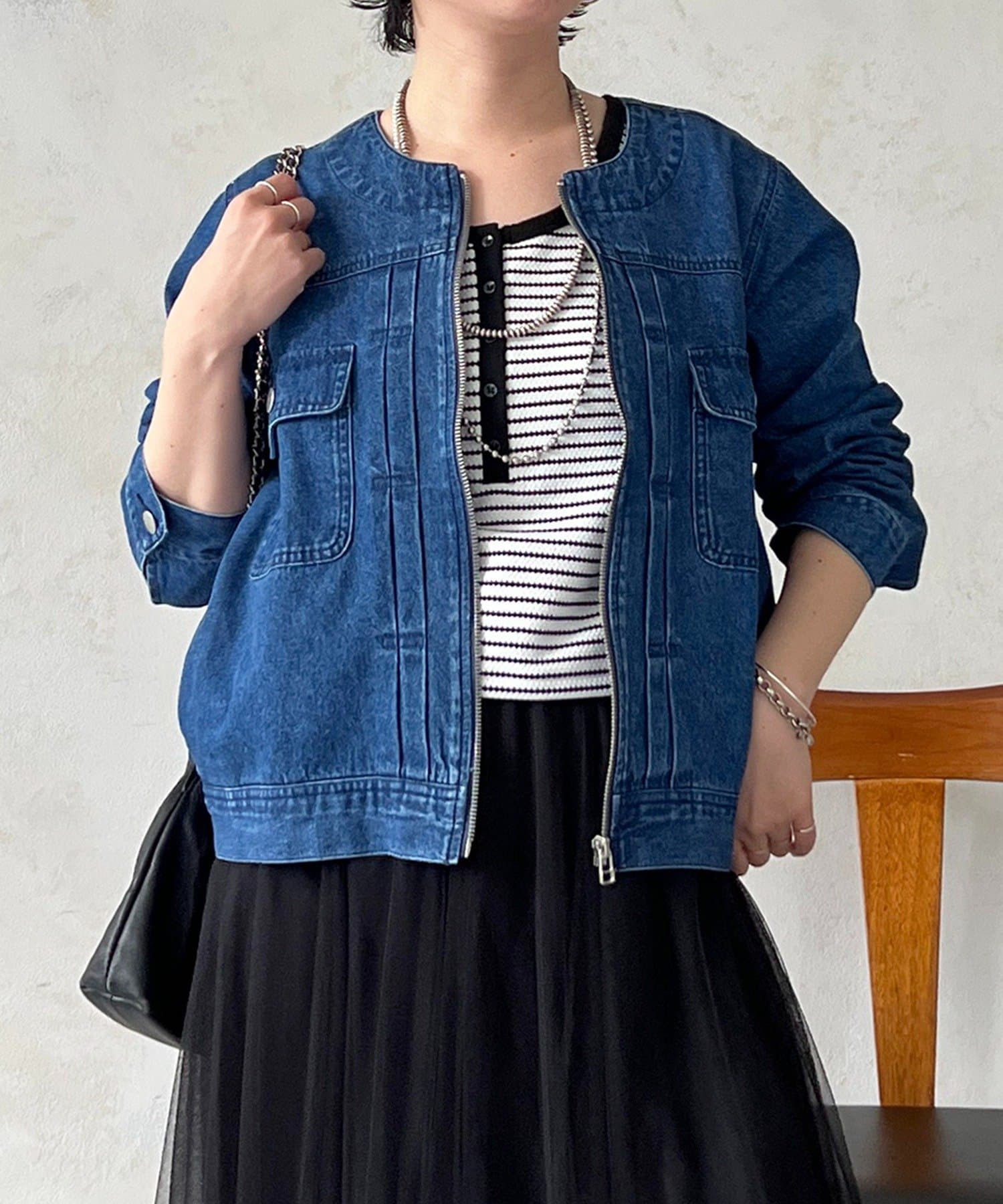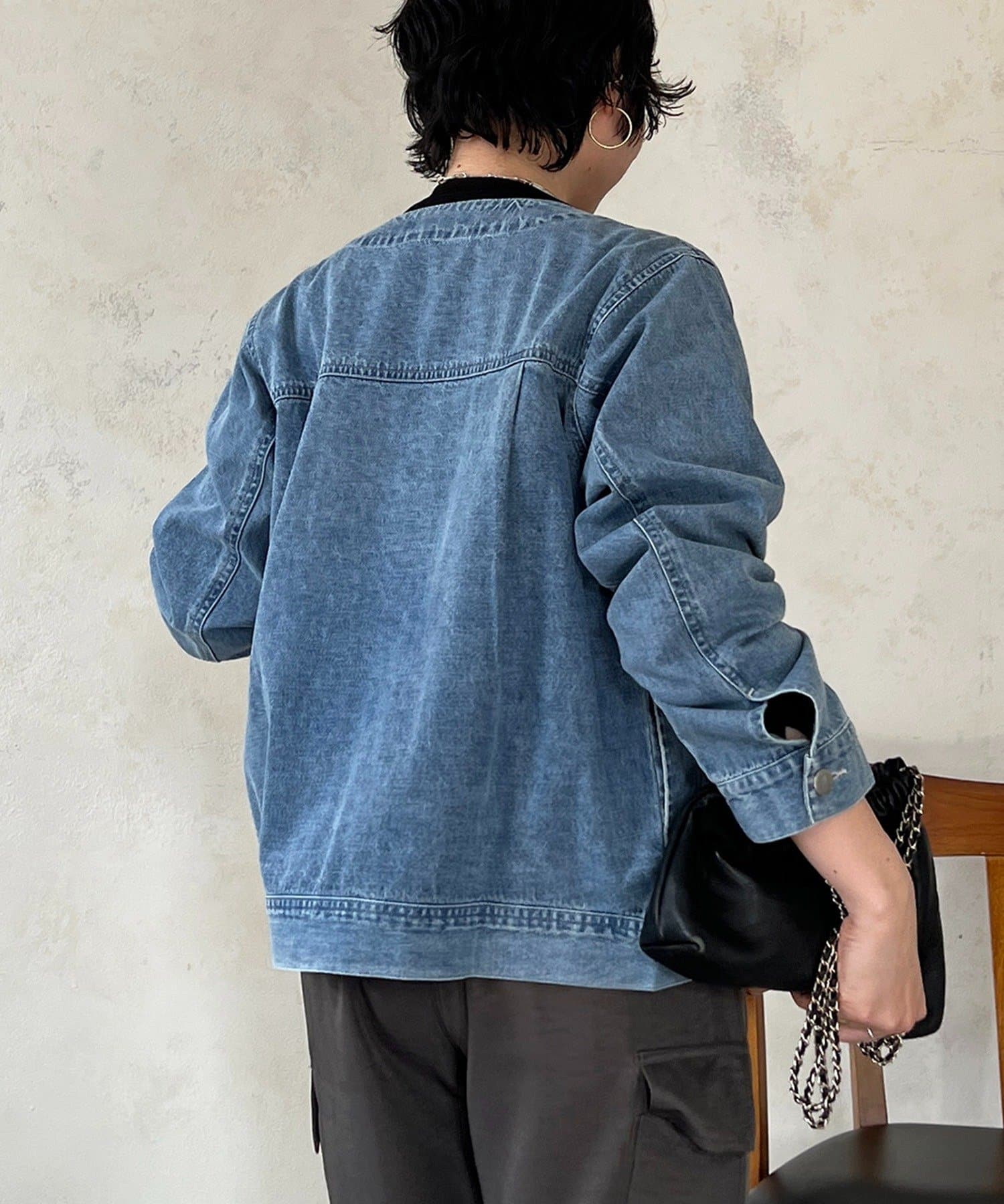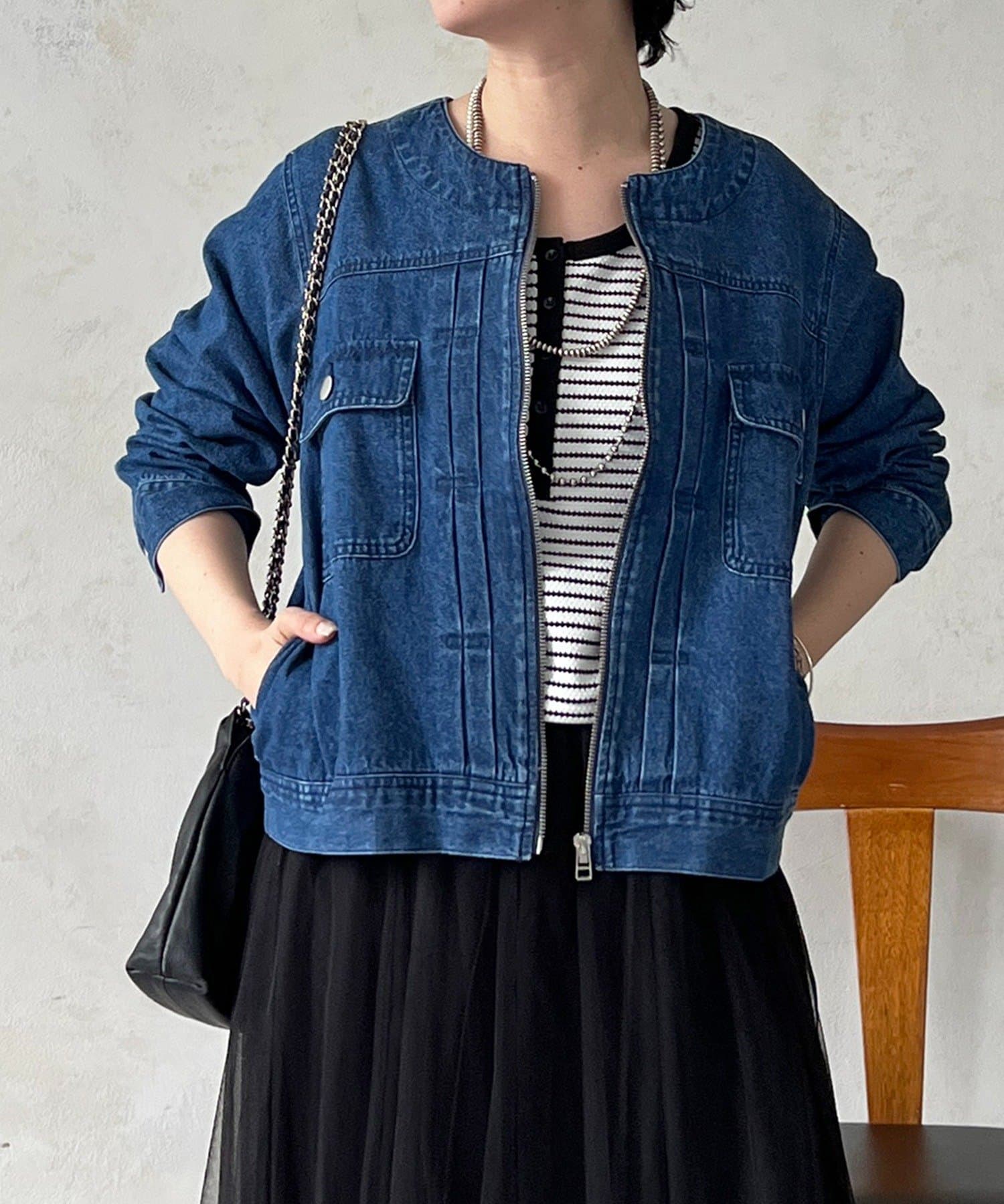 ノーカラーの抜け感が大人カジュアルなデニムジャケット