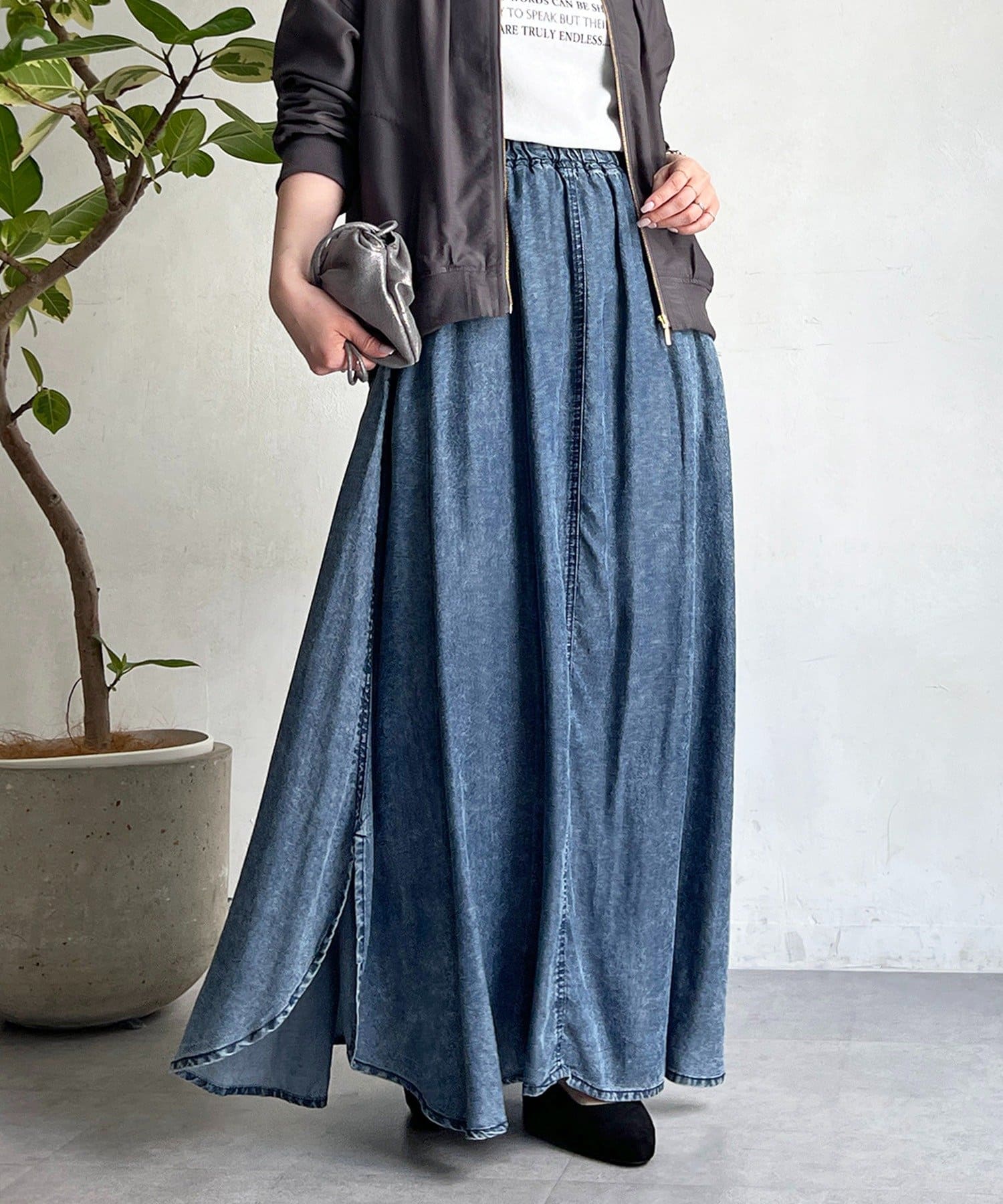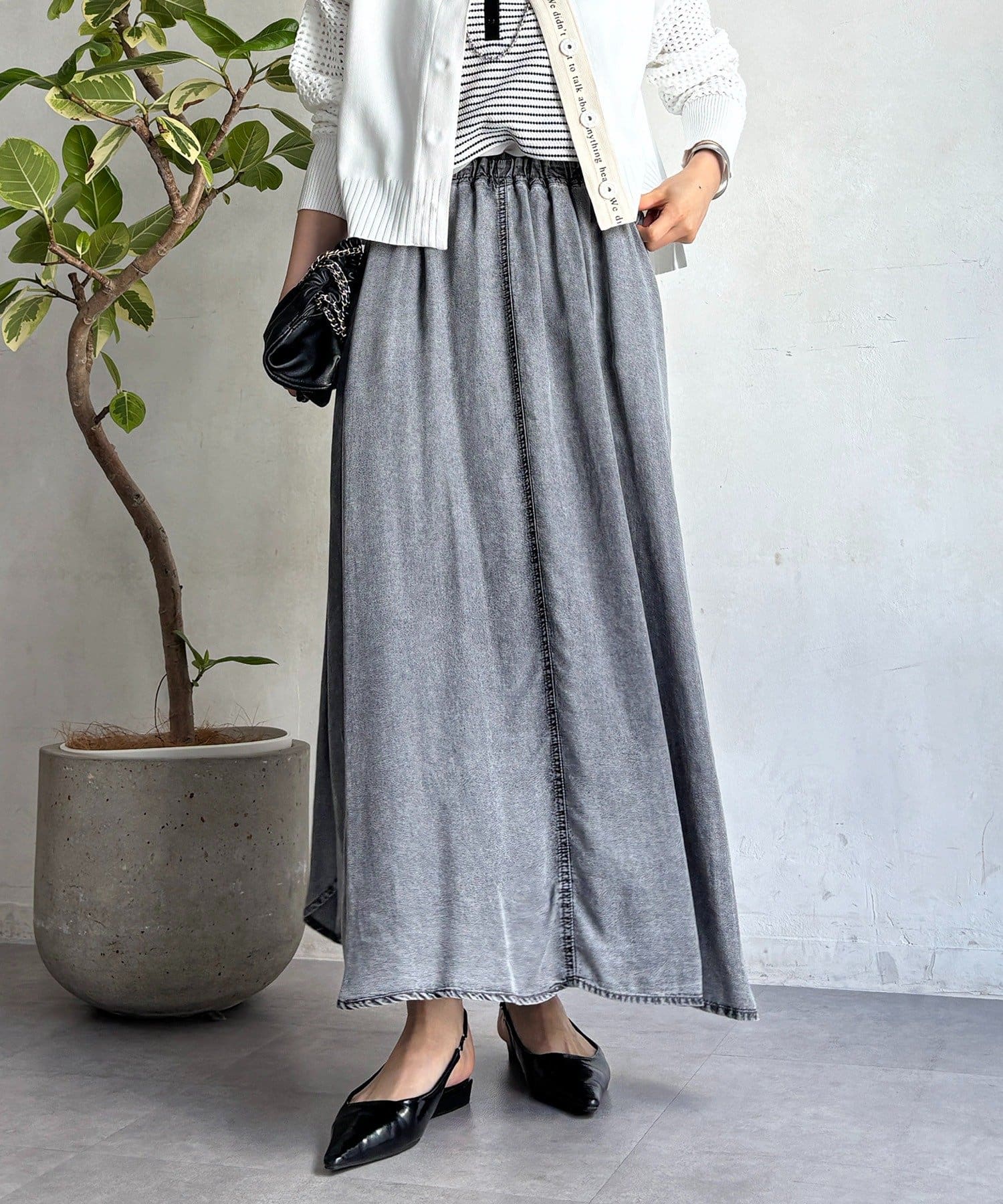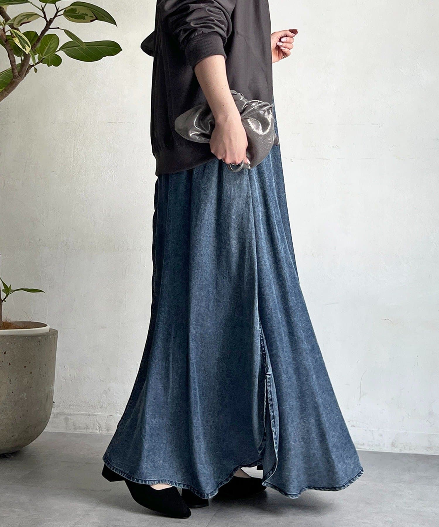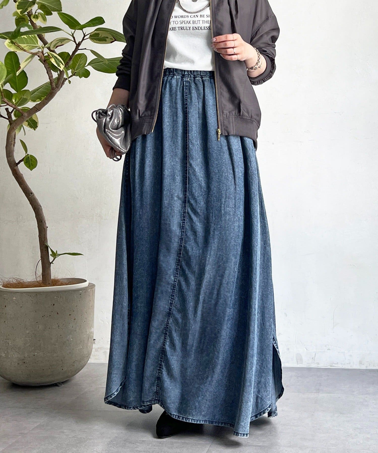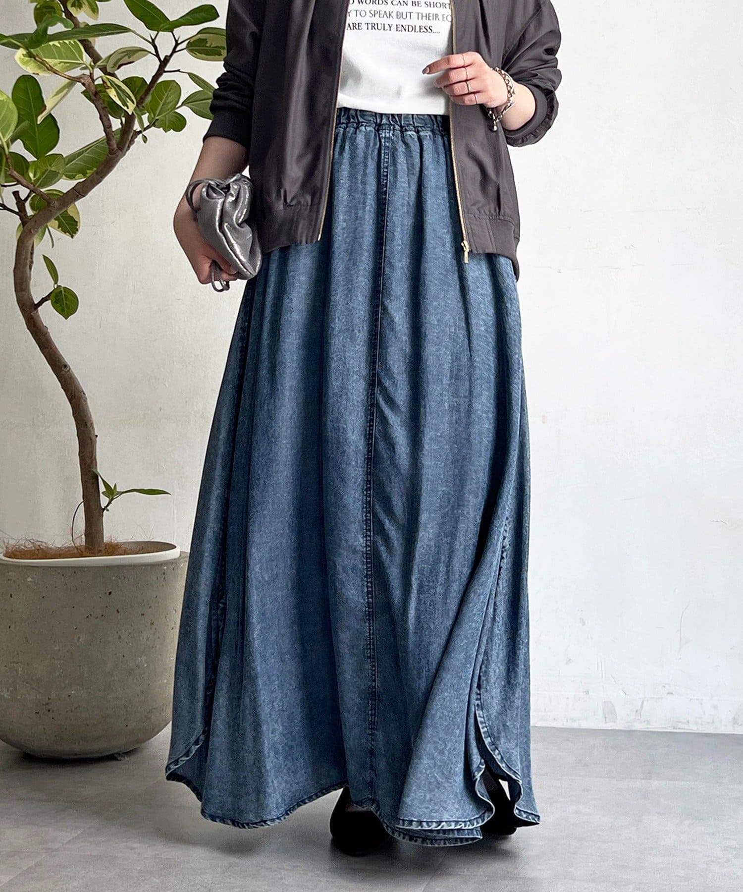 美しいドレープと優雅な揺れ感が大人カジュアルなデニムスカート