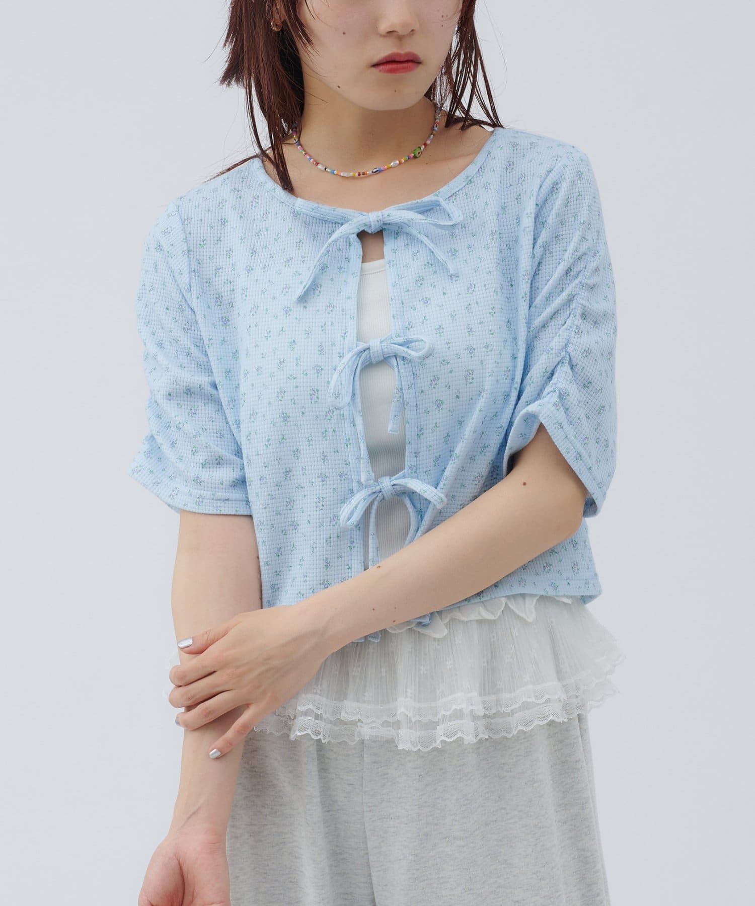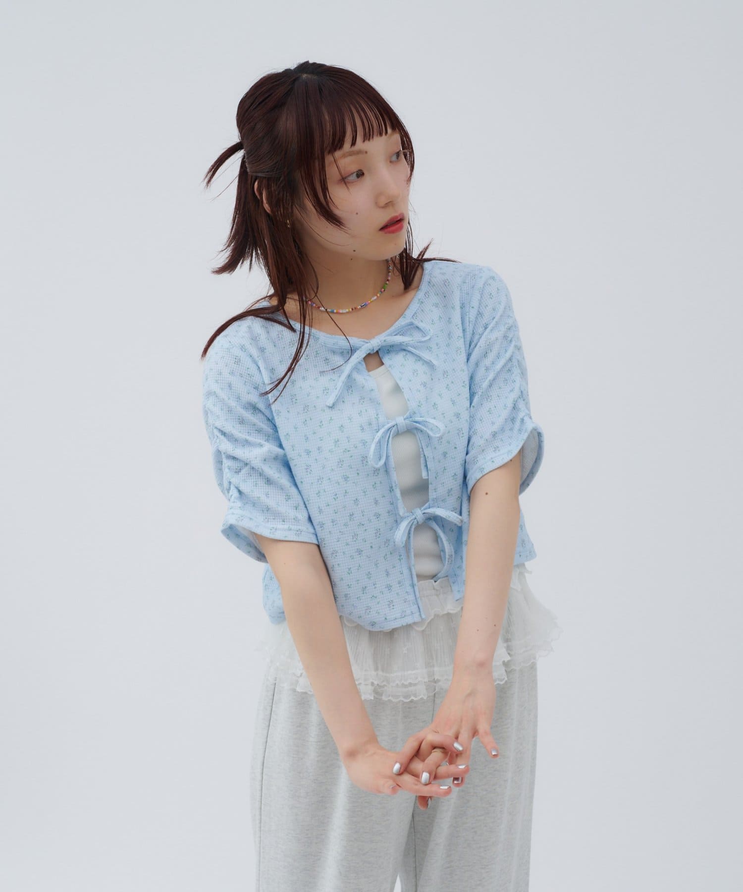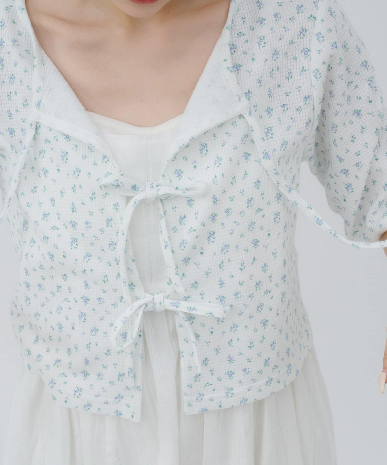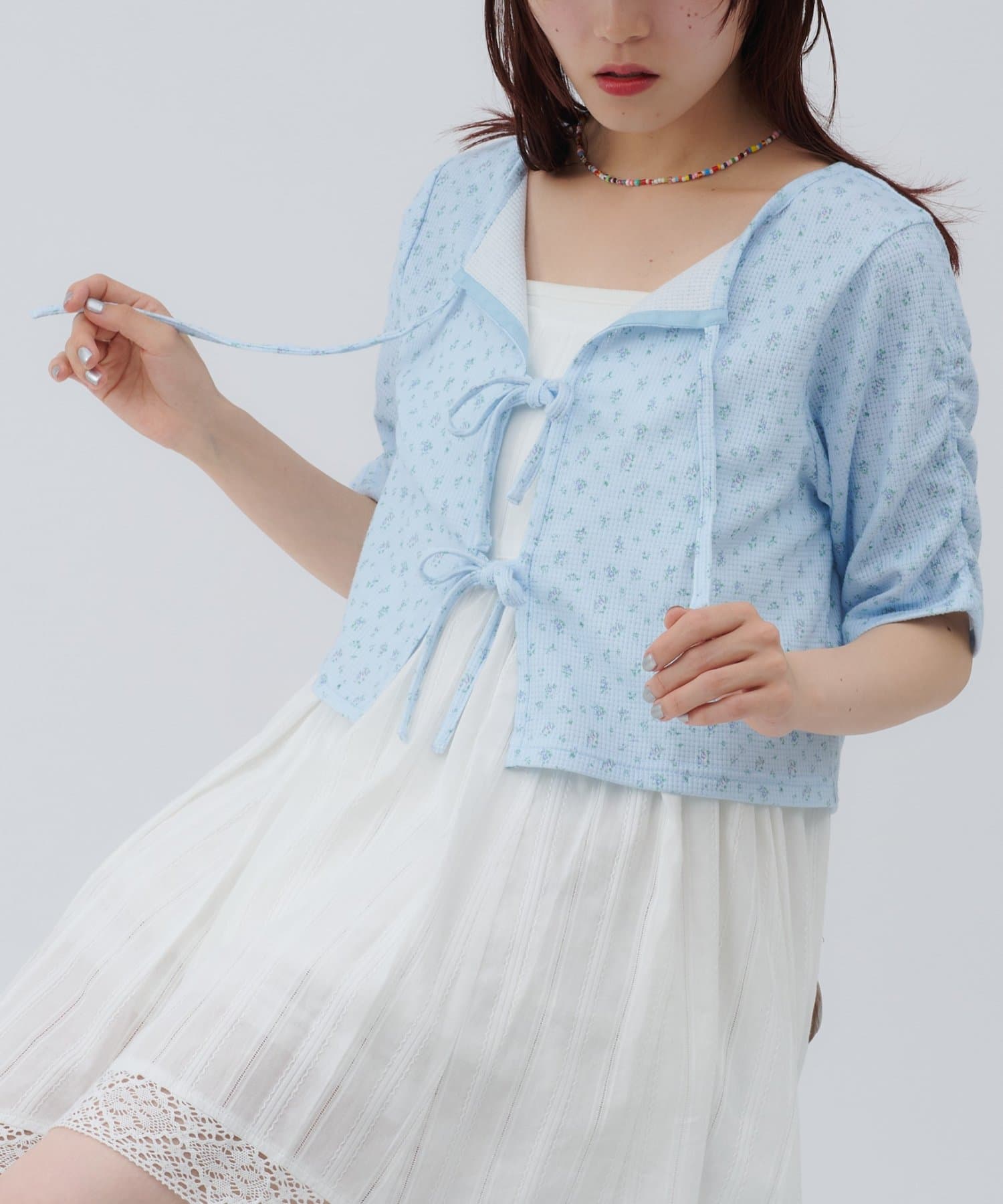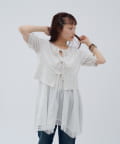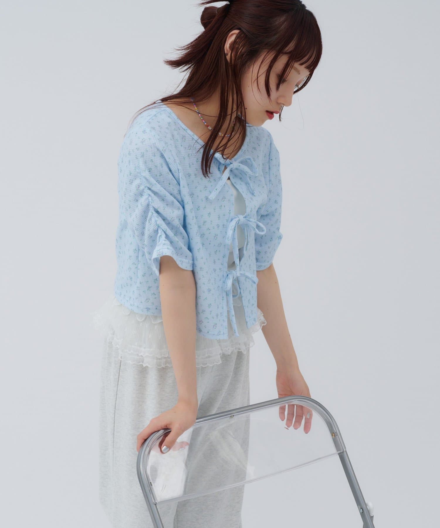 ・肌触りのいいワッフル生地のカーディガンは肩のギャザーがアクセント♡