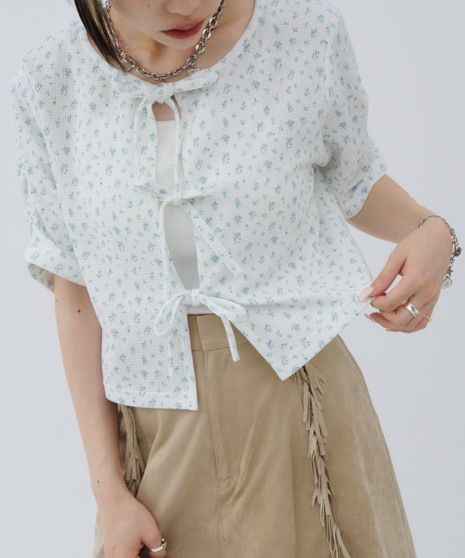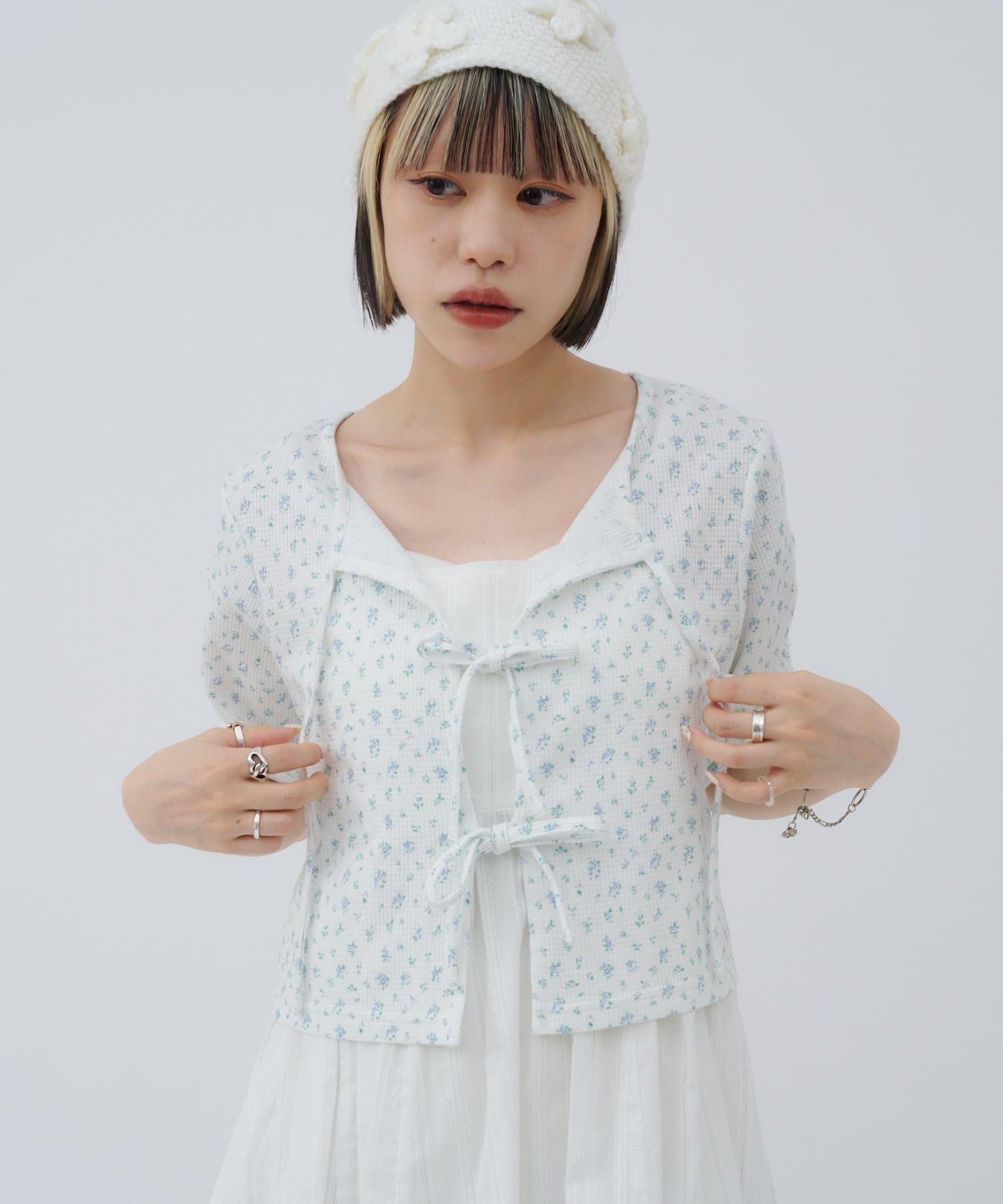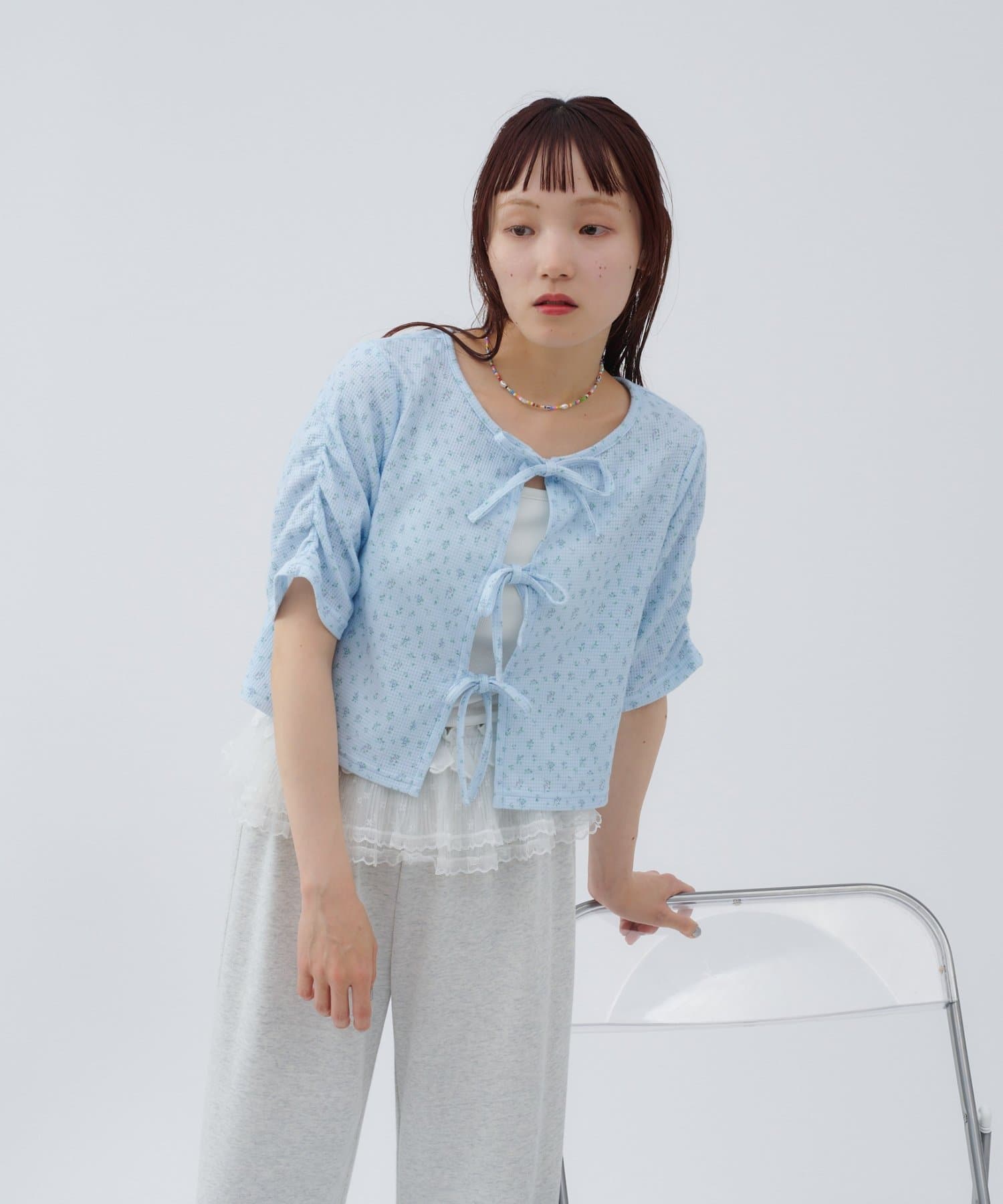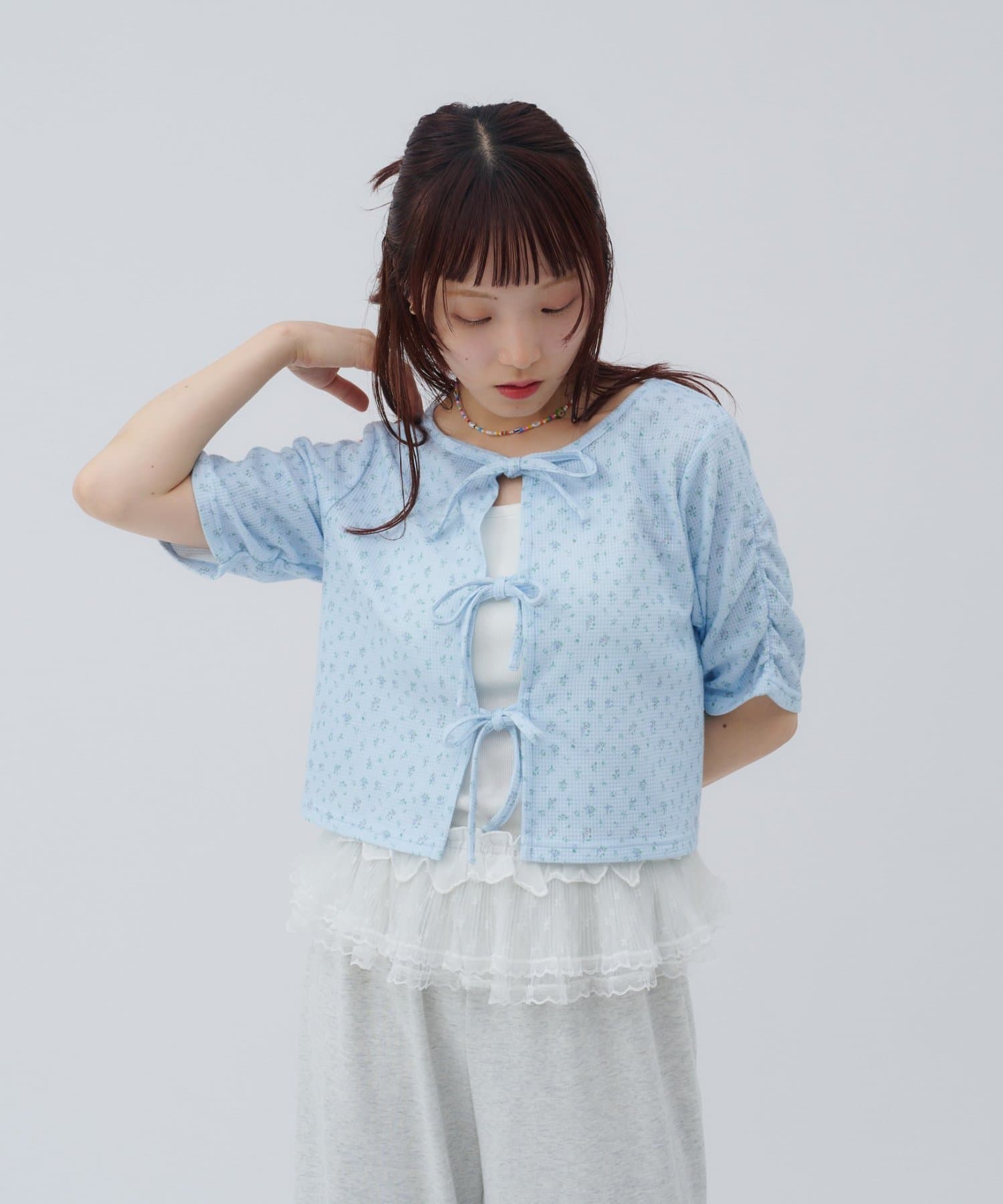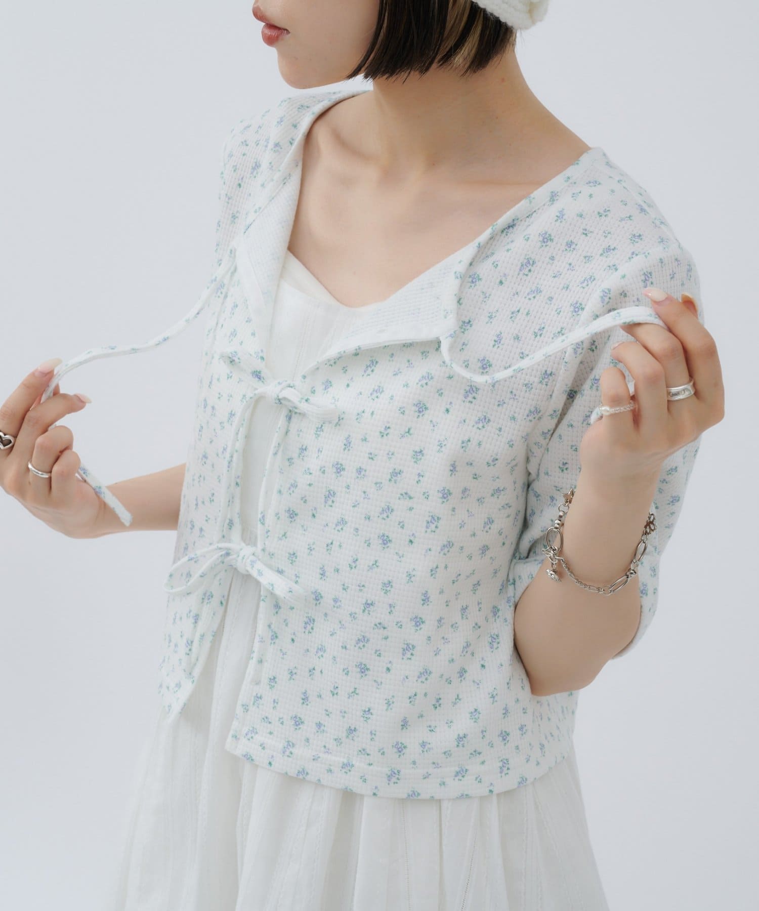 ・肌触りのいいワッフル生地のカーディガンは肩のギャザーがアクセント♡