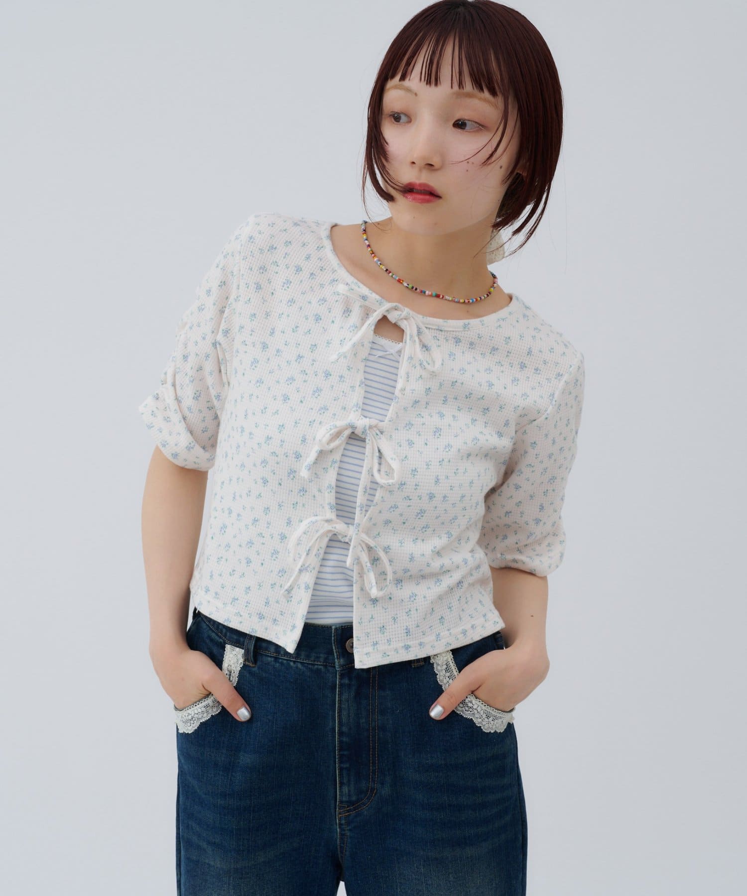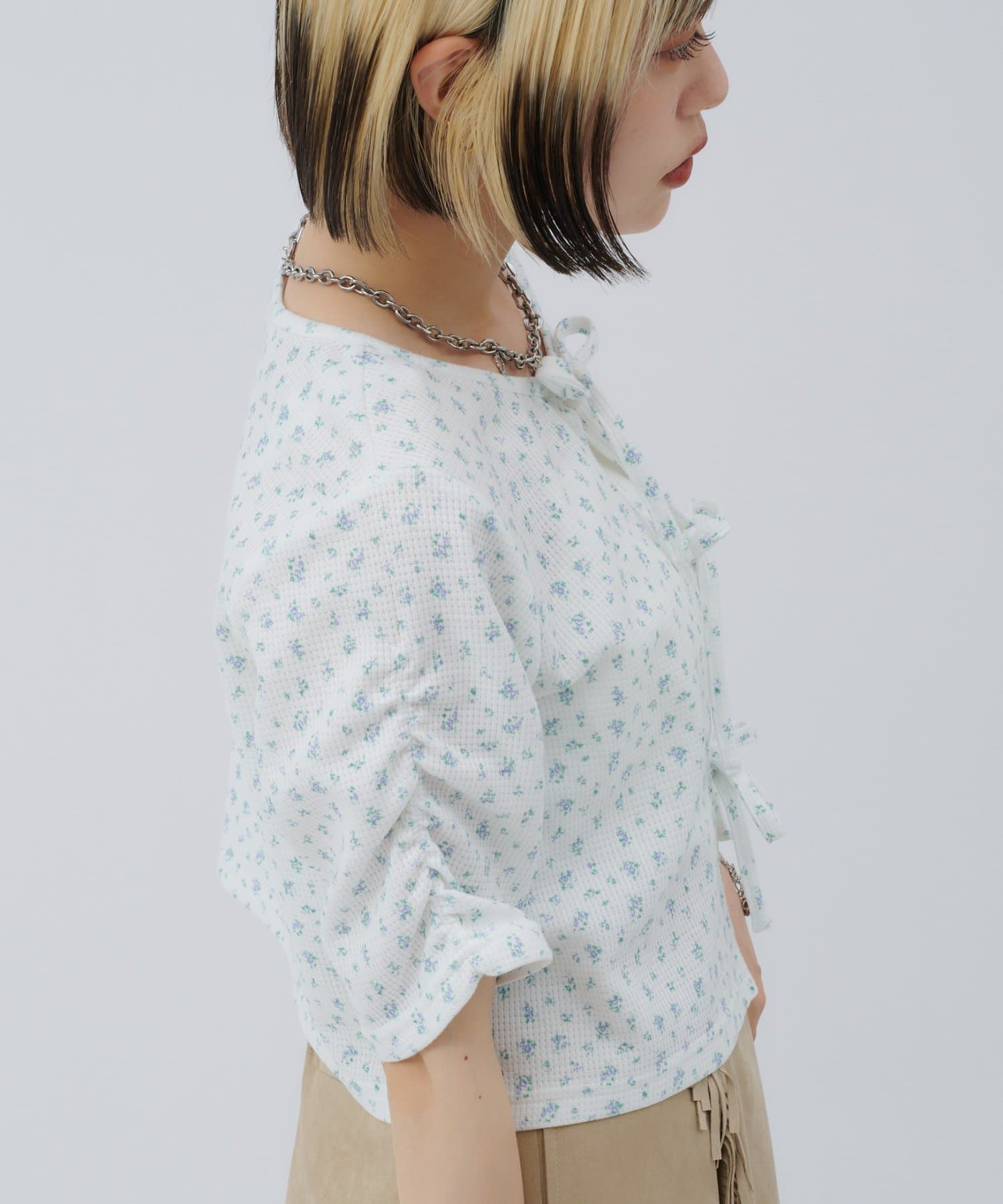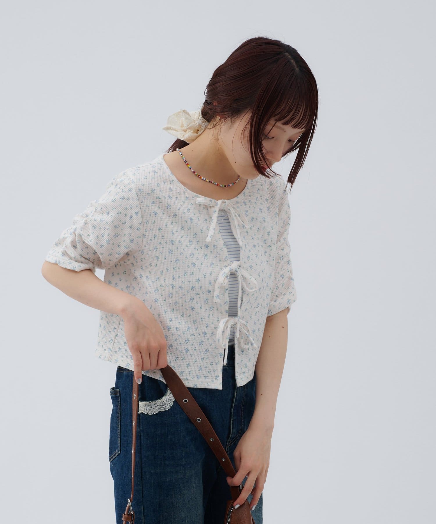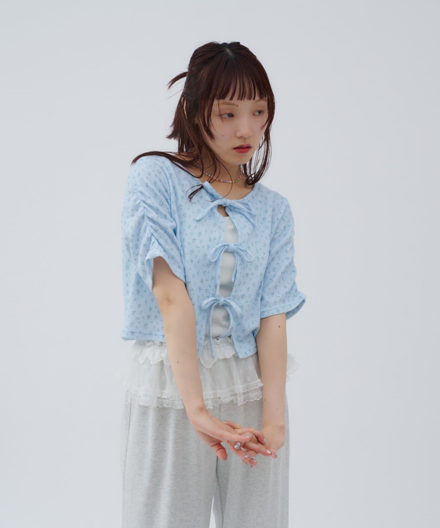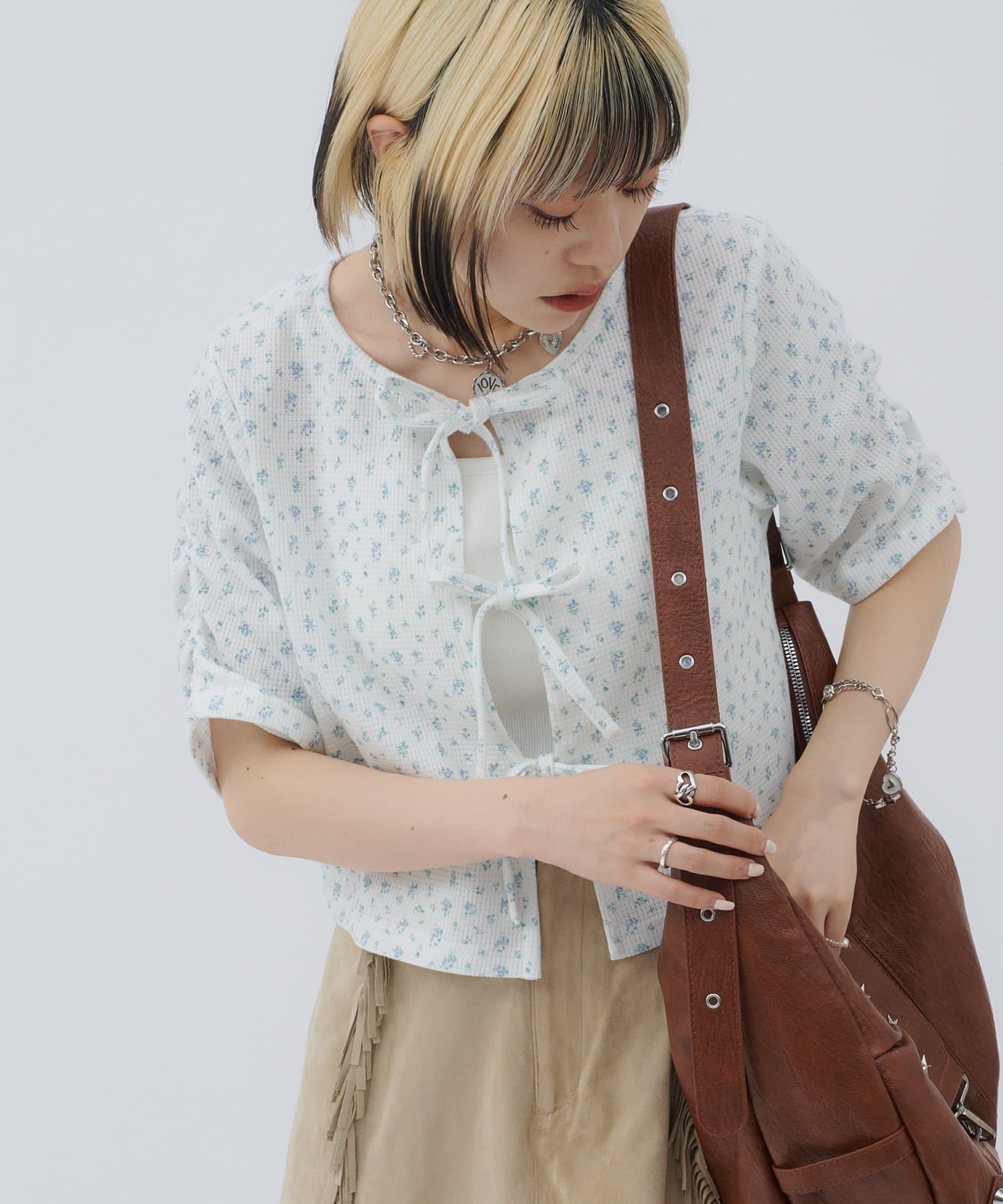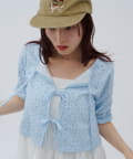 ・肌触りのいいワッフル生地のカーディガンは肩のギャザーがアクセント♡