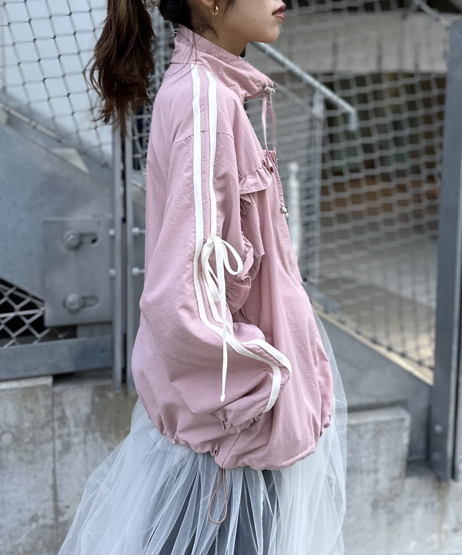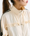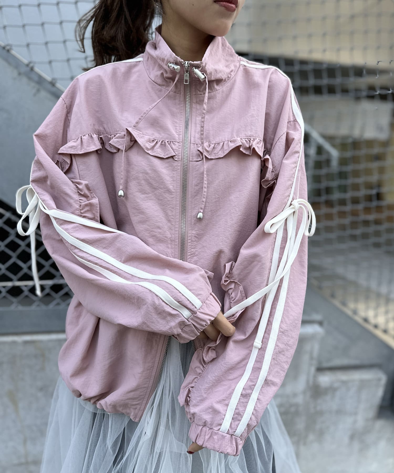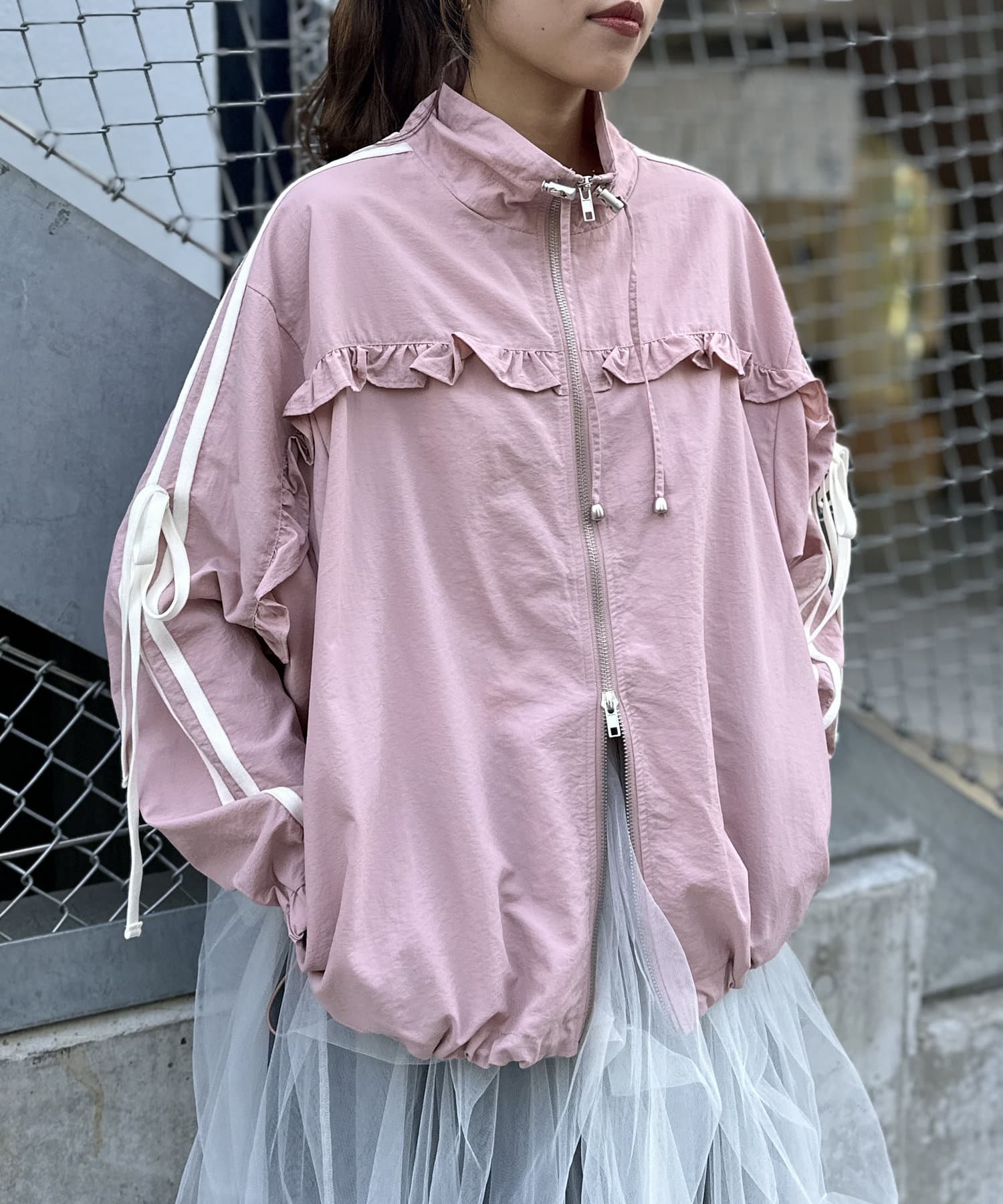 ・ナイロン生地のジャケットにフリルをほどこしたMIXテイストなデザイン