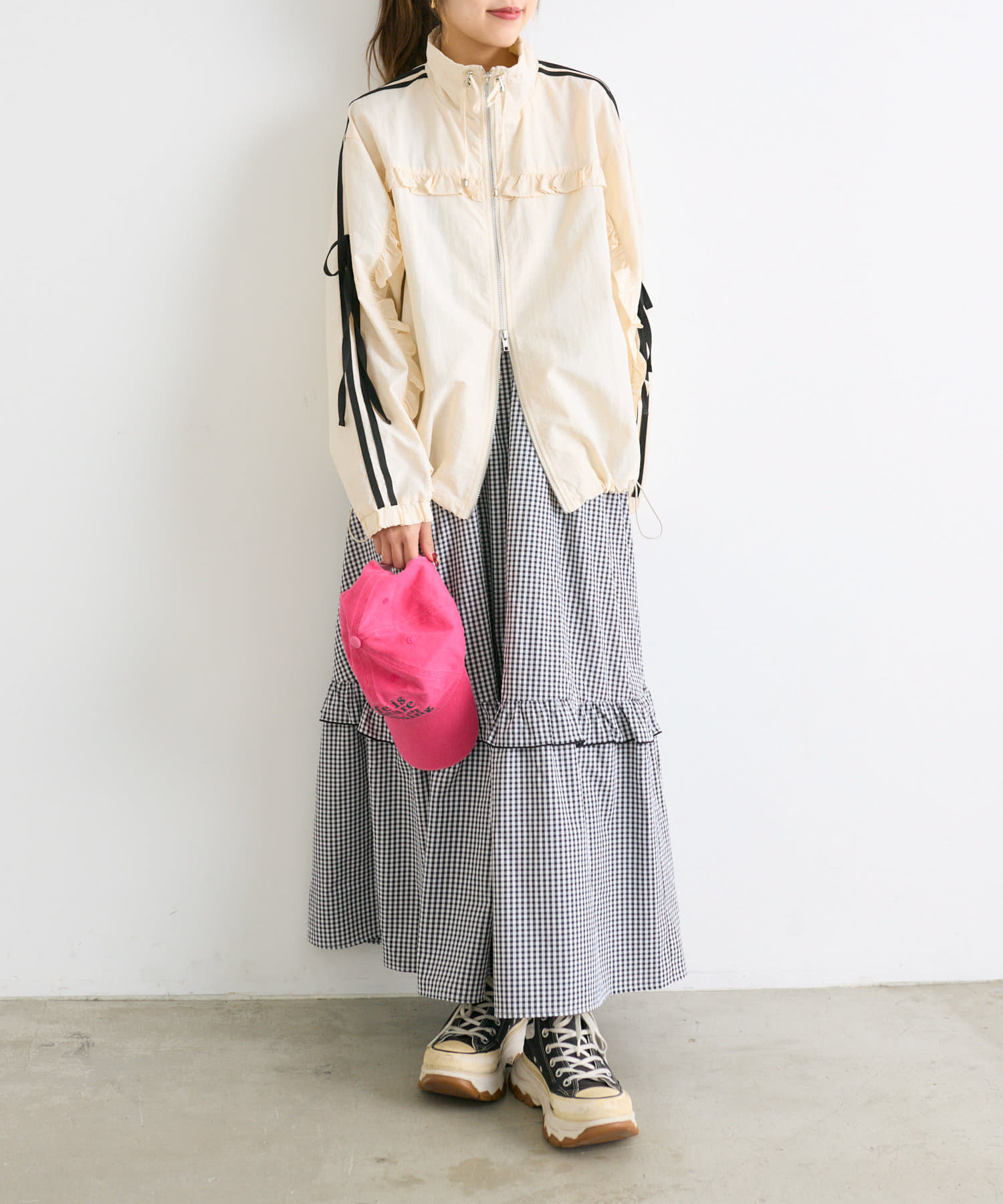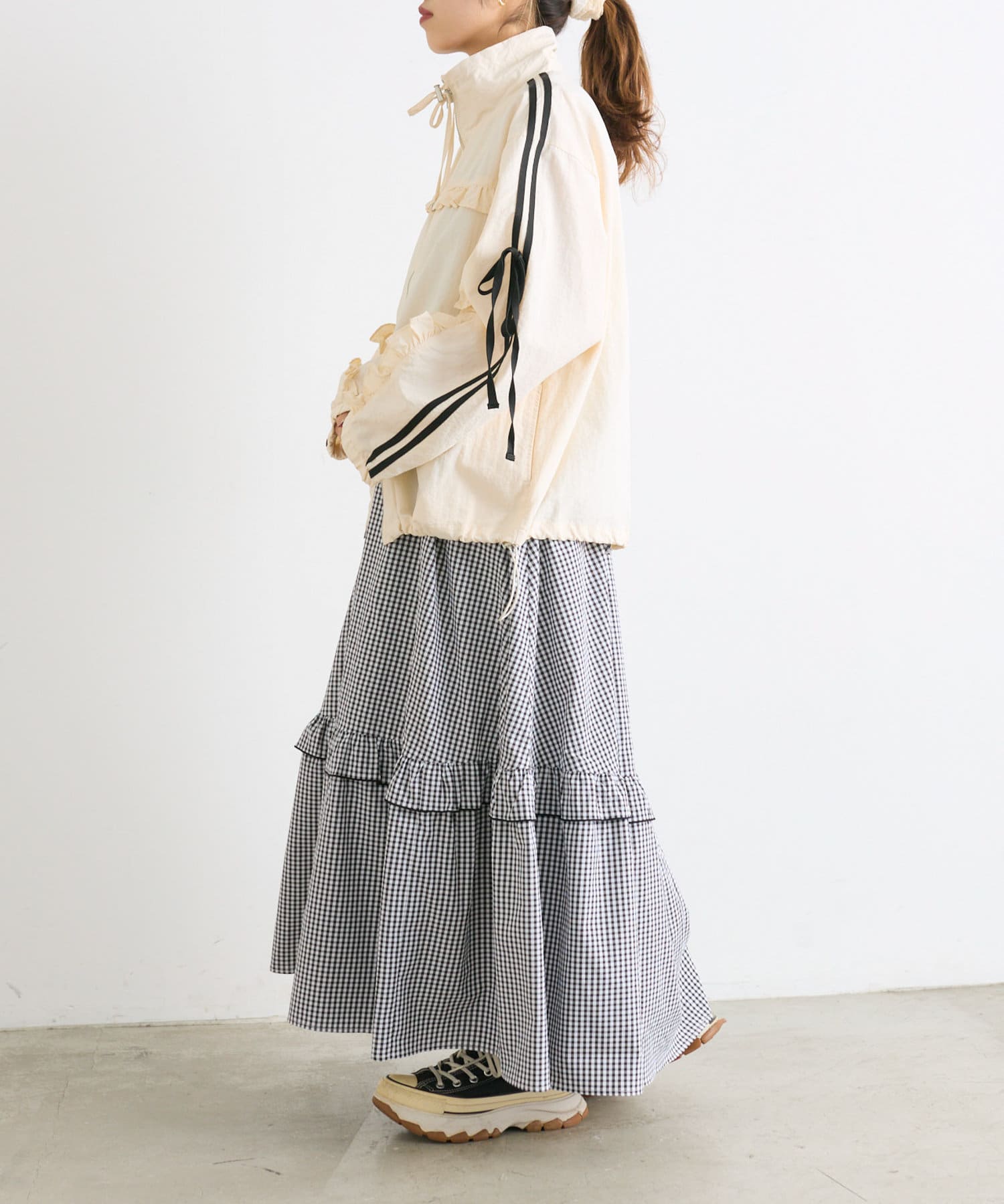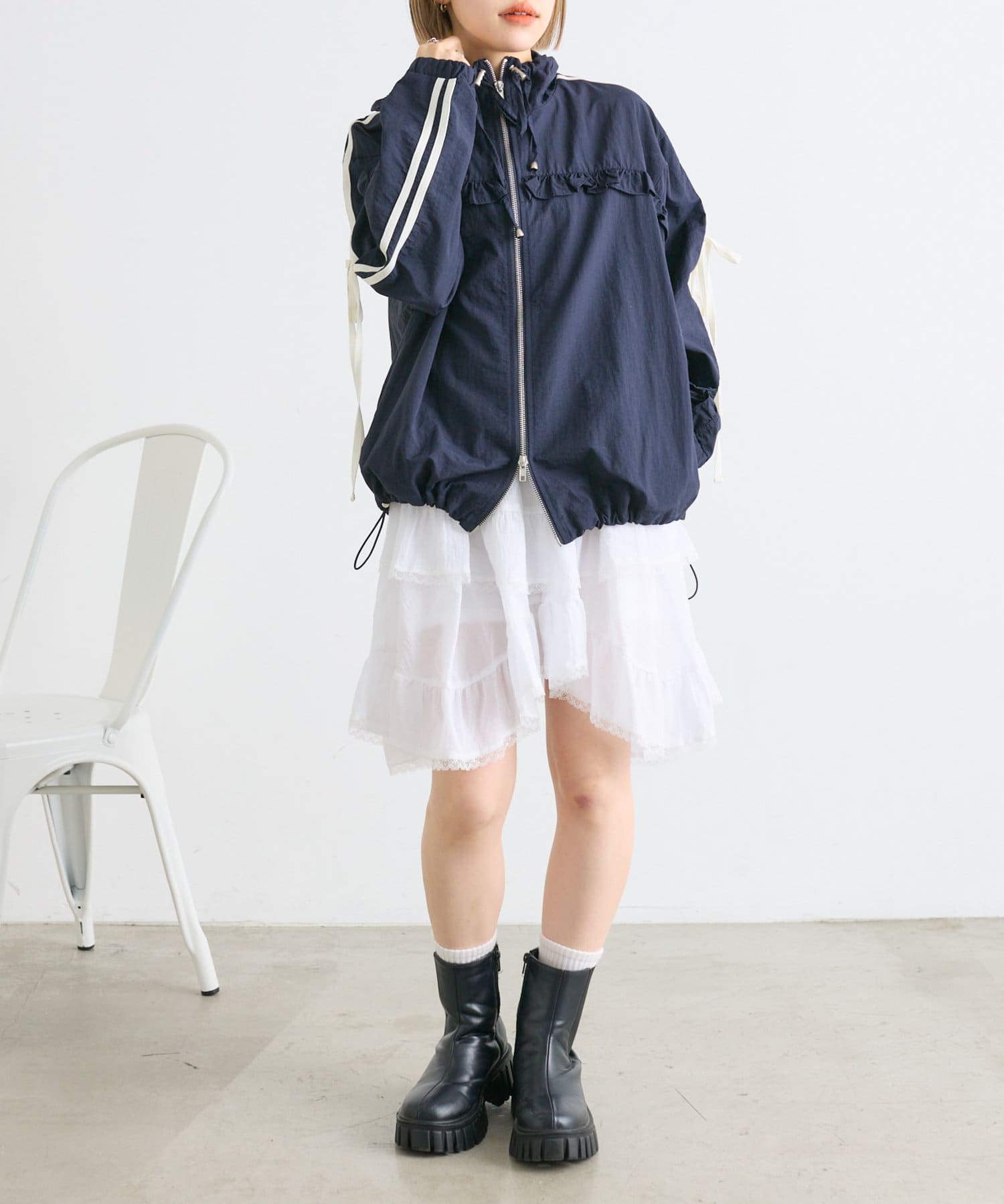 ・ナイロン生地のジャケットにフリルをほどこしたMIXテイストなデザイン