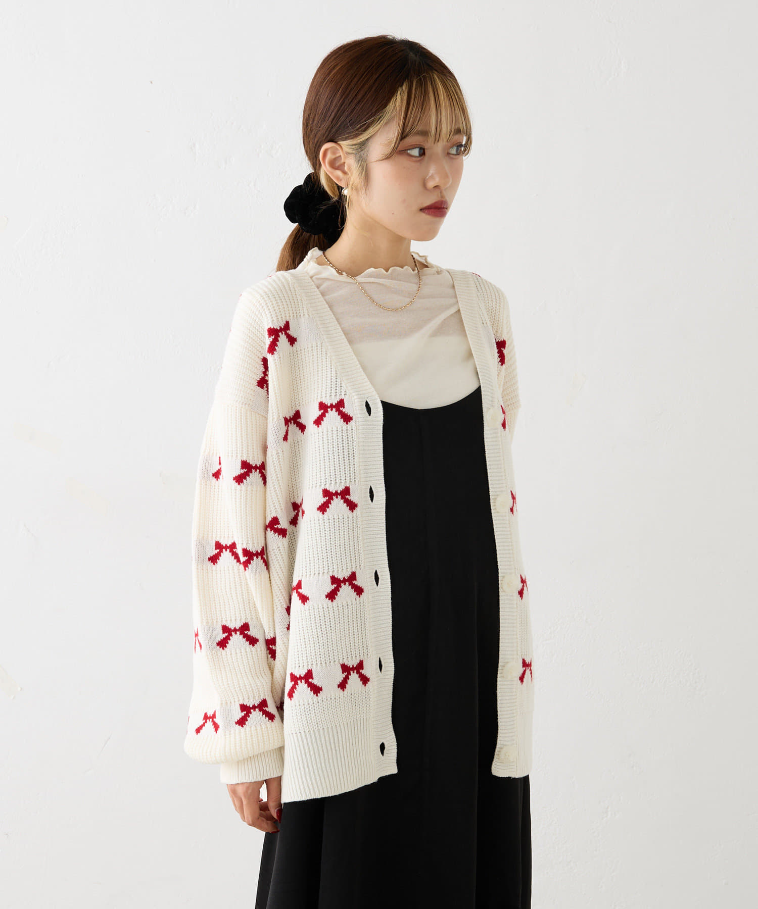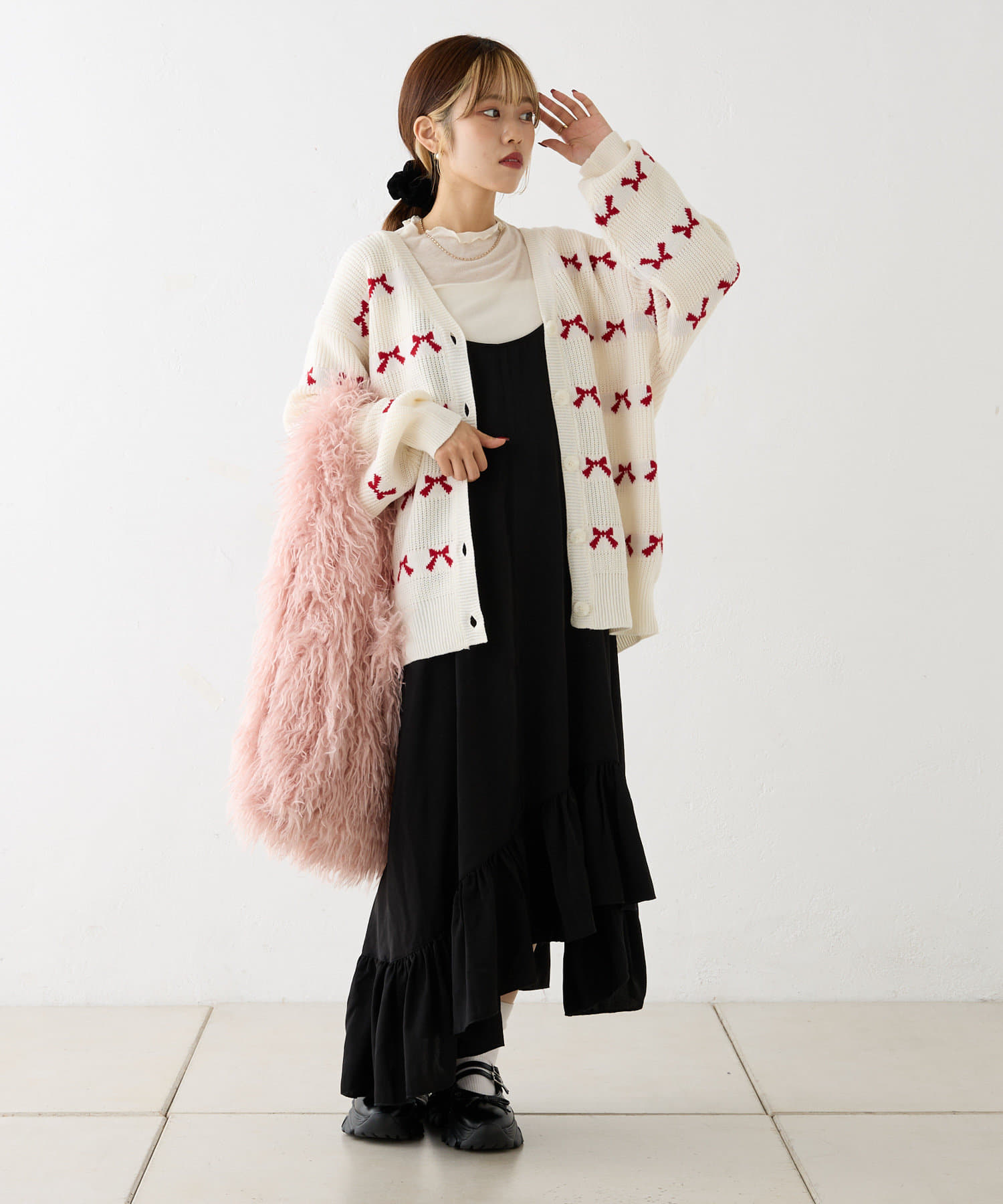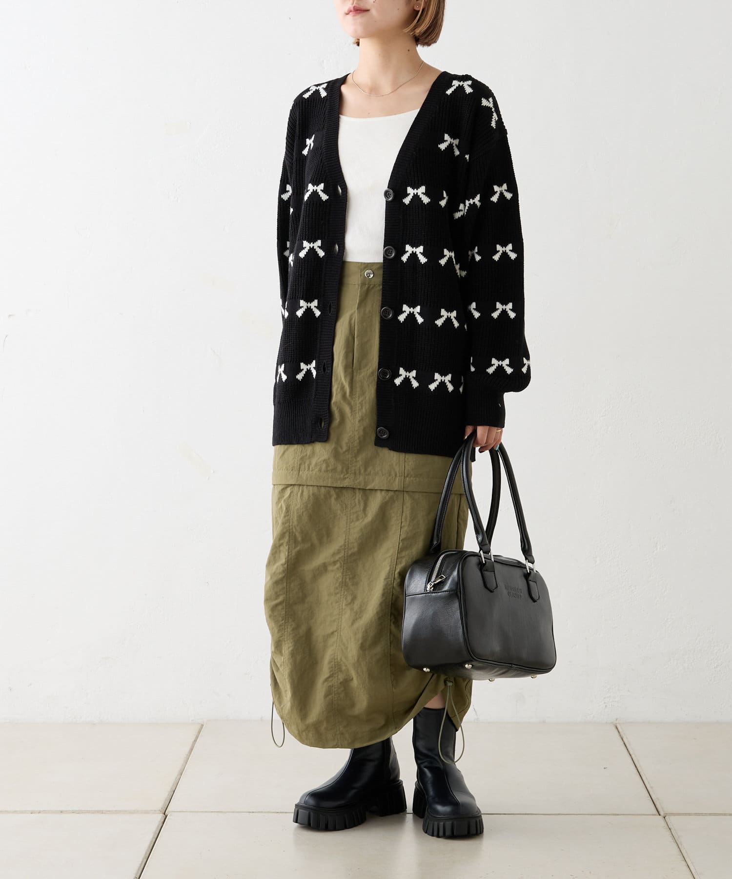 ・カーディガンの色と全体のトーンを合わせるとすっきりとバランスよく着こなせます