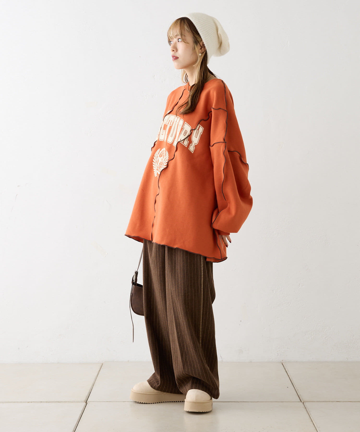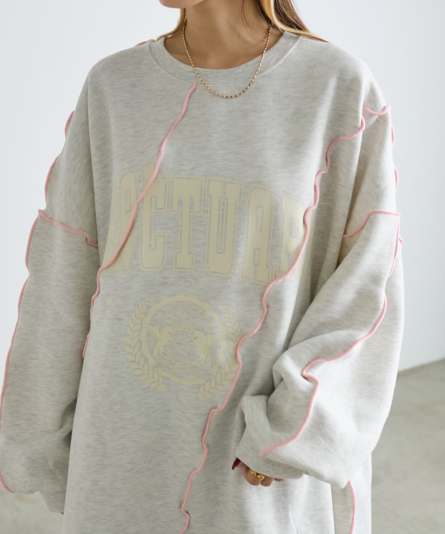 ・フロントロゴの高さを変えて1枚のスウェットを縫い合わせたようなデザインに仕上げました