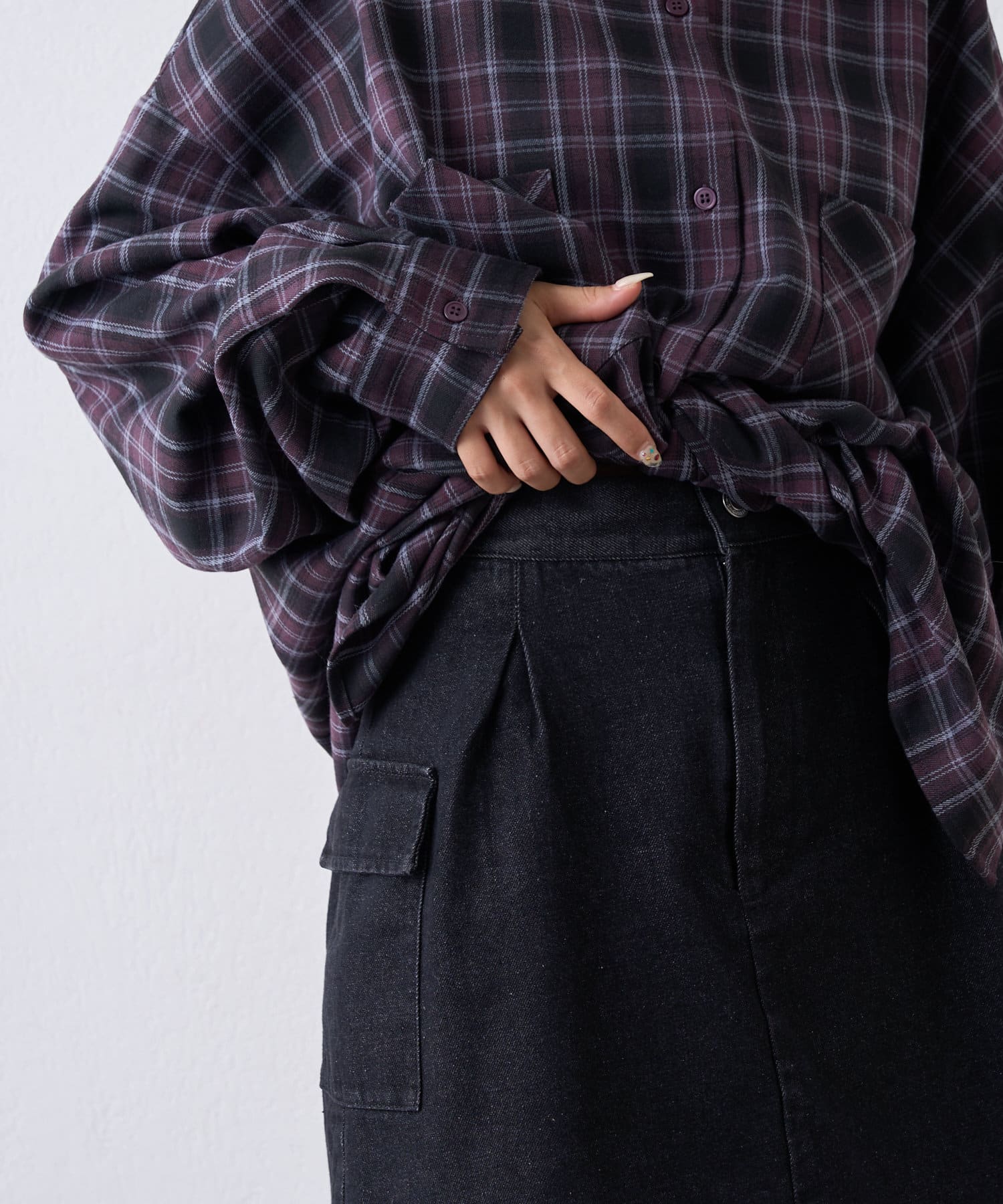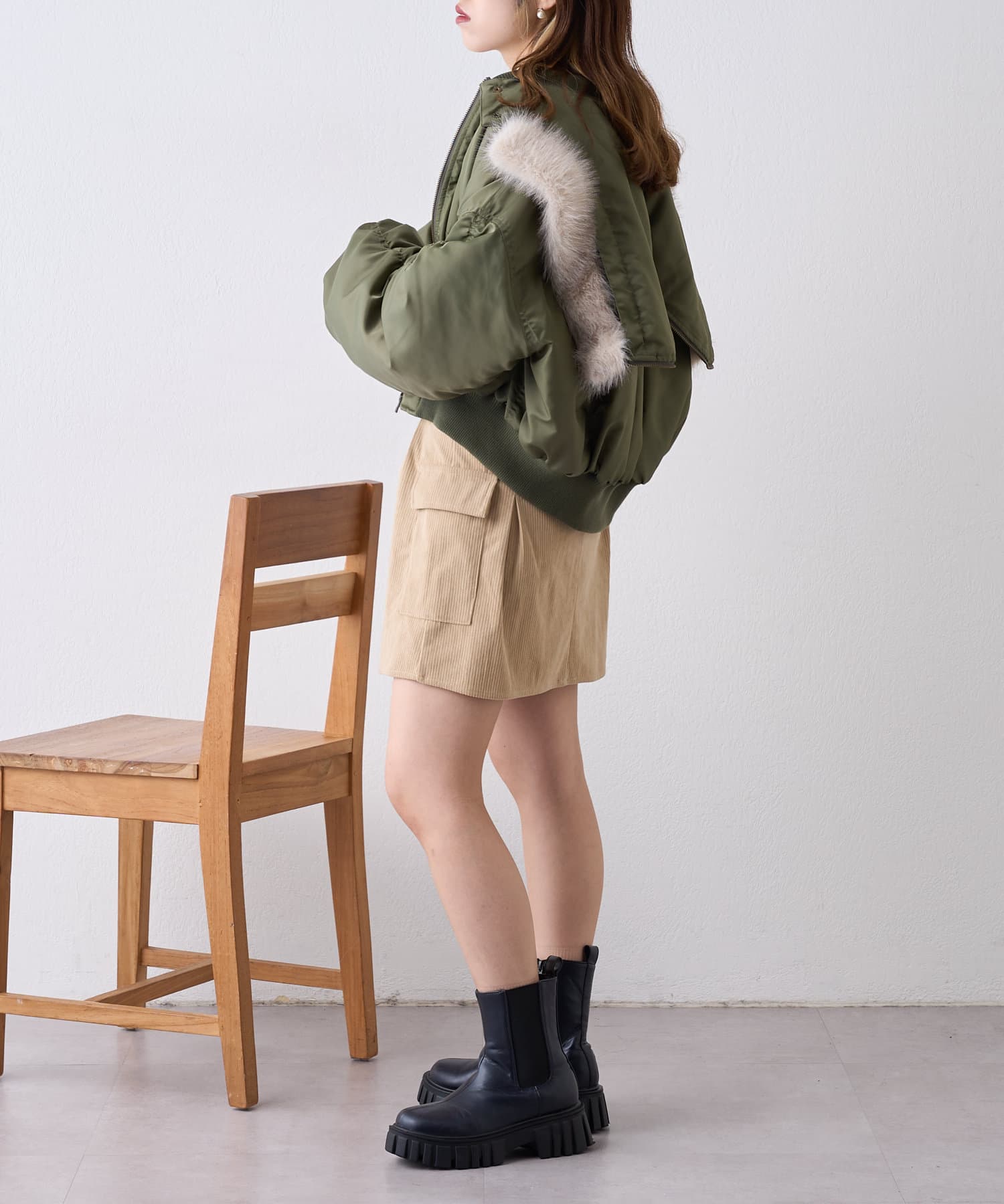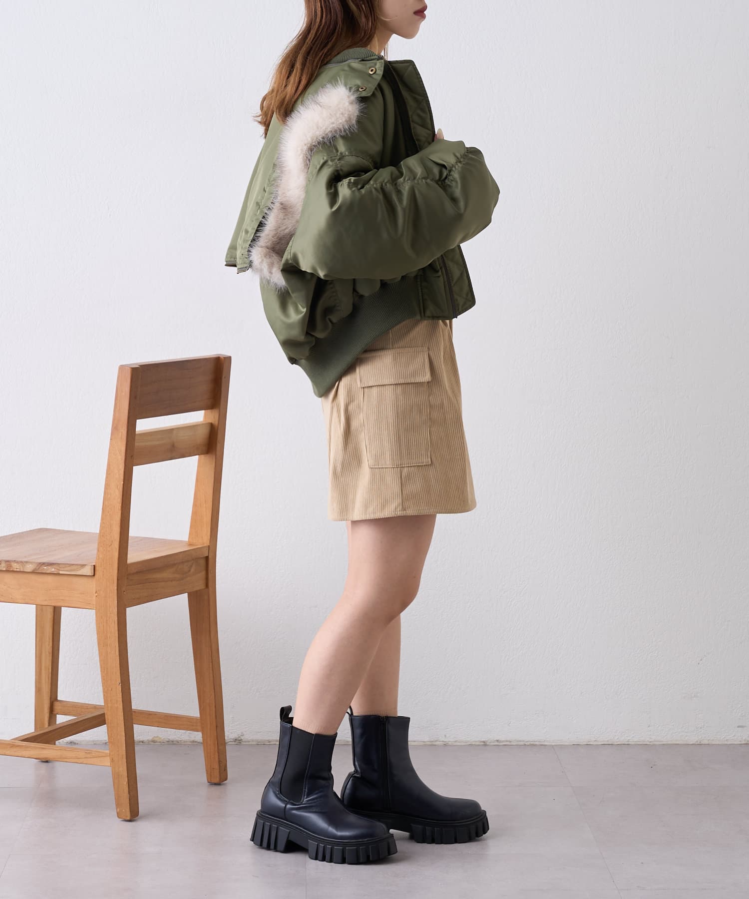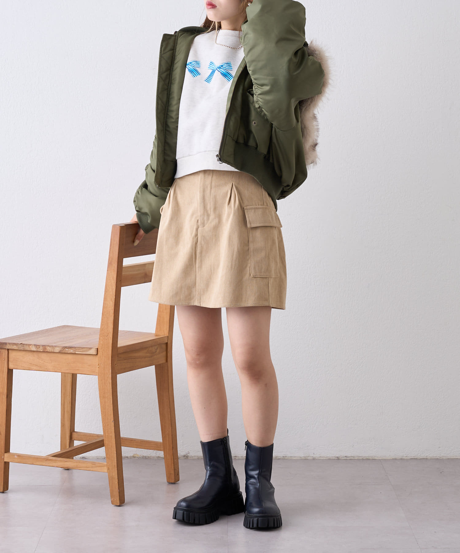 ・メンズライクになりがちなカーゴスタイルもミニ丈でレディな印象に◎