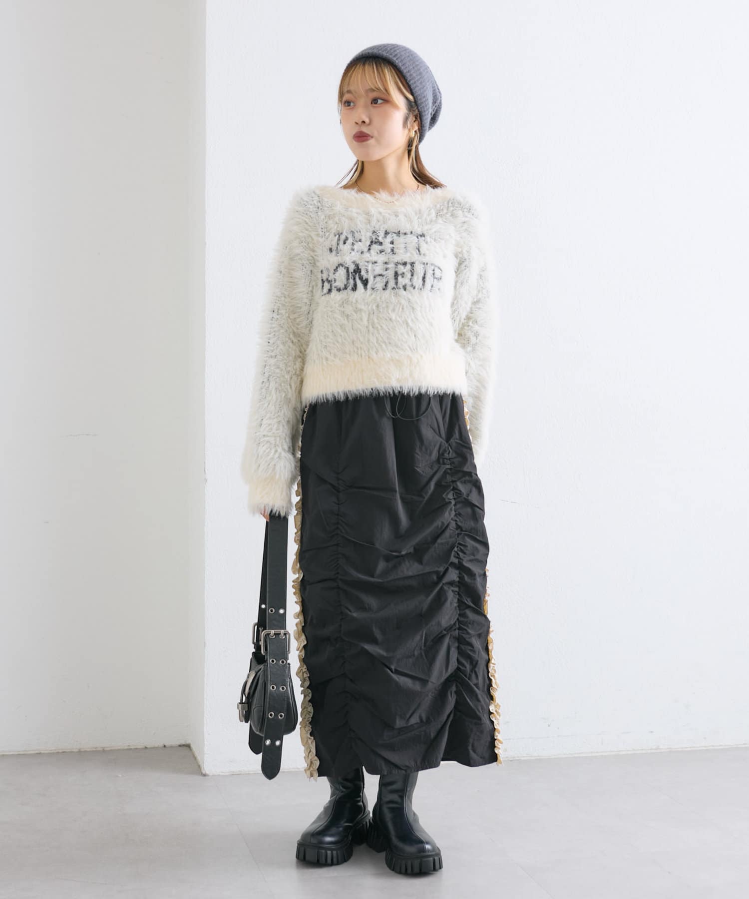 ・サイドのフリルとフロントのシャーリングデザインで表面感のある1枚