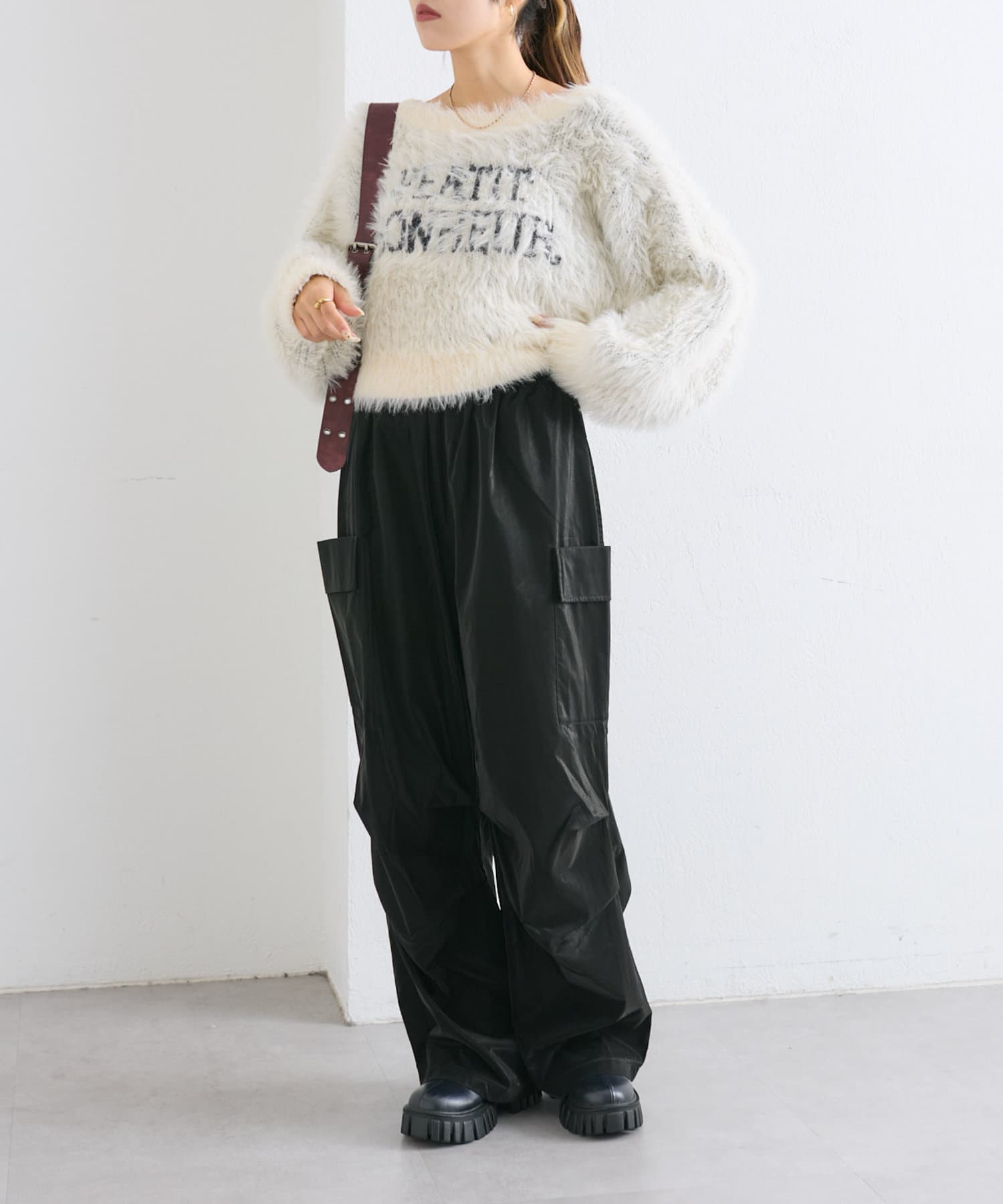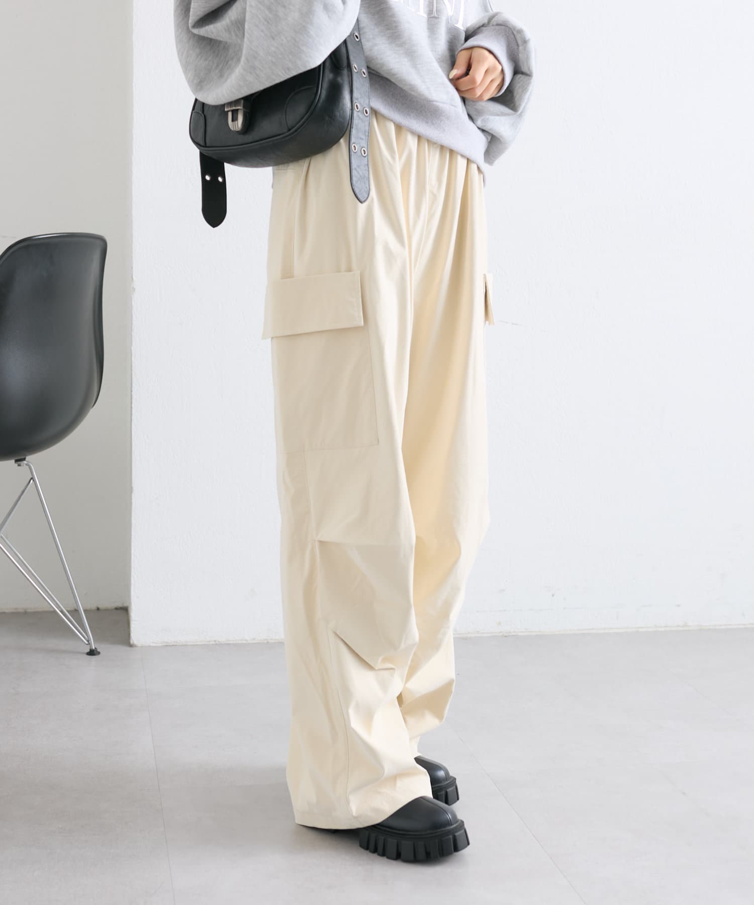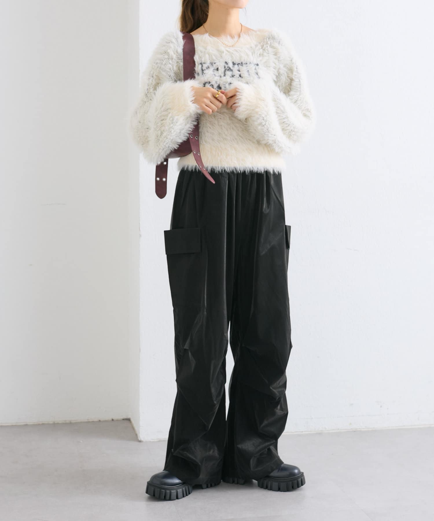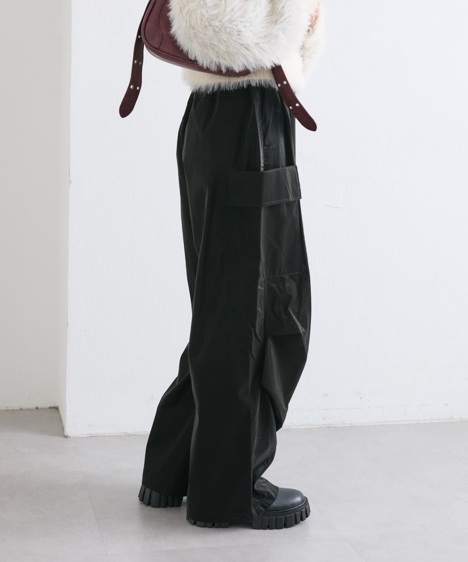 落ち感のあるレザーライクの生地がクールなカーゴパンツ
