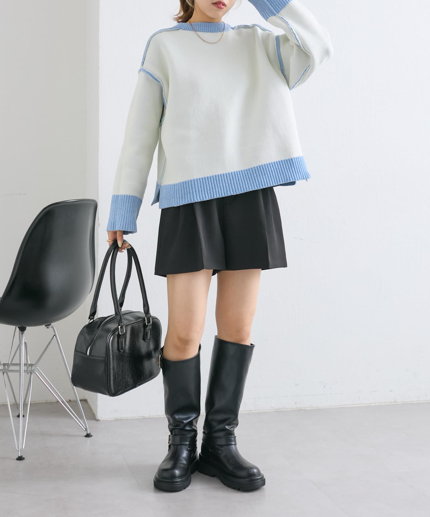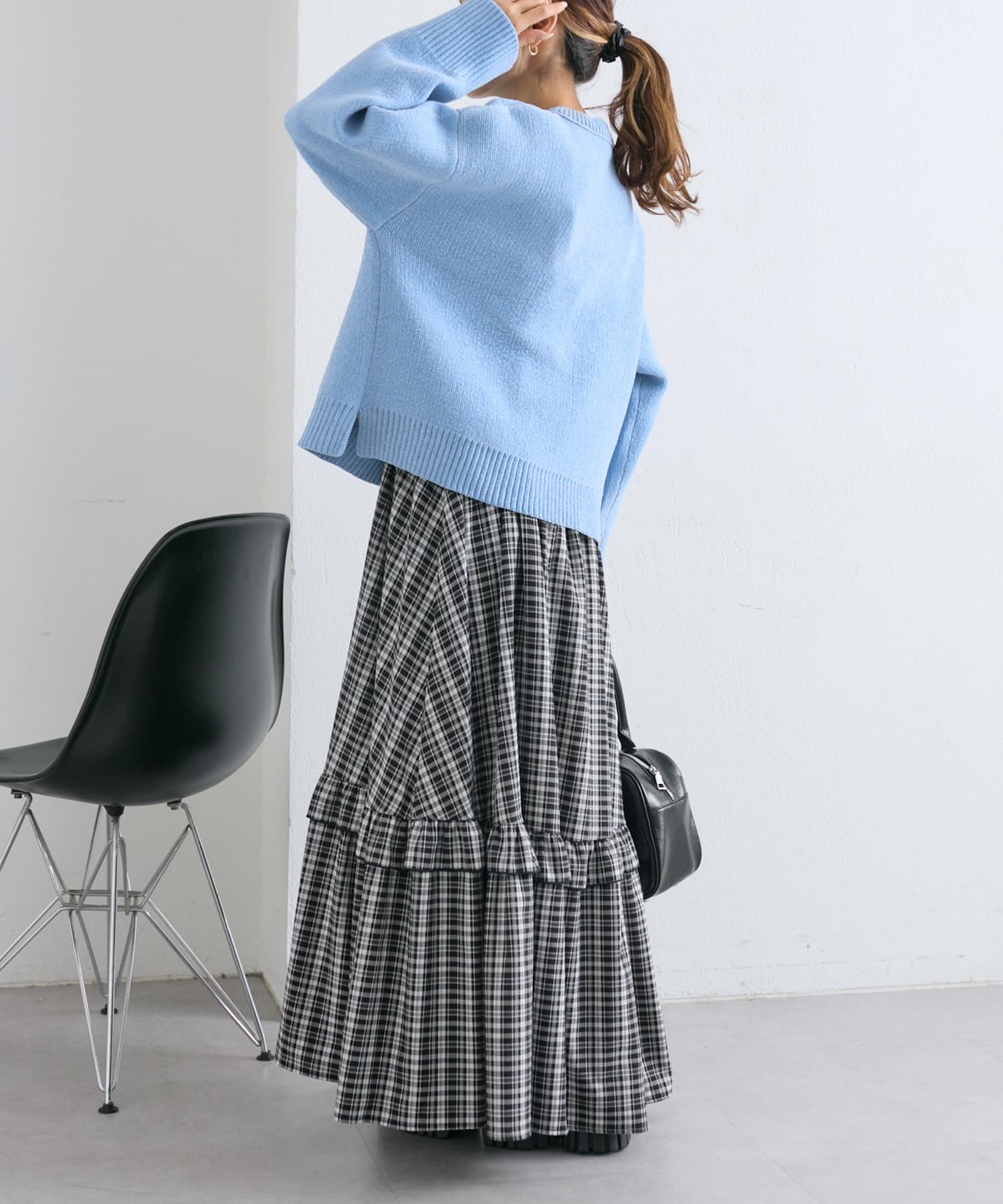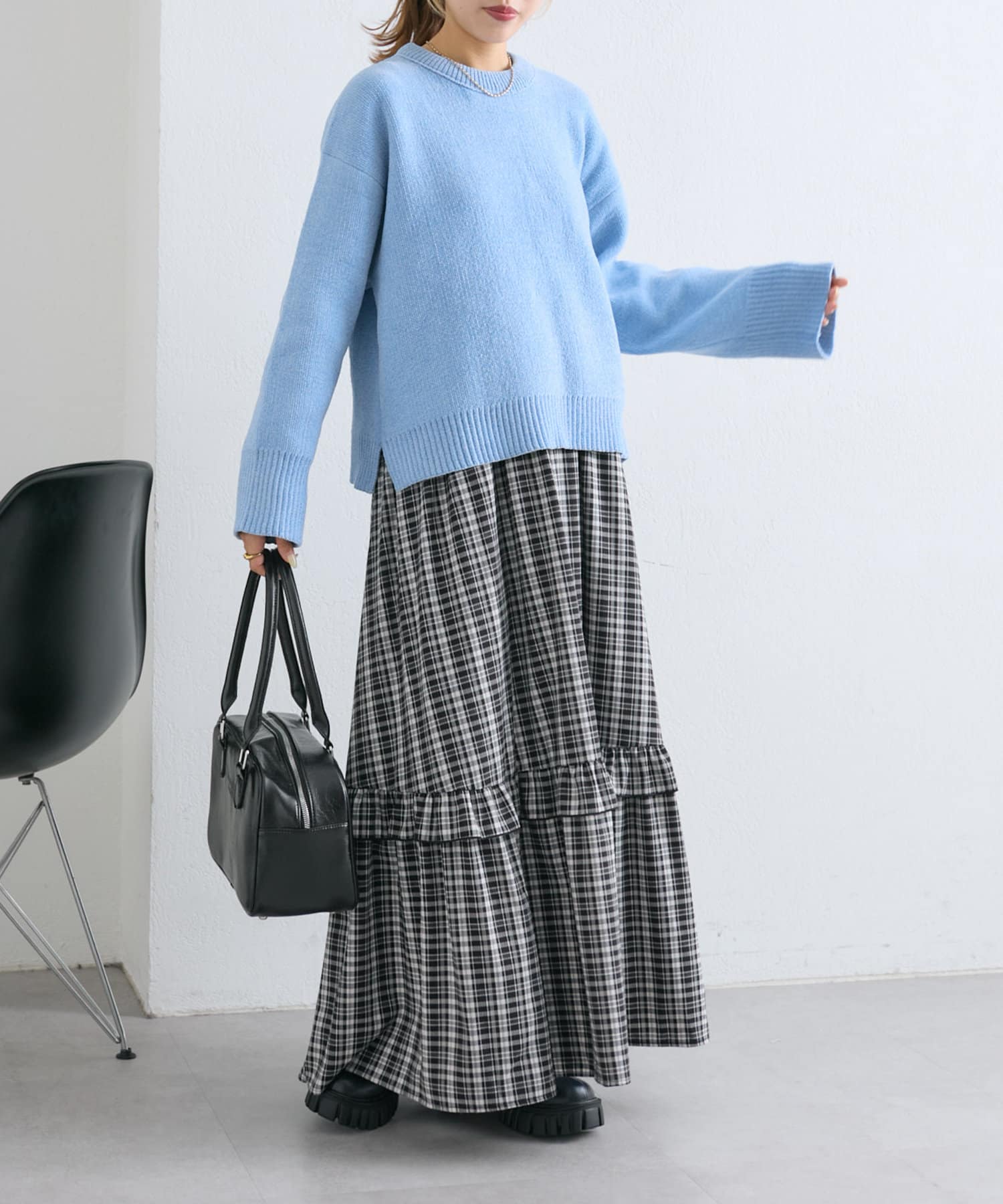 ・スラックスやタイトなロングスカートと合わせると大人っぽい落ち着いた印象にまとまります