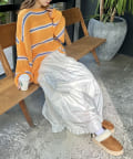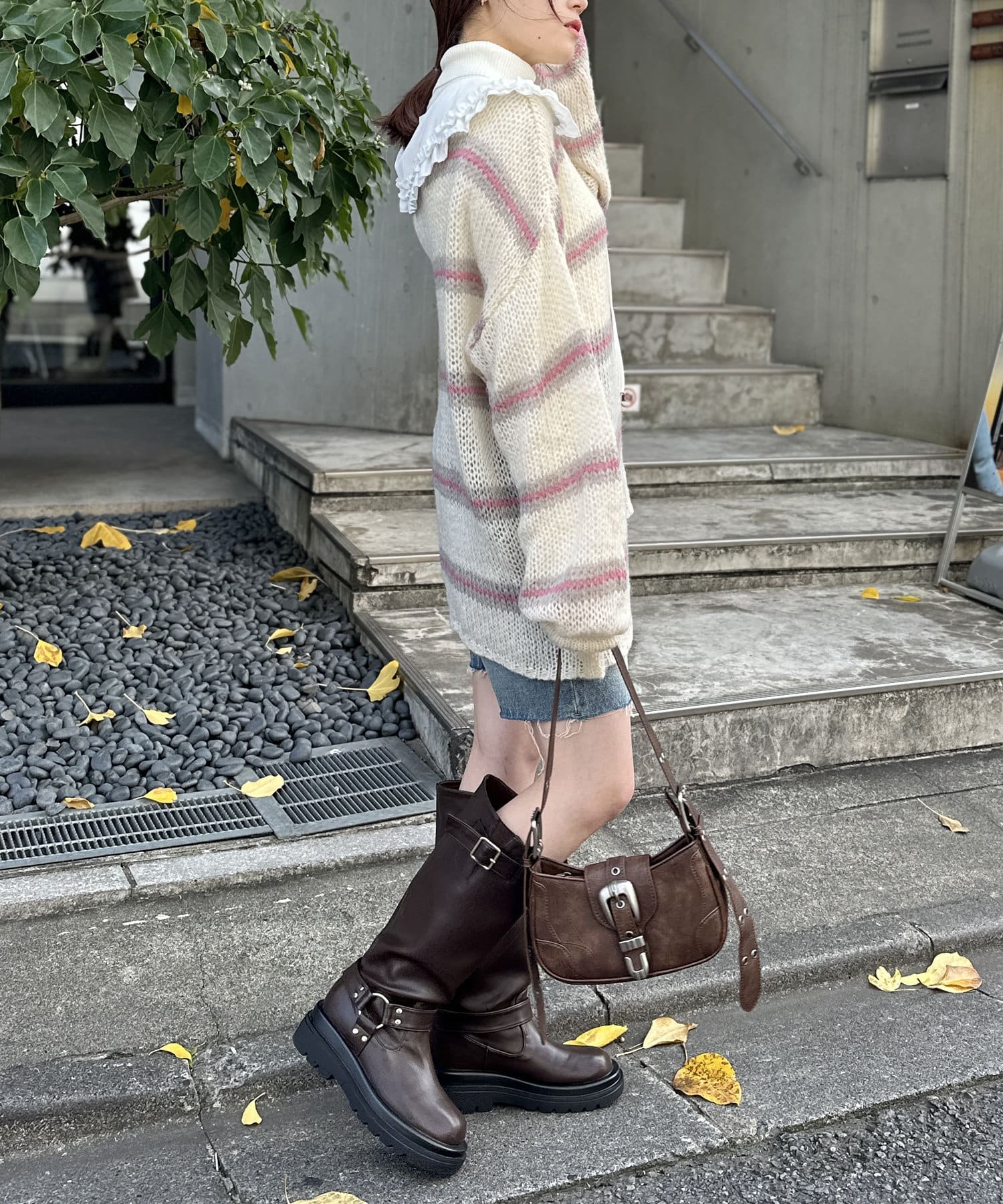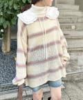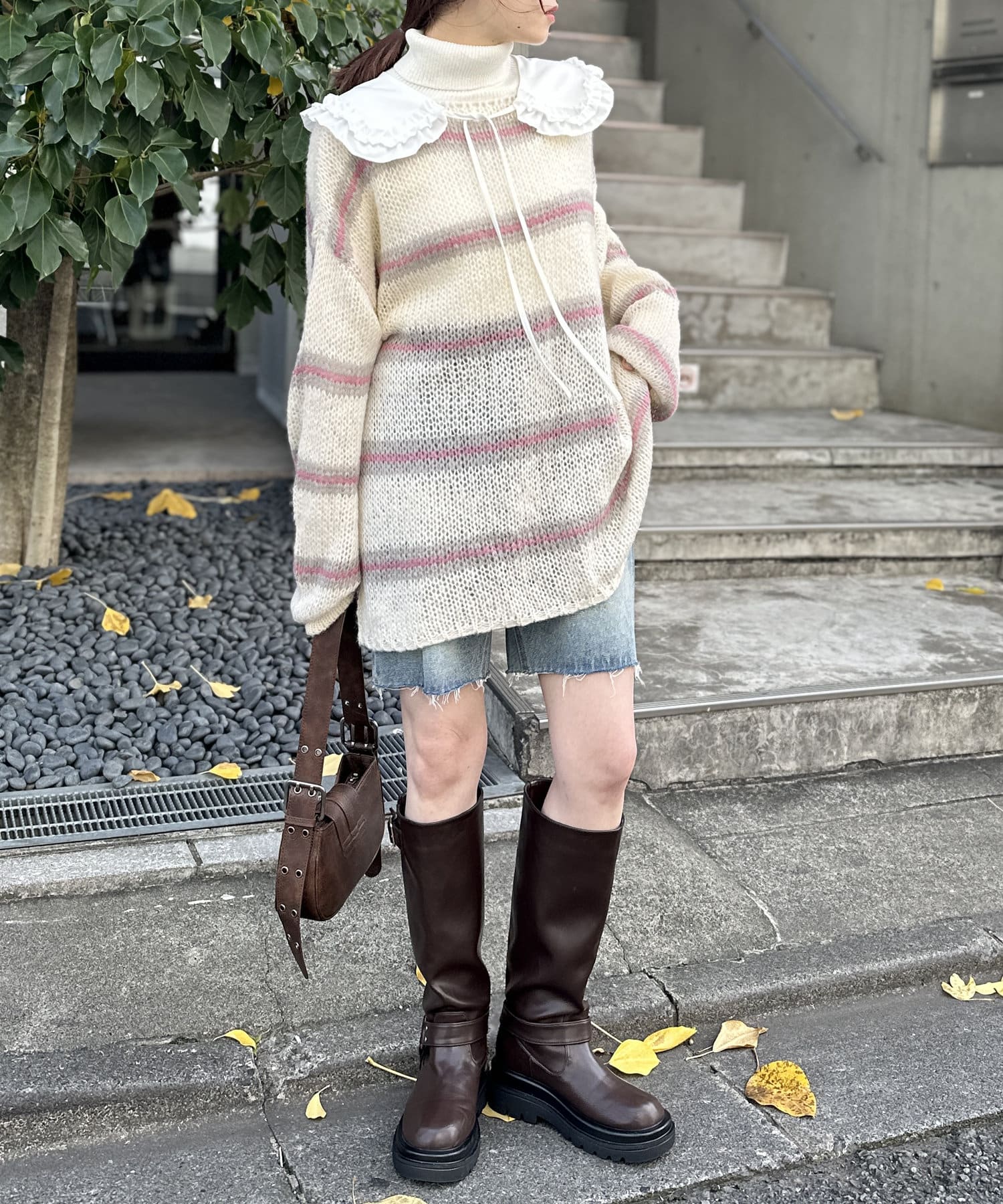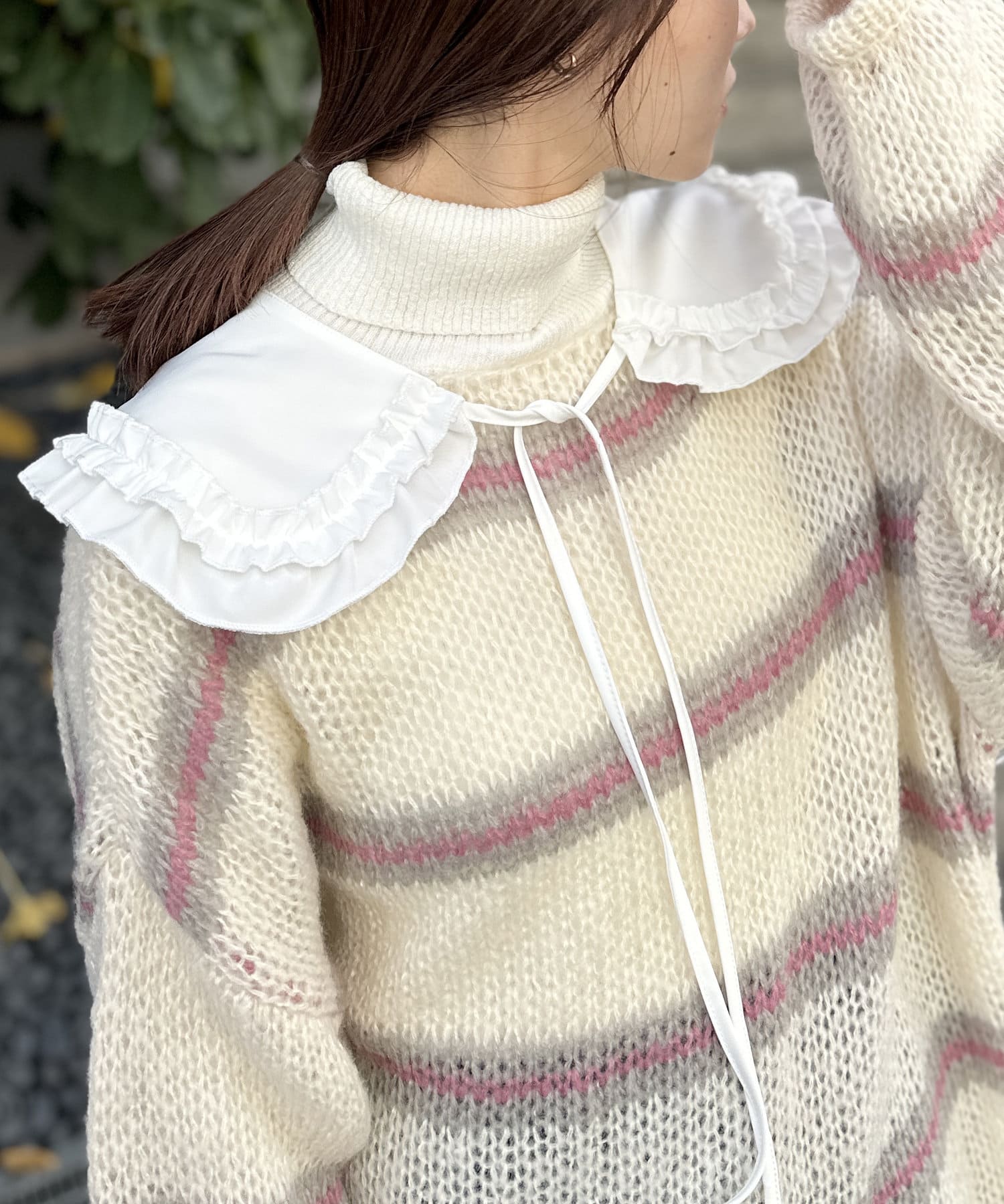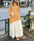 ・メンズライクなボーダーニットは付け衿やフリルアイテムと合わせてガーリー要素をプラスするとおしゃれ見えします