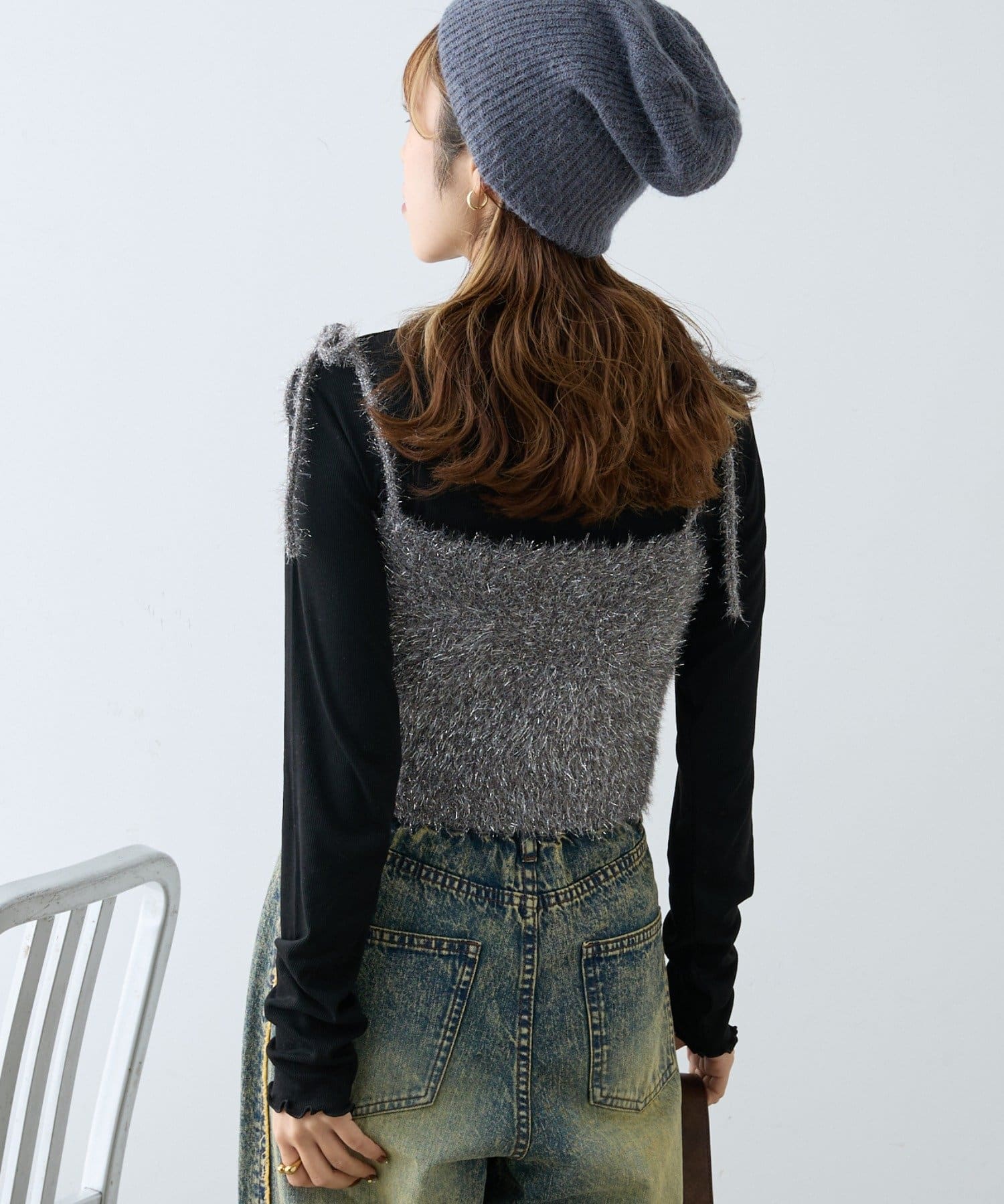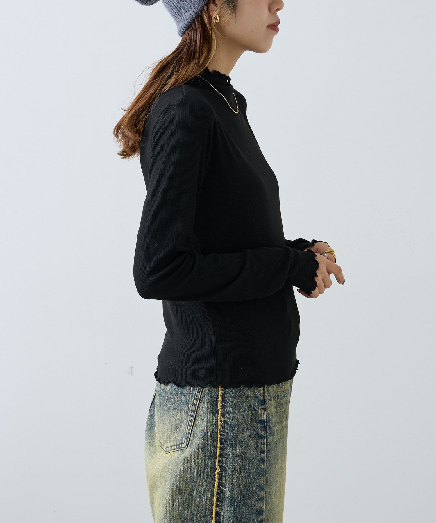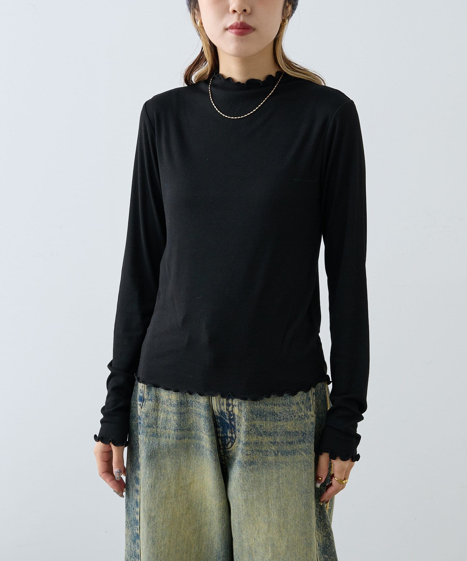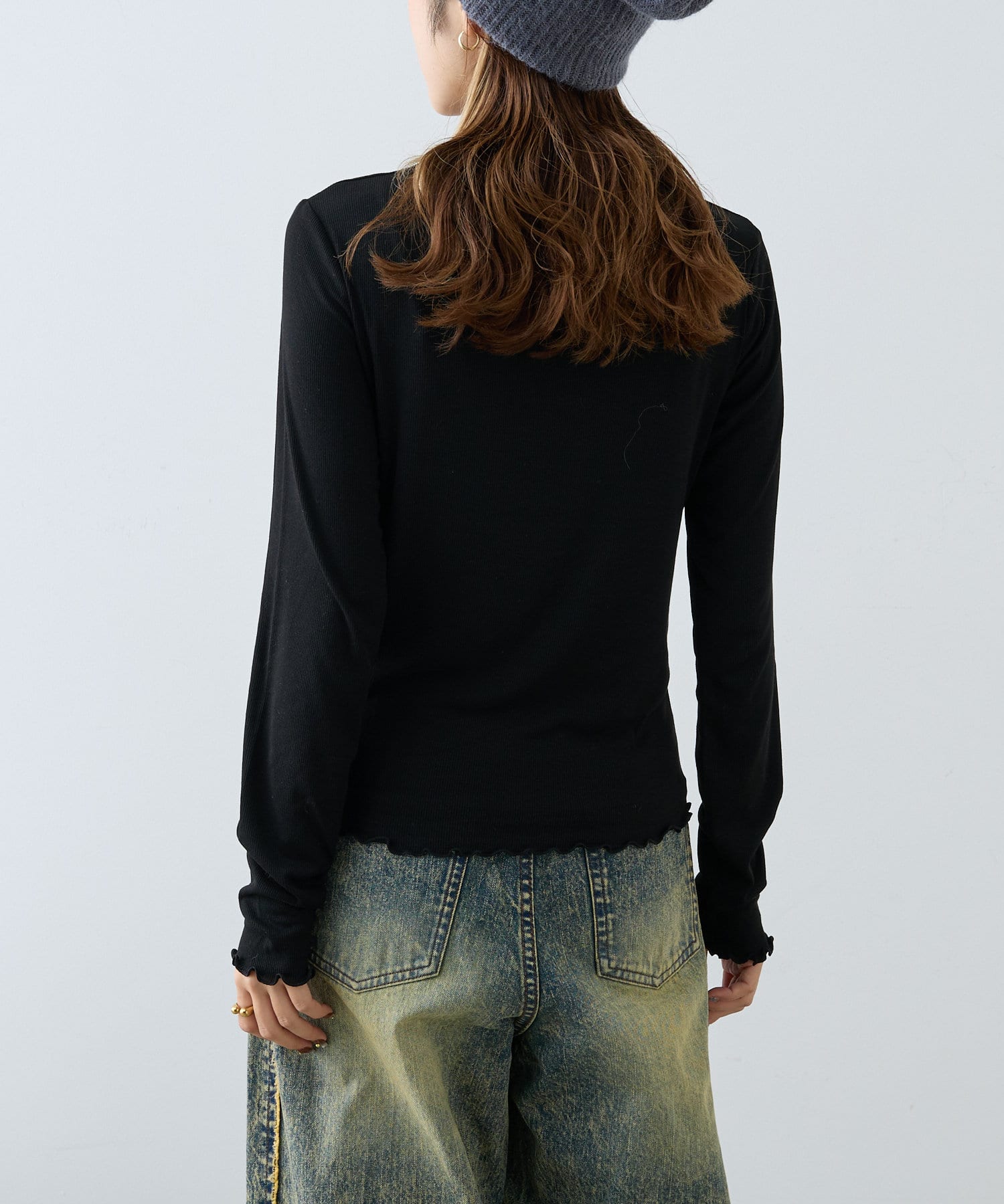 ・シンプルになりすぎないよう袖のメローデザインでフェミニンさをプラス