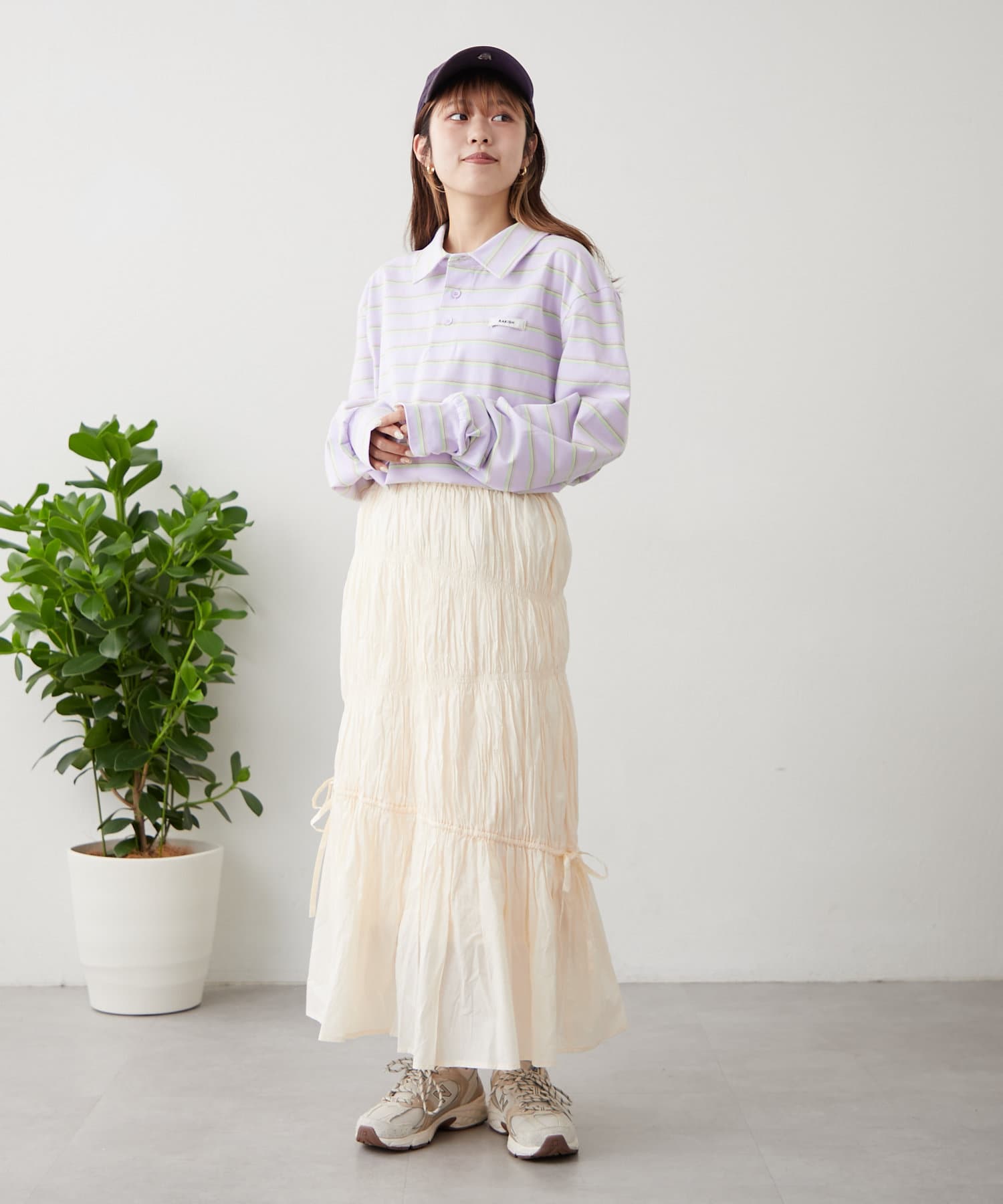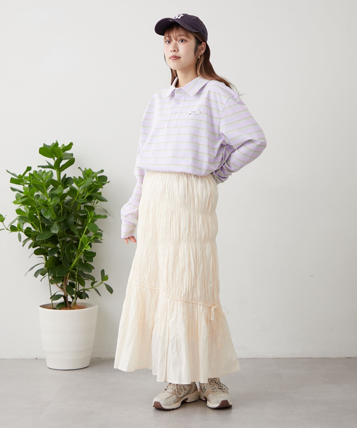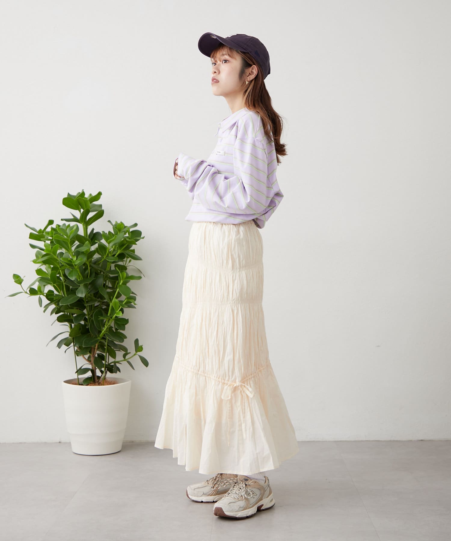 ・コーデに取り入れるだけで春の気分になれるコットン100%のスカートはメンズライクなカットソーでカジュアルダウンすると◎