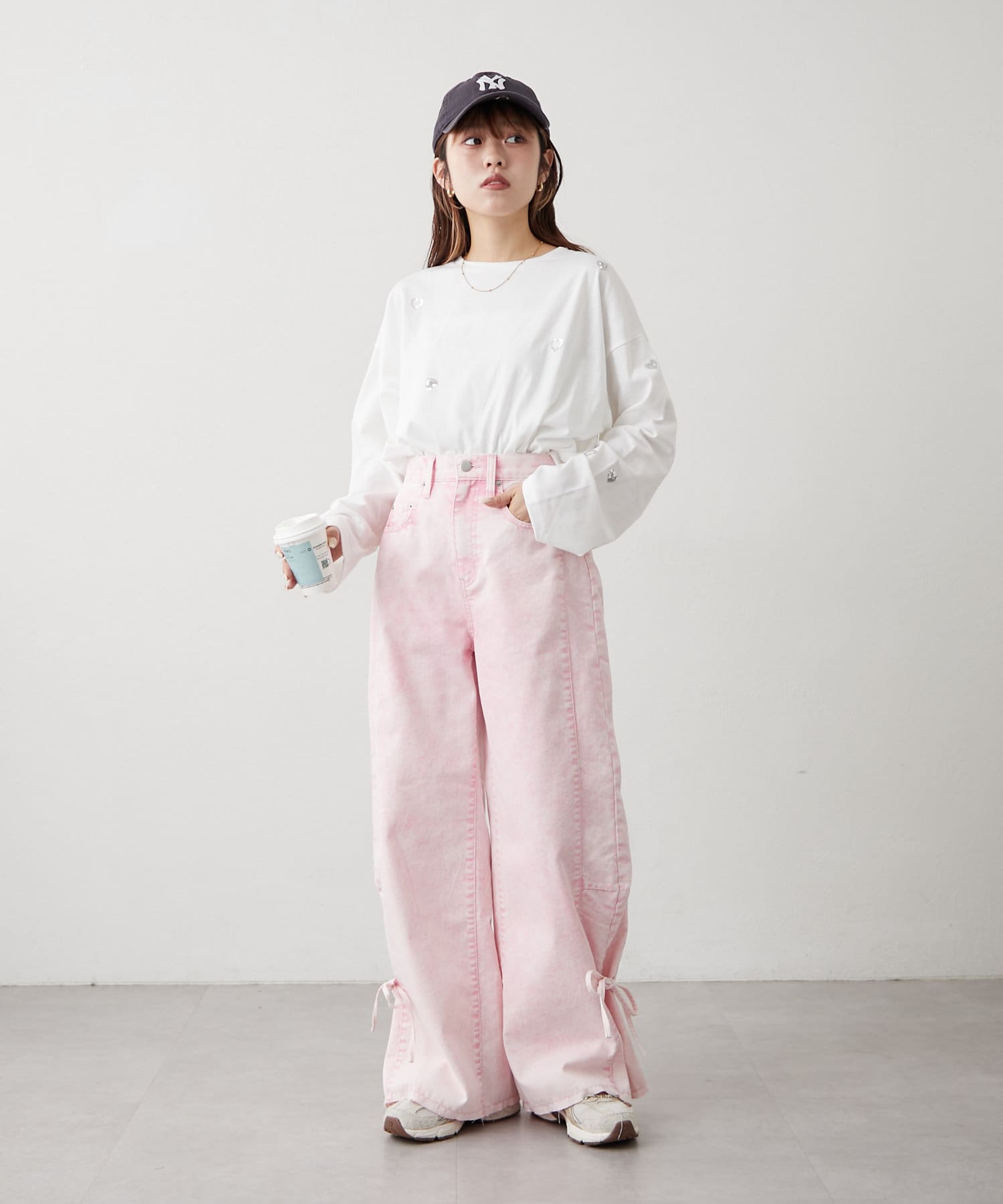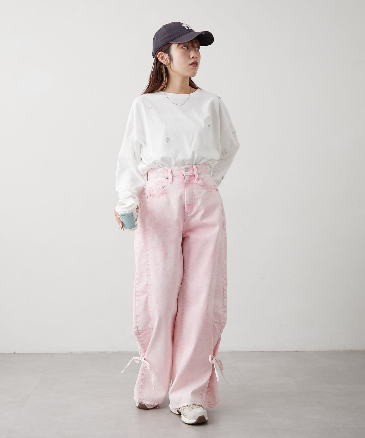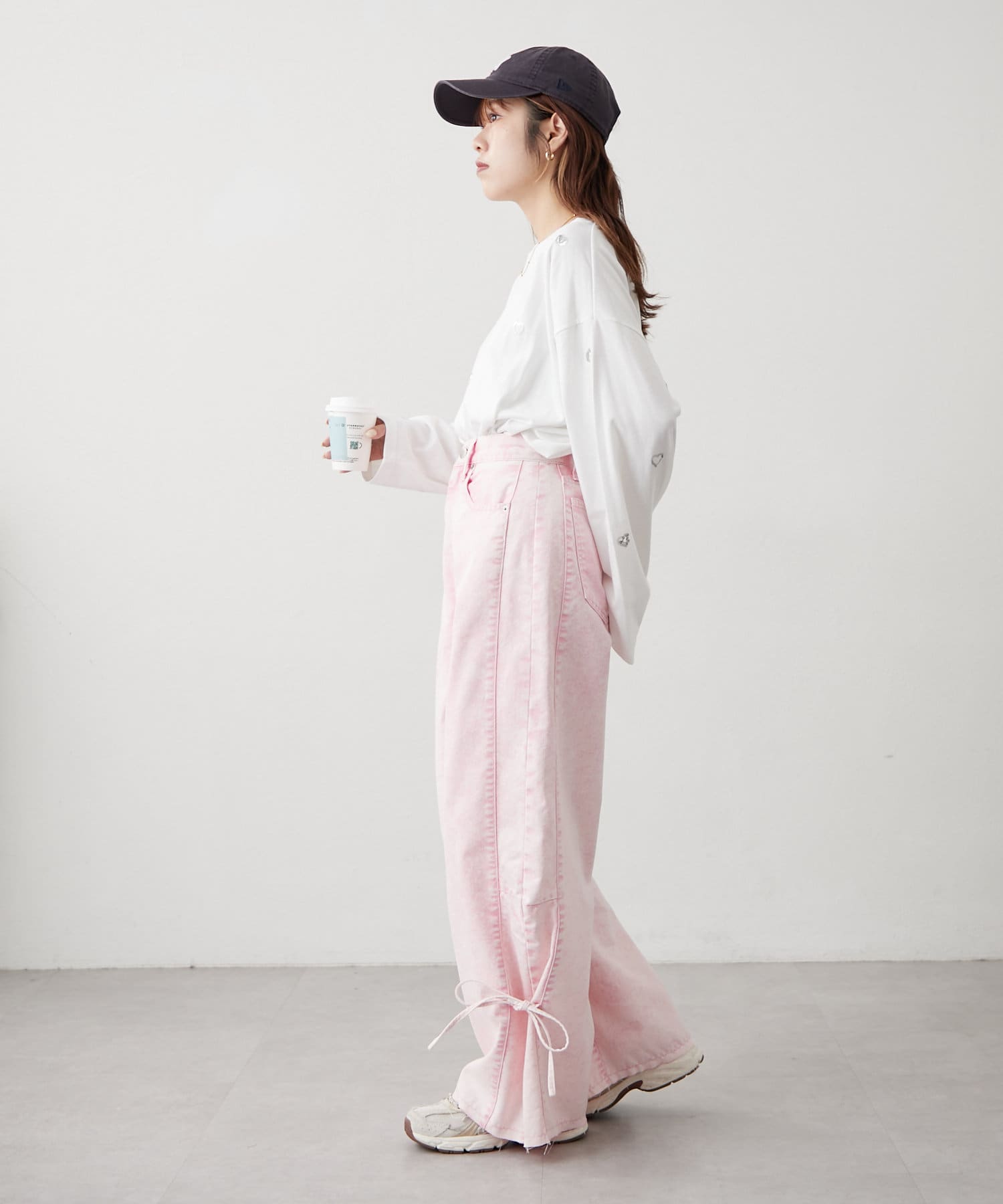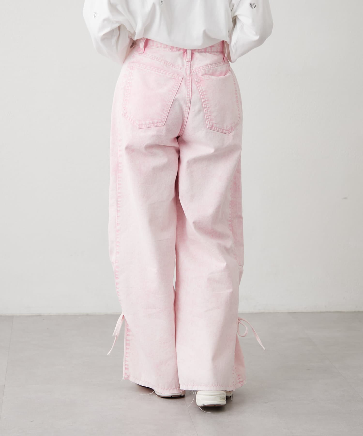 ・カジュアルなワイドデザインに裾のリボンが甘さをプラス