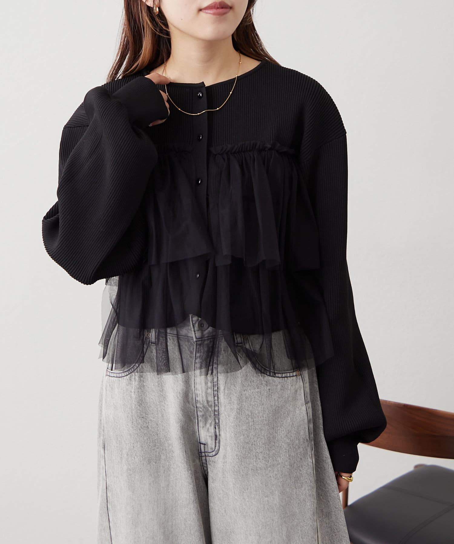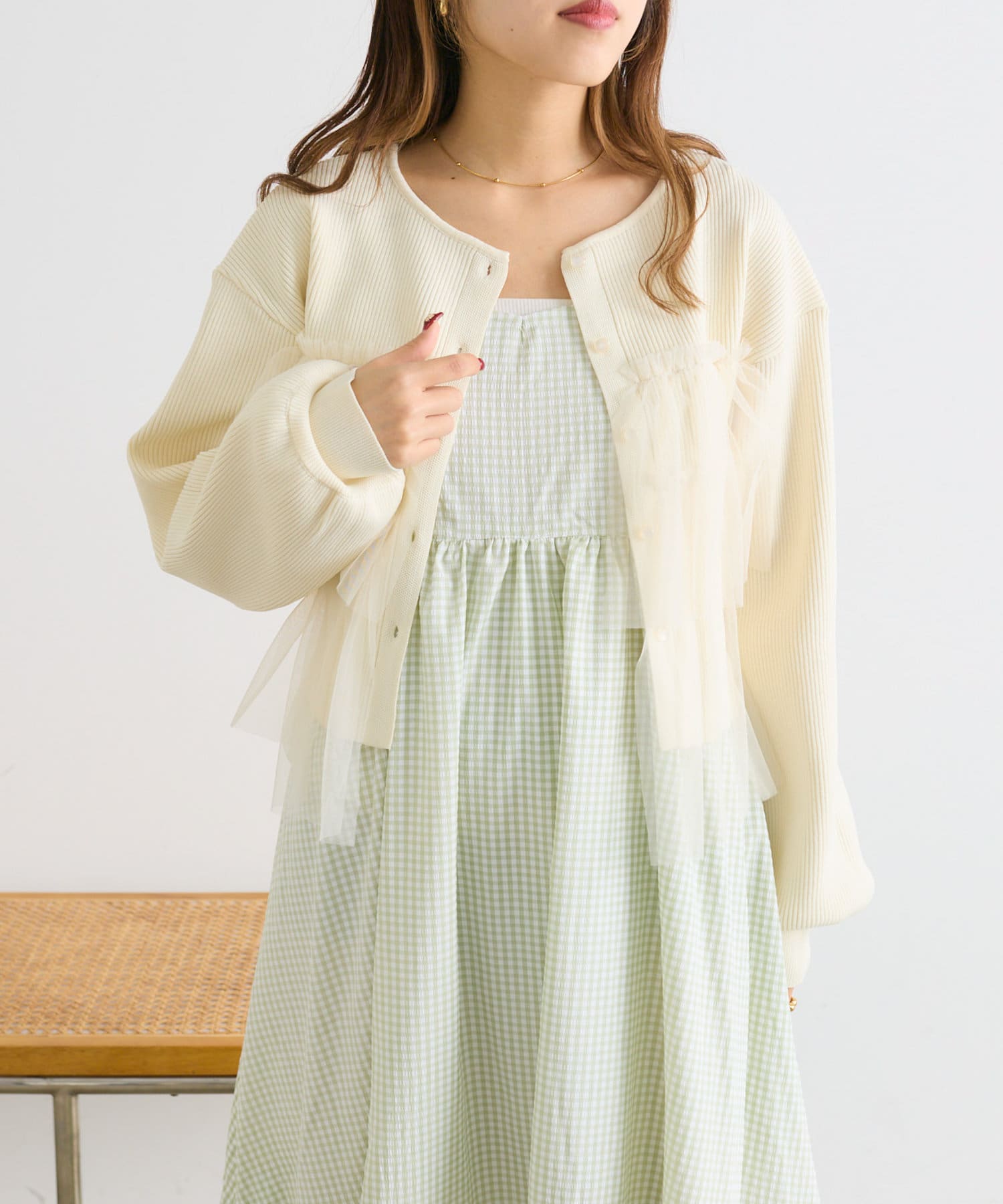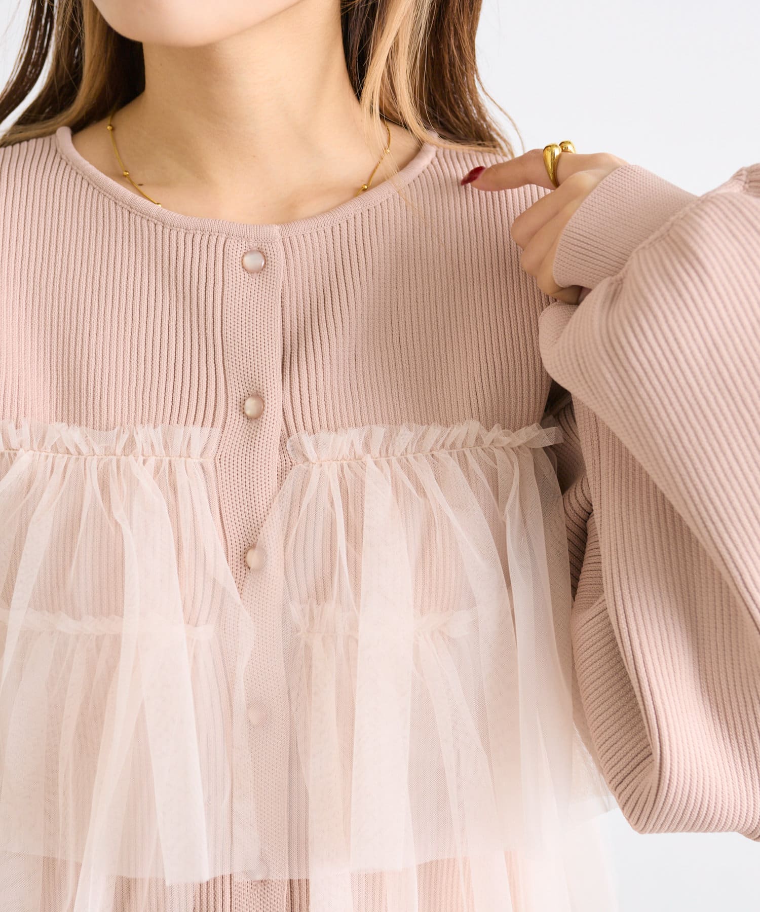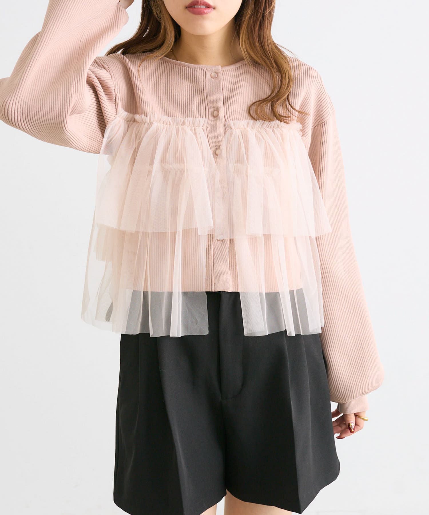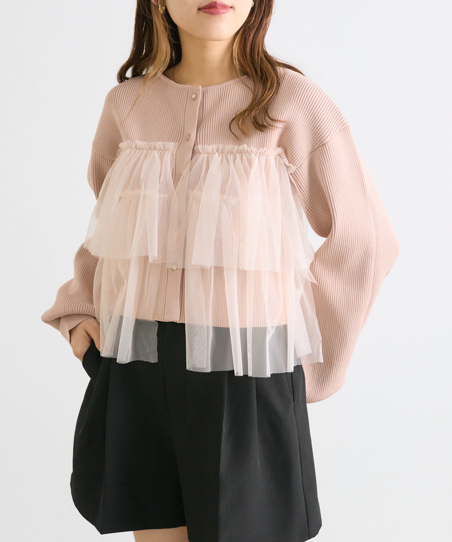 ・シンプルなカーデにチュールを段々にドッキングした華やかな1枚
