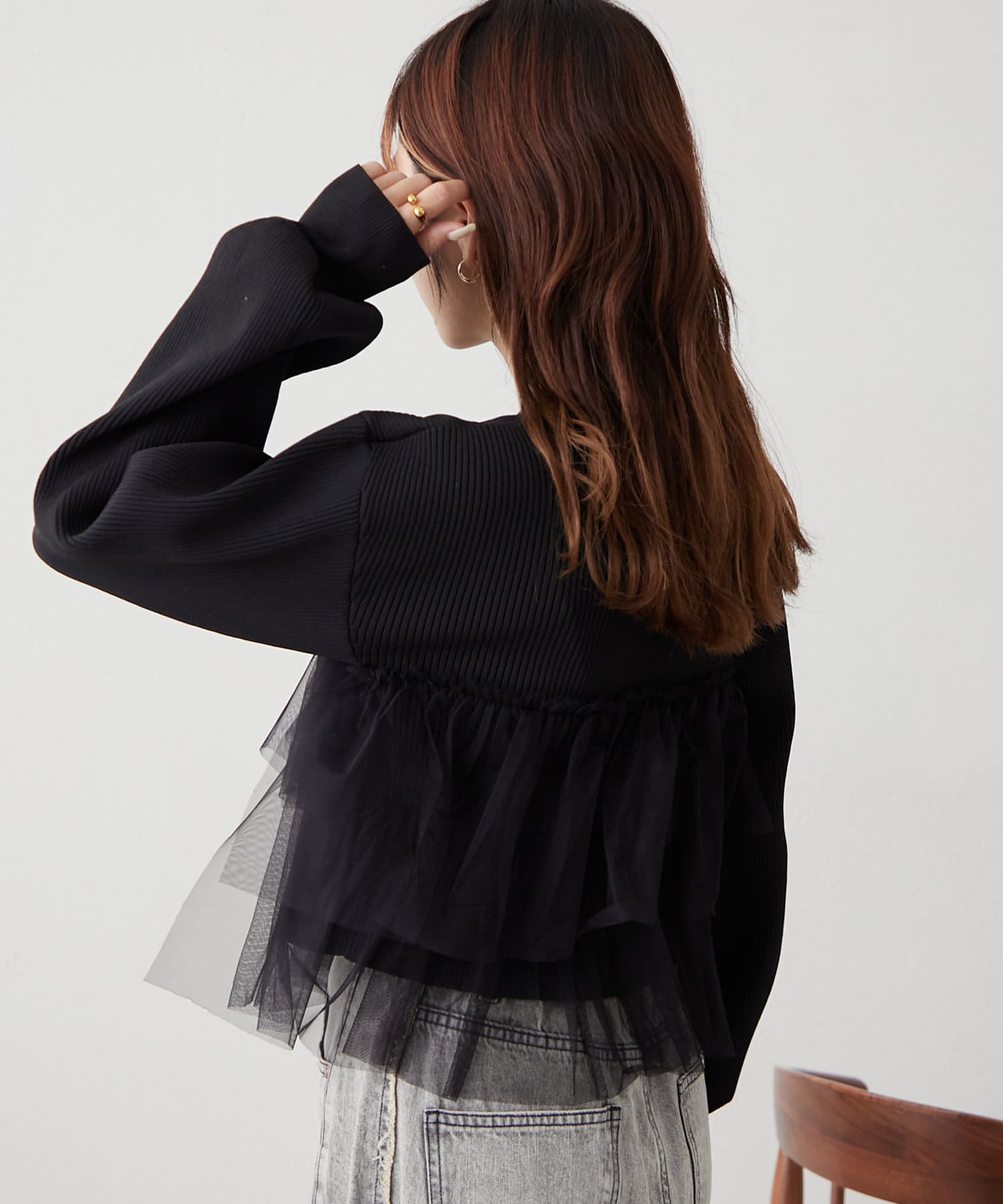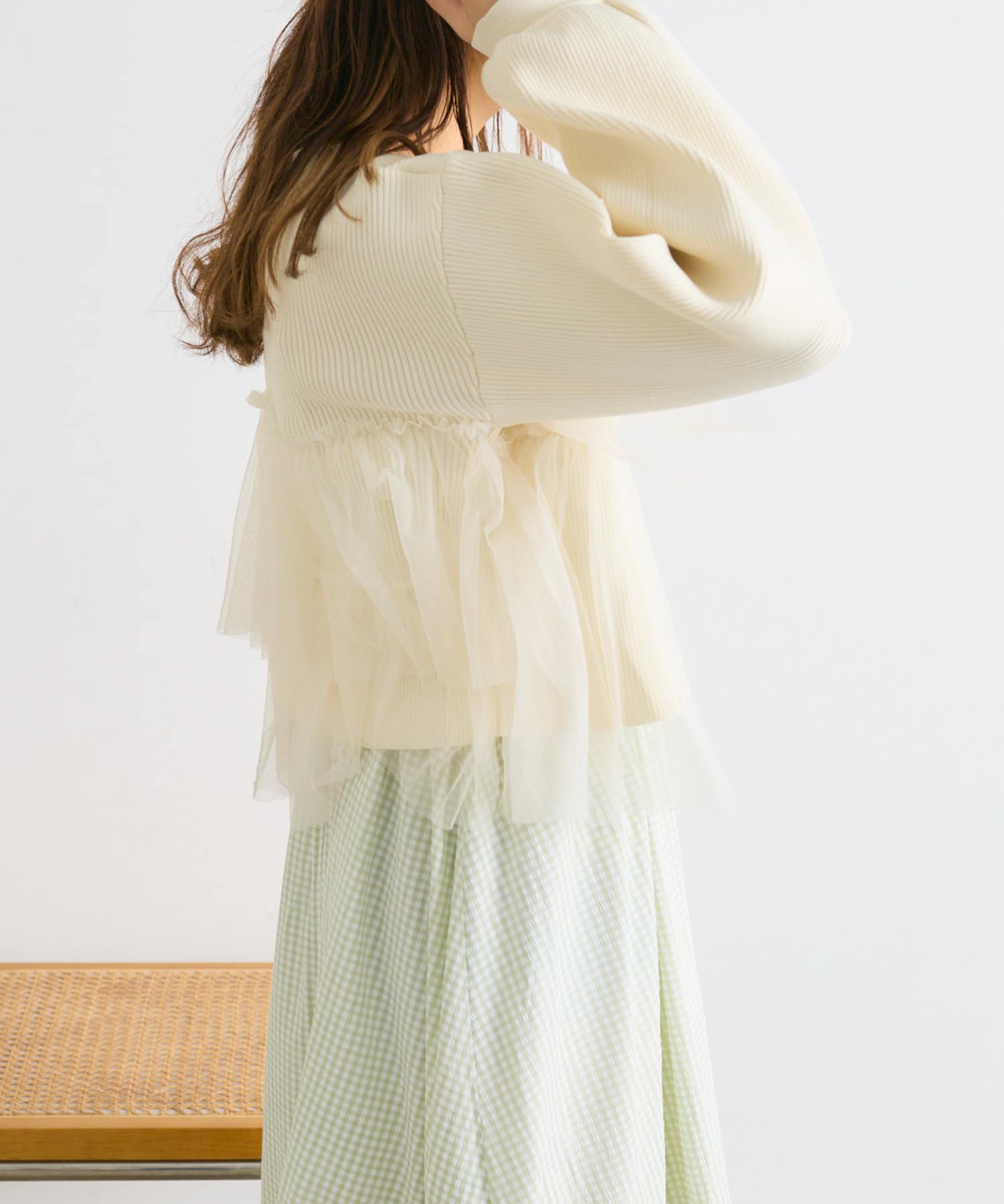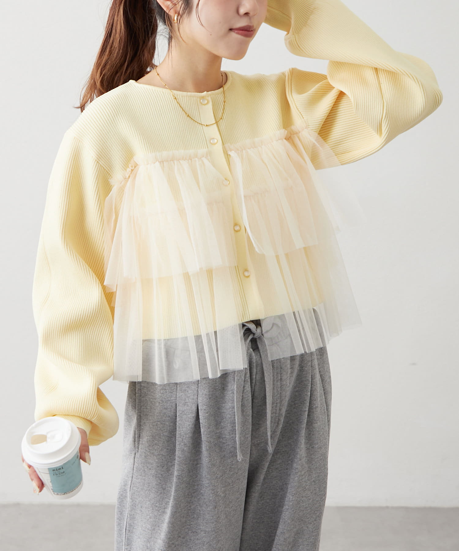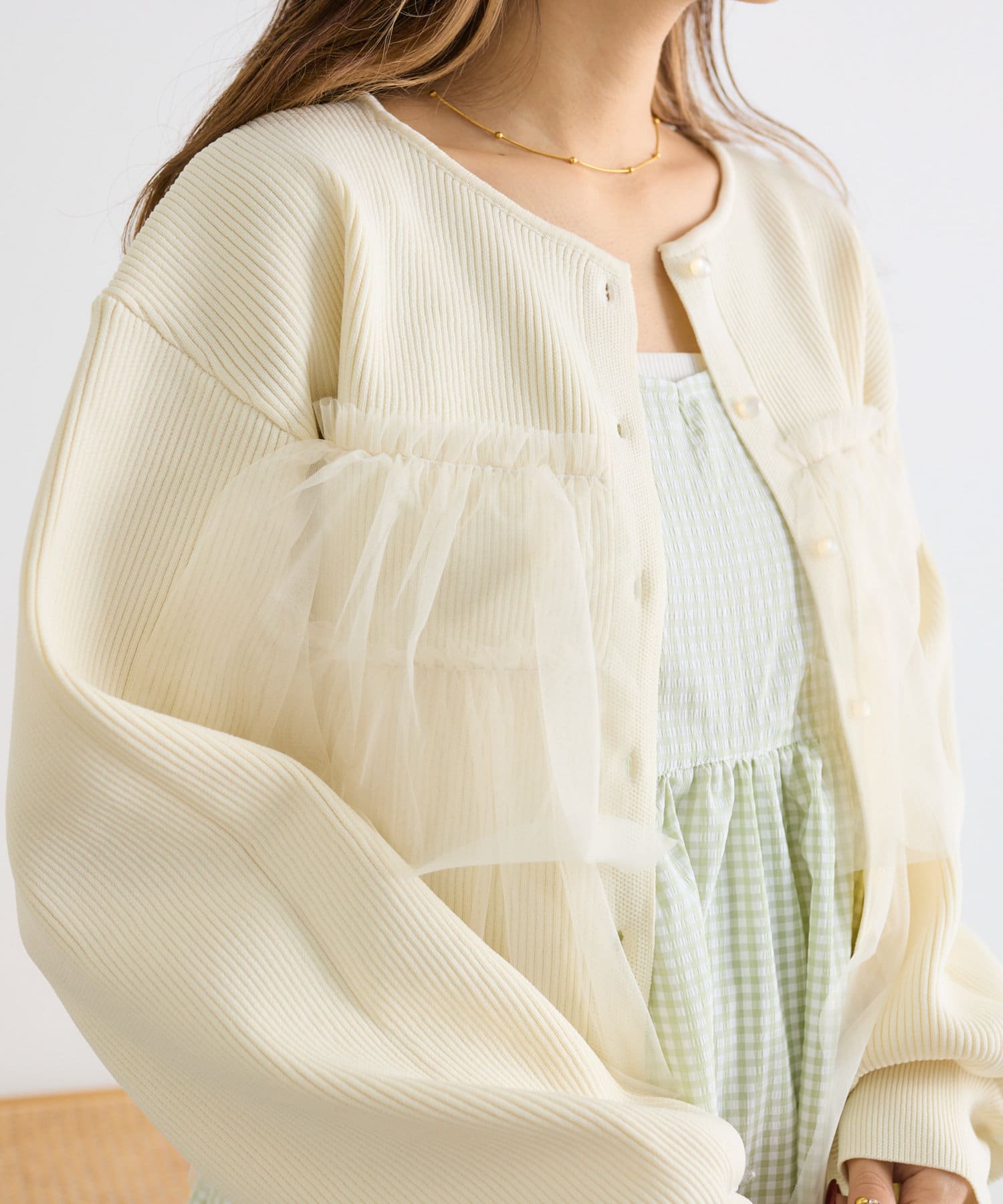 ・シンプルなカーデにチュールを段々にドッキングした華やかな1枚