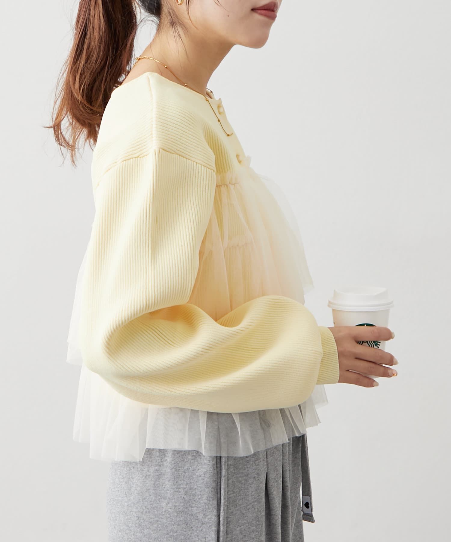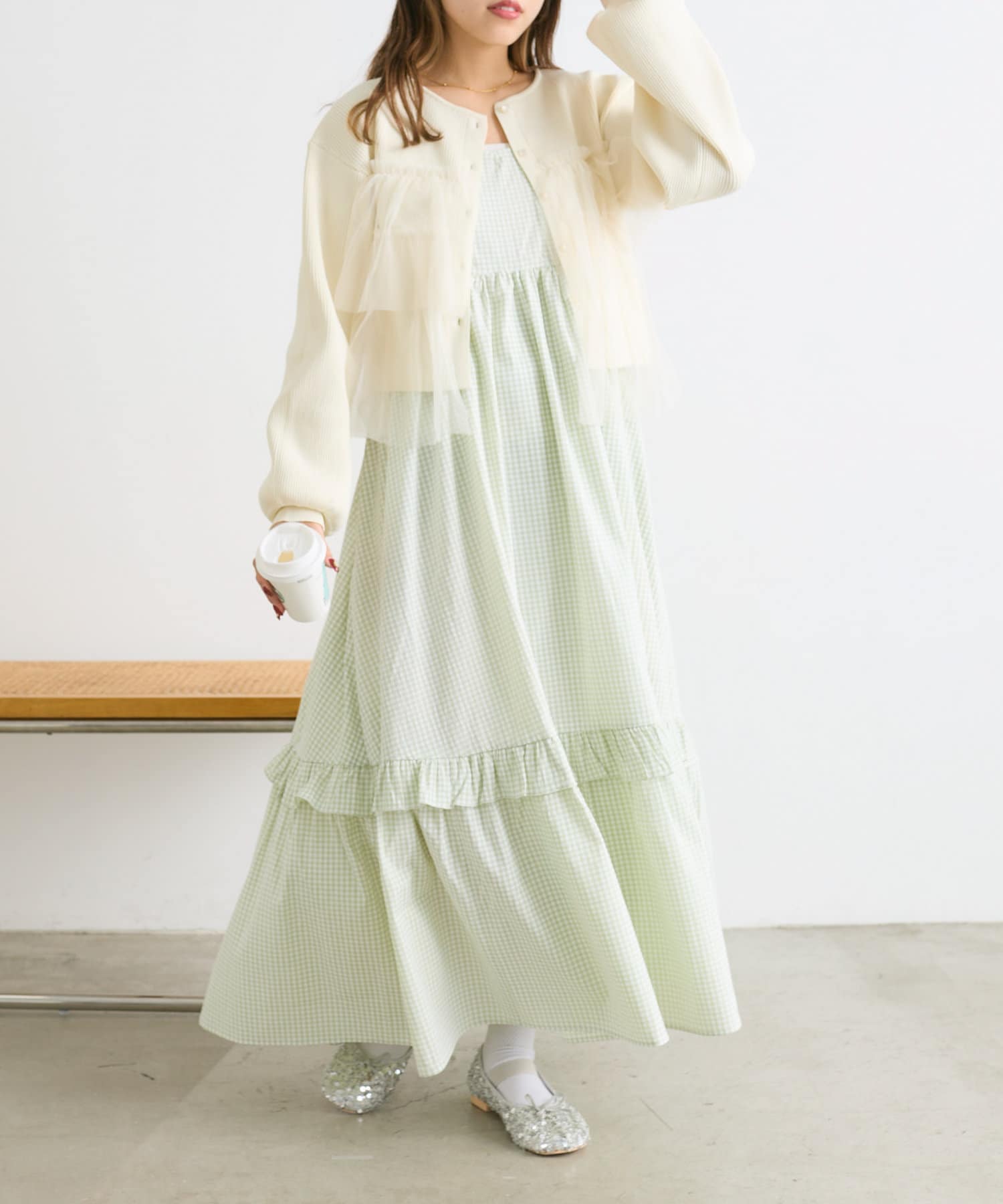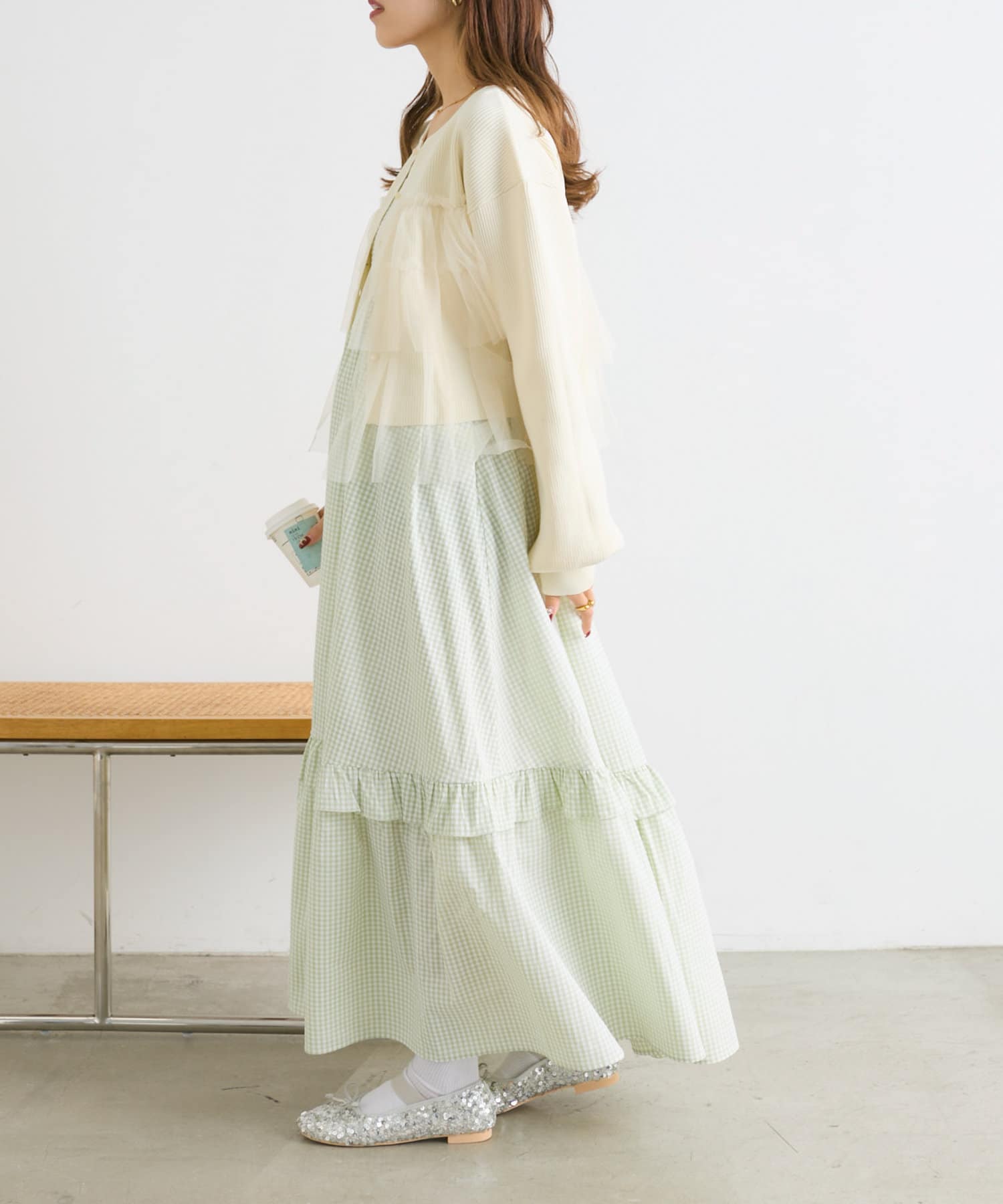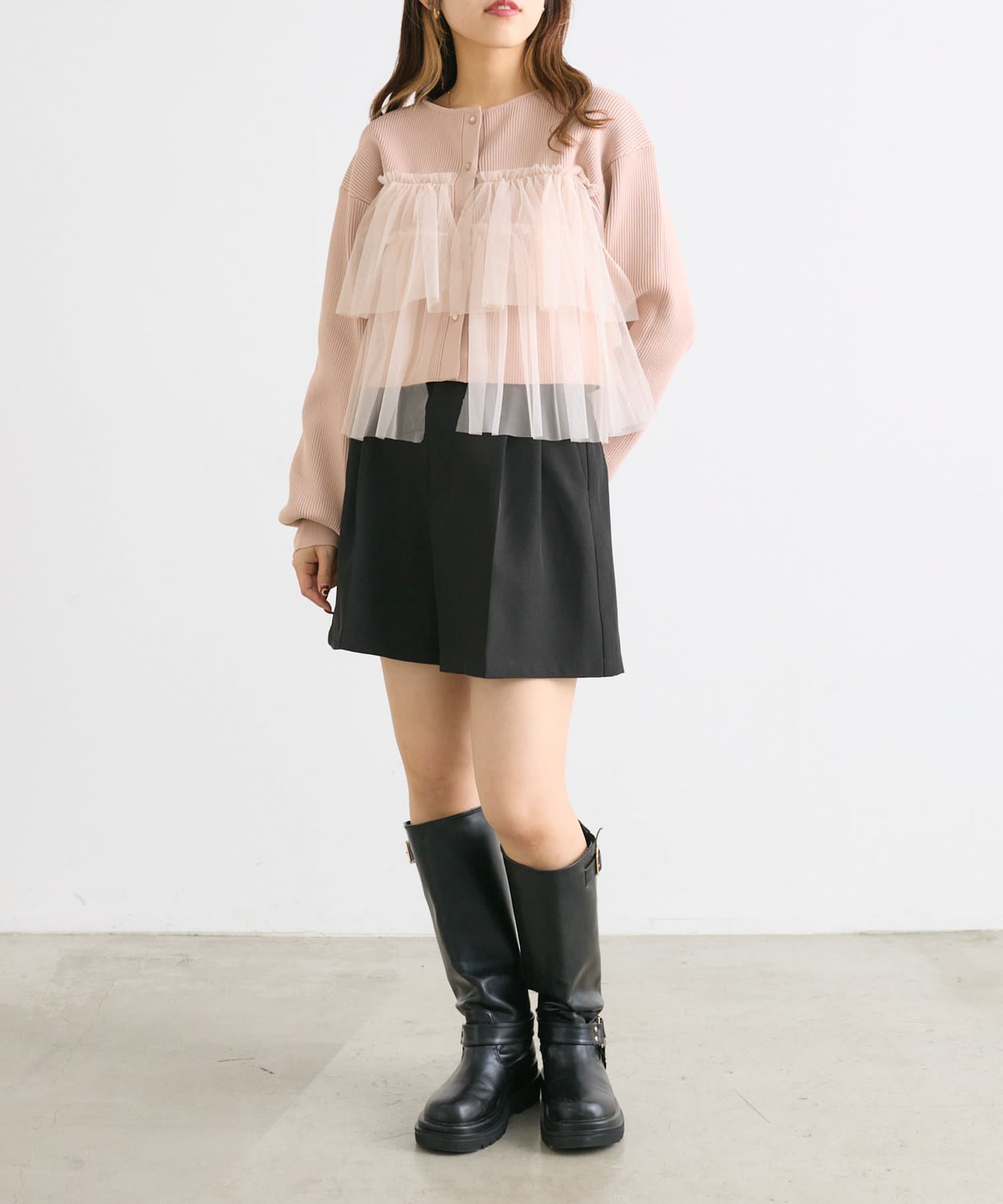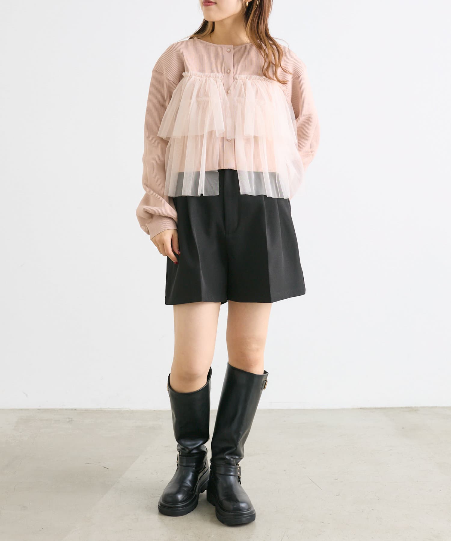 ・シンプルなカーデにチュールを段々にドッキングした華やかな1枚