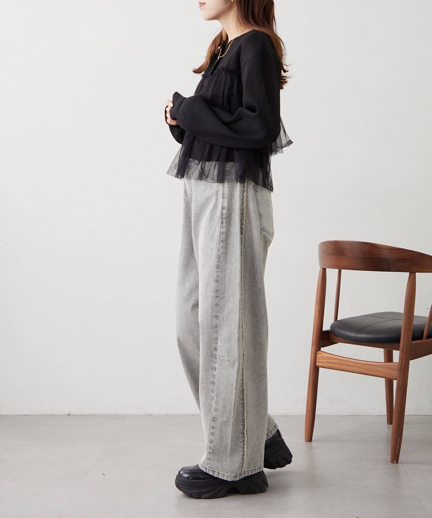 ・レディライクな印象のトップスにデニムを合わせてカジュアルダウンした着こなしがオススメ◎