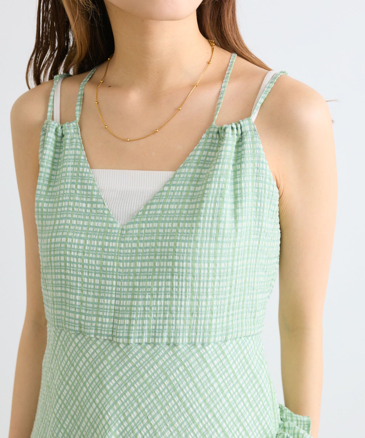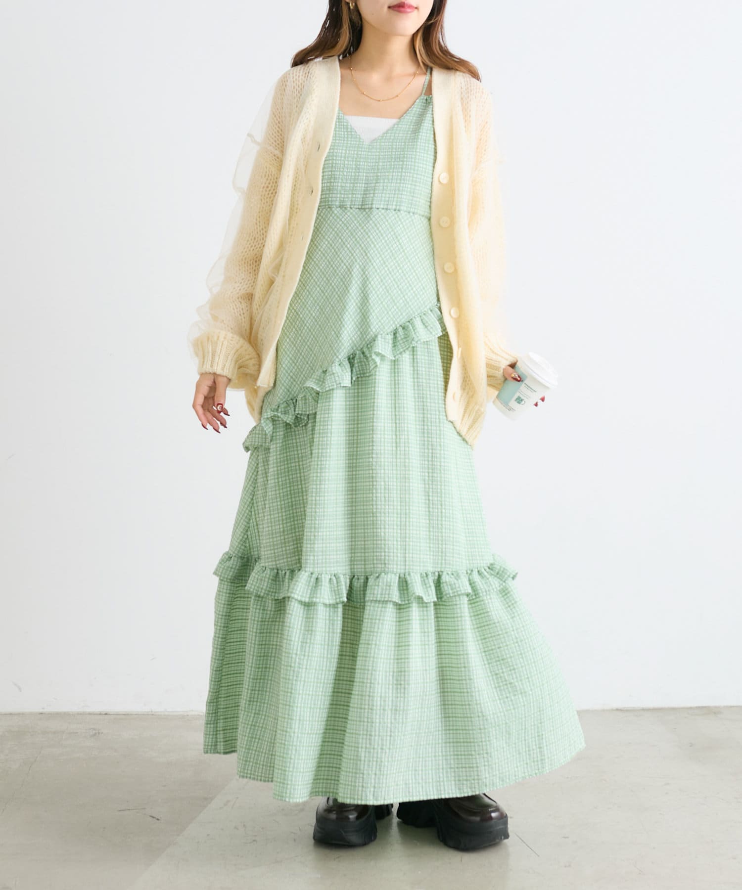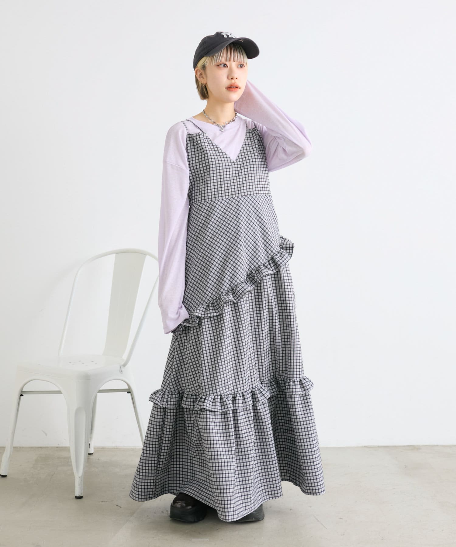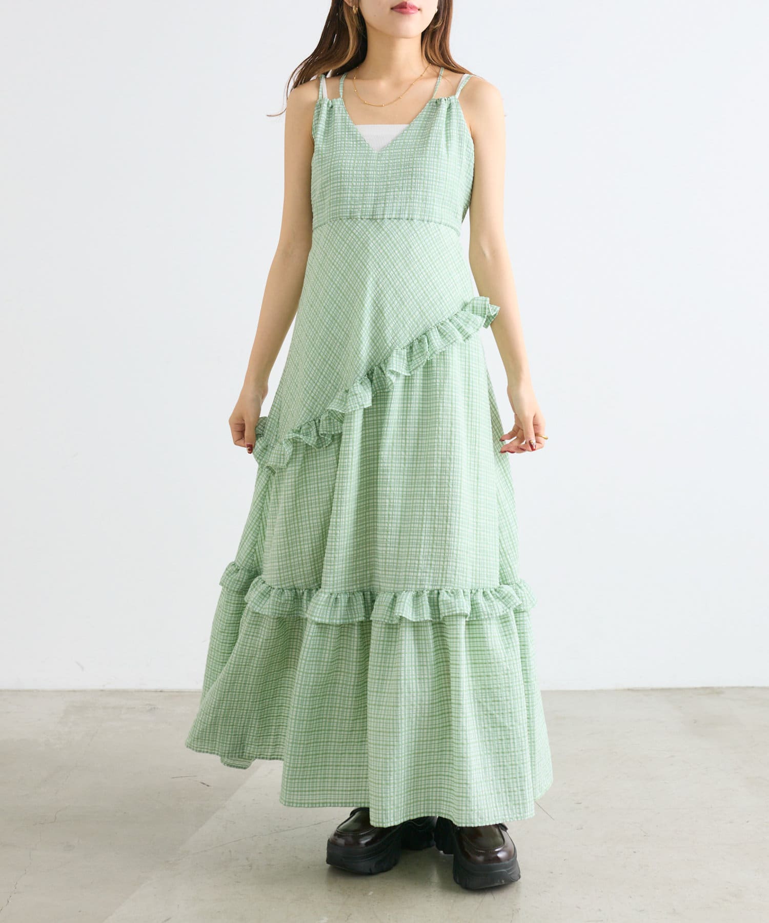 アシメにデザインされたフリルがお洒落なキャミワンピ