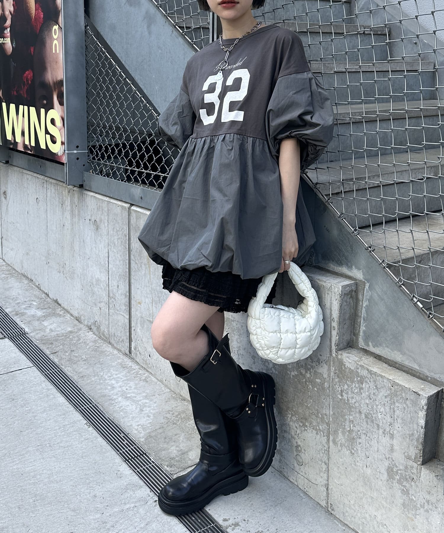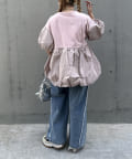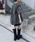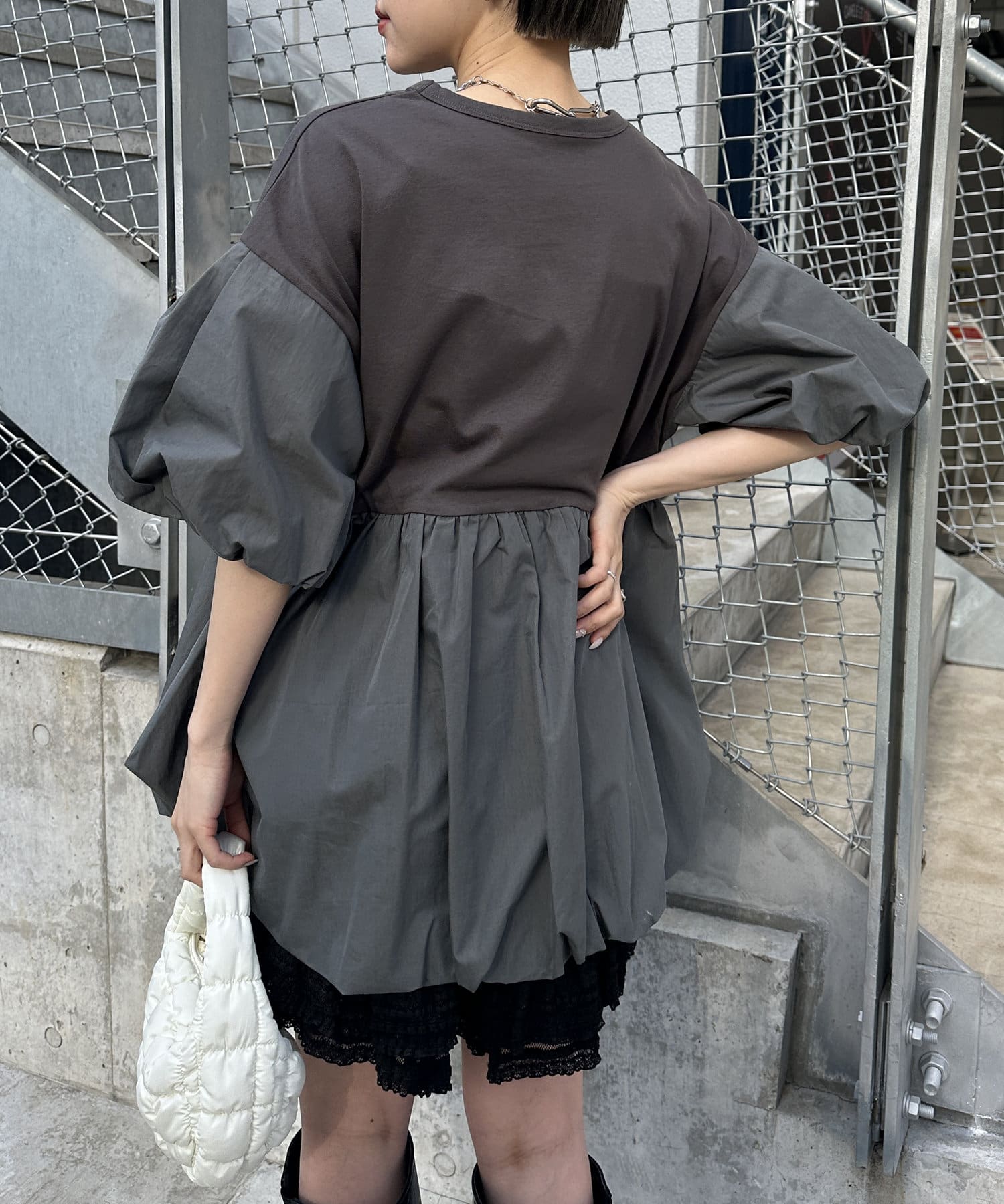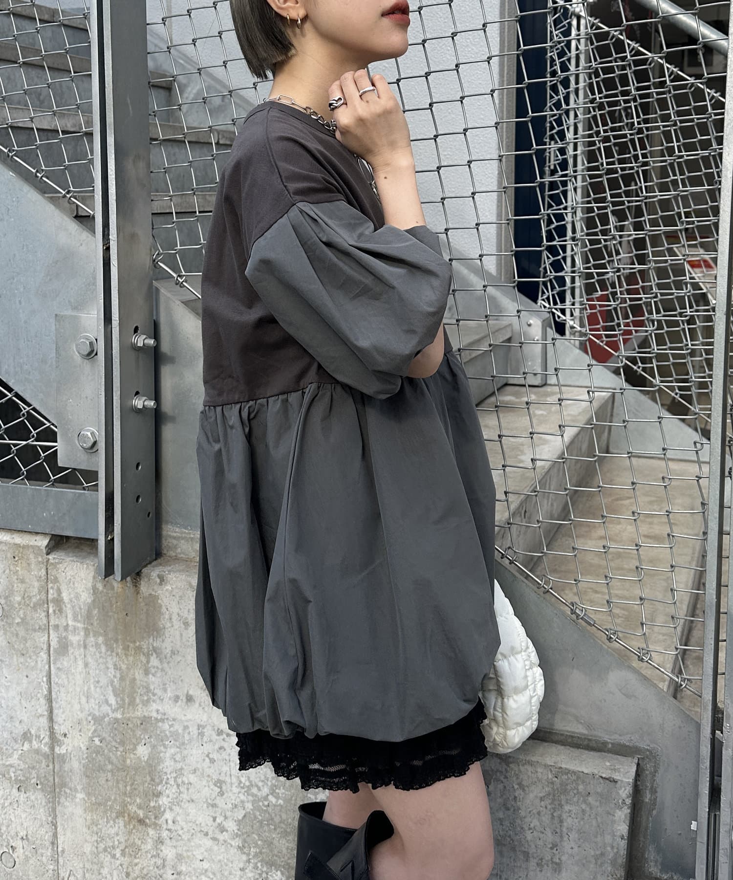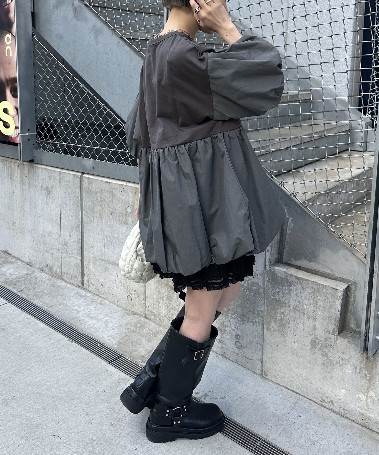 ・袖とスカート部分はパリっと感があり、異素材がオシャレ◎袖口はゴム仕様になっております。