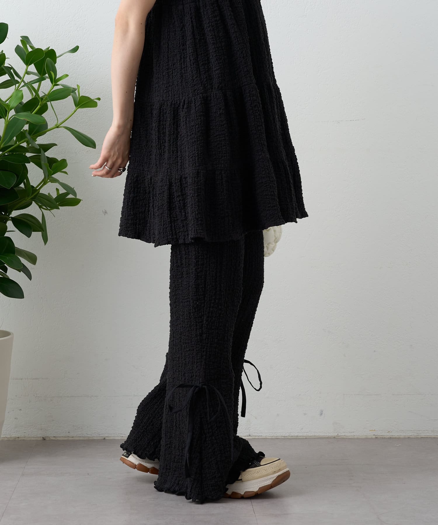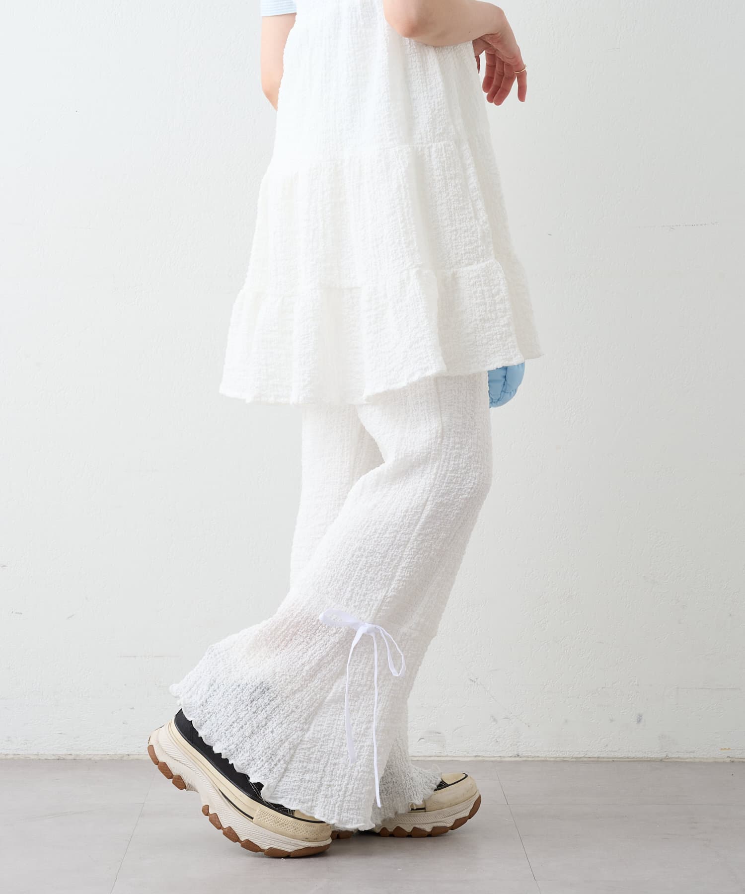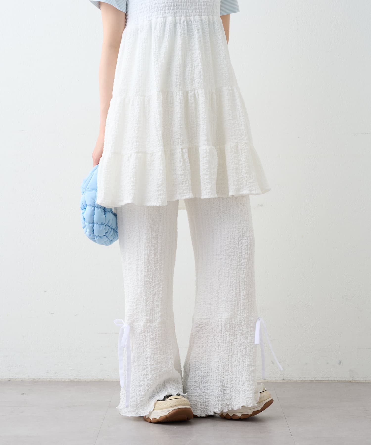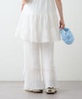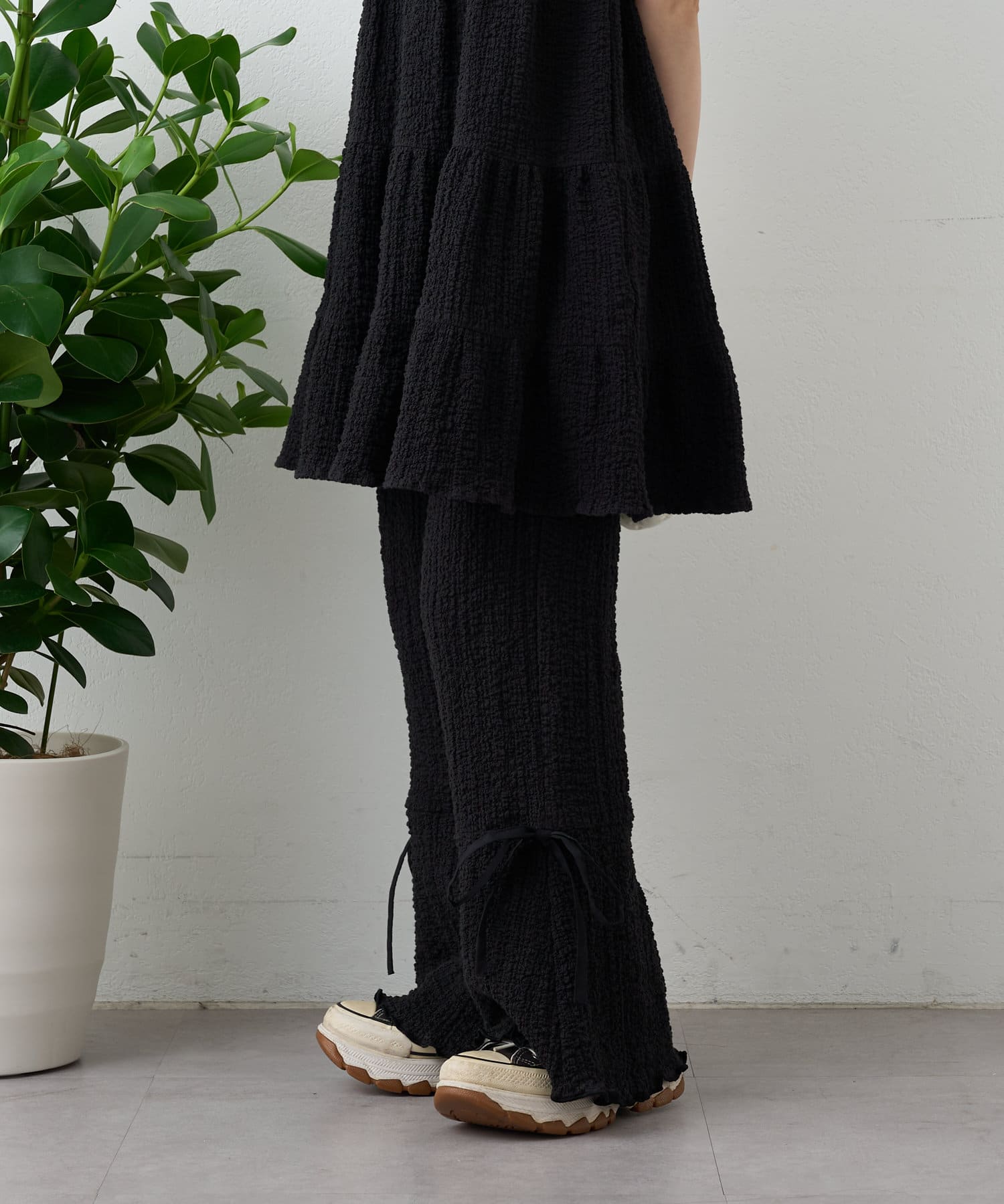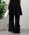 ・パンツの裾にはリボンが付いていて、フレアの切り替えもあるので脚長効果も♪