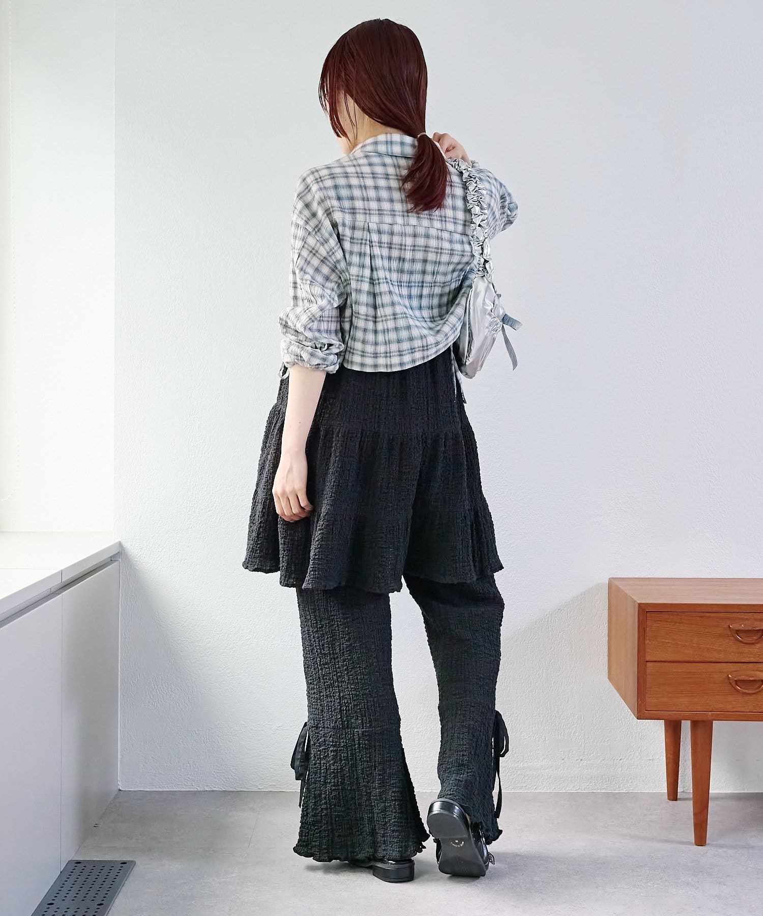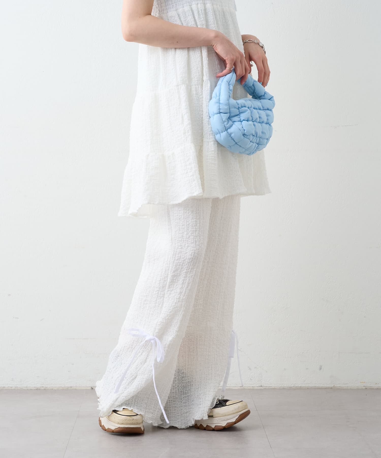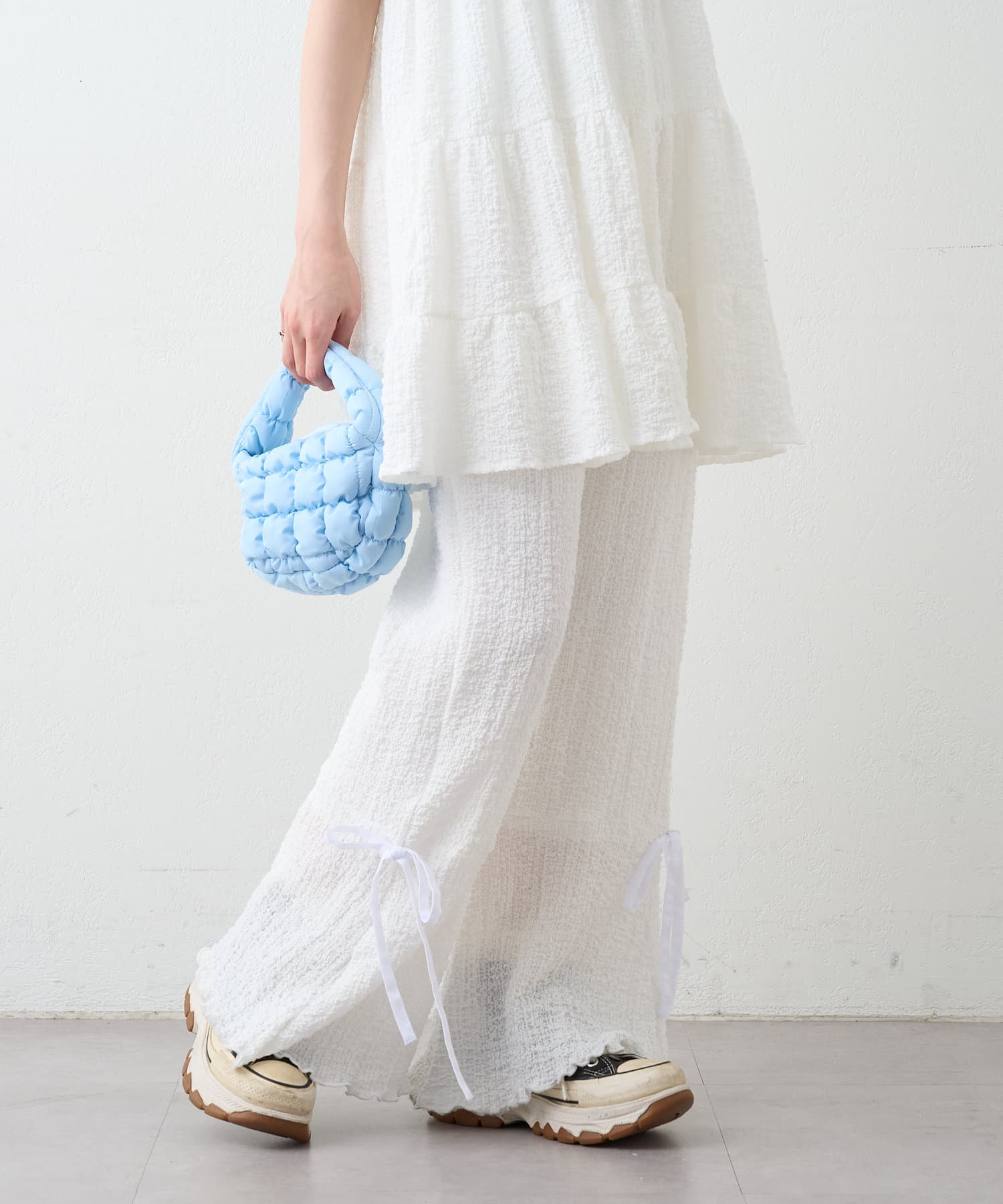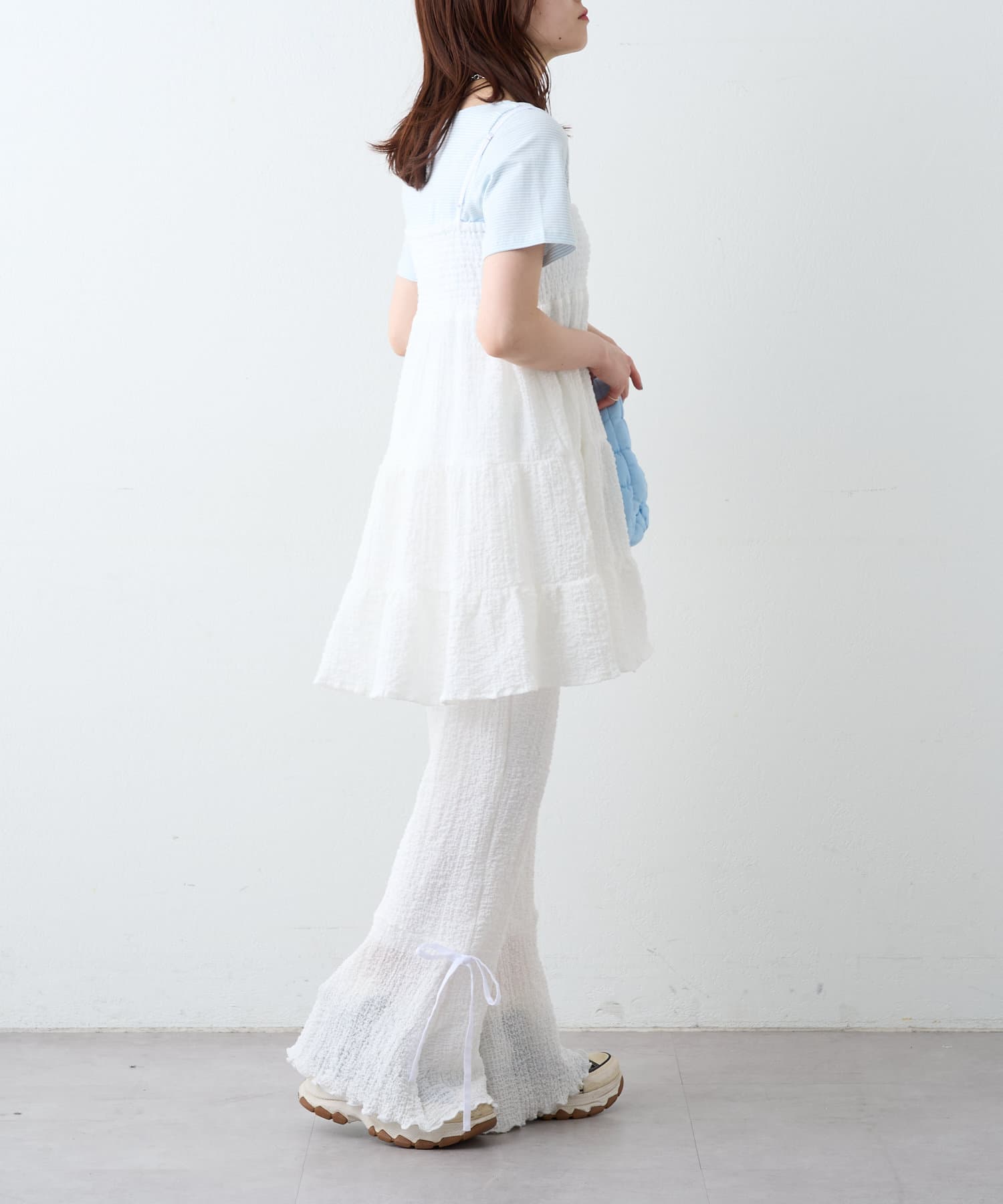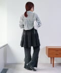 ・パンツの裾にはリボンが付いていて、フレアの切り替えもあるので脚長効果も♪