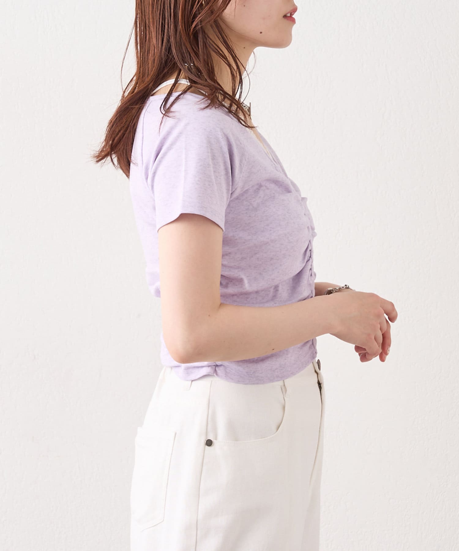 ・フロントのサイドのギャザーが程よい肌見せができ、スタイルアップ見え◎