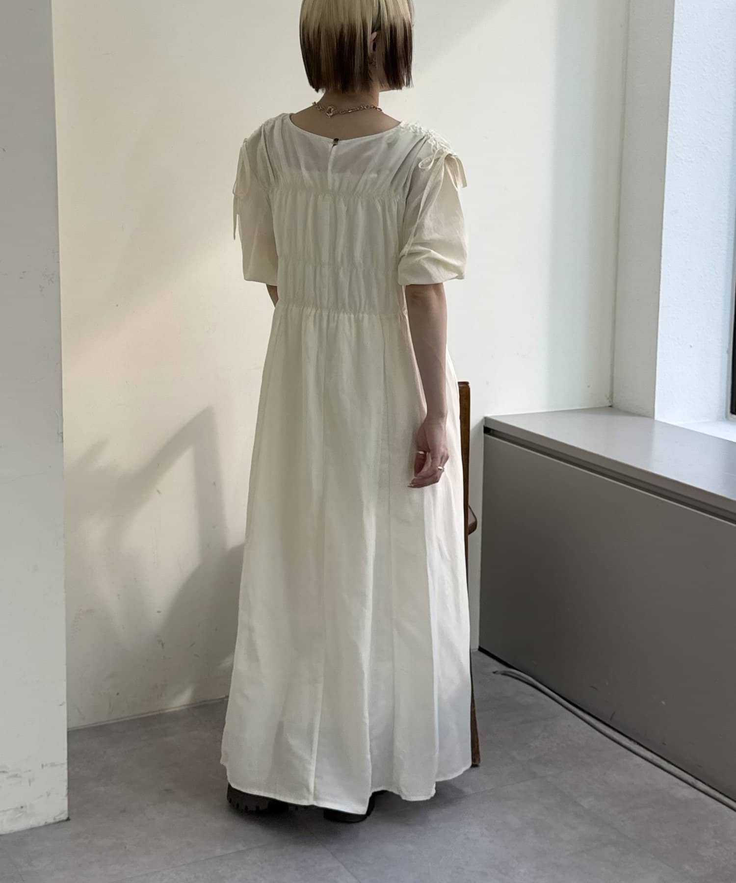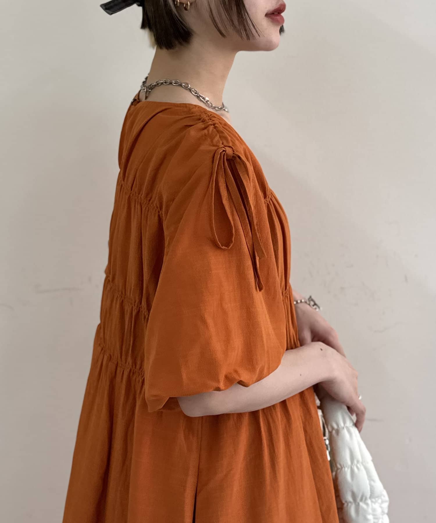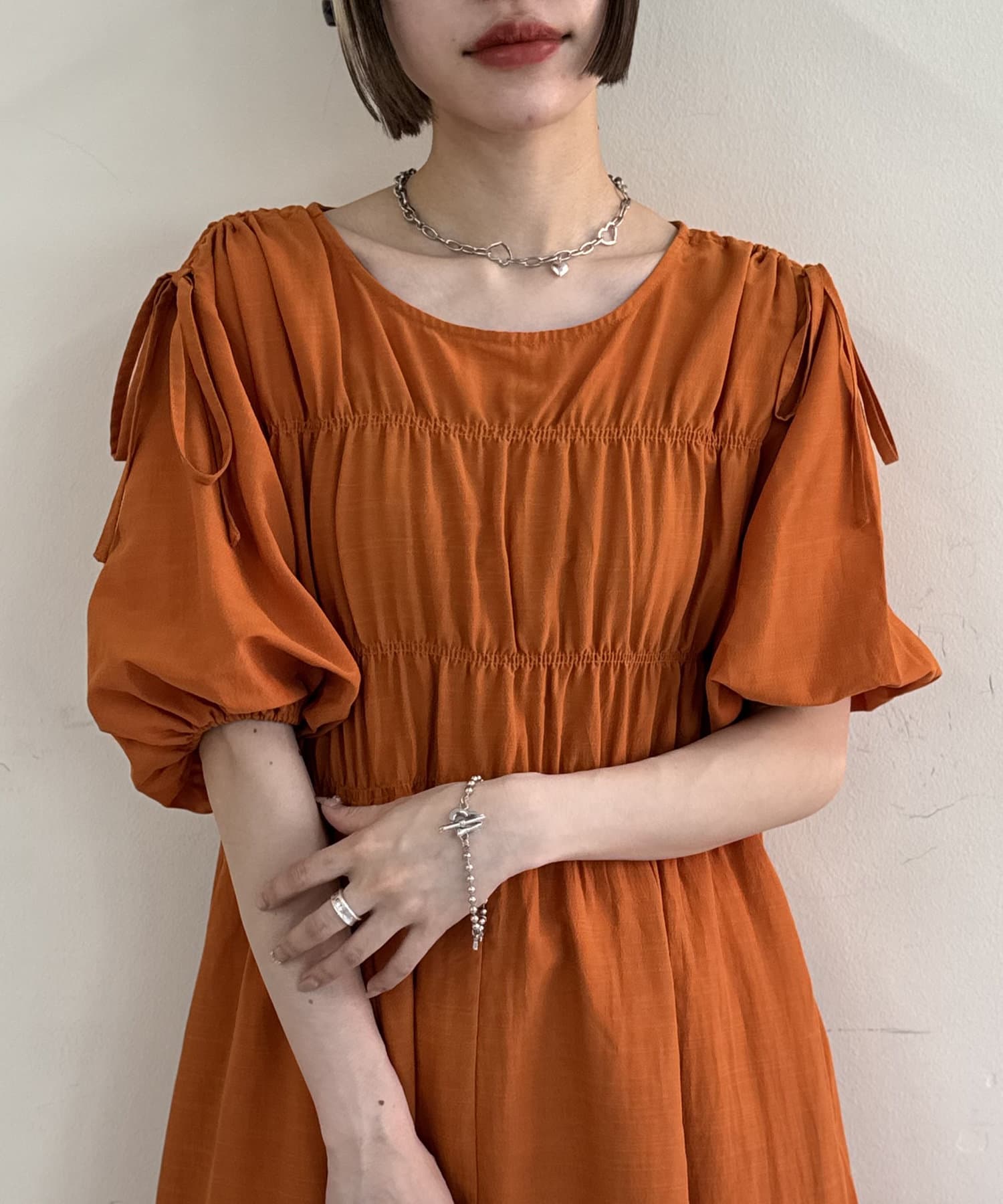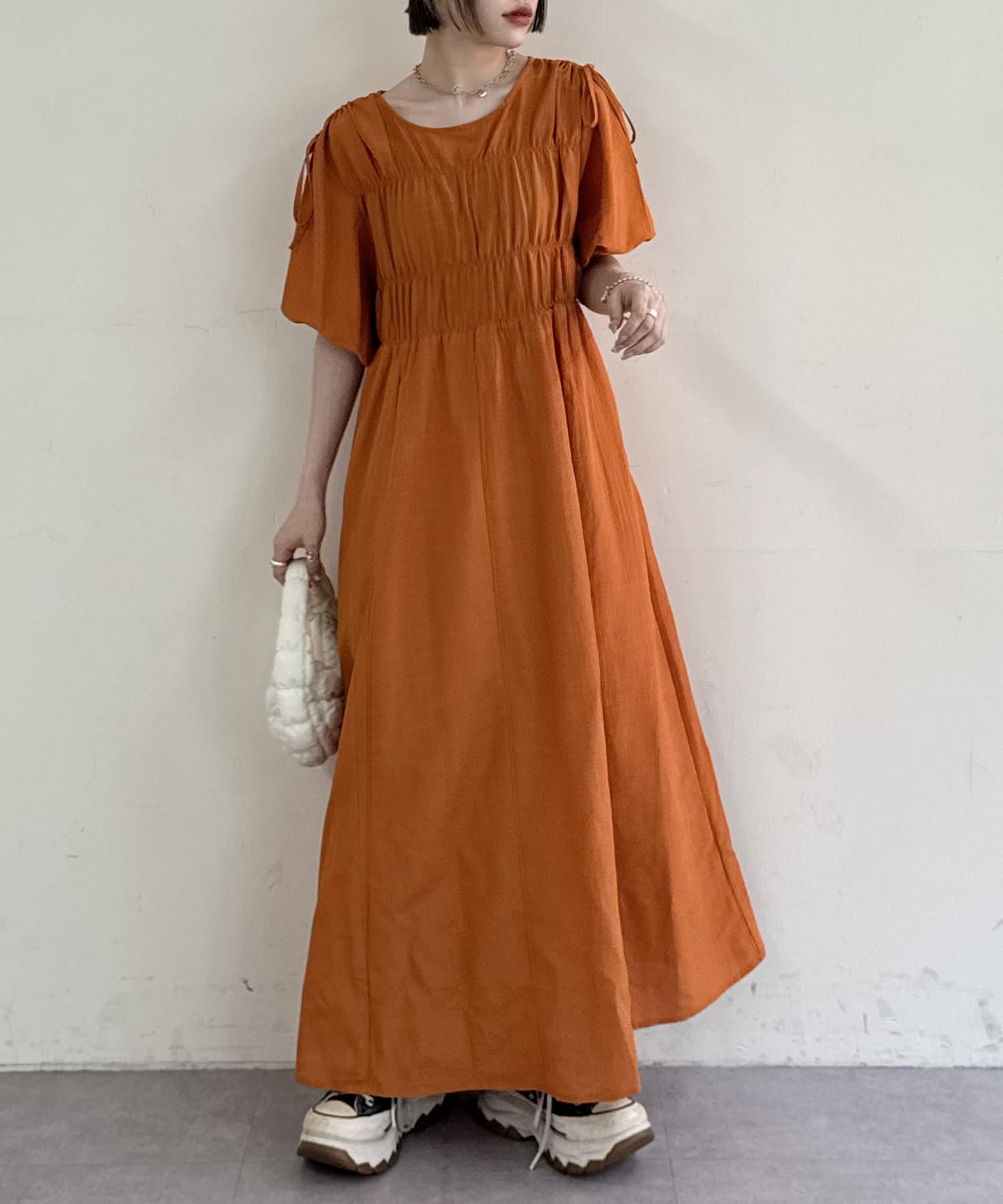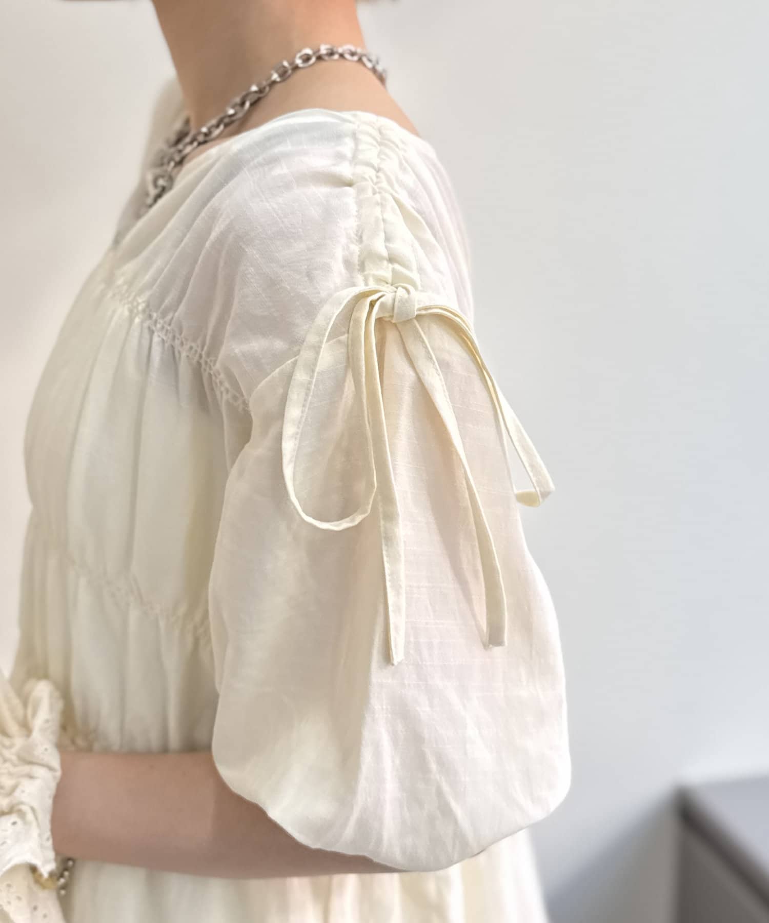 ・胸元のシャーリングと肩リボンで、一枚でも着映え