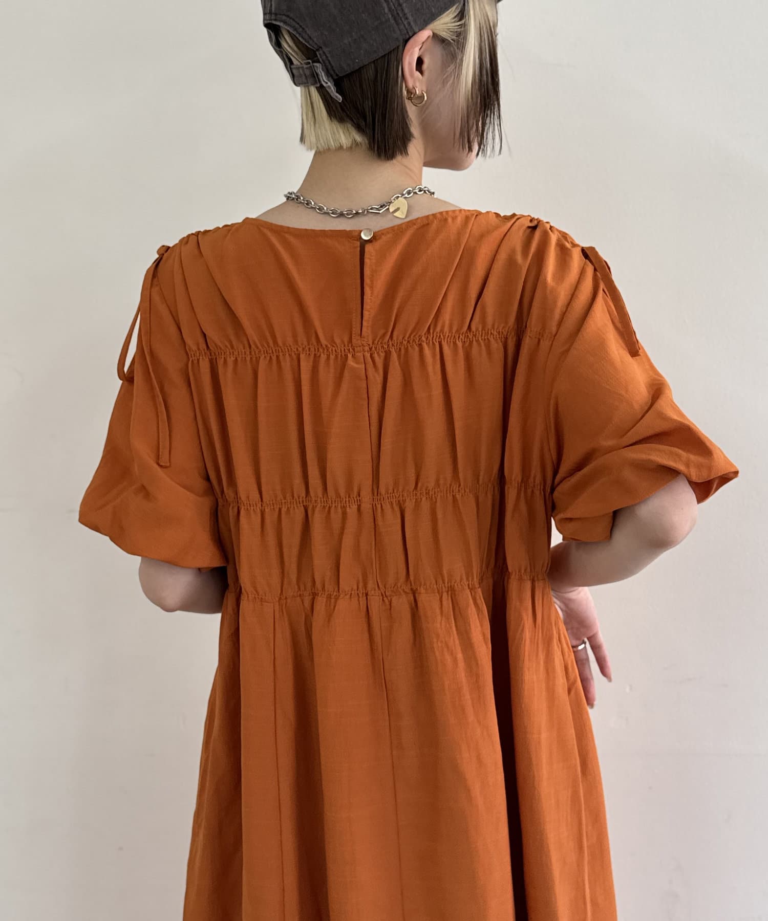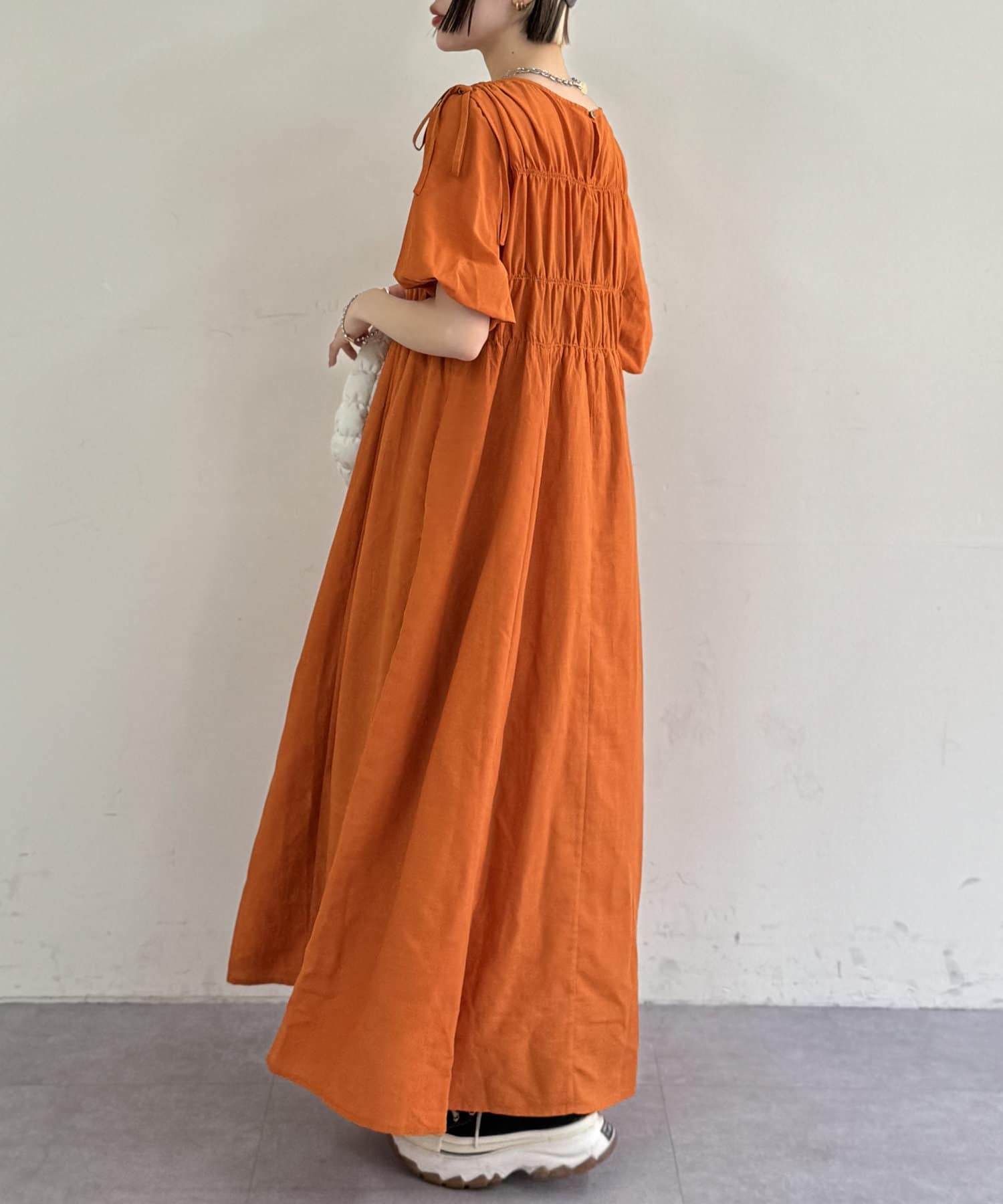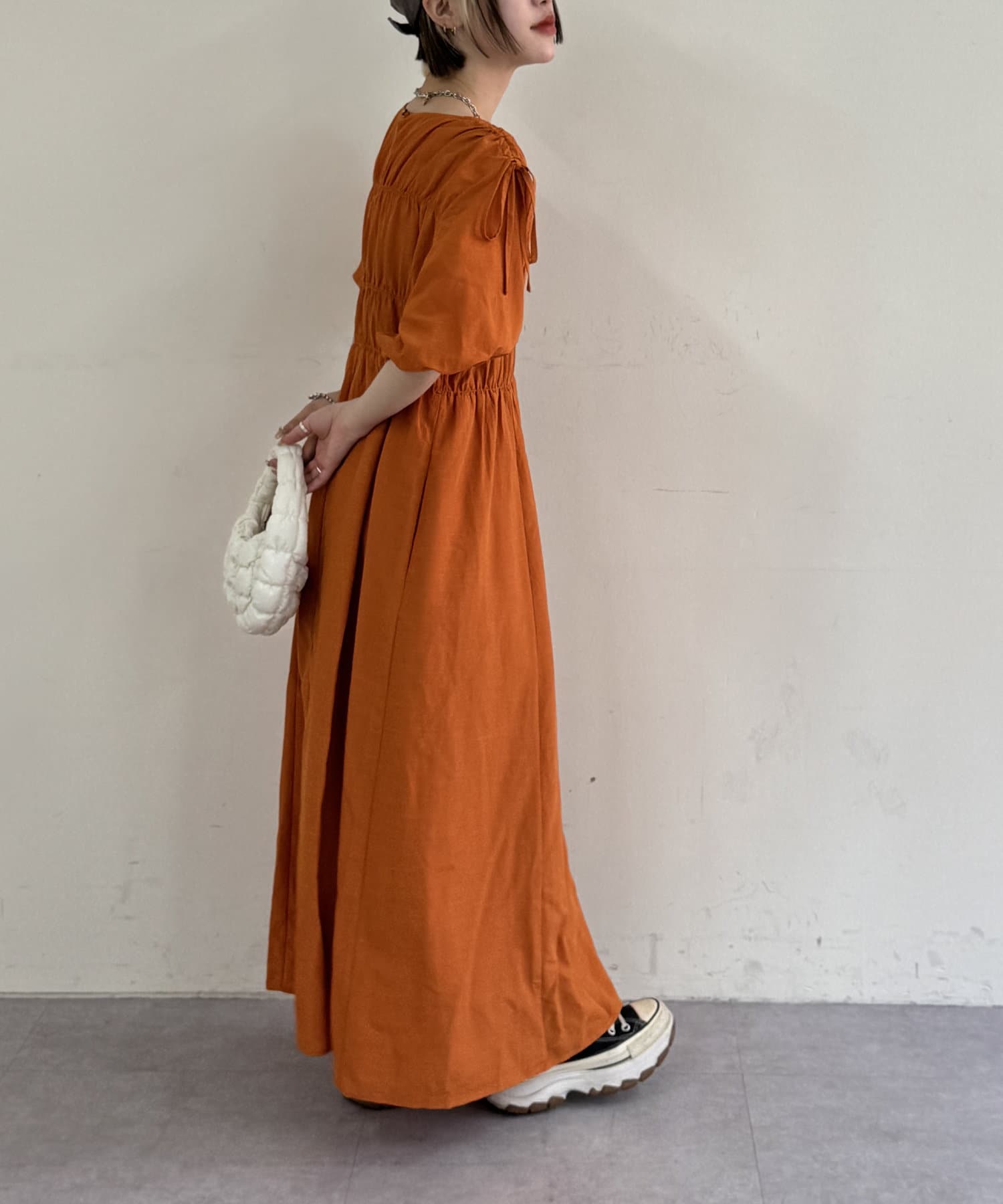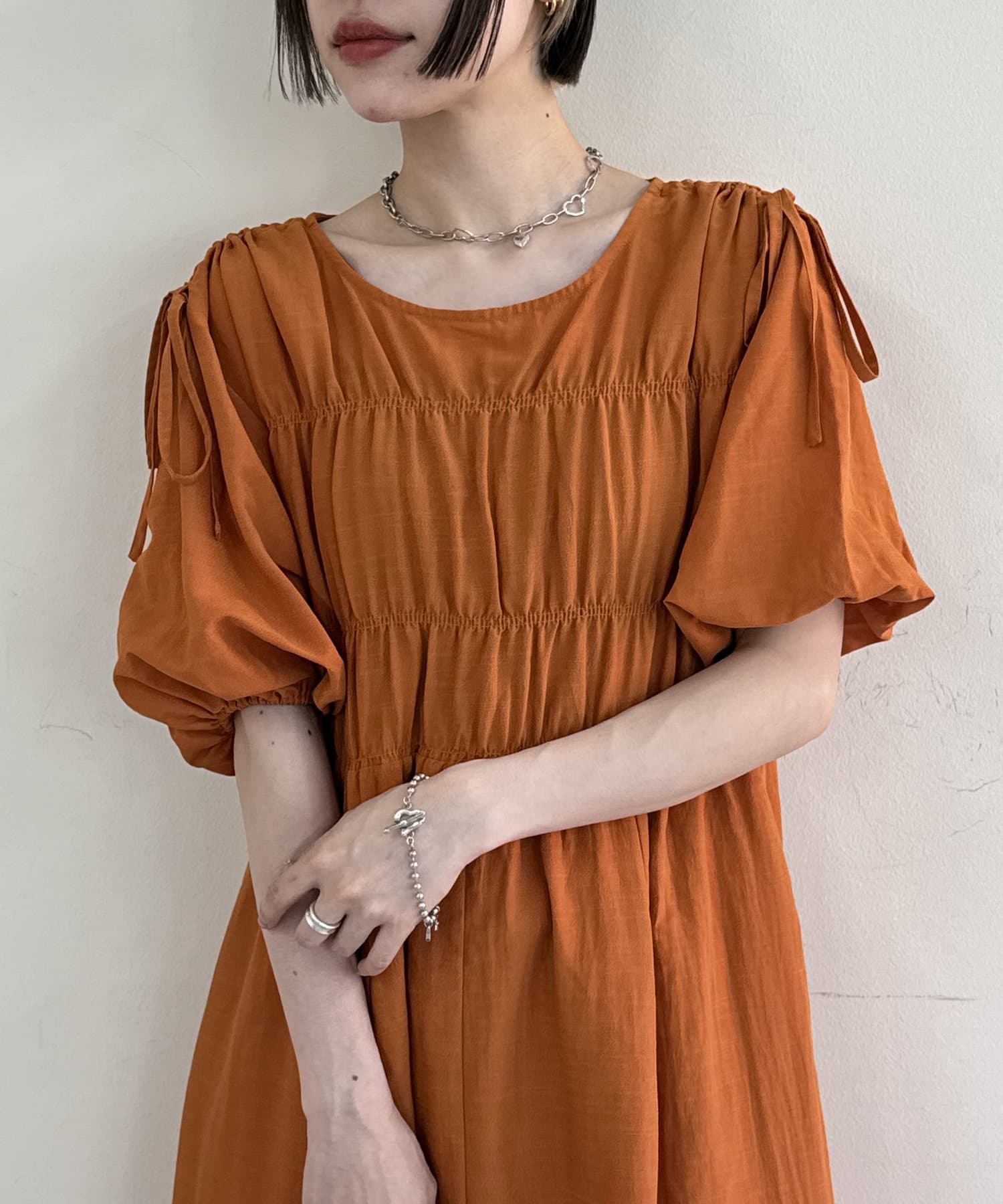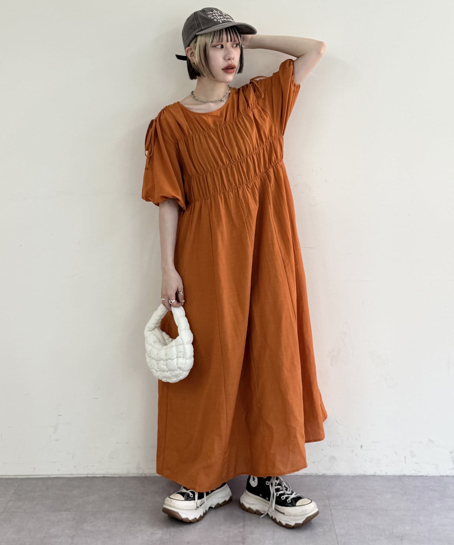 ・胸元のシャーリングと肩リボンで、一枚でも着映え