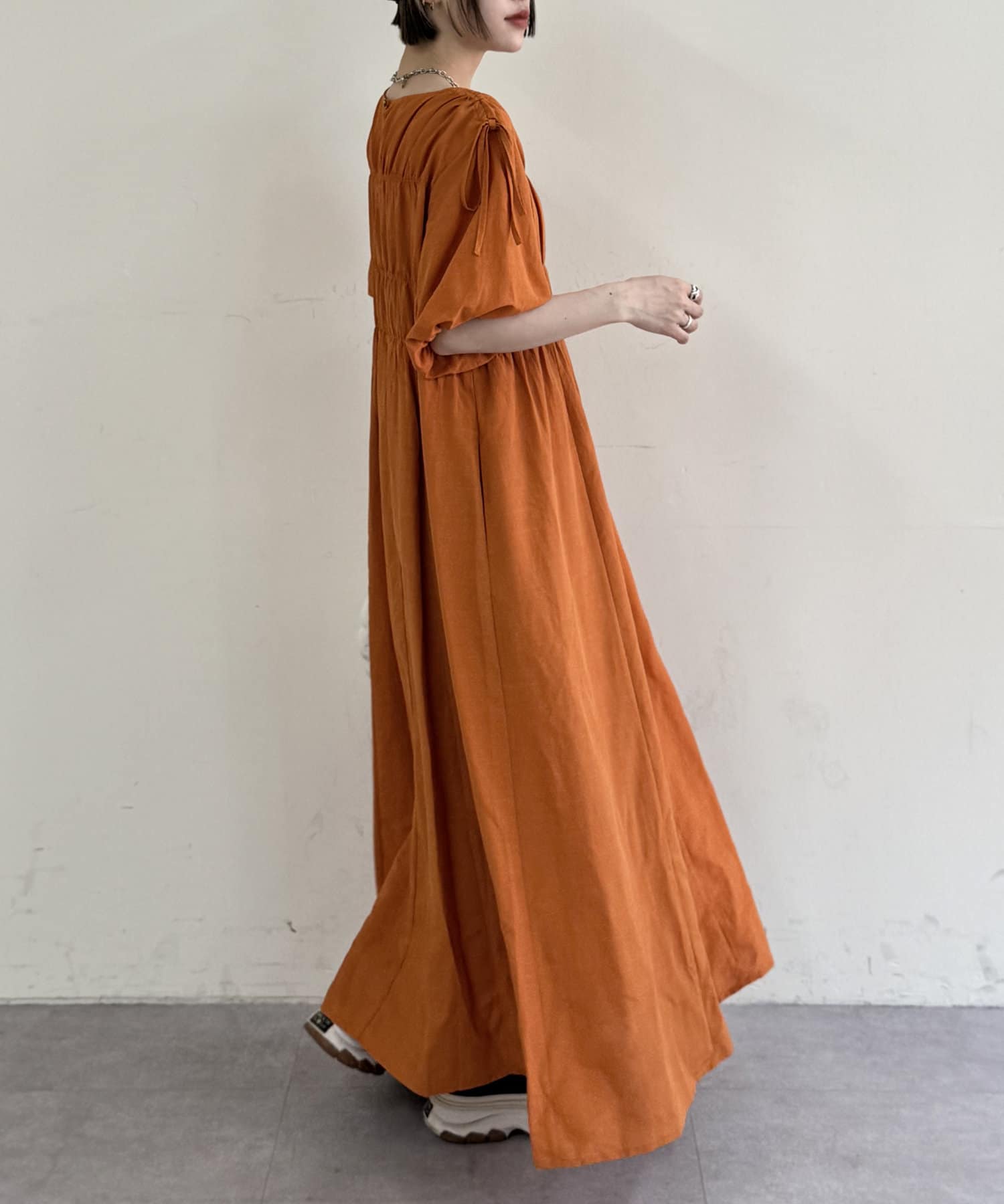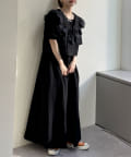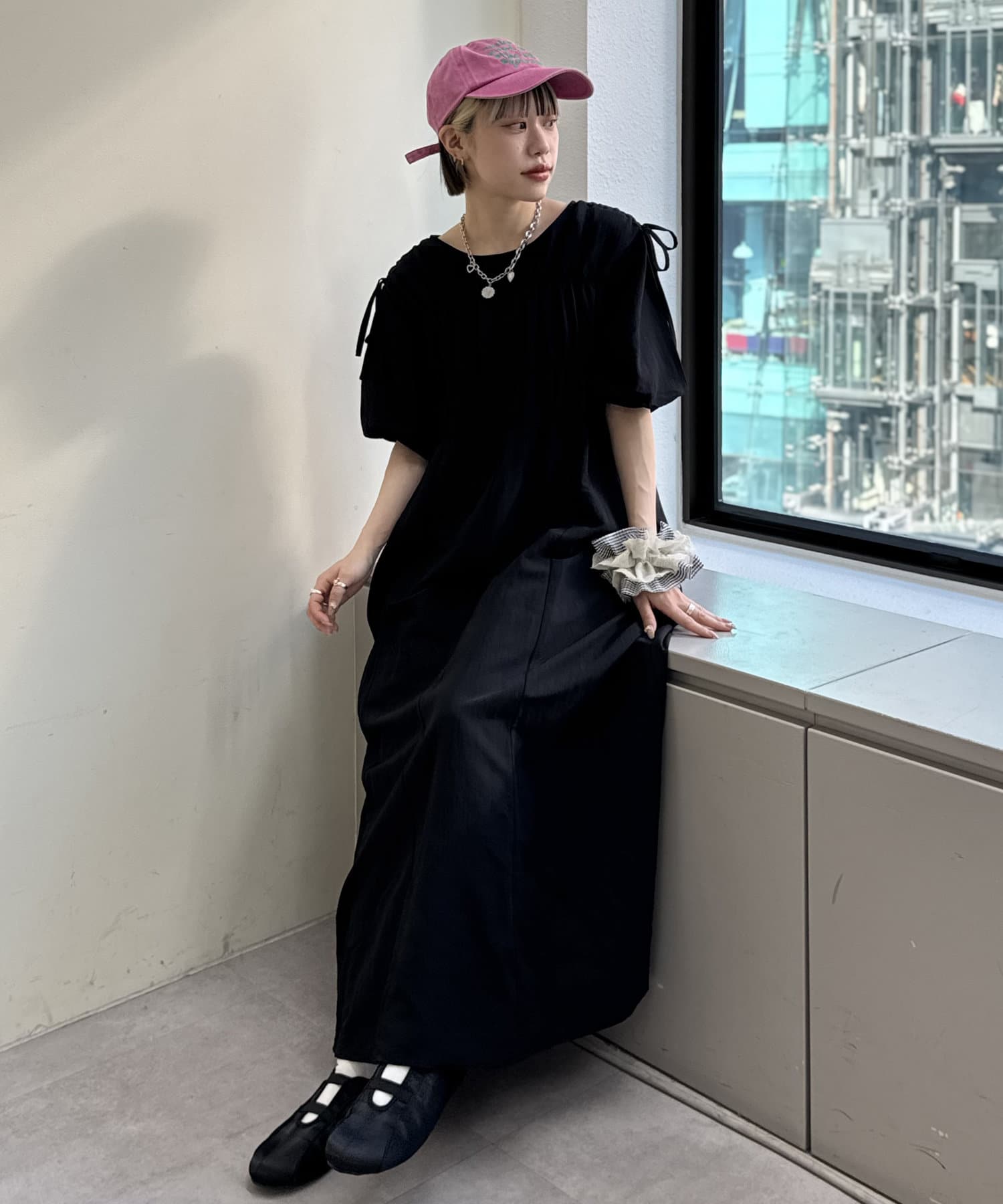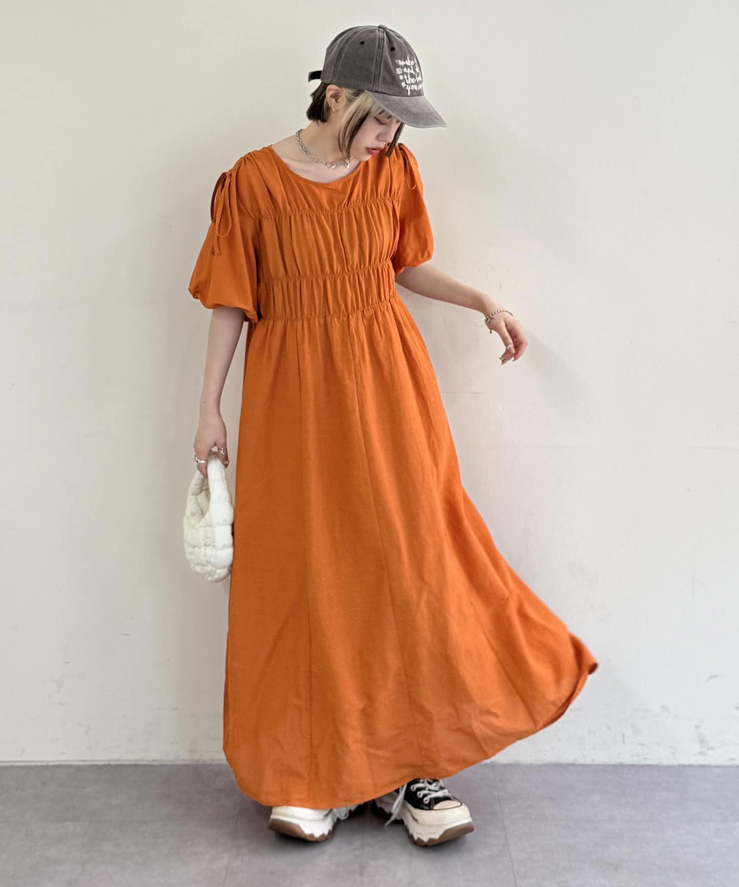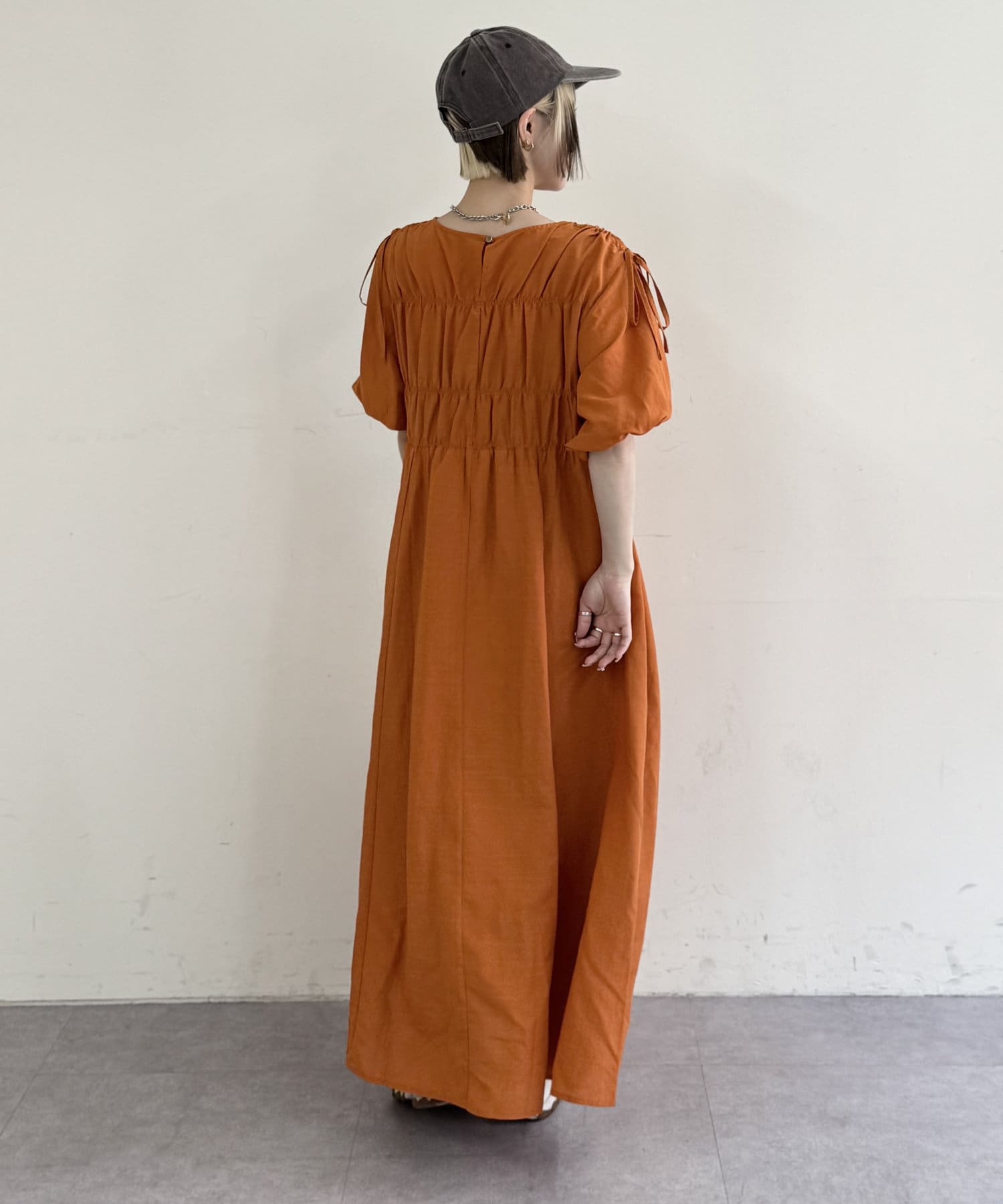 ・胸元のシャーリングと肩リボンで、一枚でも着映え