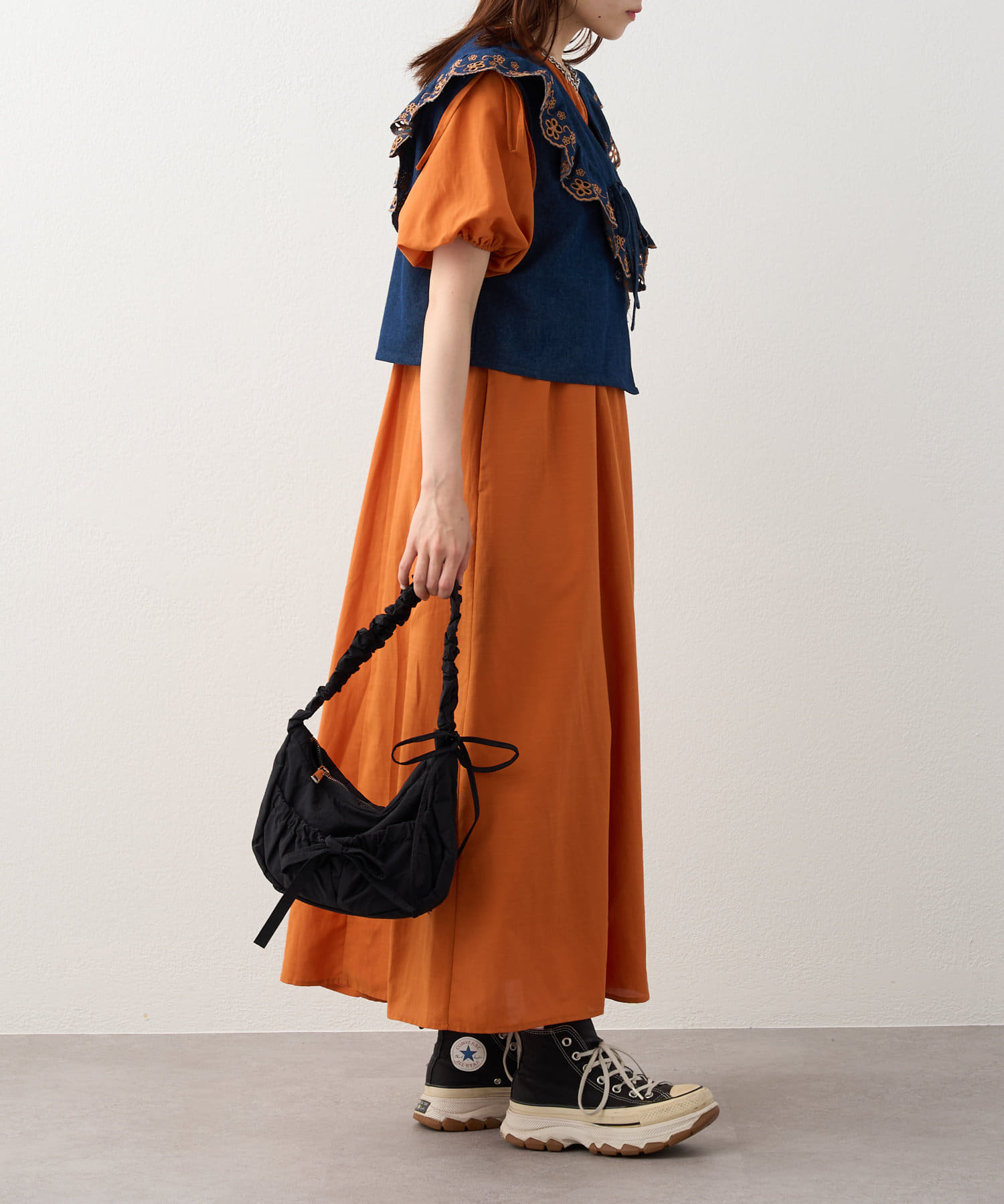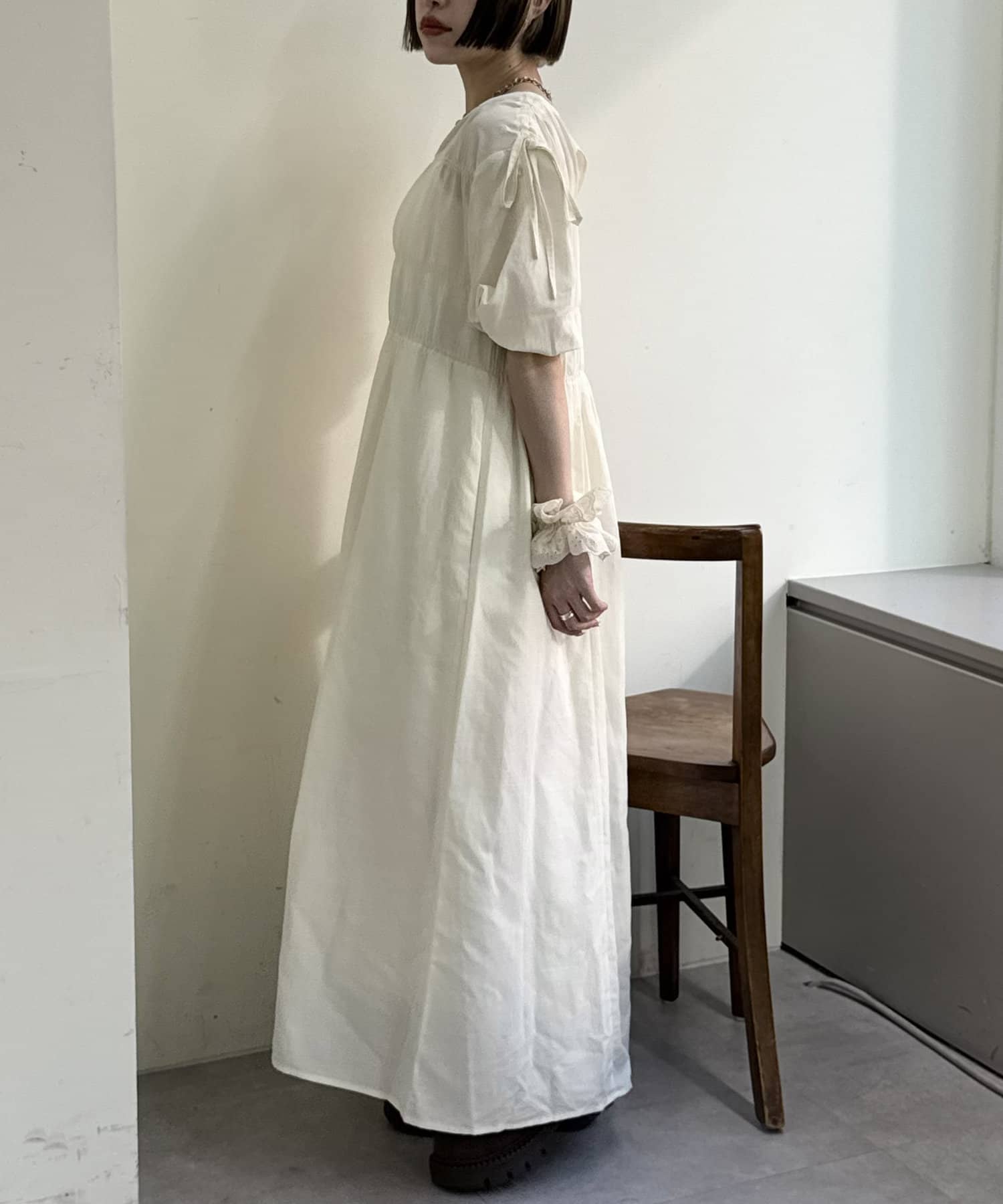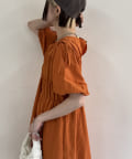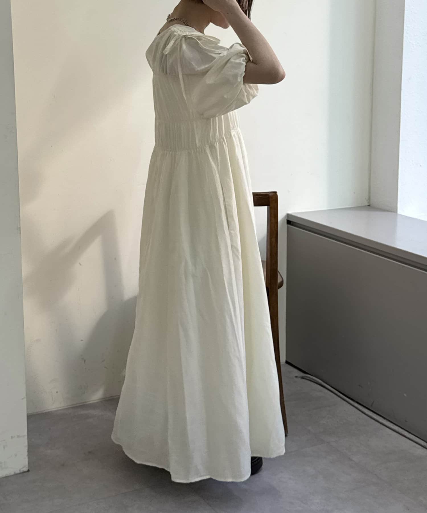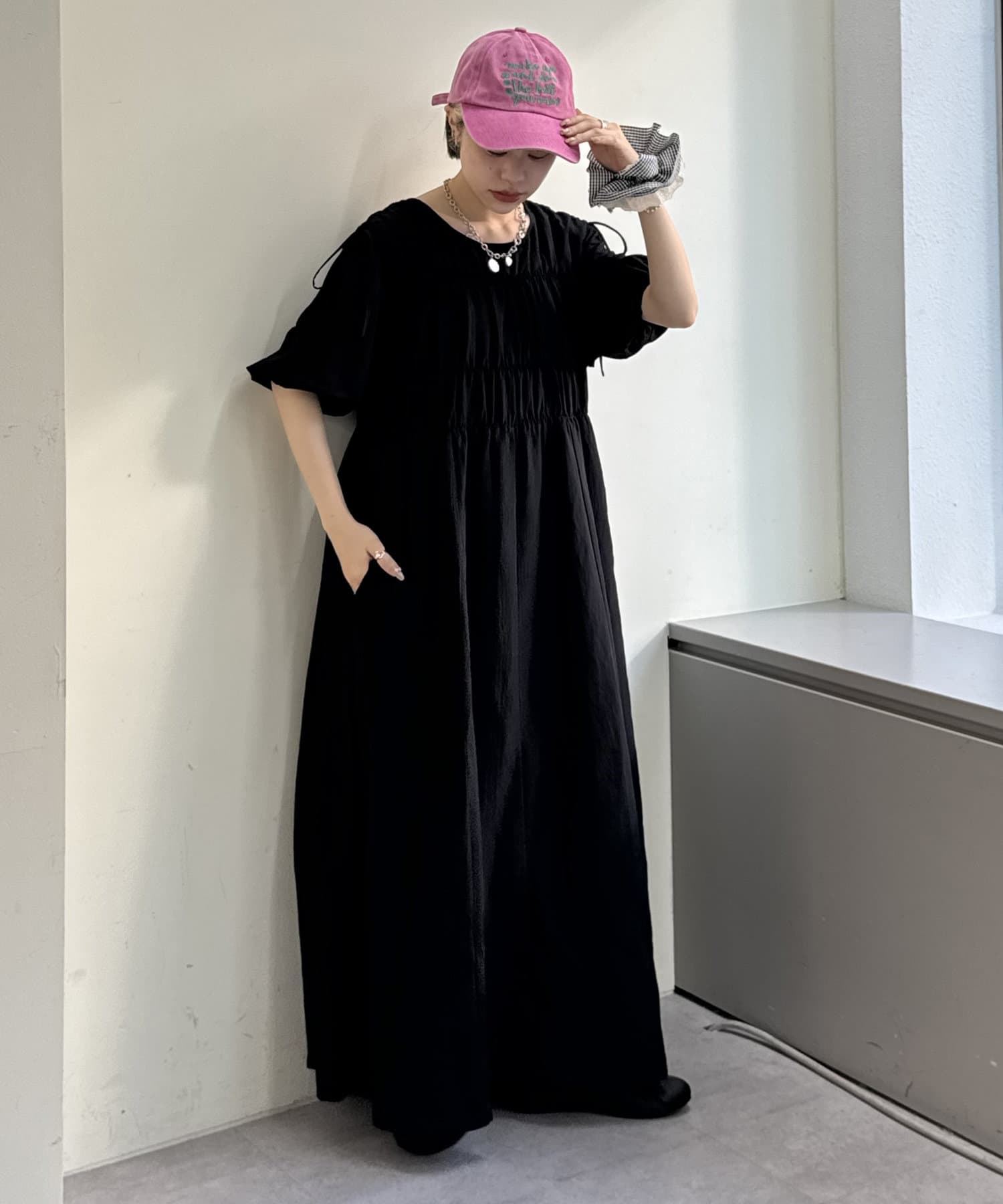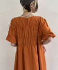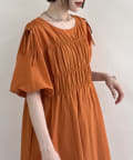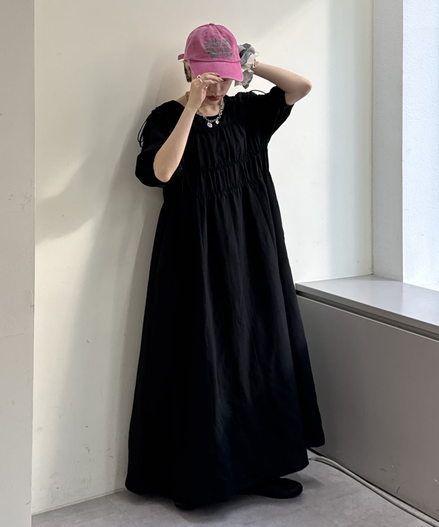 ・胸元のシャーリングと肩リボンで、一枚でも着映え
