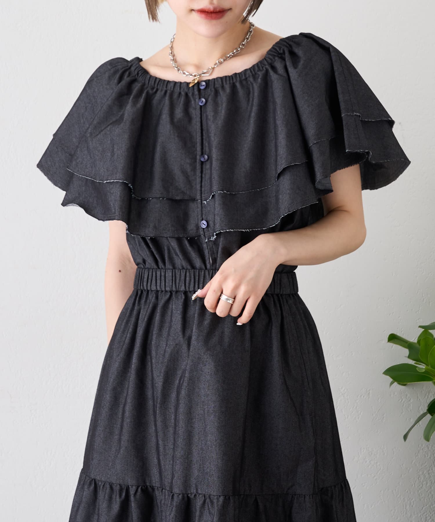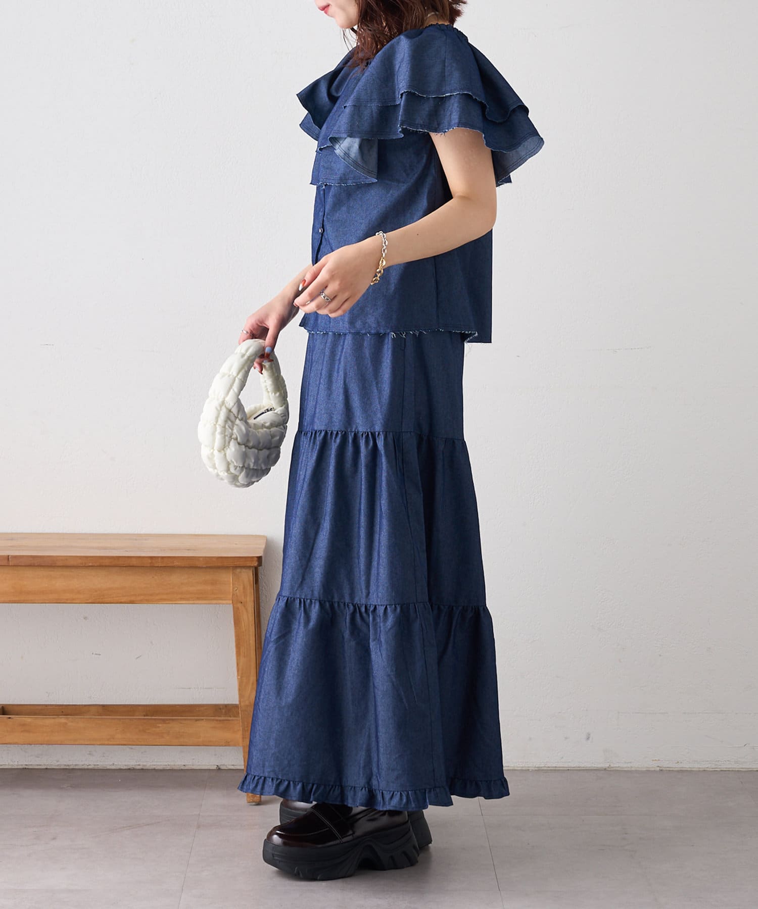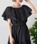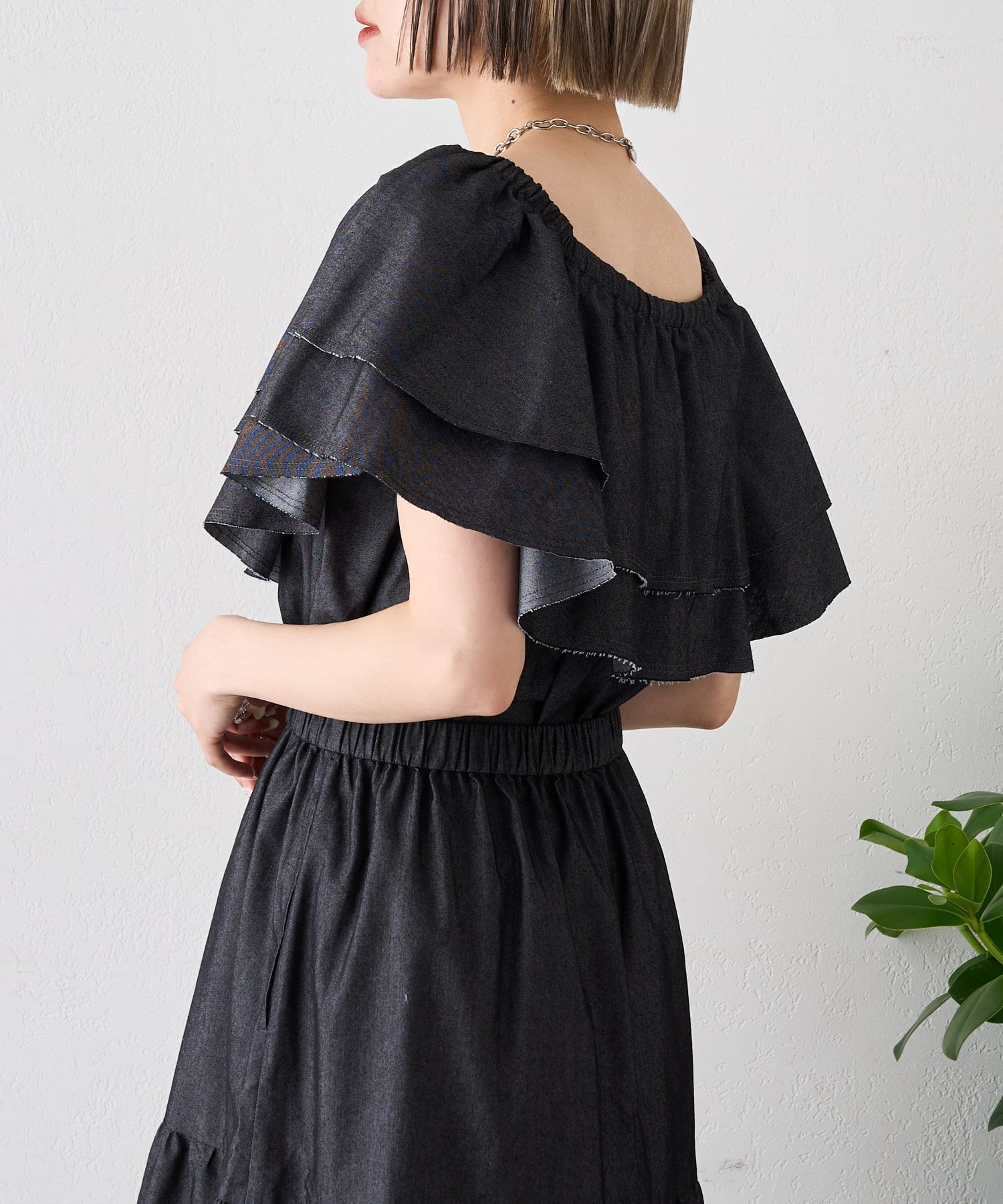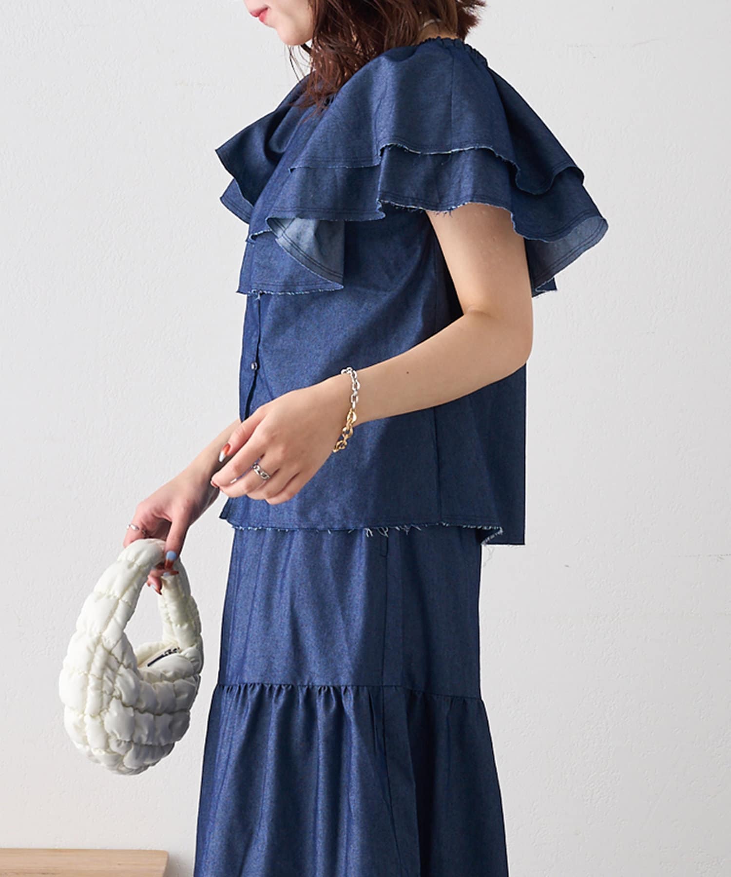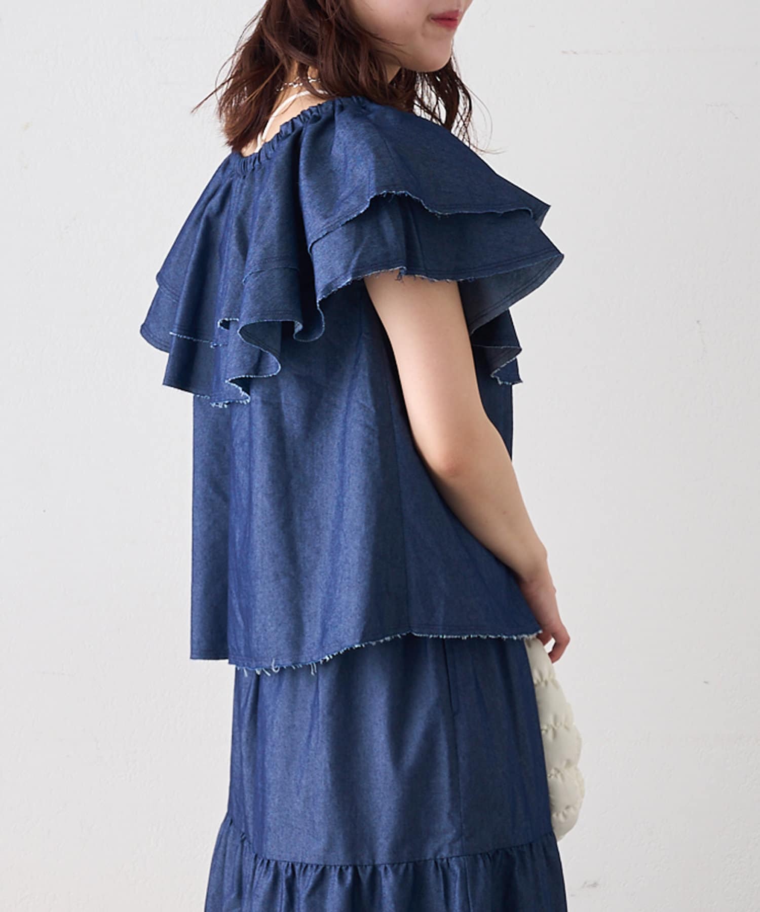 ・トップスのフリルデザインは二の腕をカバーできて細見え効果も◎