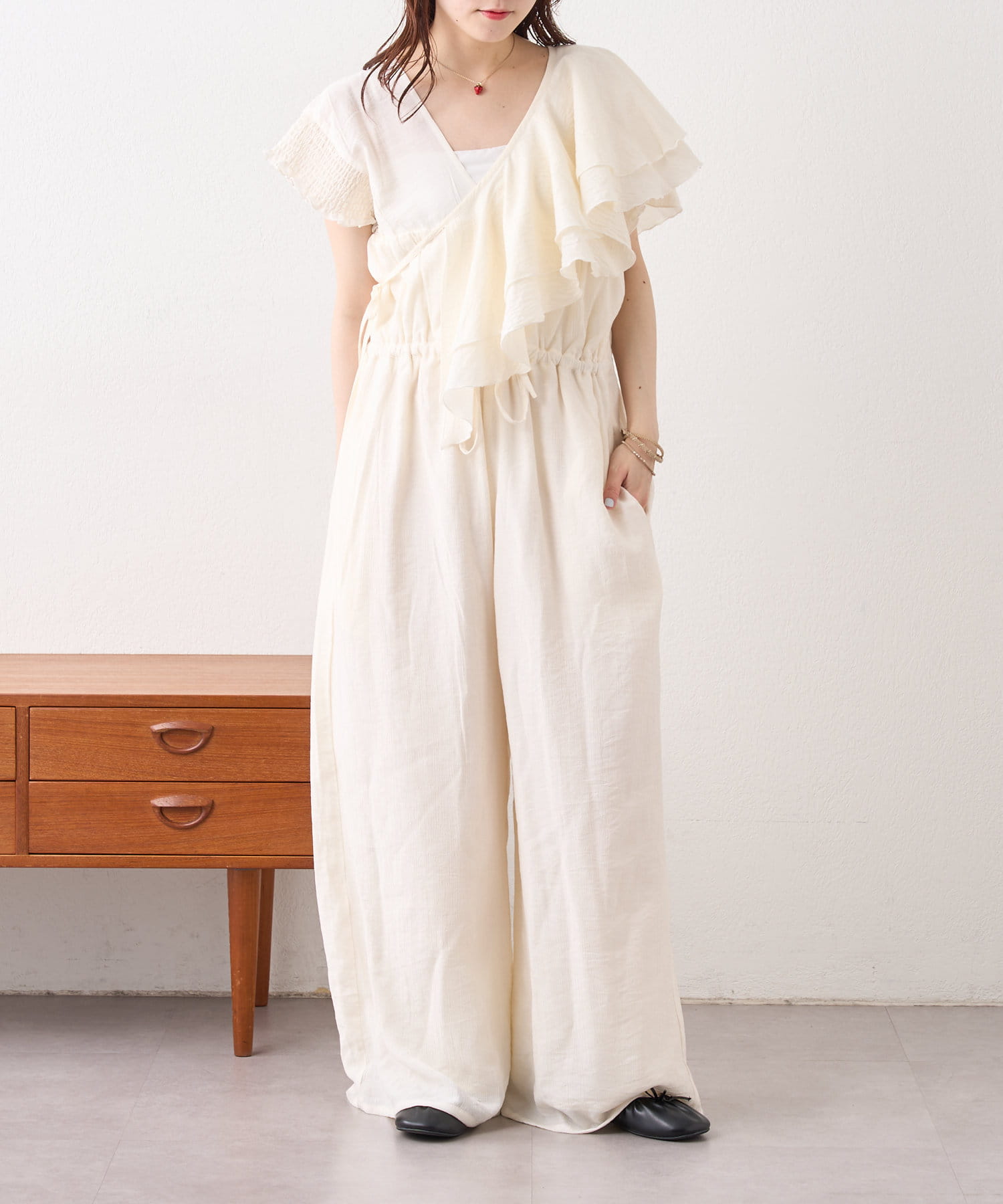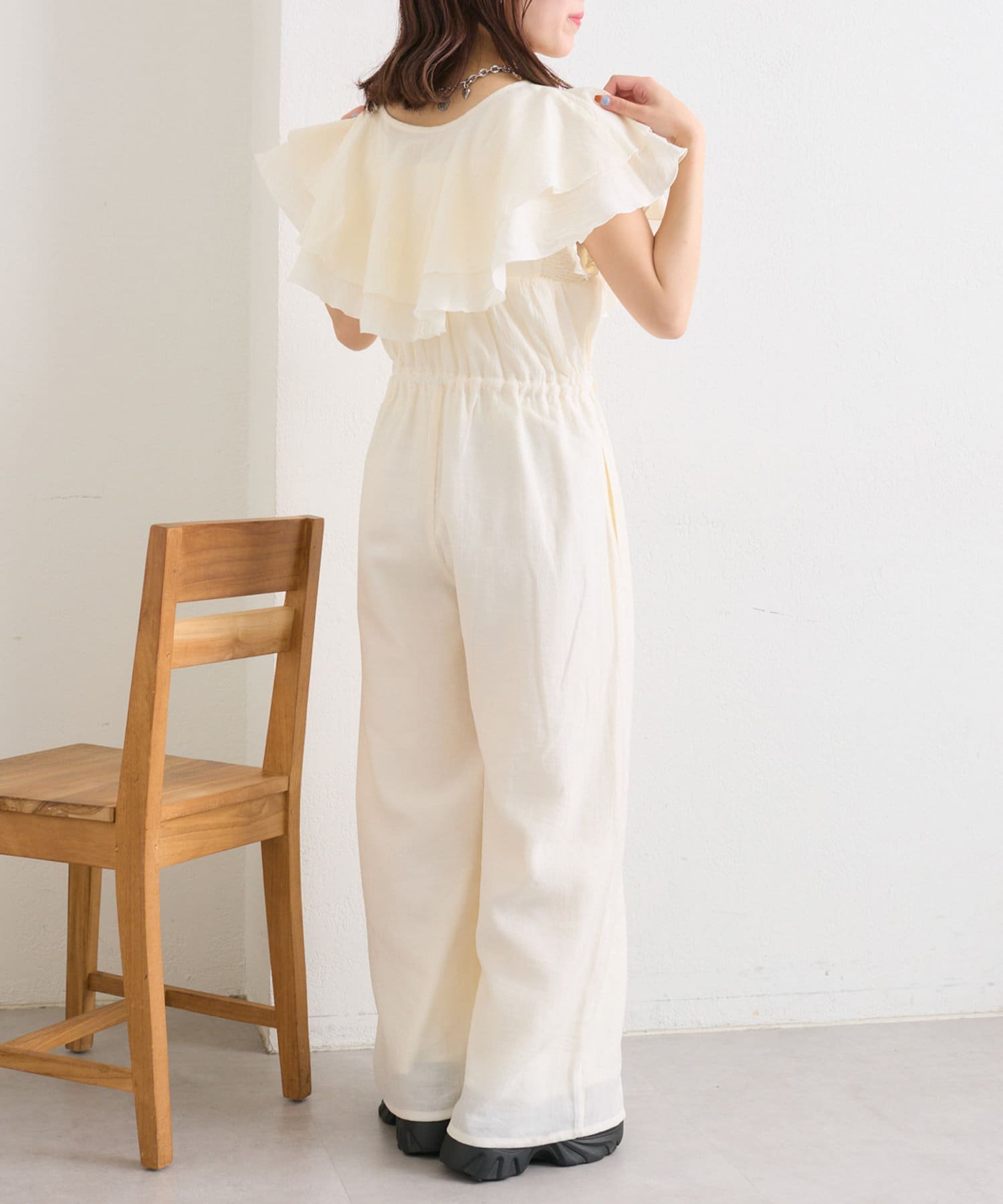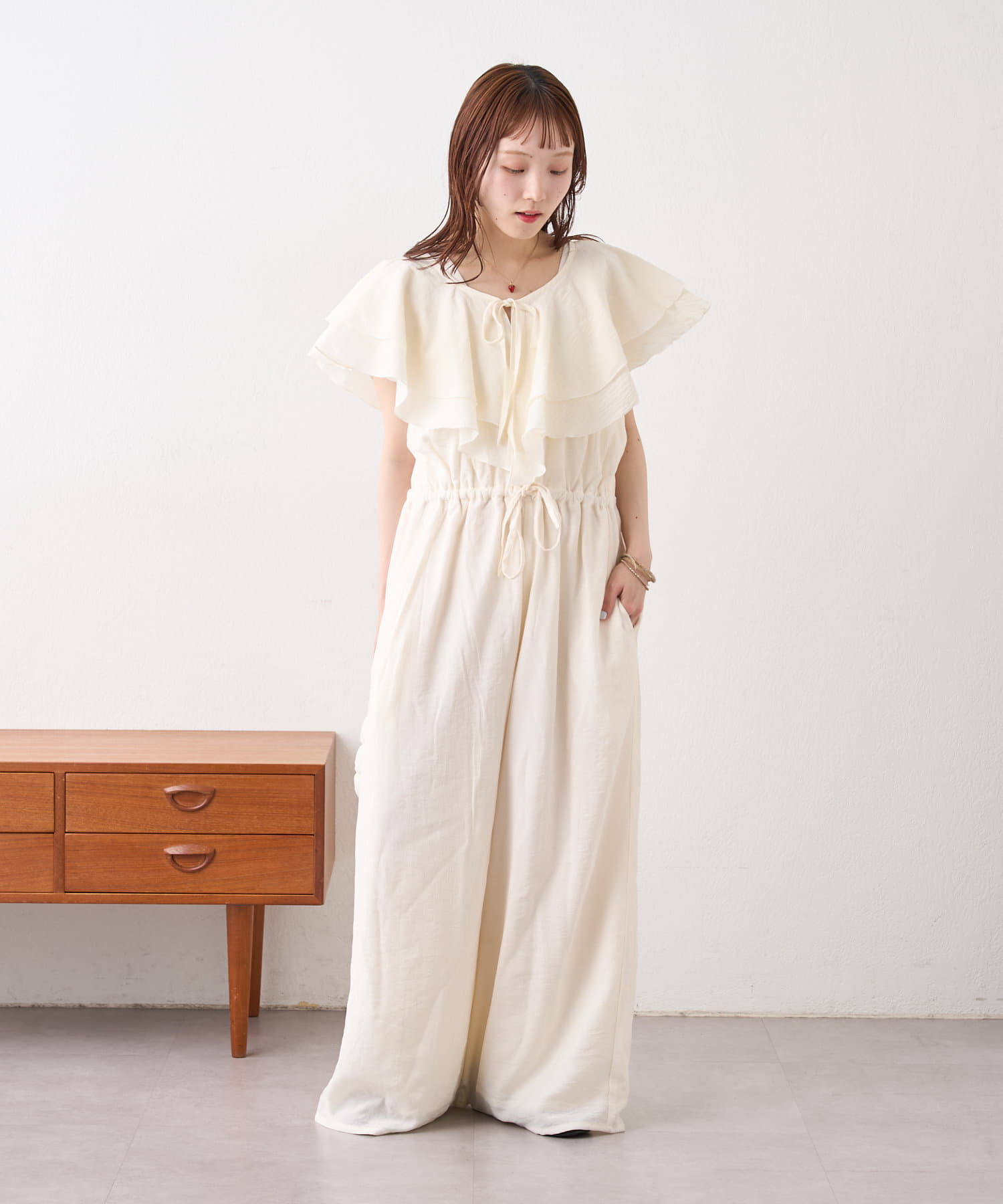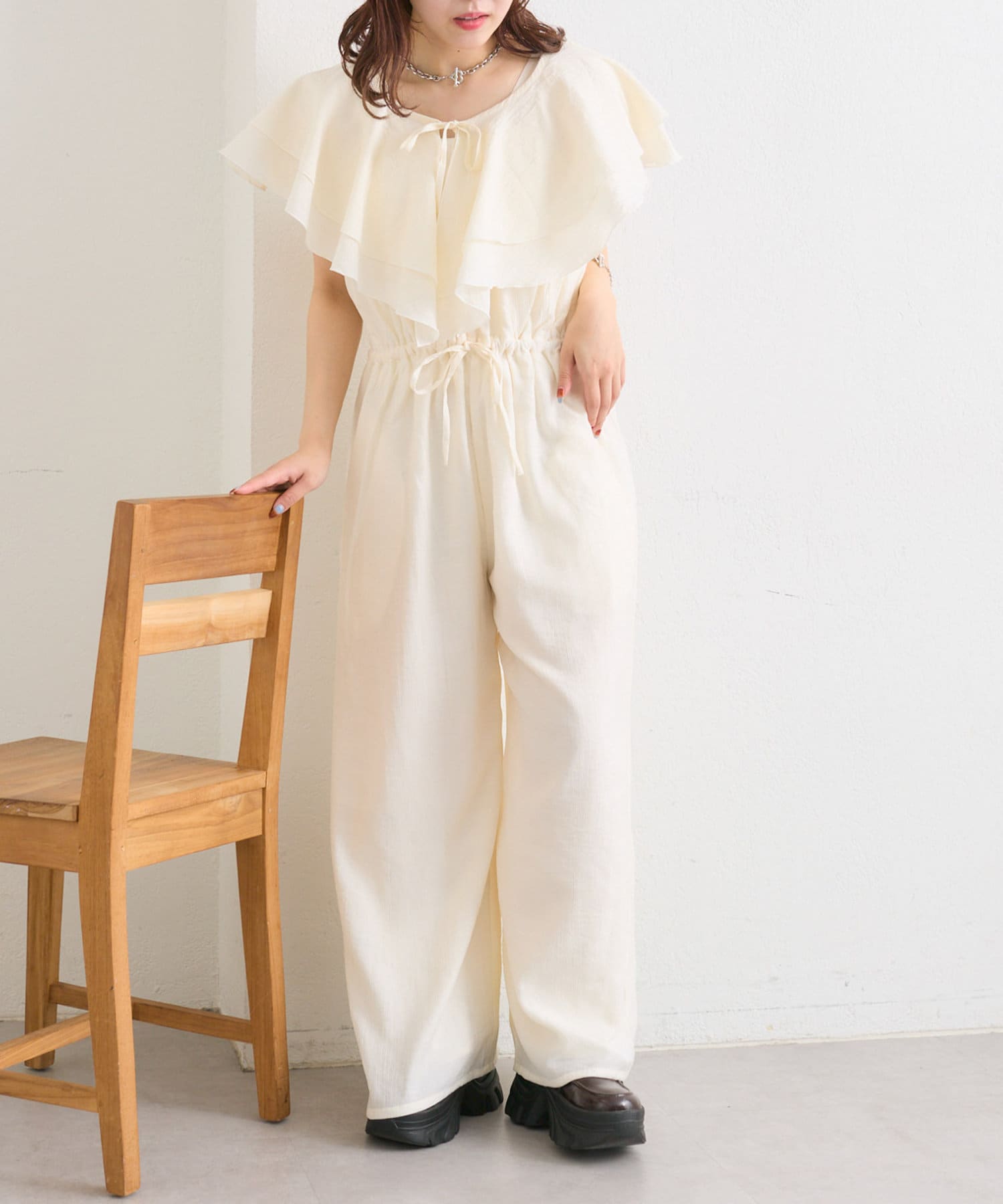 フリル襟が目を惹くオールインワン