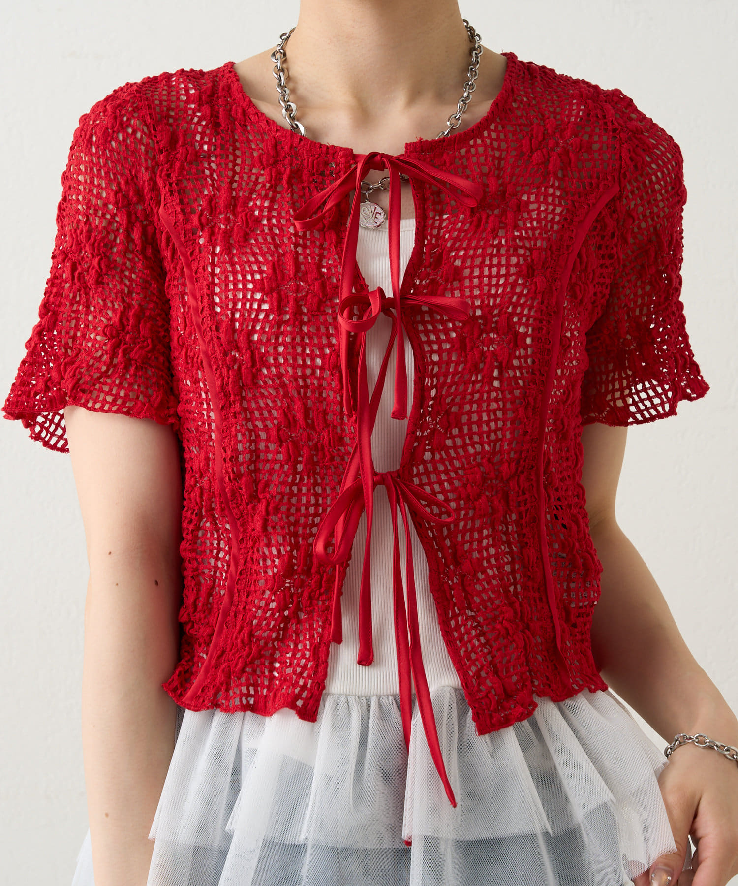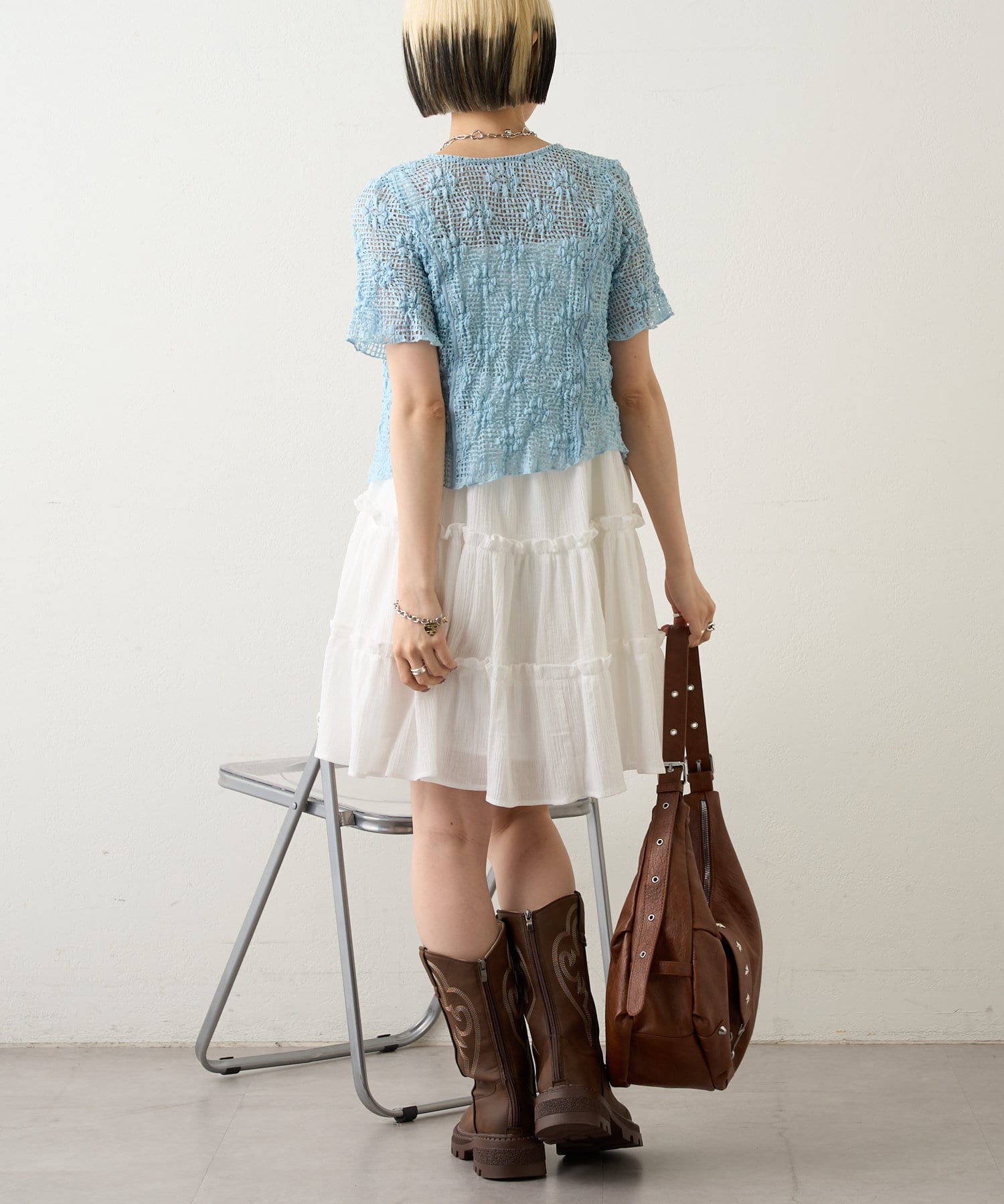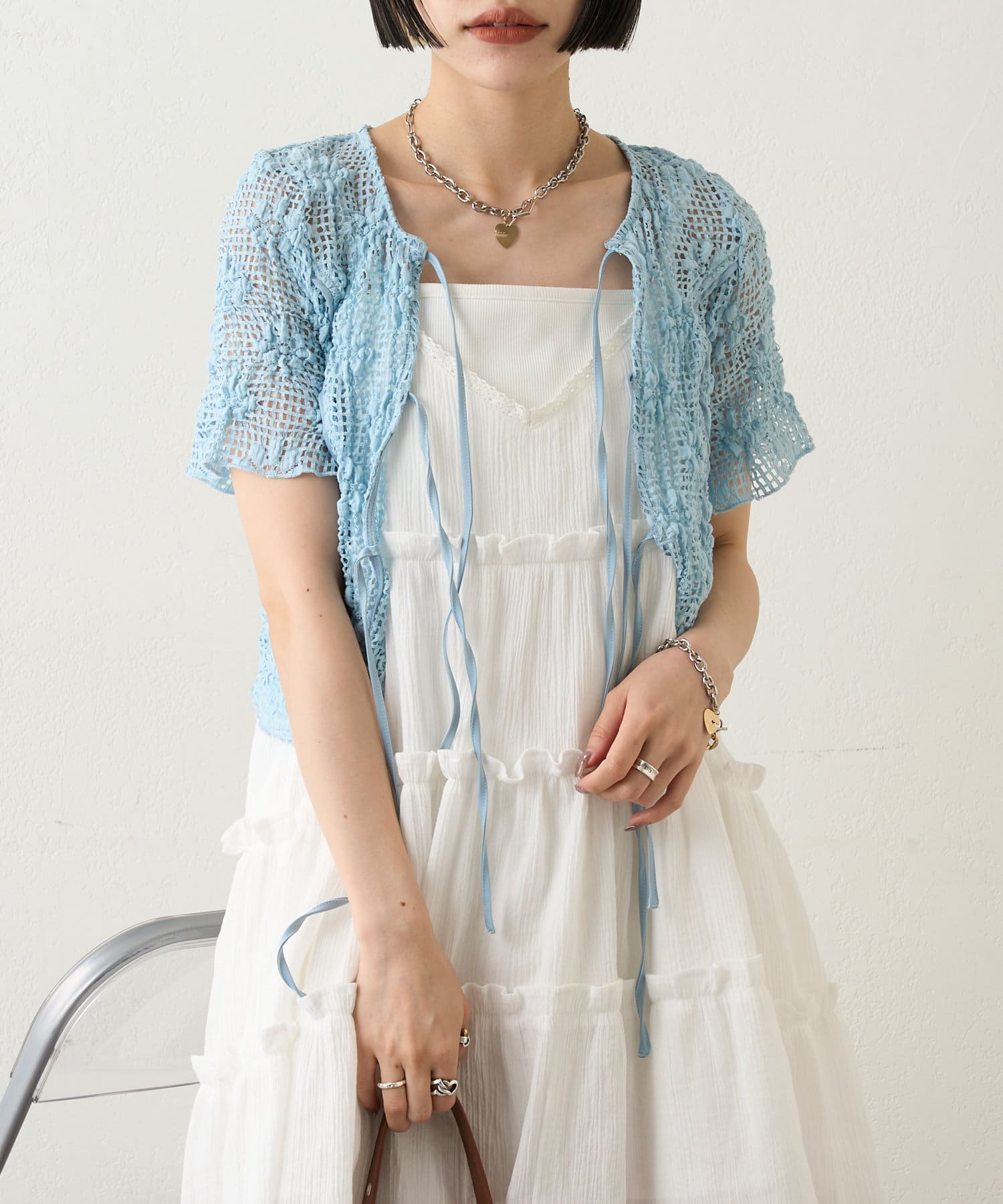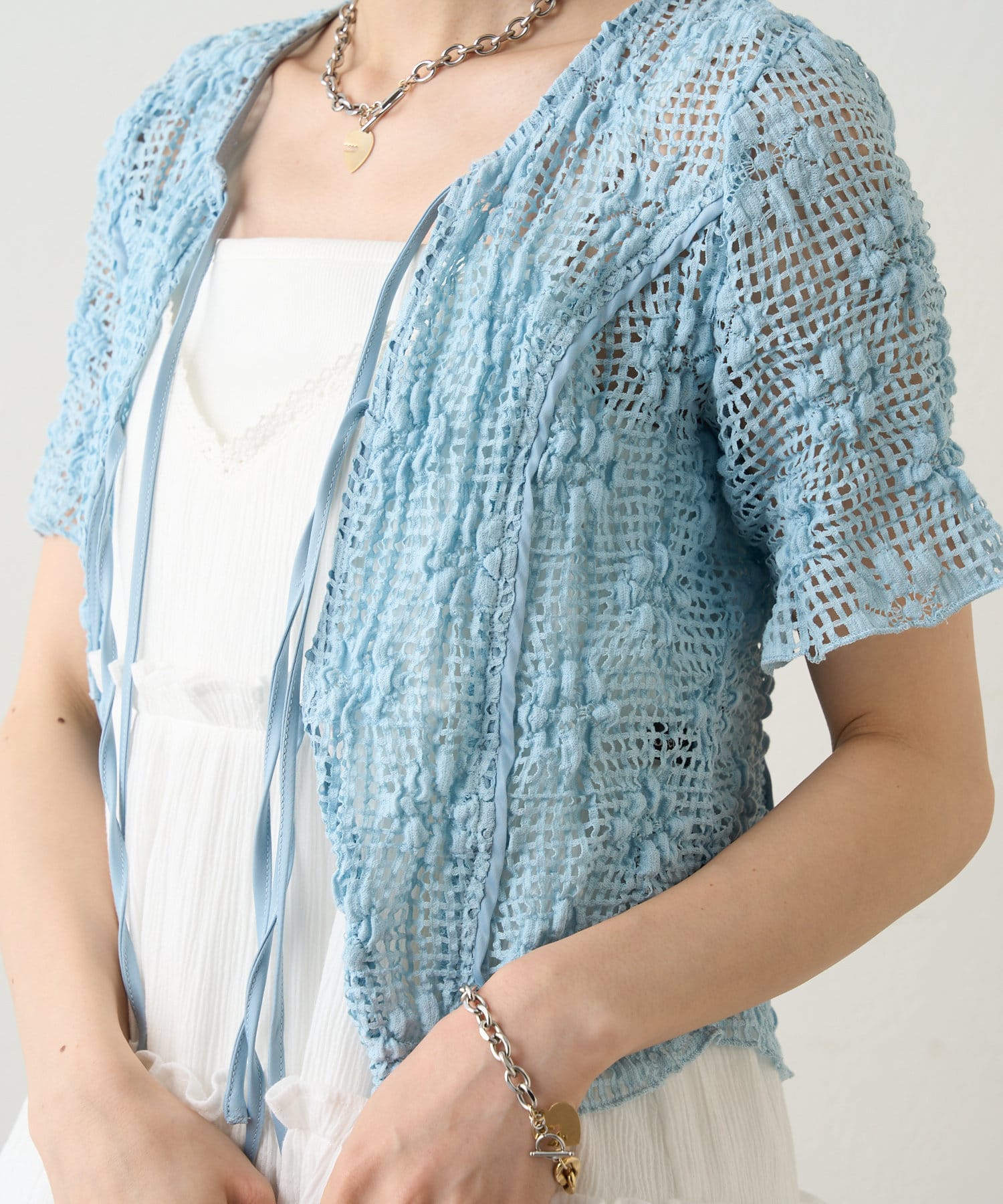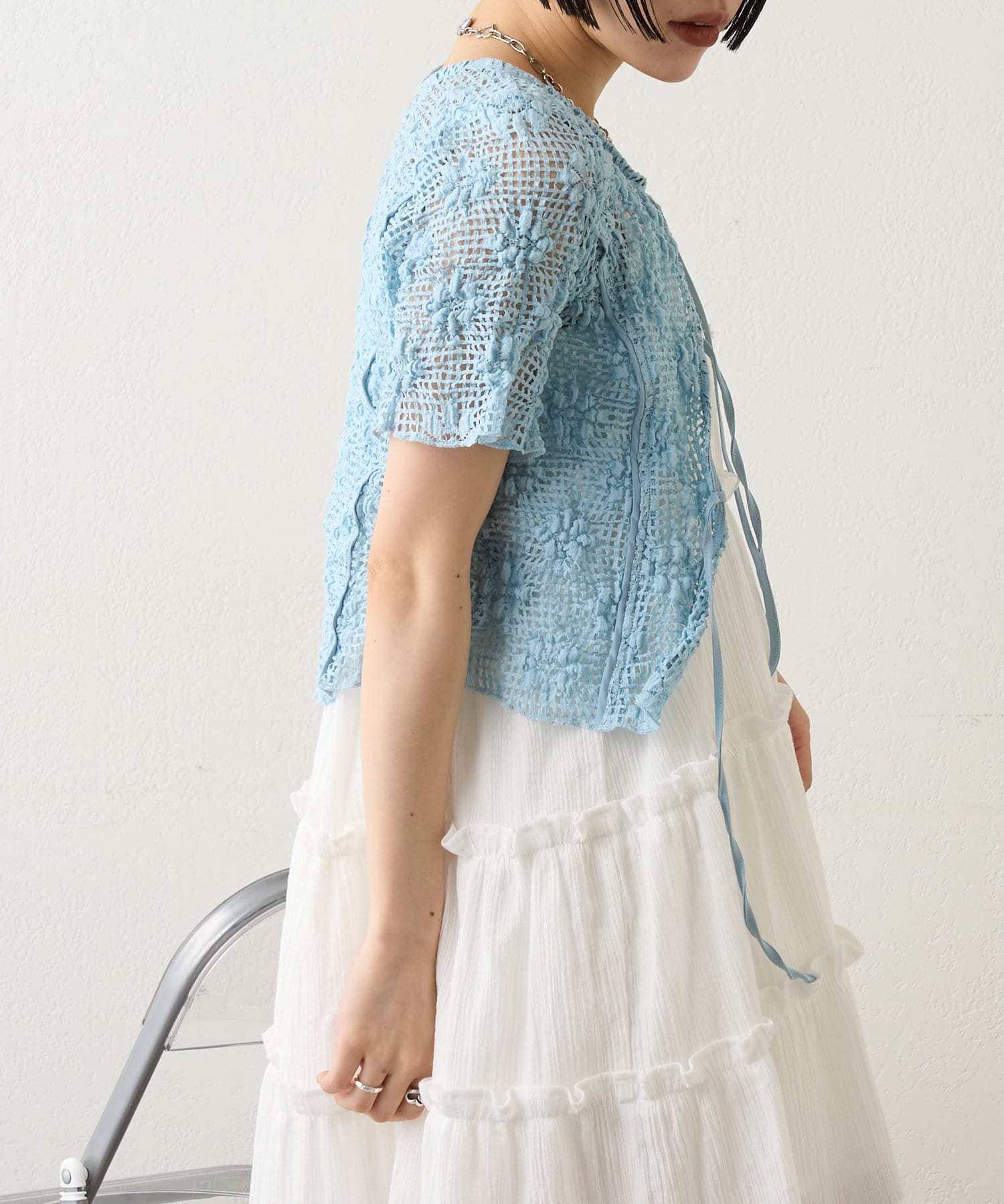 ・透かし編みに、ぽこぽことしたお花がポイントのカーディガン