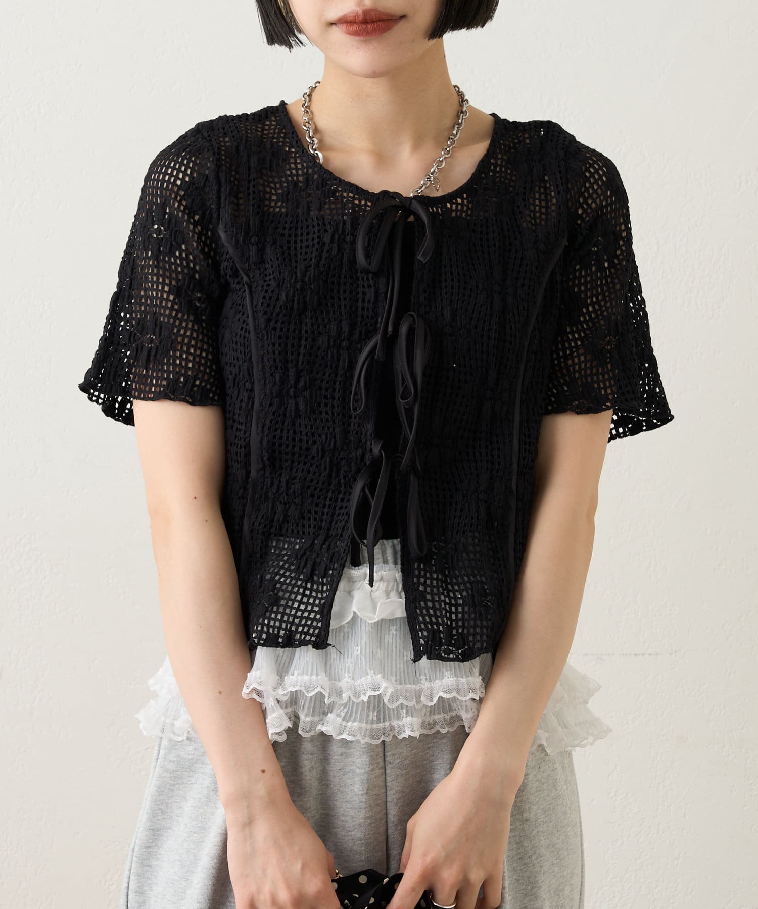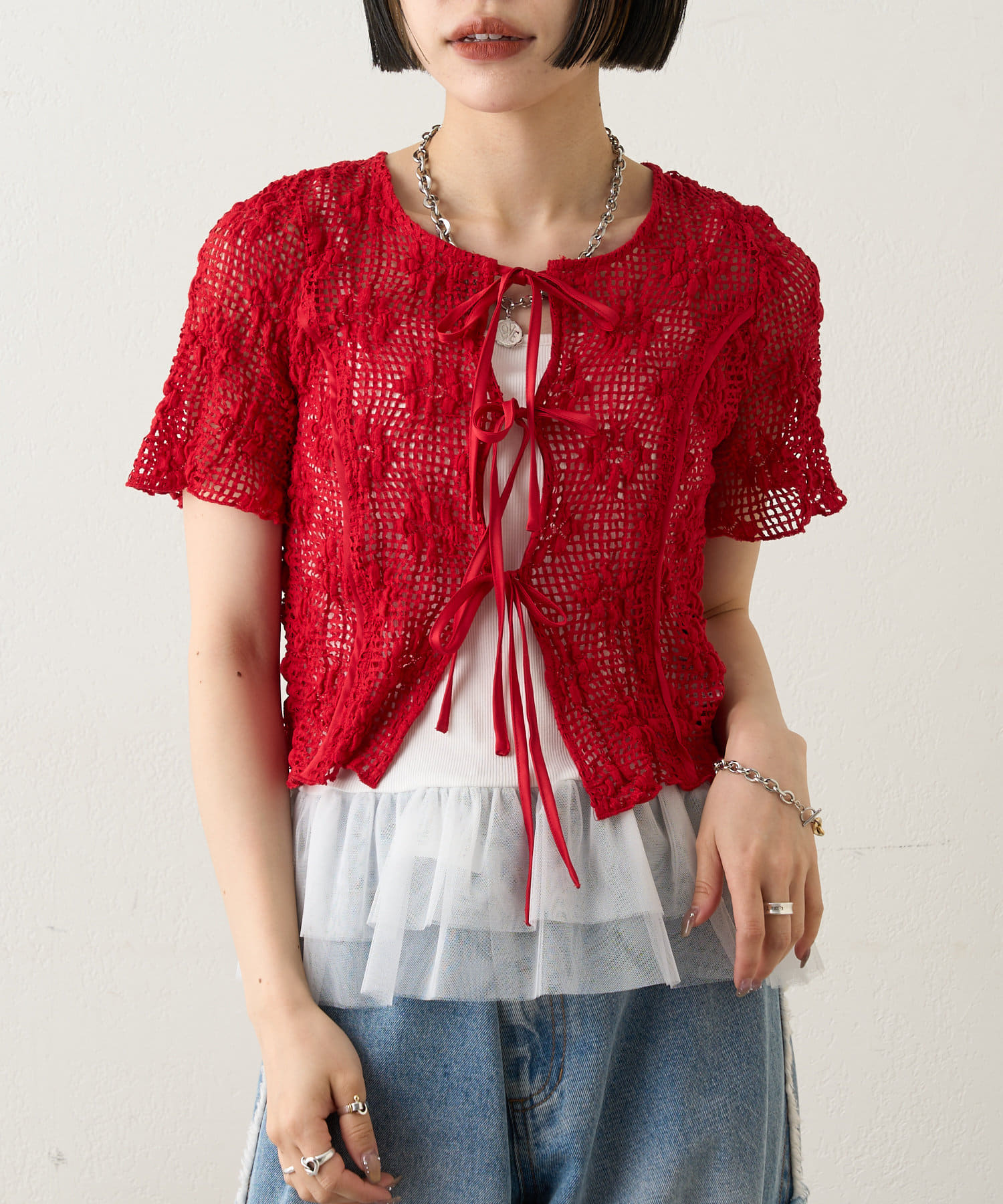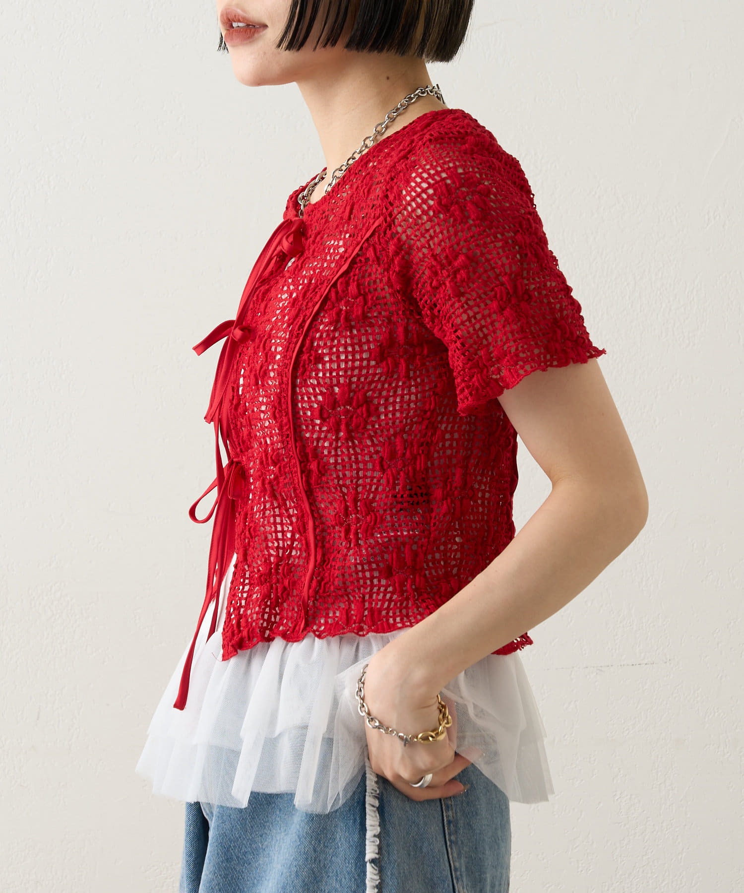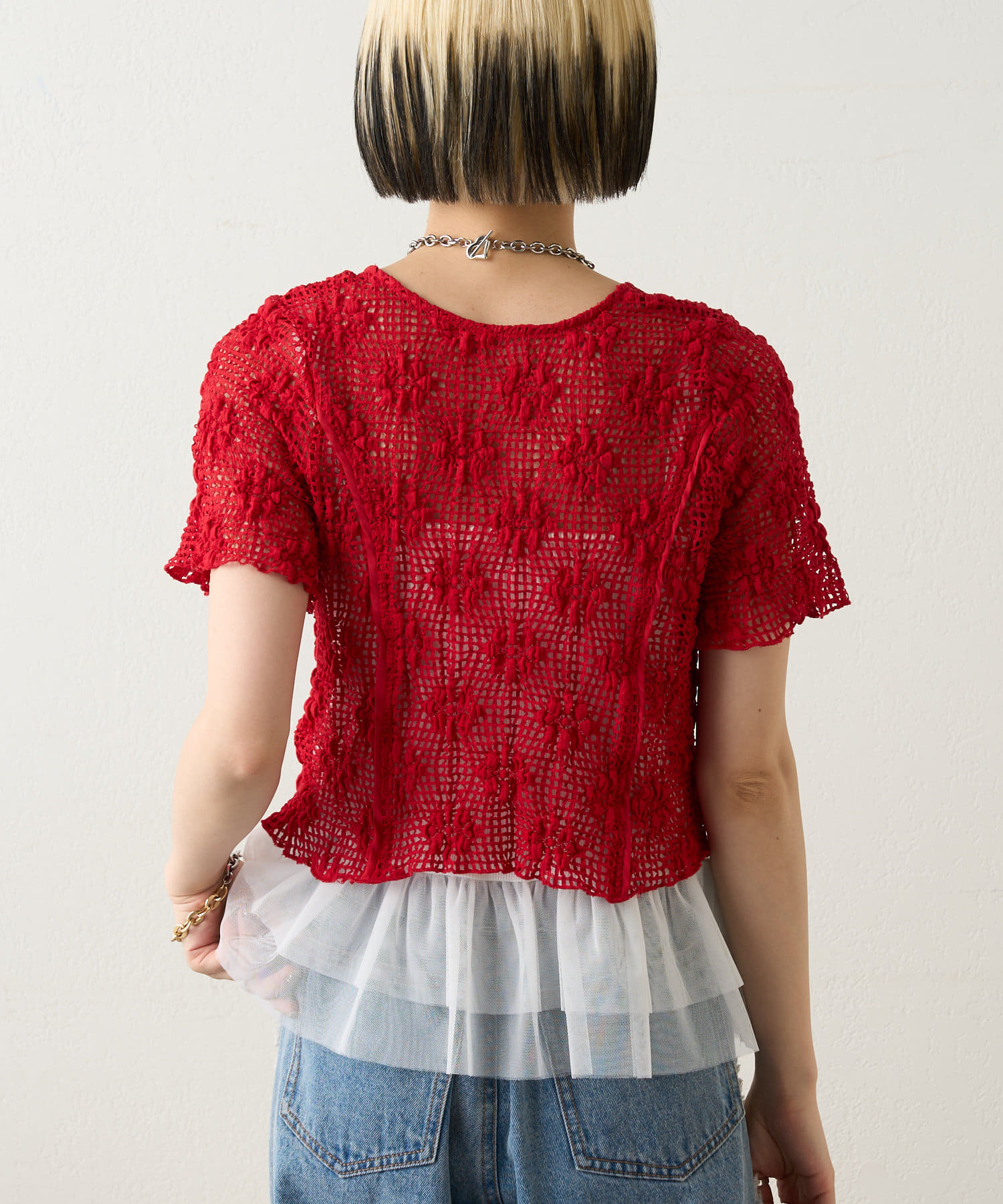 ・透かし編みに、ぽこぽことしたお花がポイントのカーディガン
