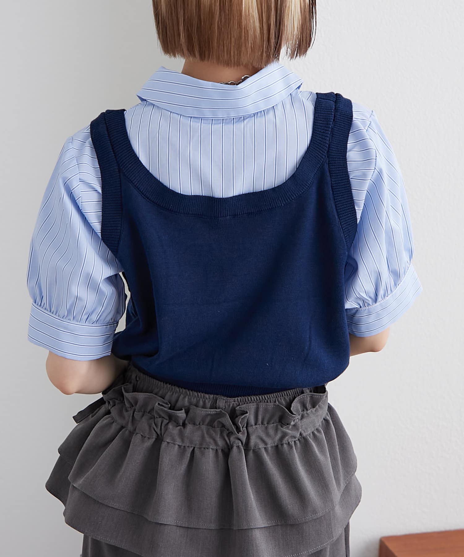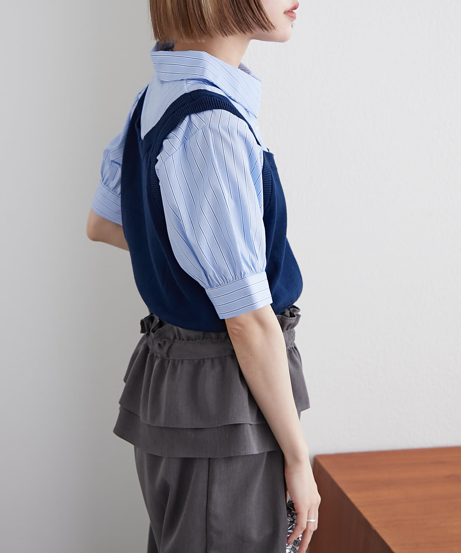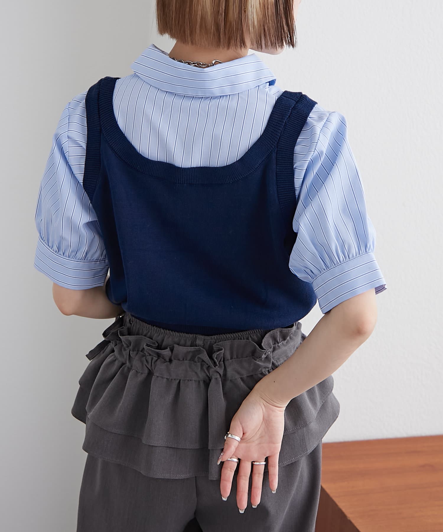 ・ストライプのシャツとシンプルなニットベストがドッキングしたアイテム!