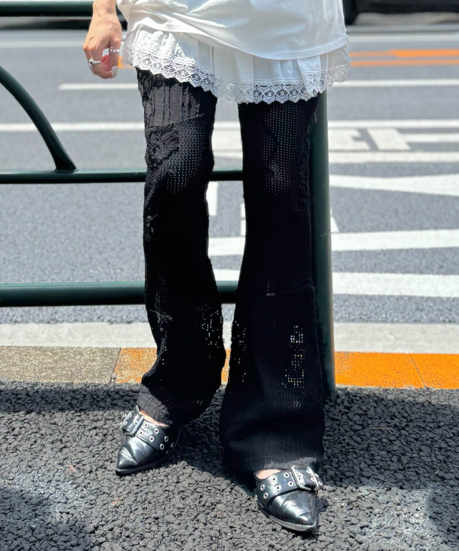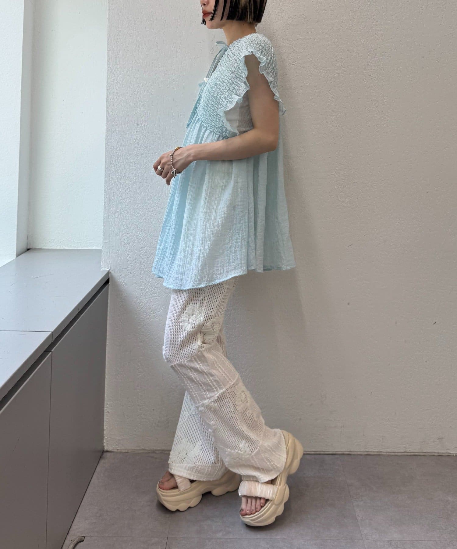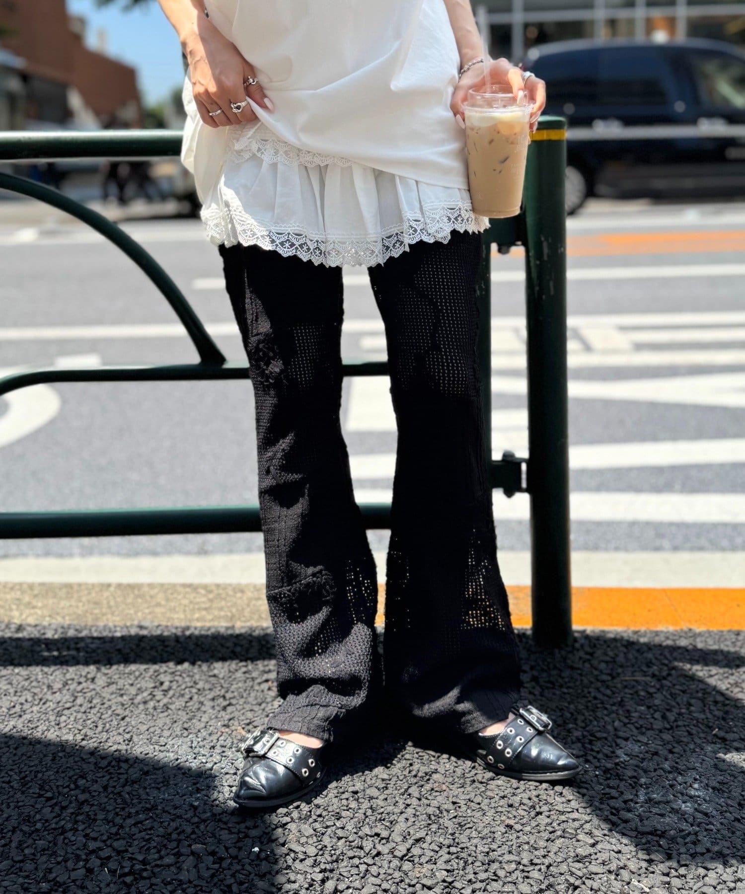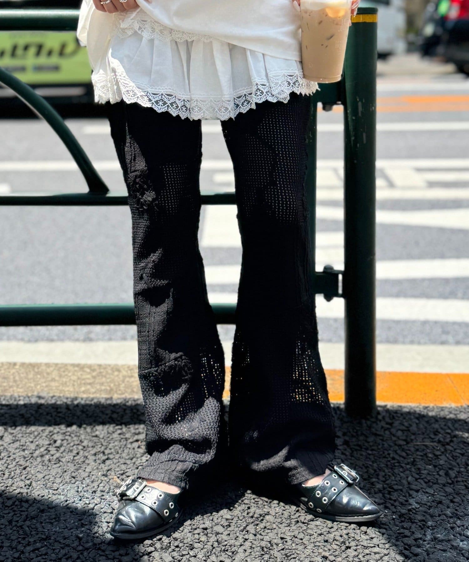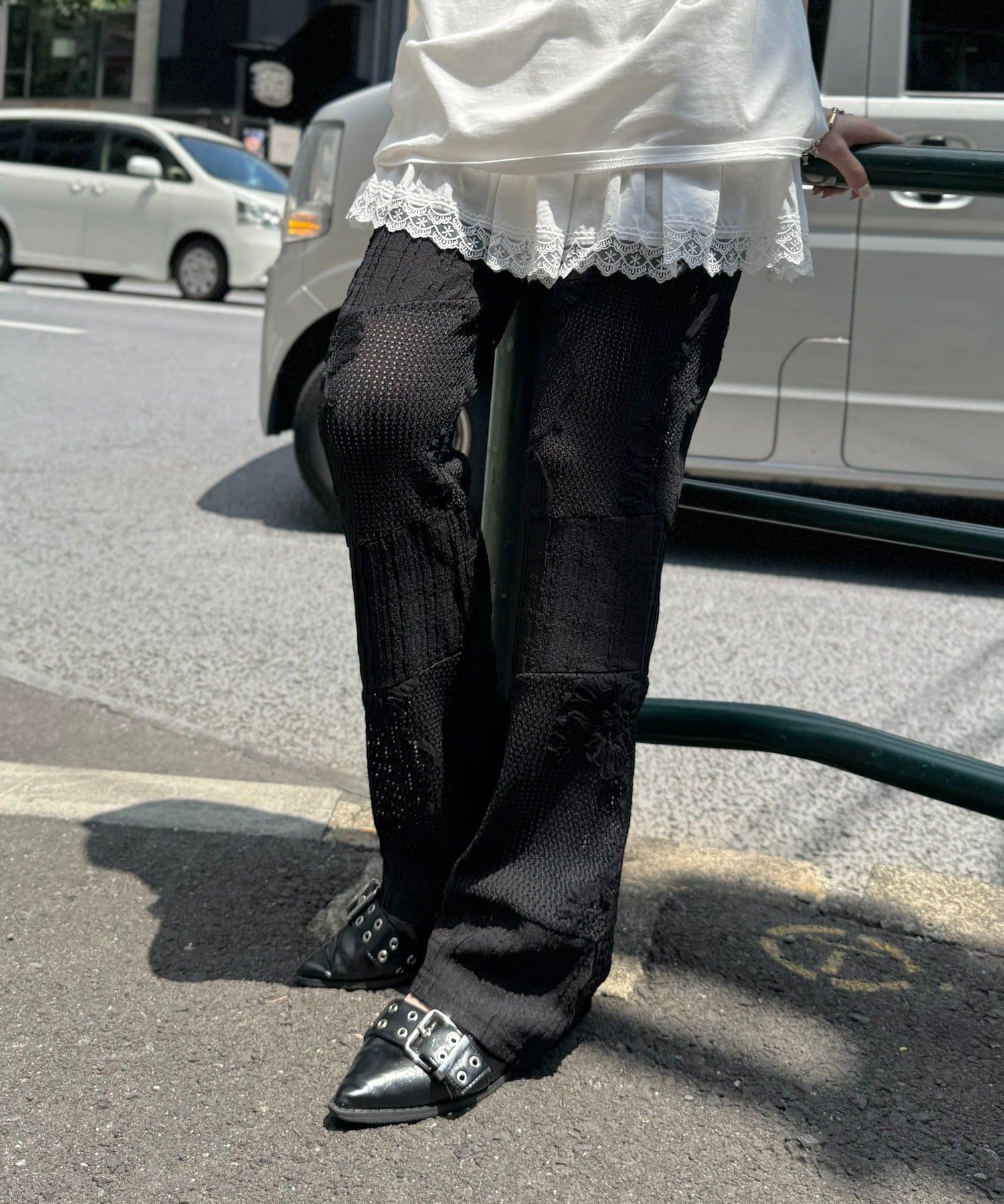 ・フラワーの付いたメッシュ生地とシワ感のあるふんわりとした生地が交互でになったレースパンツ