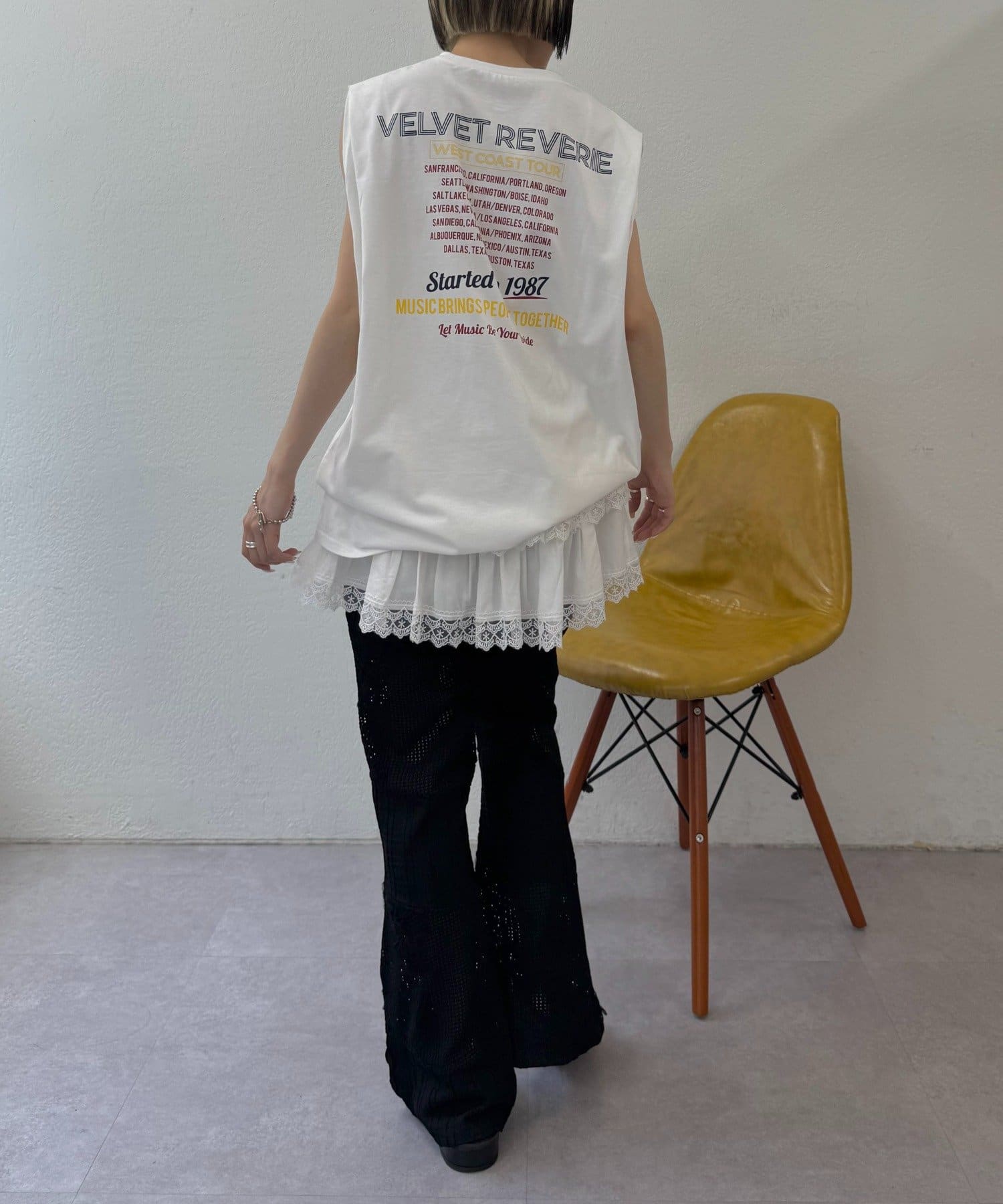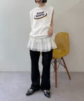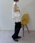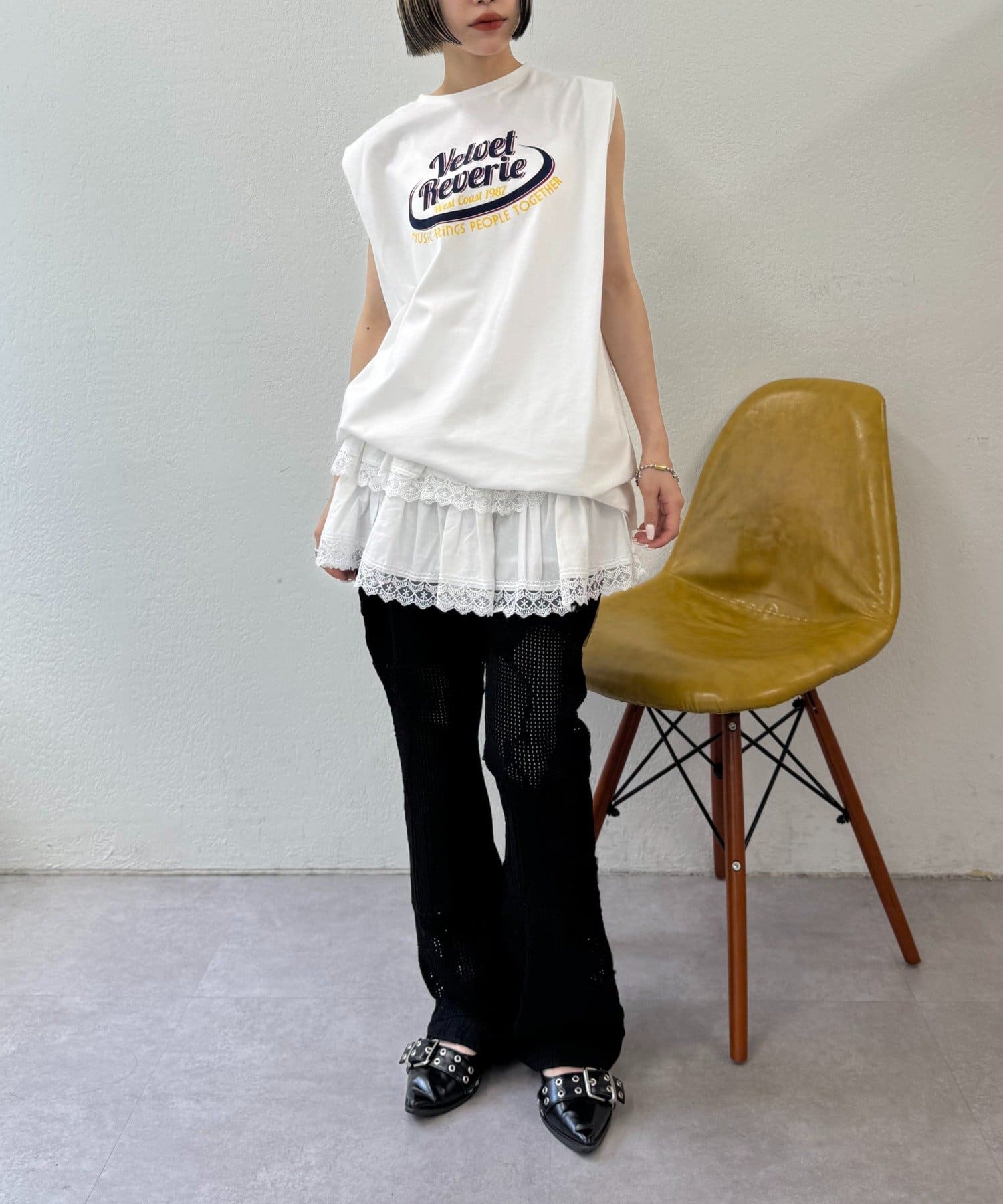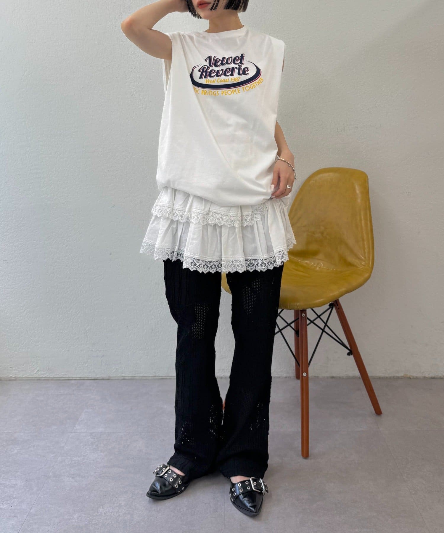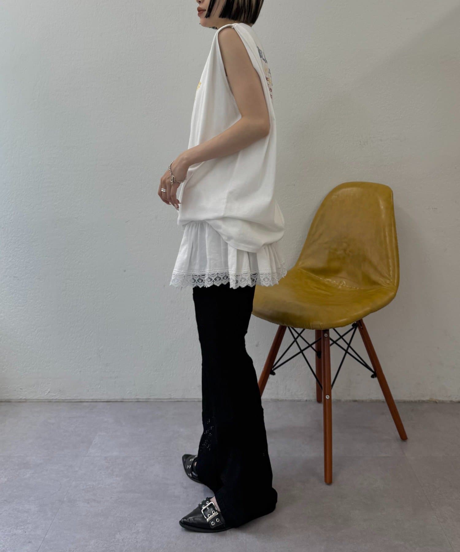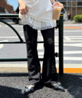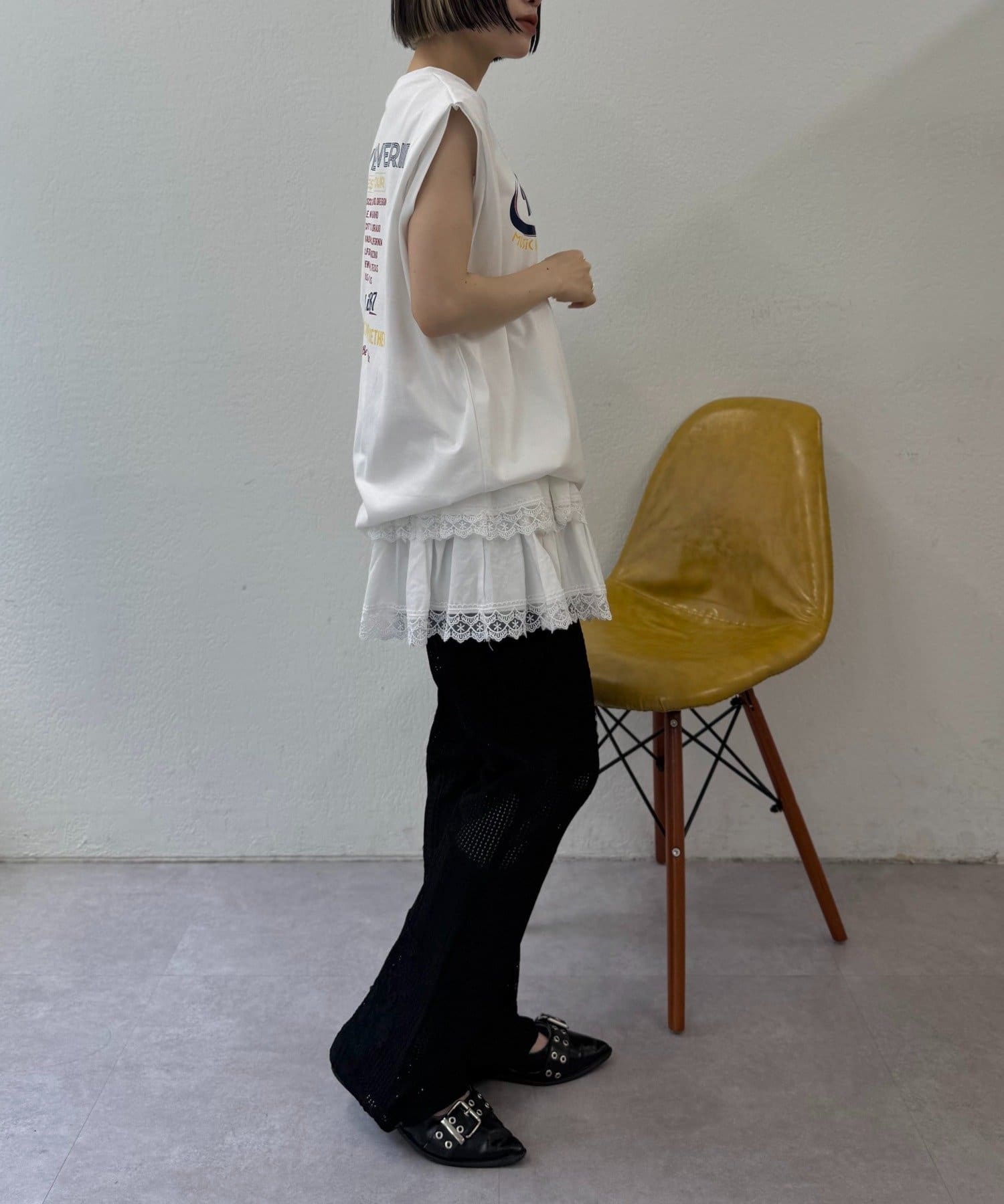 ・フラワーの付いたメッシュ生地とシワ感のあるふんわりとした生地が交互でになったレースパンツ