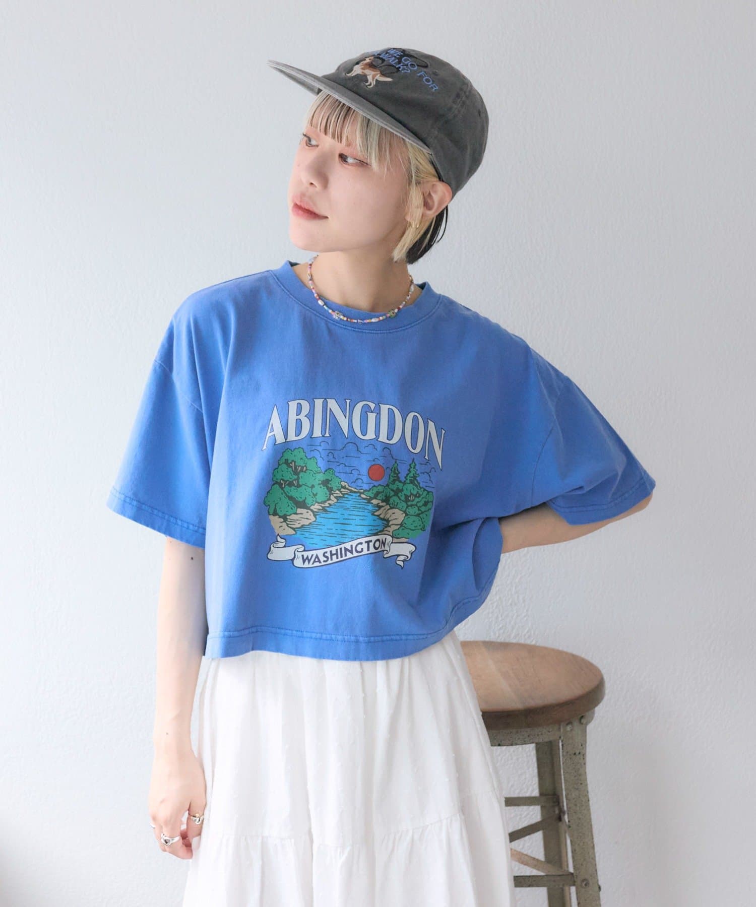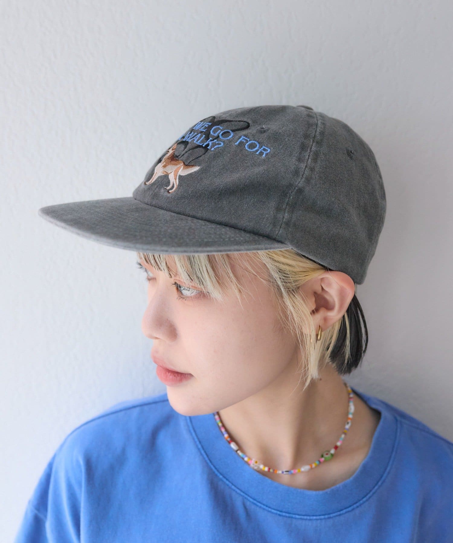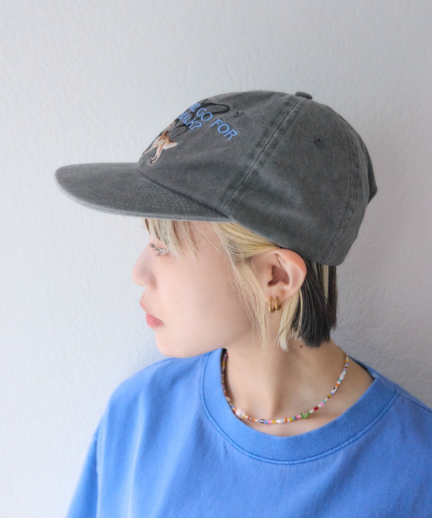 ・つばが真っすぐなフラットキャップでカジュアルに
