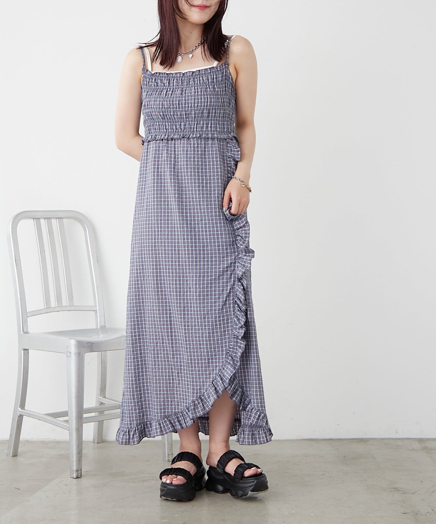 【w closet】シャーリングチェックキャミOP